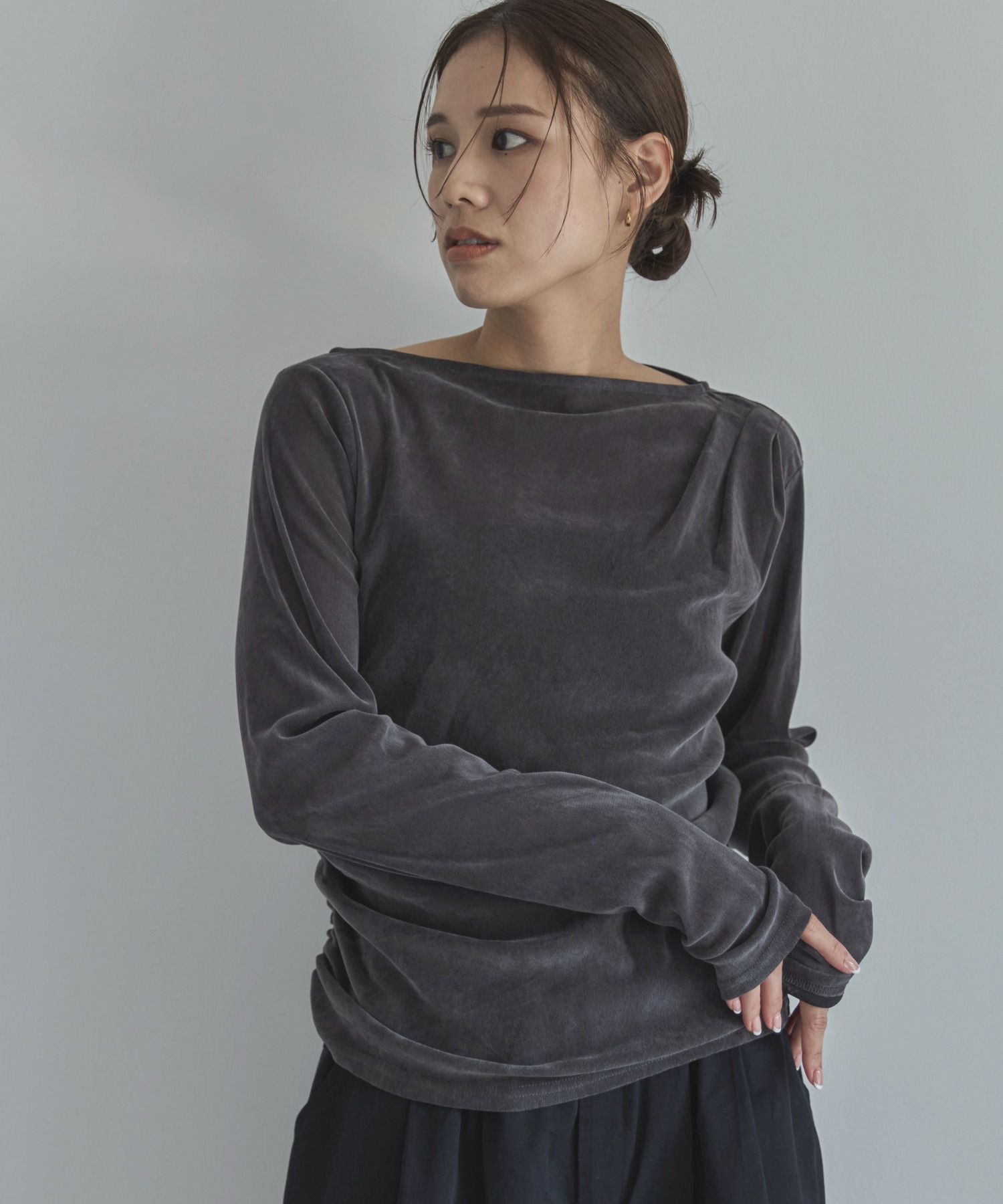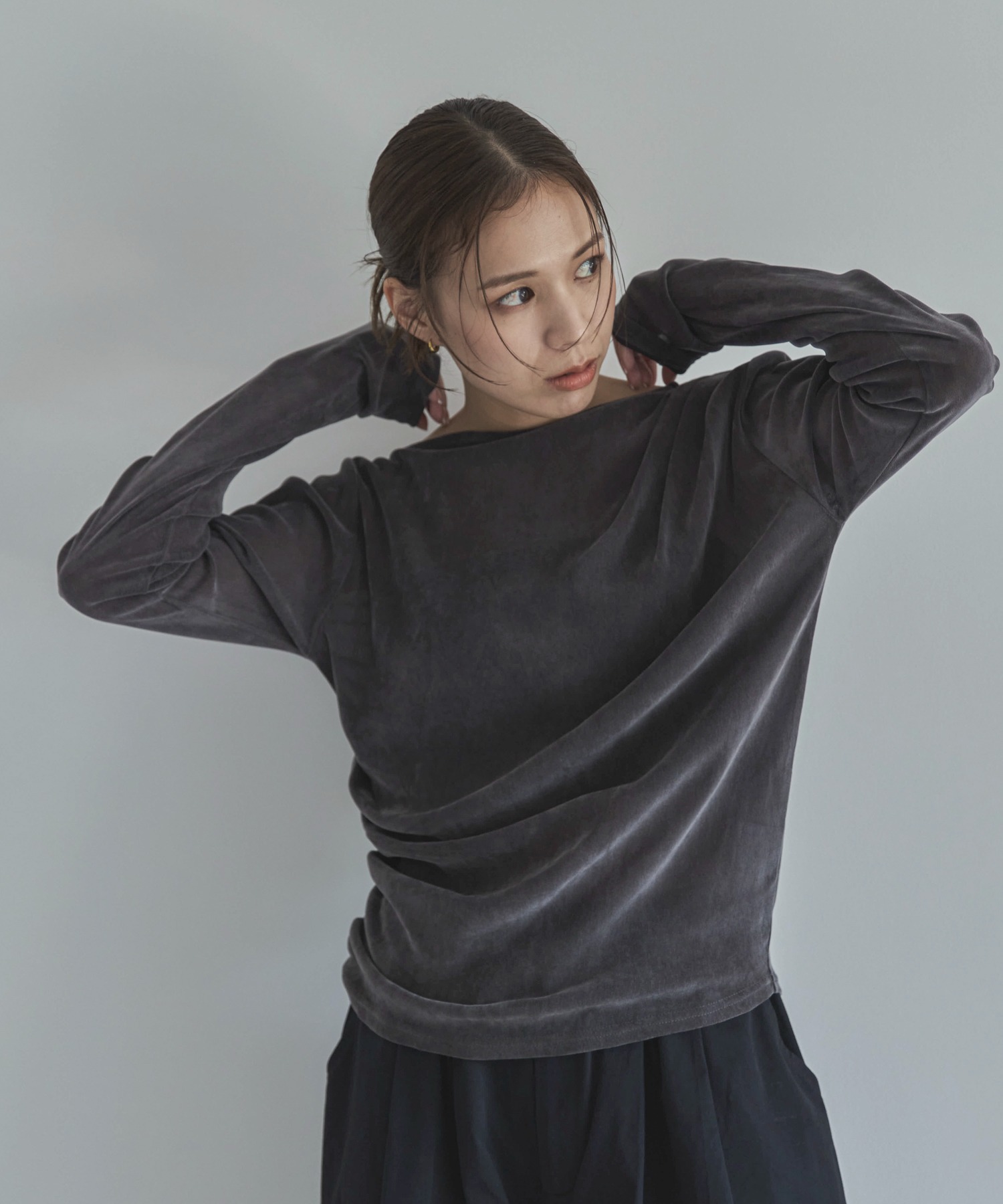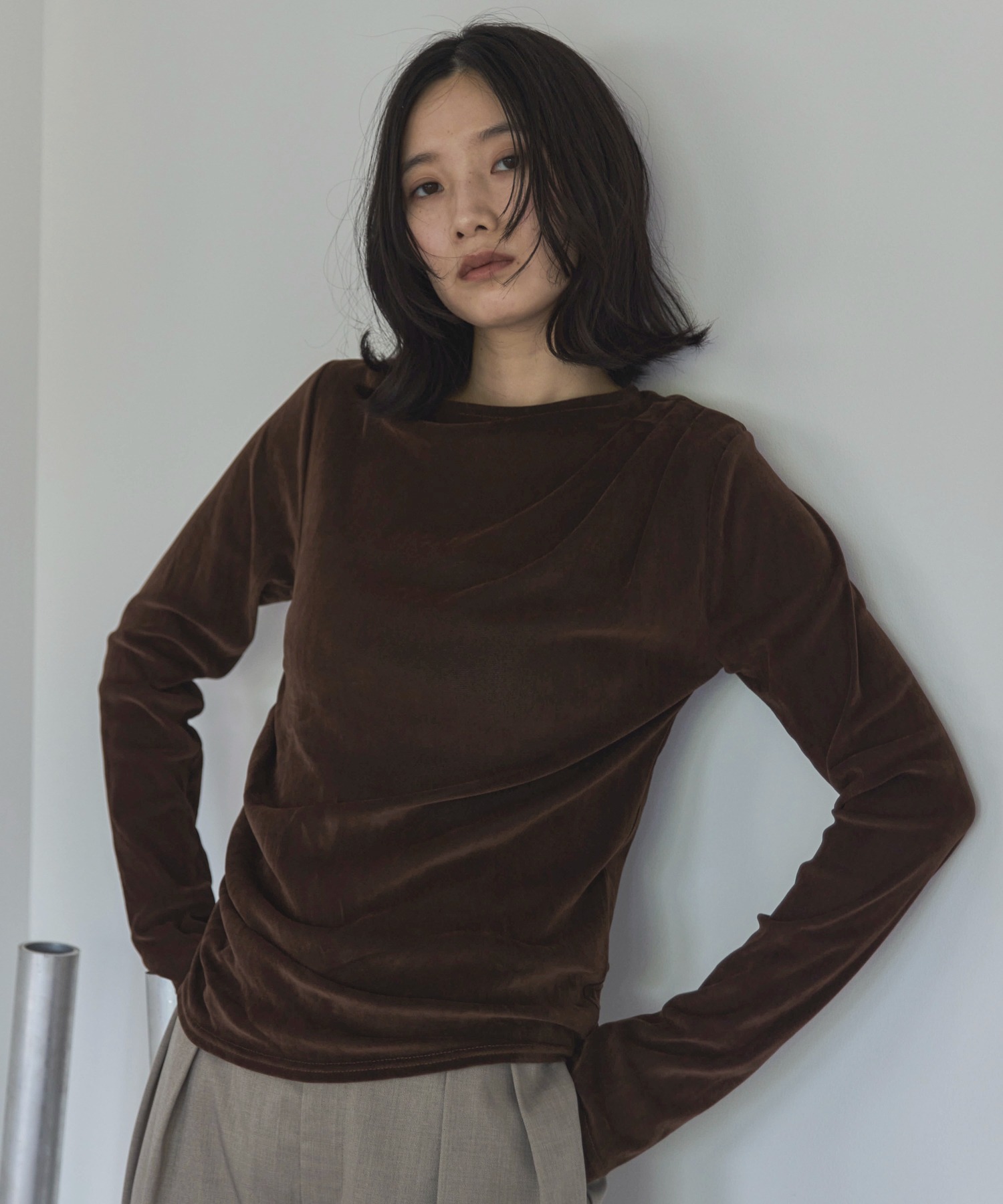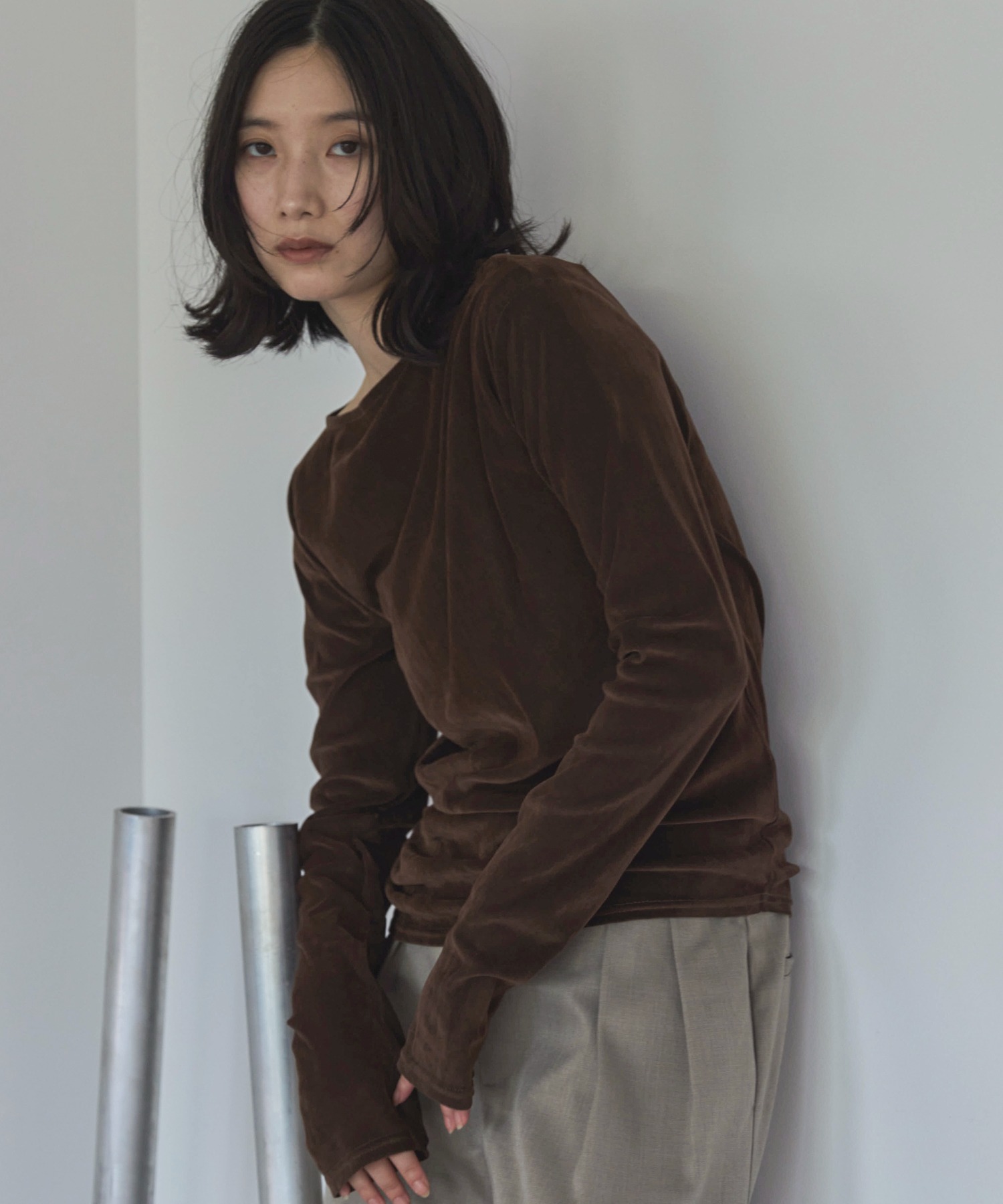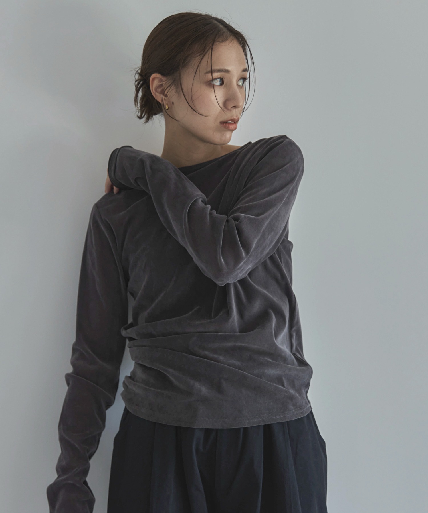 柔らかく、ベルベットのような短毛感の質感が特徴のフロッキー生地を使用した秋冬らしいトップス。