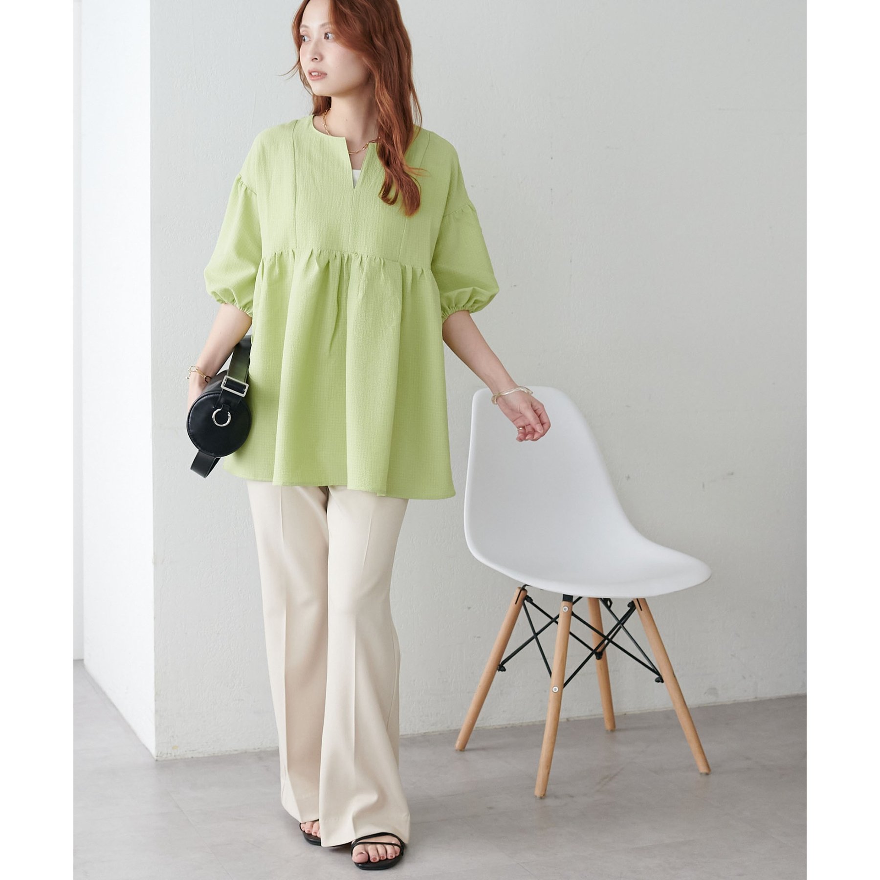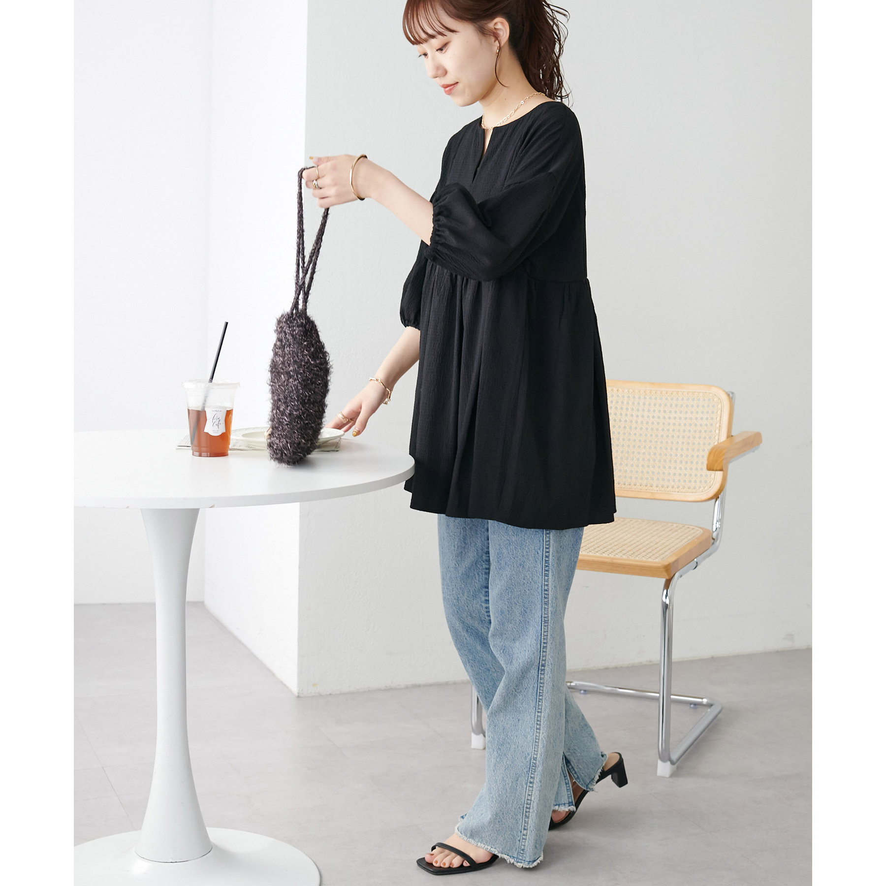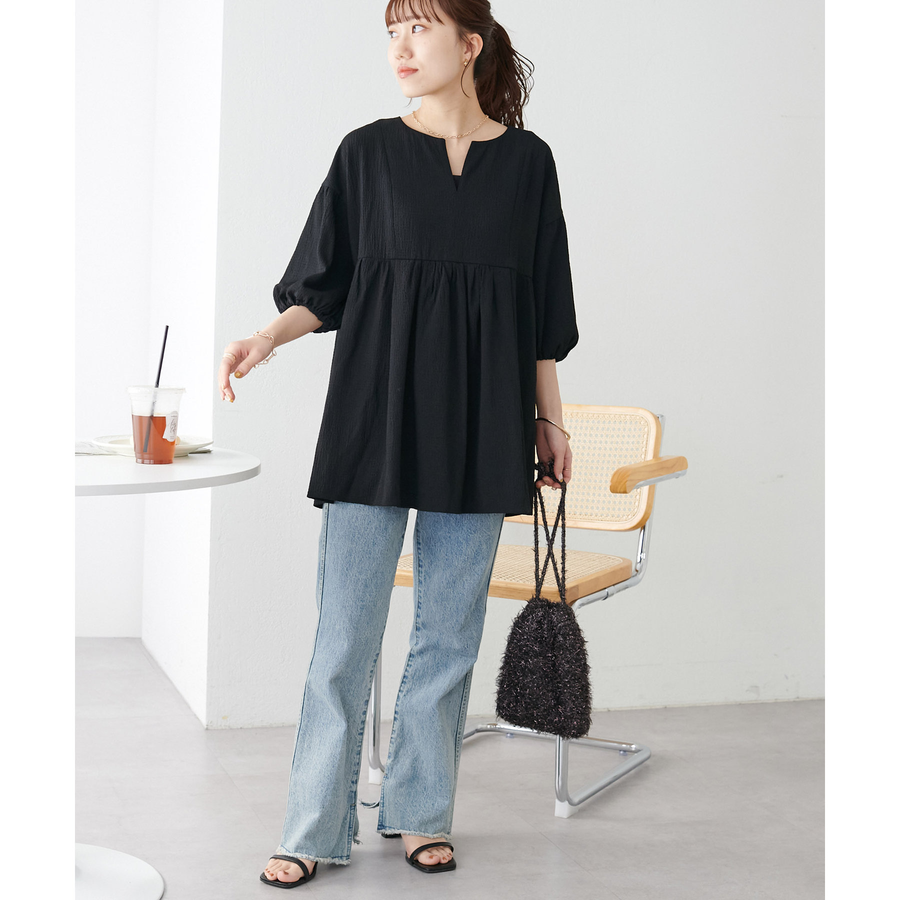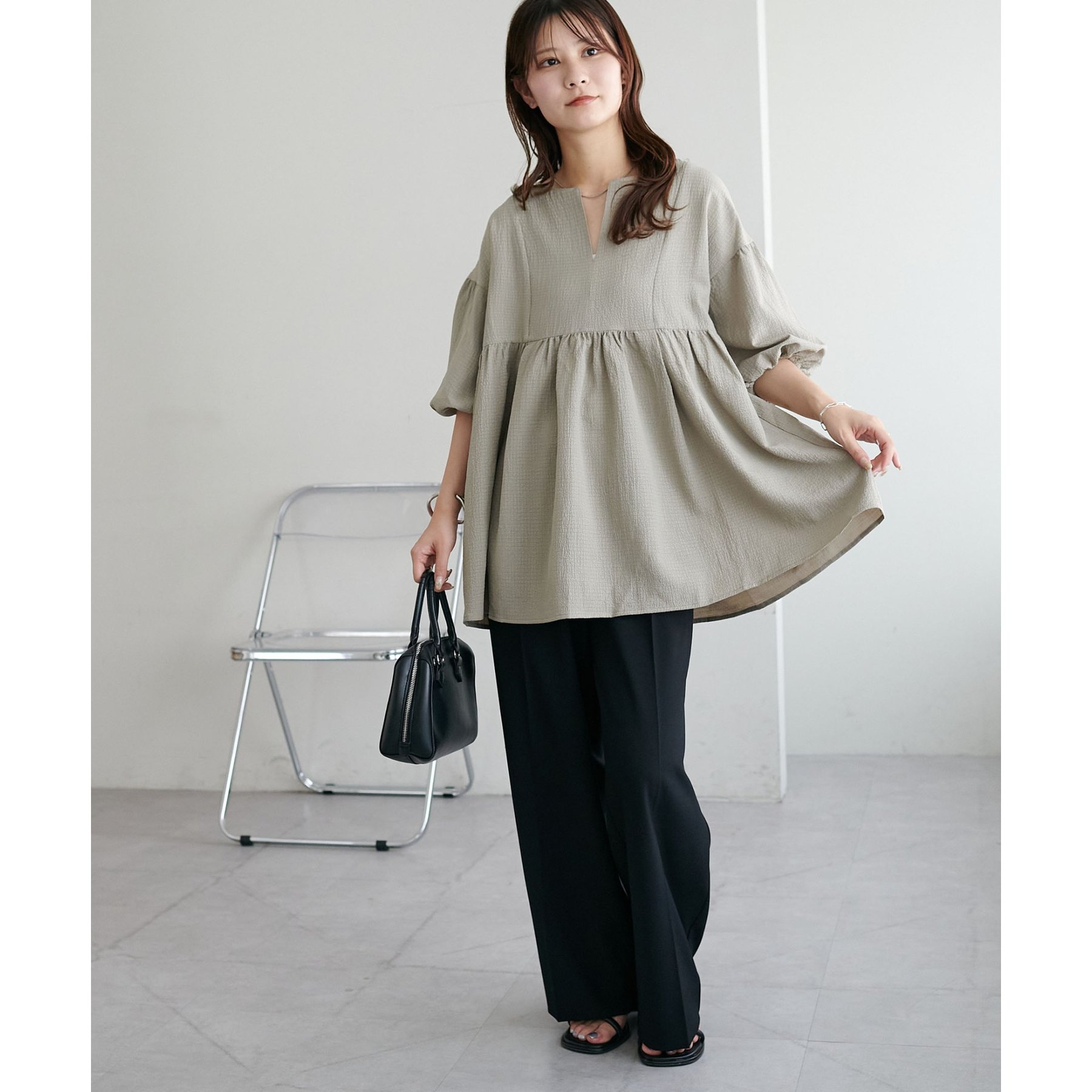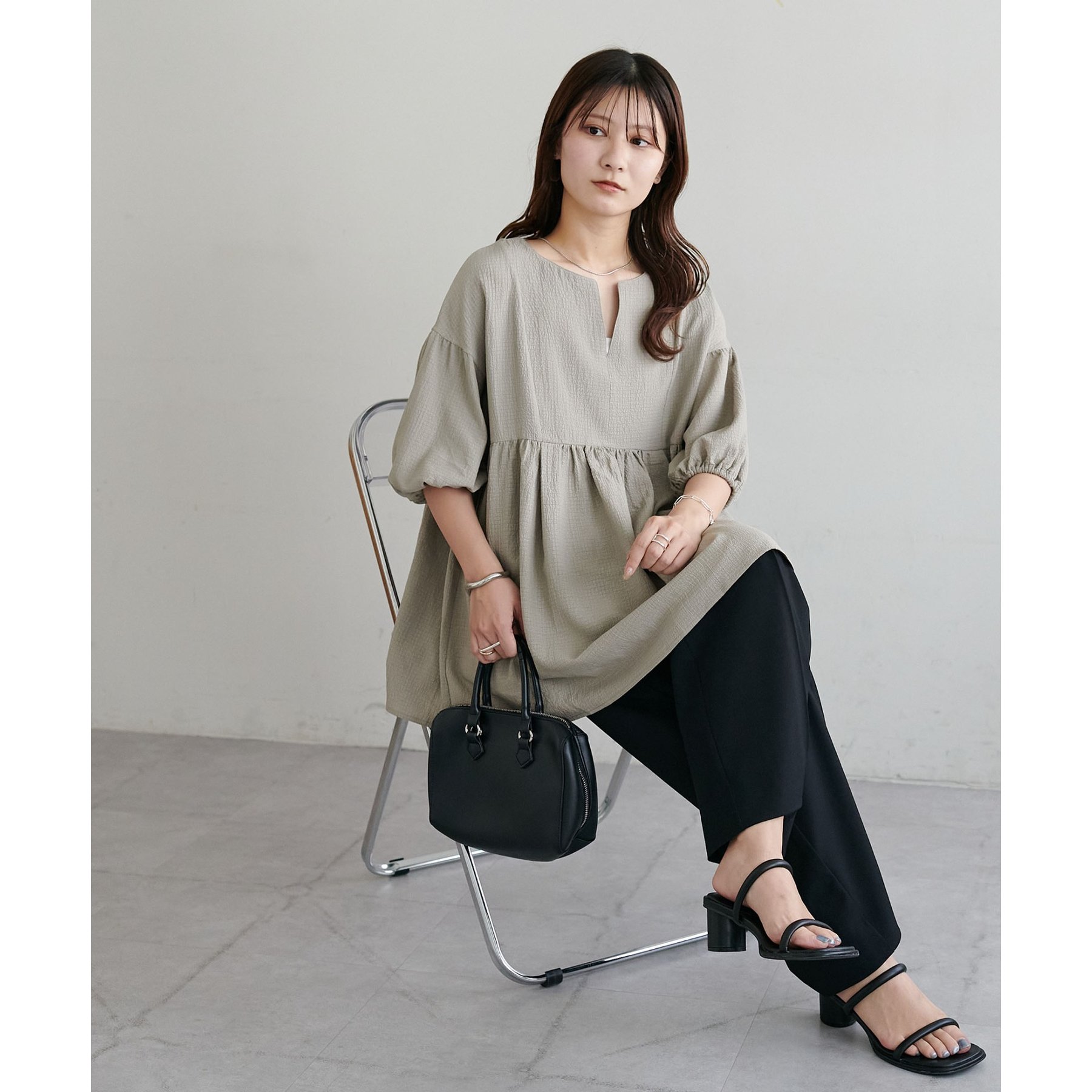 155cmスタッフ:キーネックが顔まわりをスッキリ見せてくれて、アクセサリーとも相性抜群◎オフィススタイルにもおすすめです。