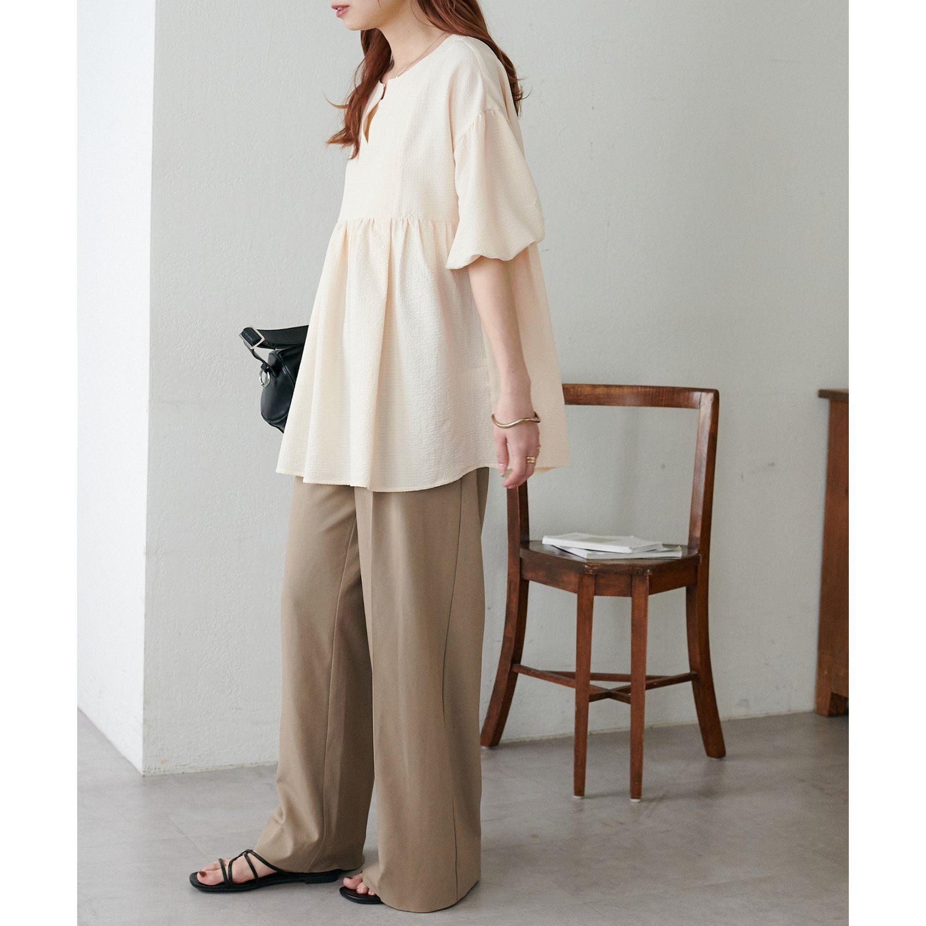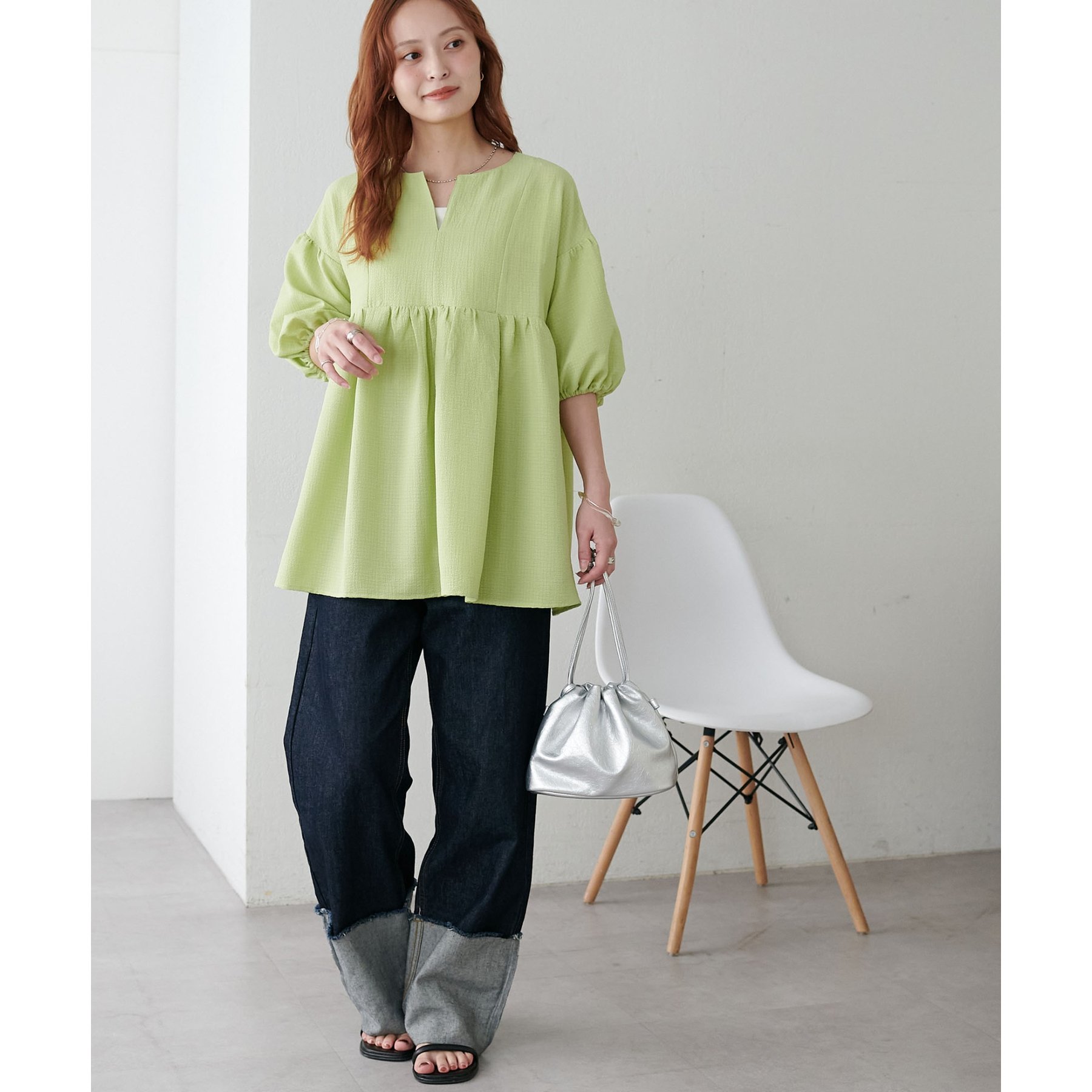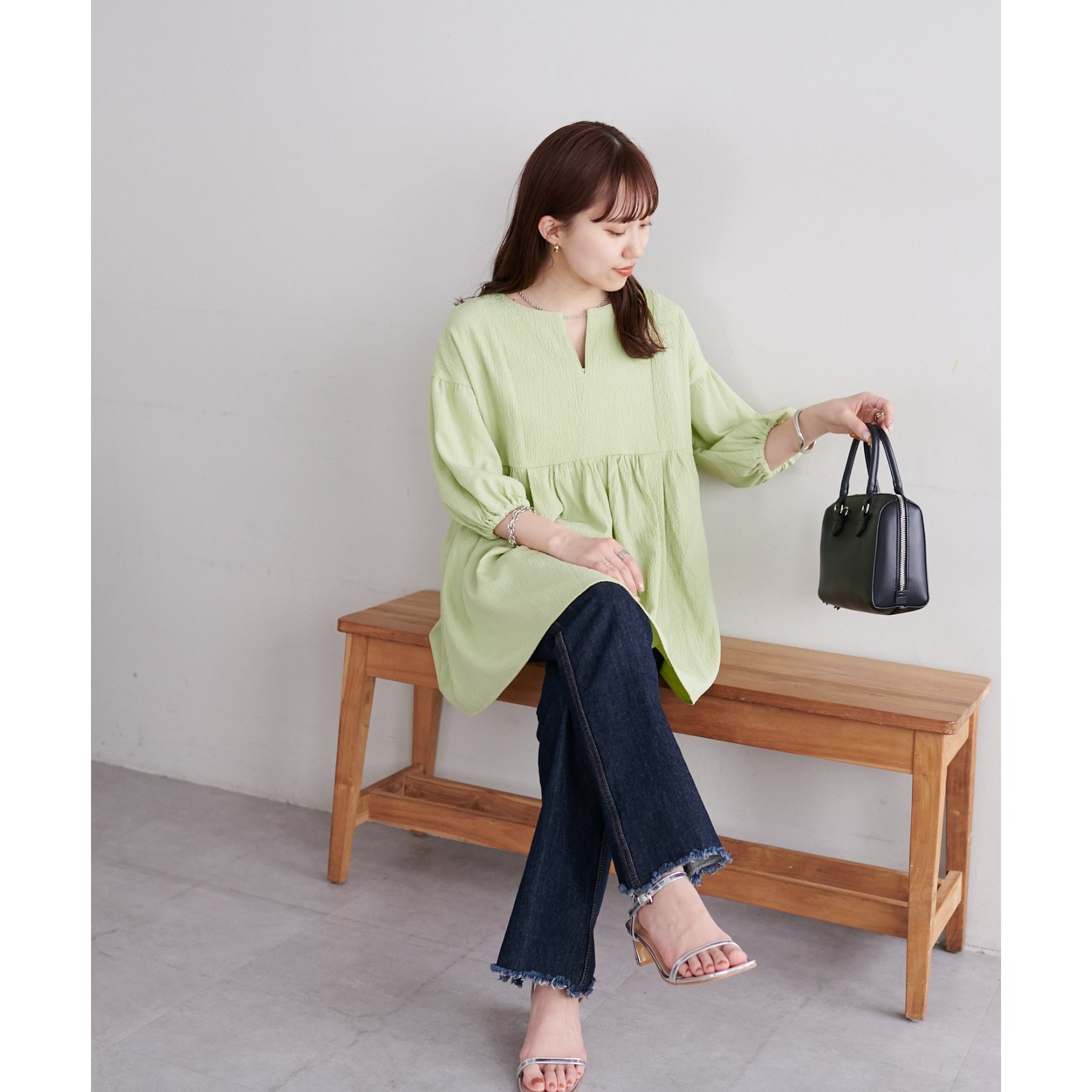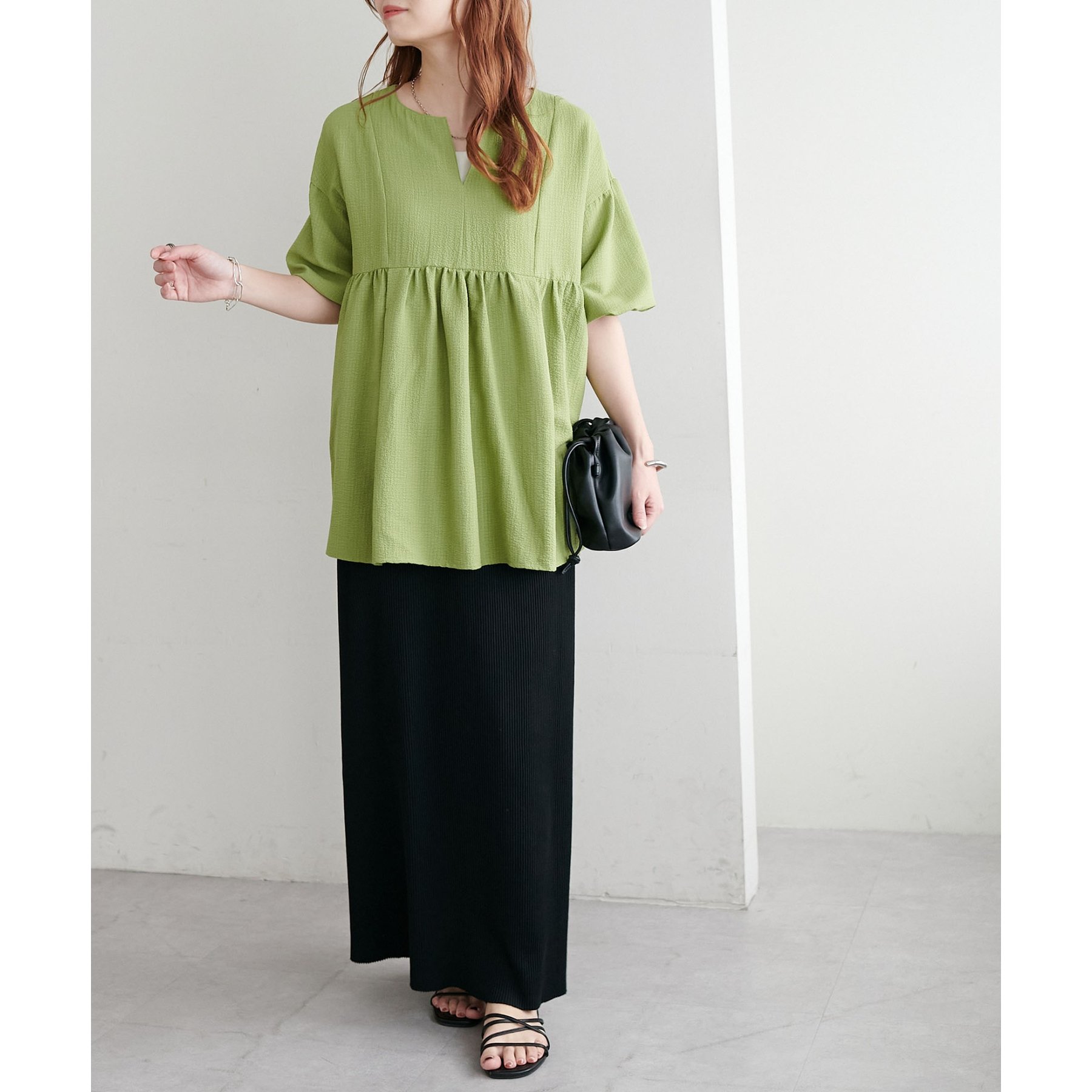155cmスタッフ:キーネックが顔まわりをスッキリ見せてくれて、アクセサリーとも相性抜群◎オフィススタイルにもおすすめです。