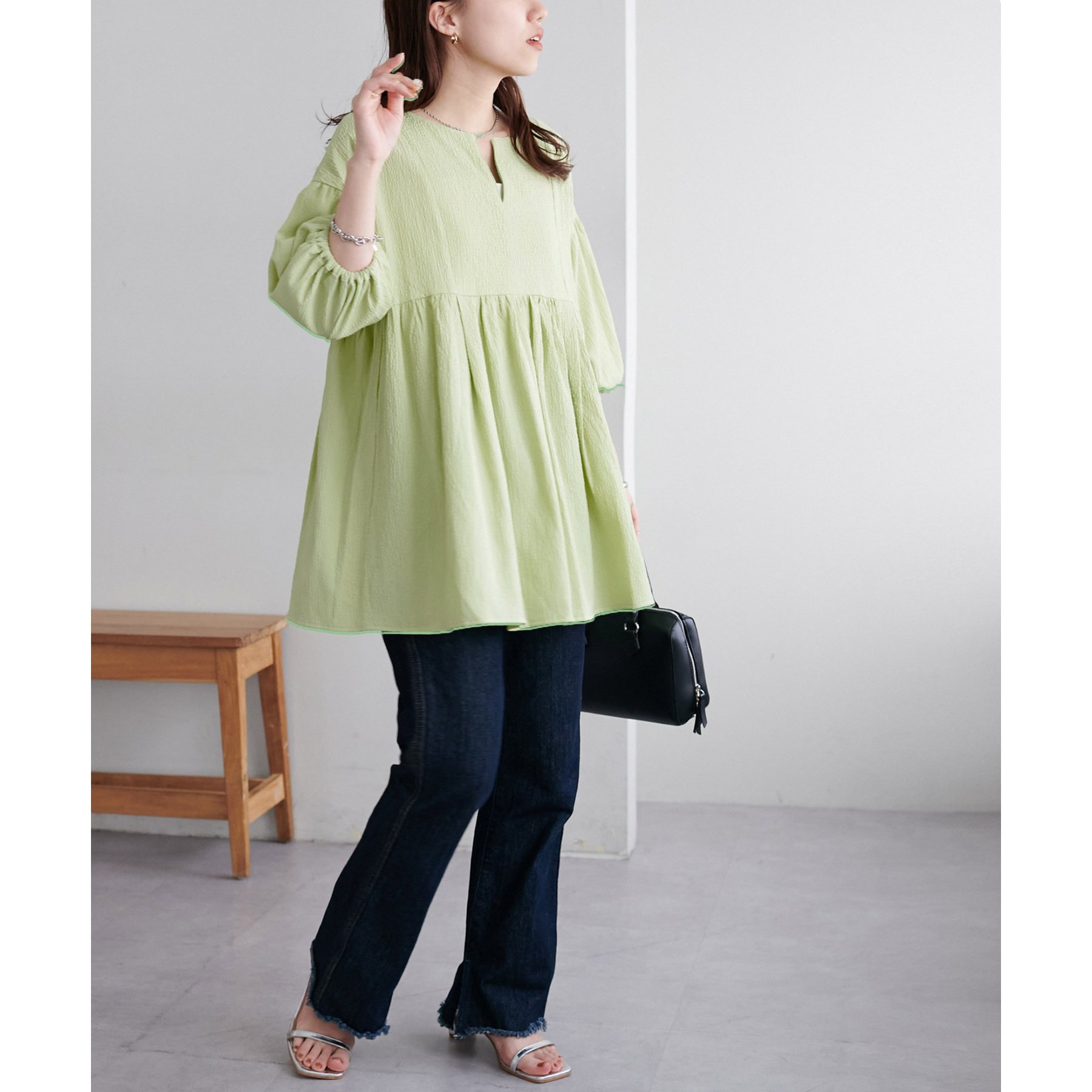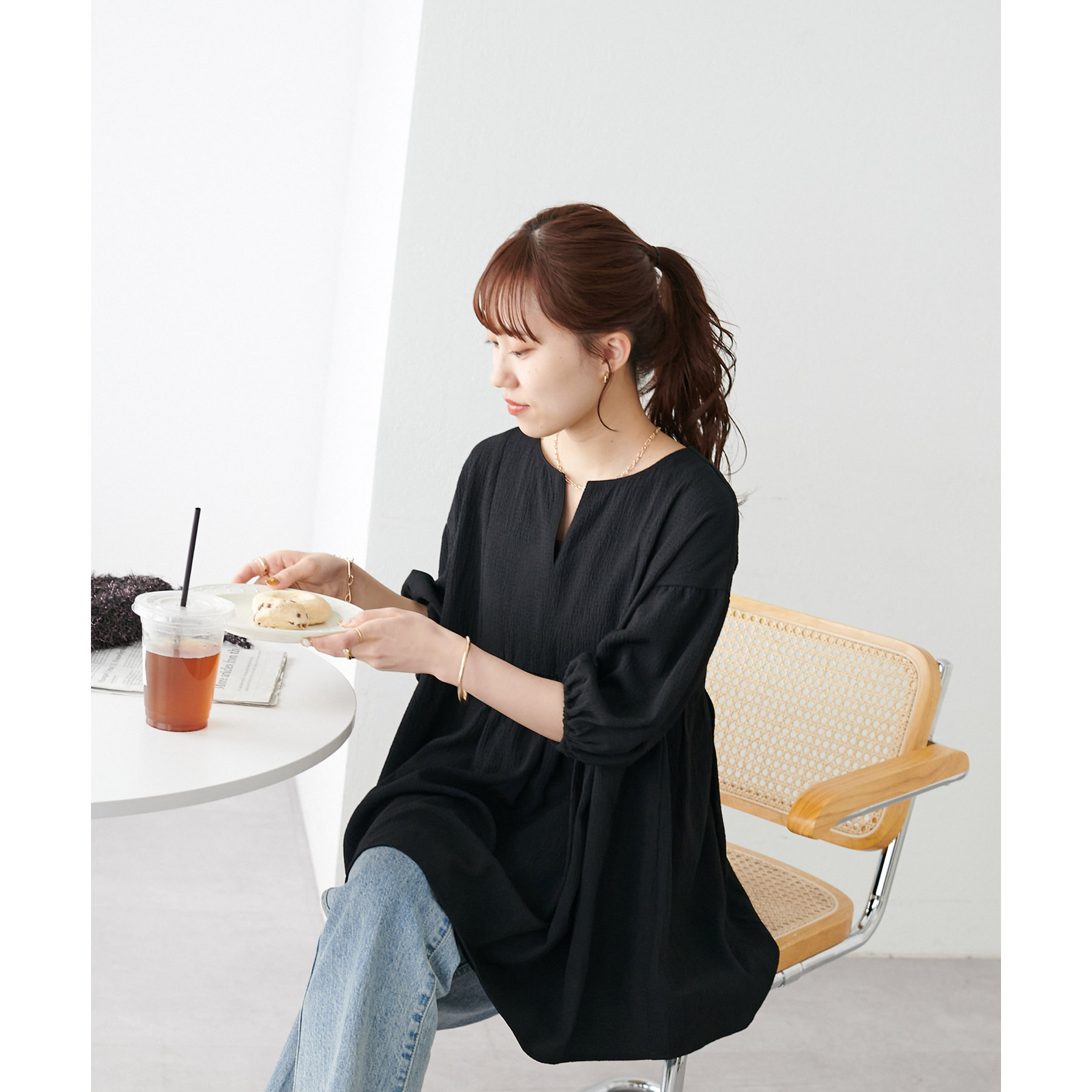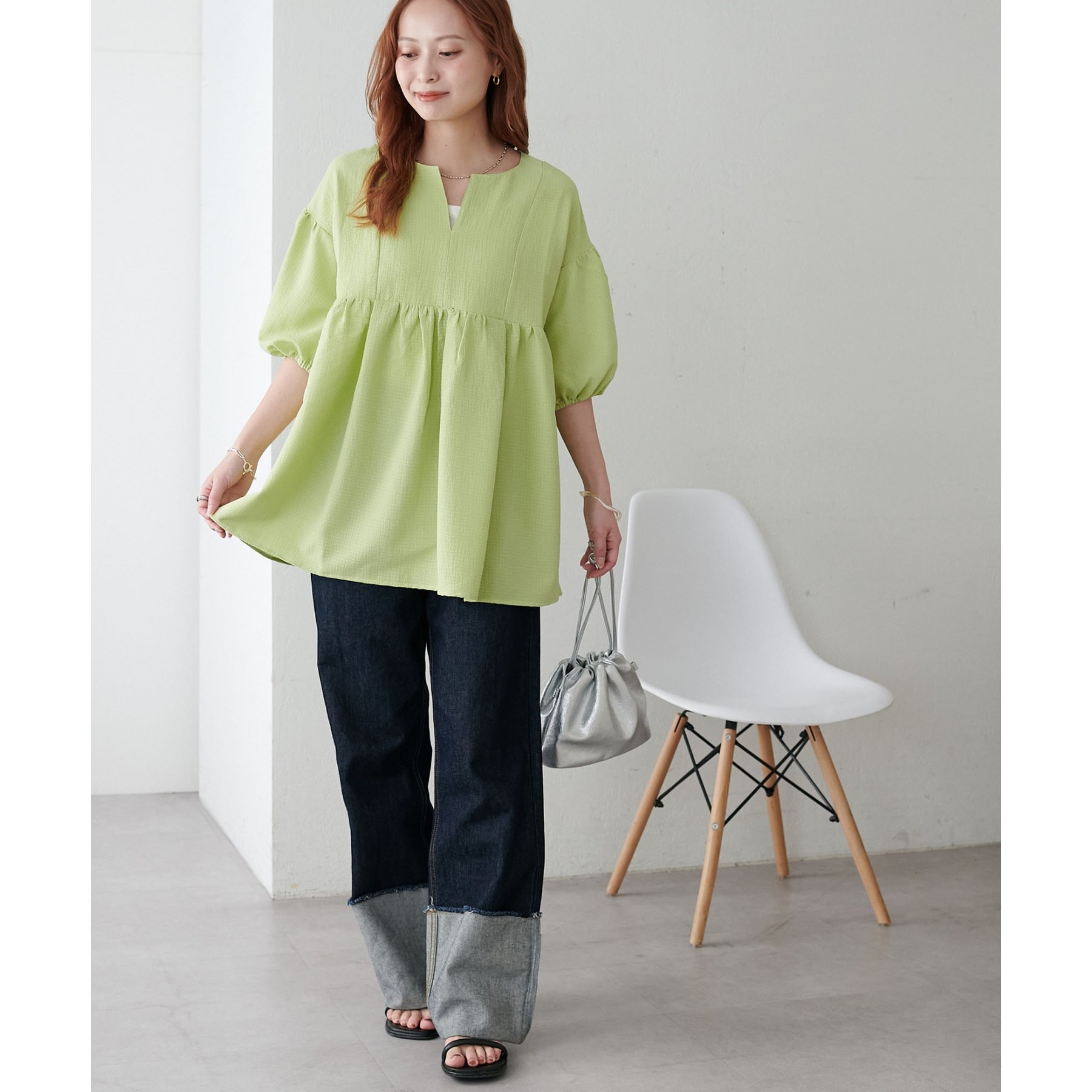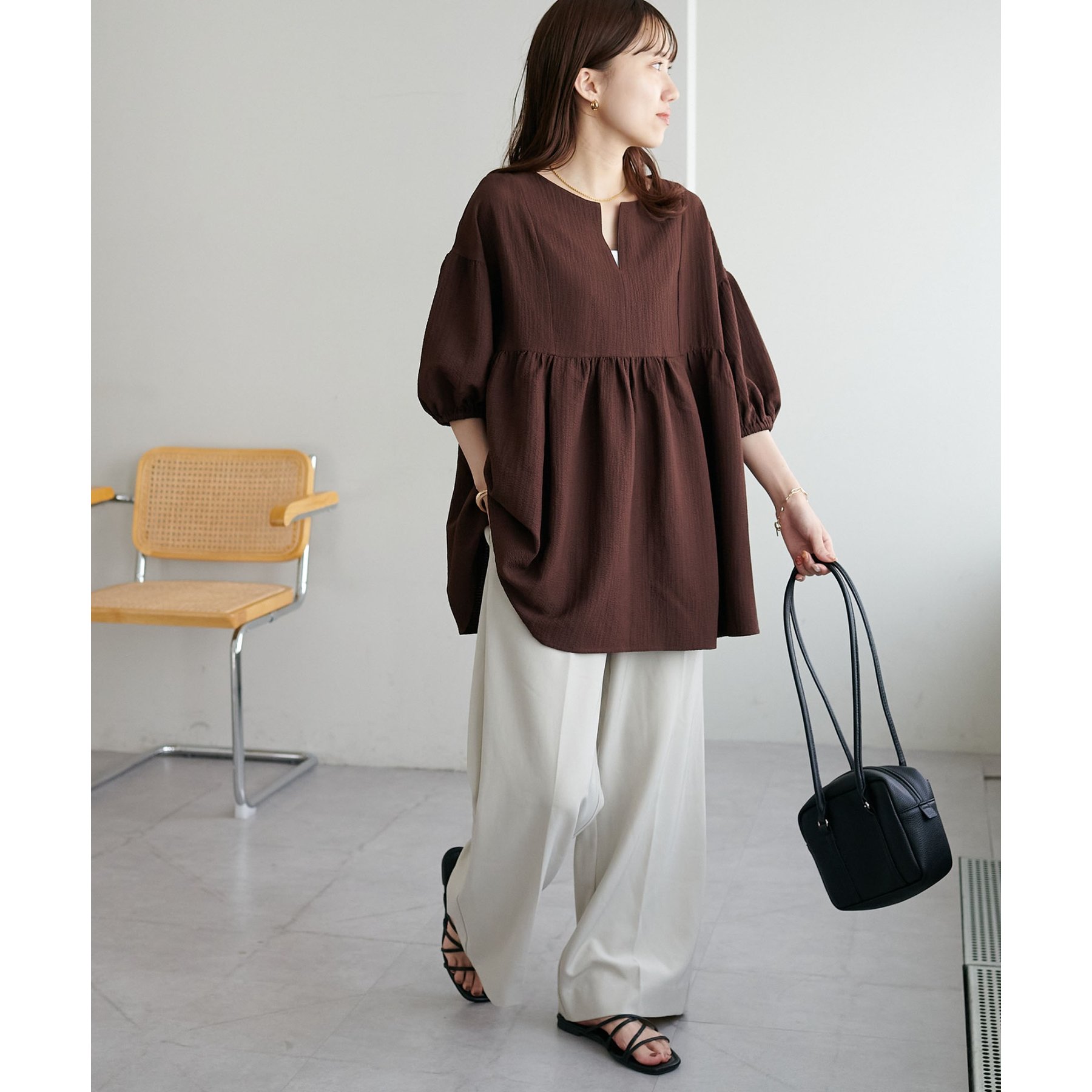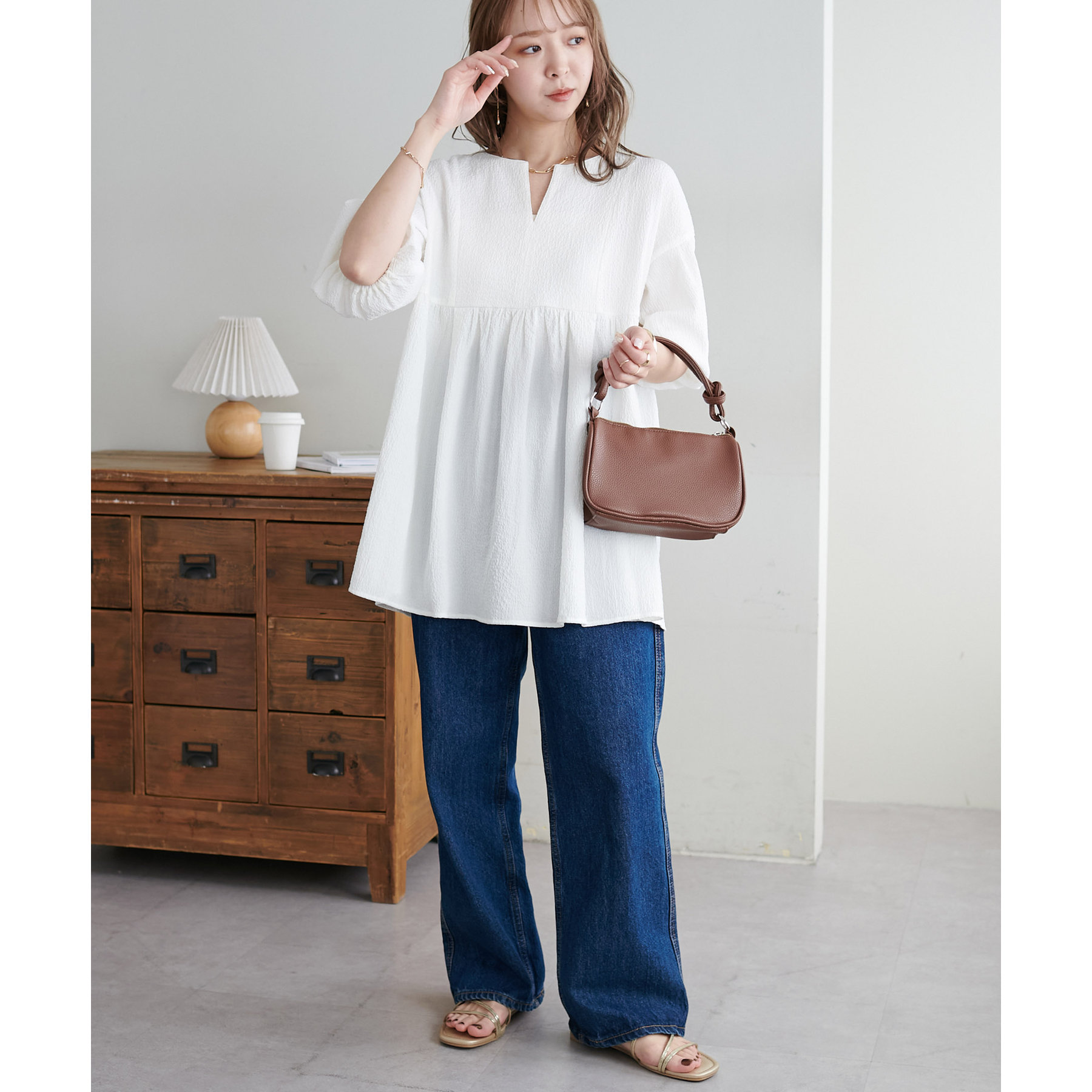 155cmスタッフ:キーネックが顔まわりをスッキリ見せてくれて、アクセサリーとも相性抜群◎オフィススタイルにもおすすめです。