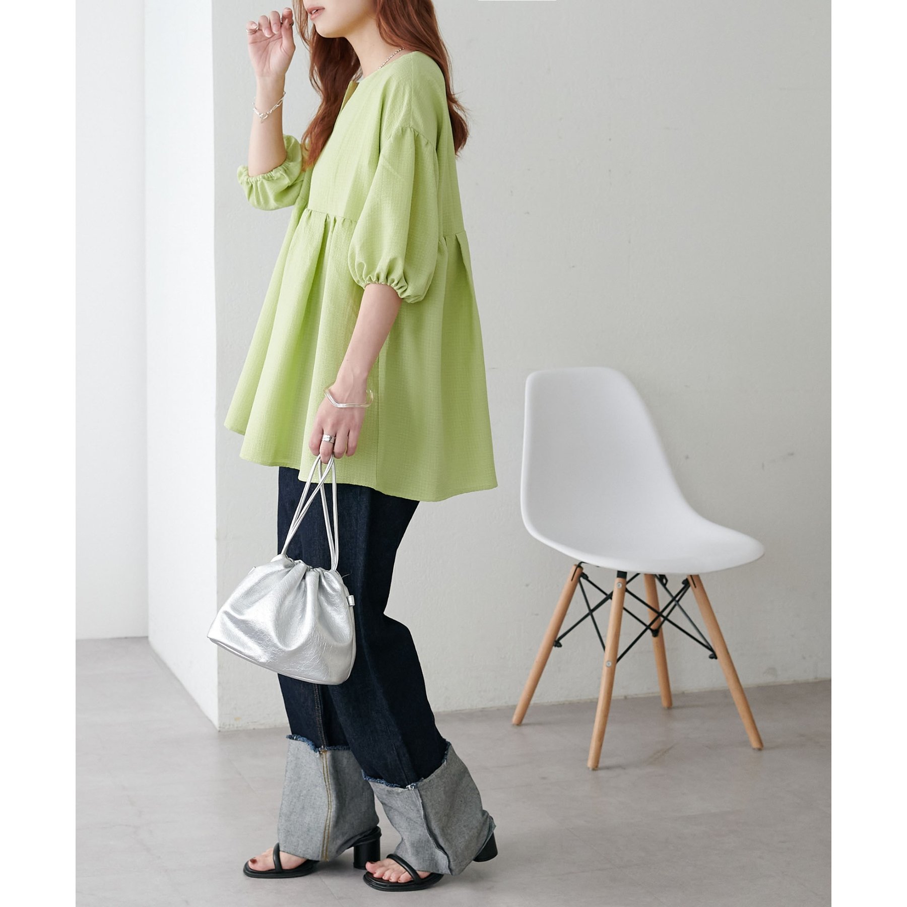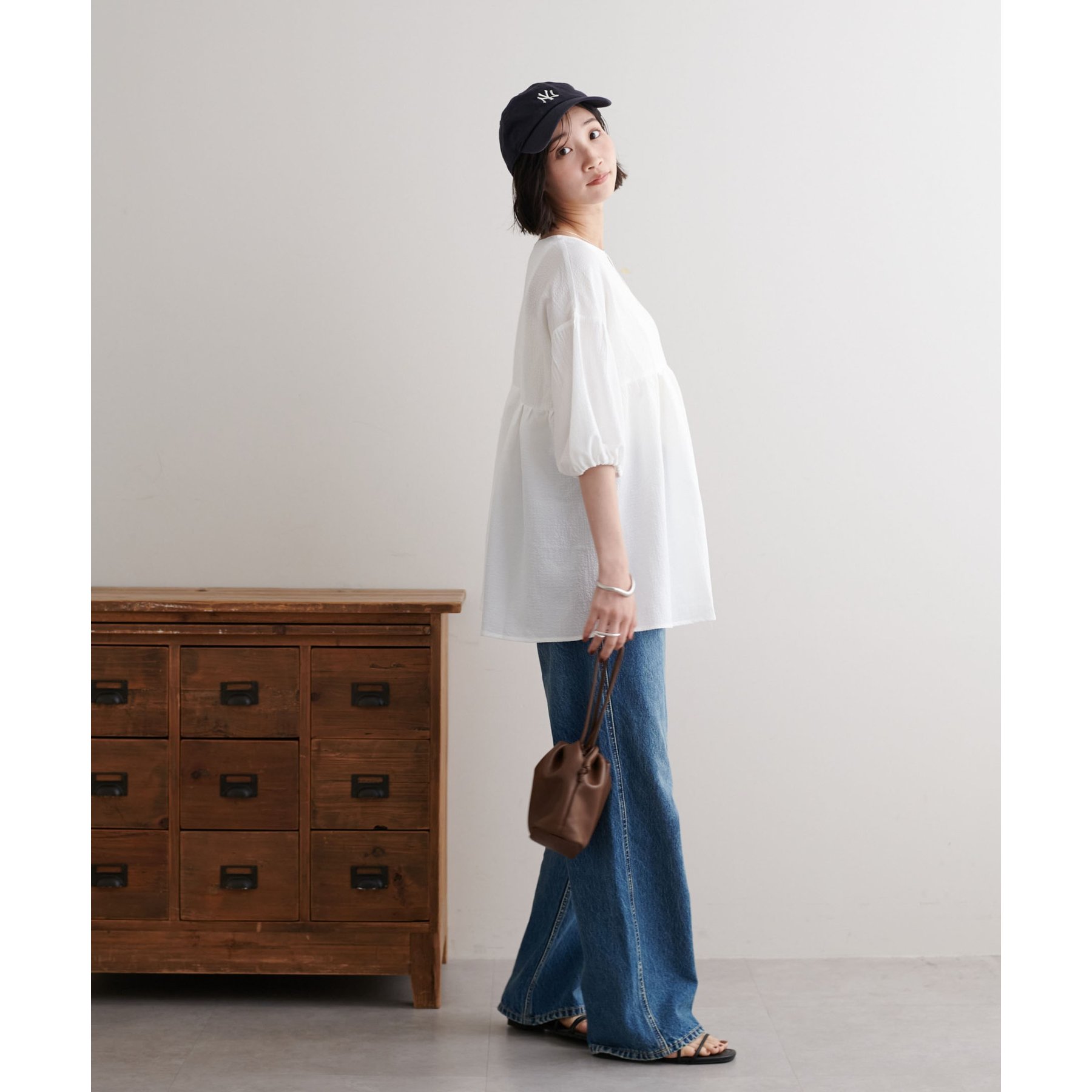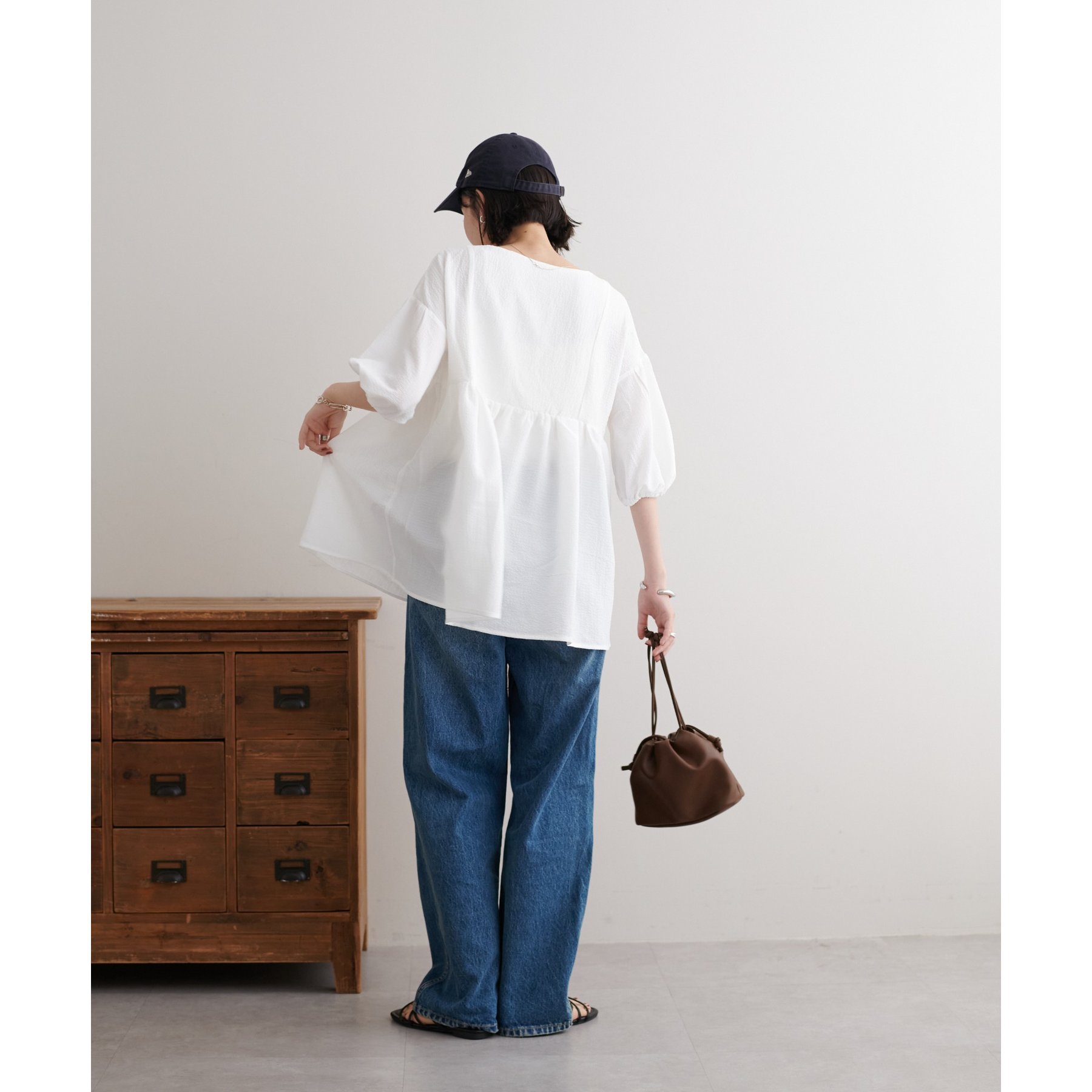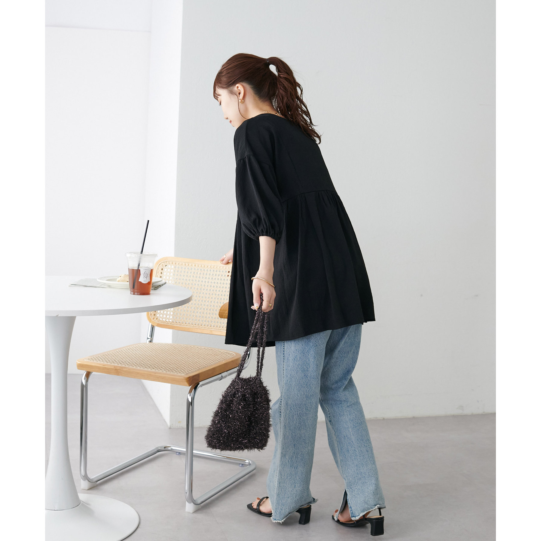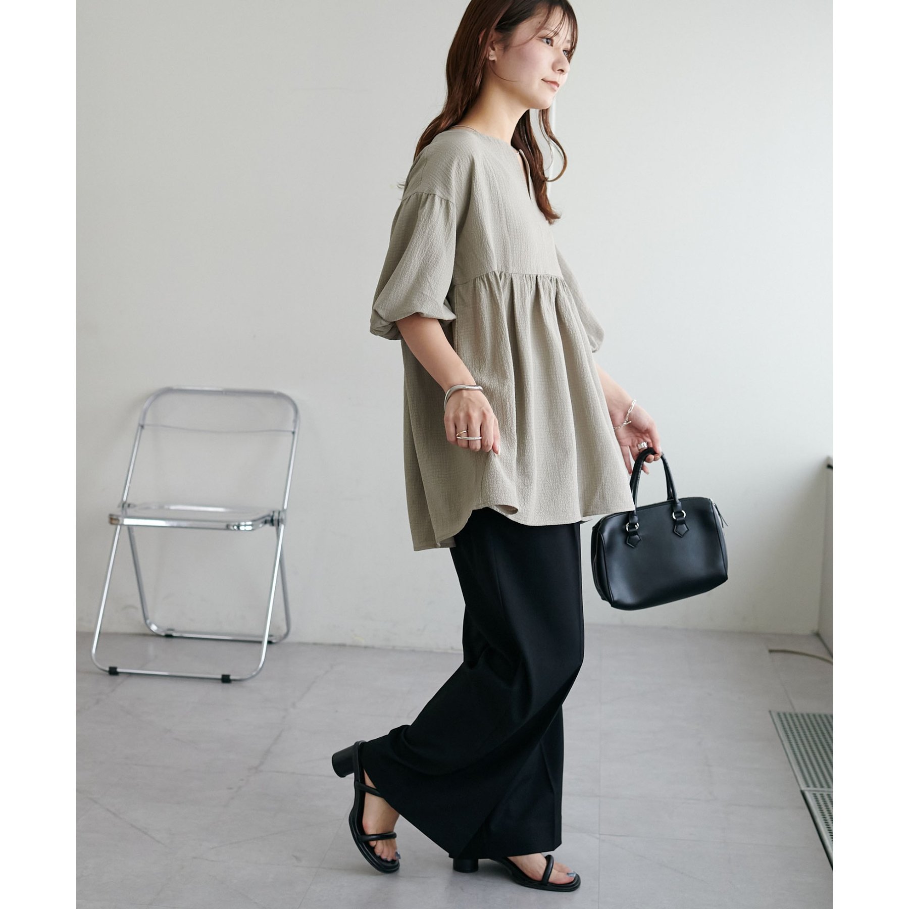 ・ウエストよりやや高めのペプラム切替えでふんわり広がるシルエット