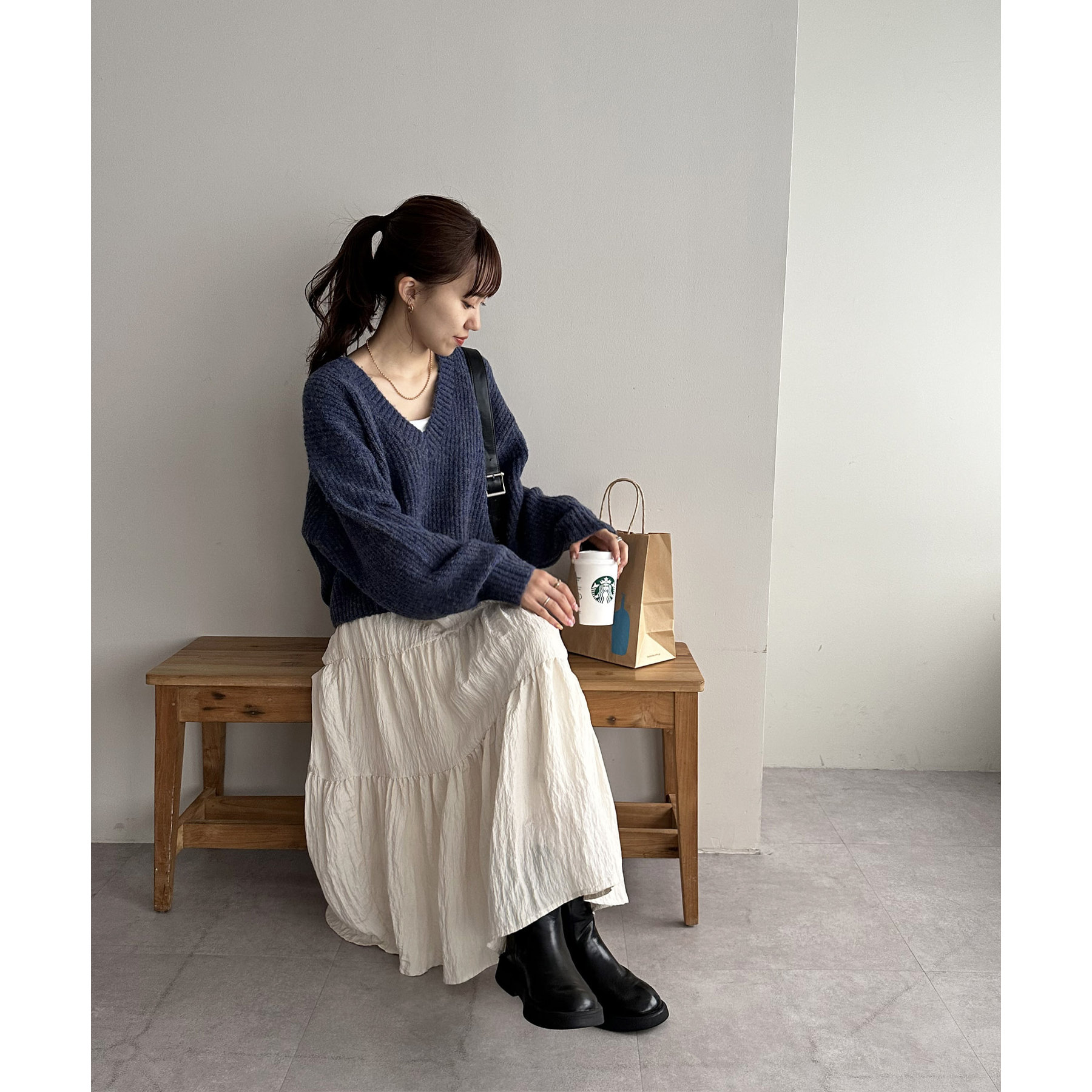 Vネックのデザインが女性らしく、コーディネートをヘルシーに見せてくれるニット。