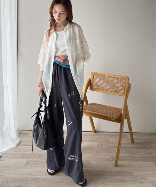フレアパンツと合わせた女性らしいスタイルや、