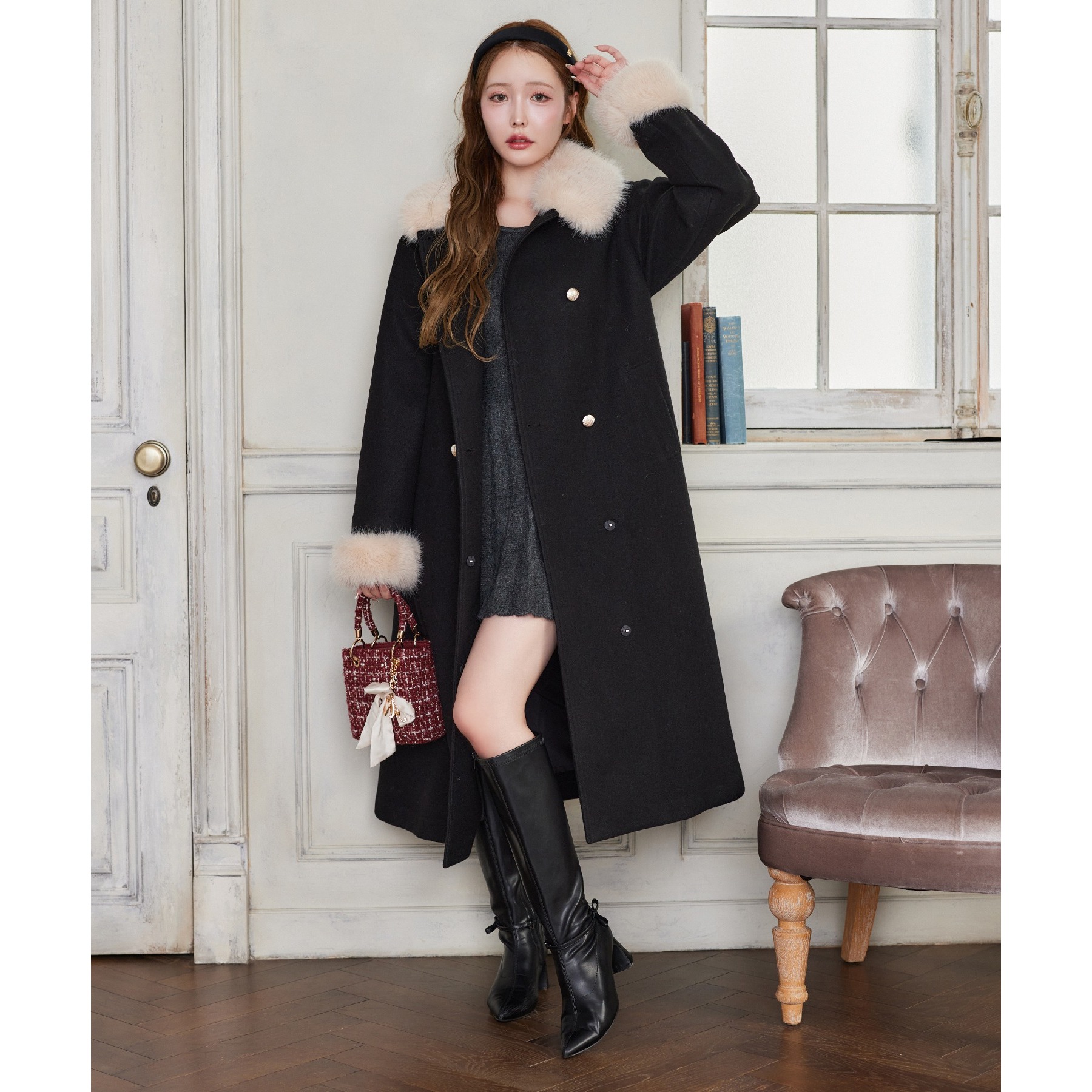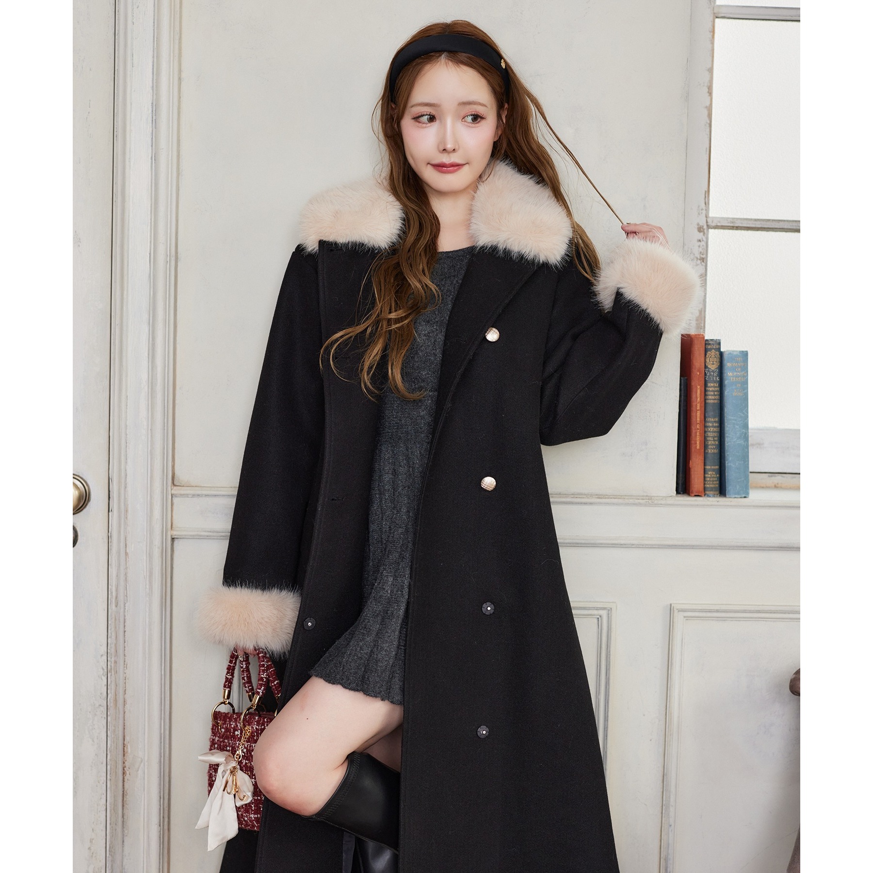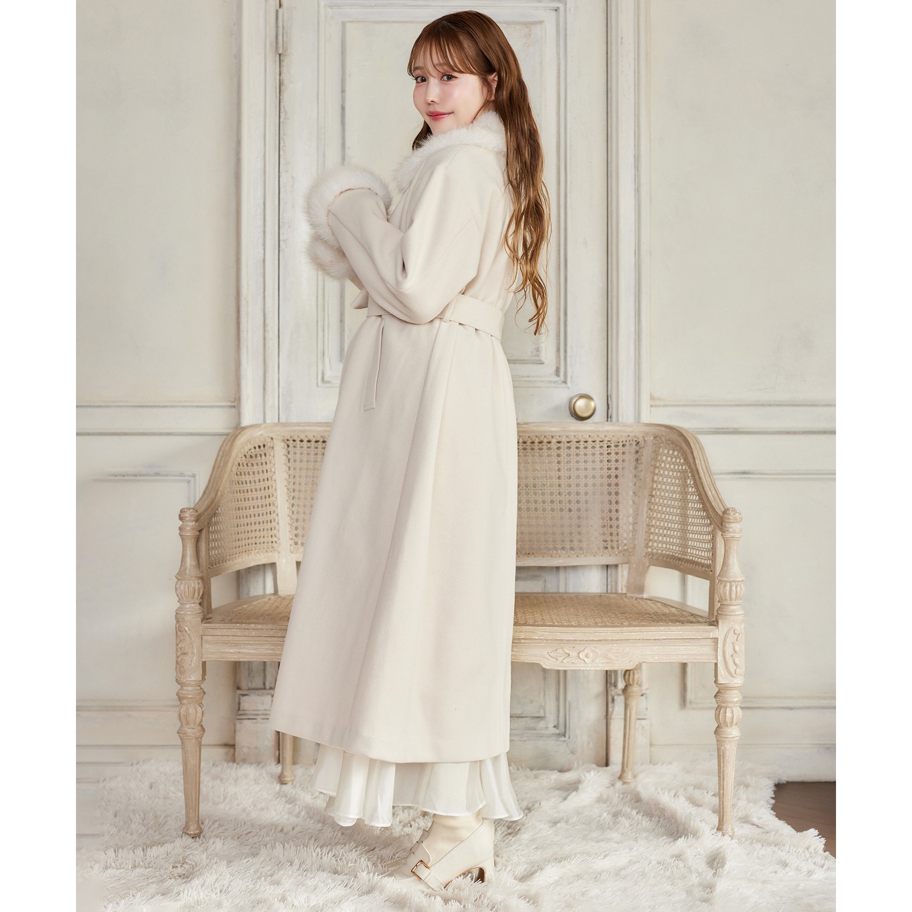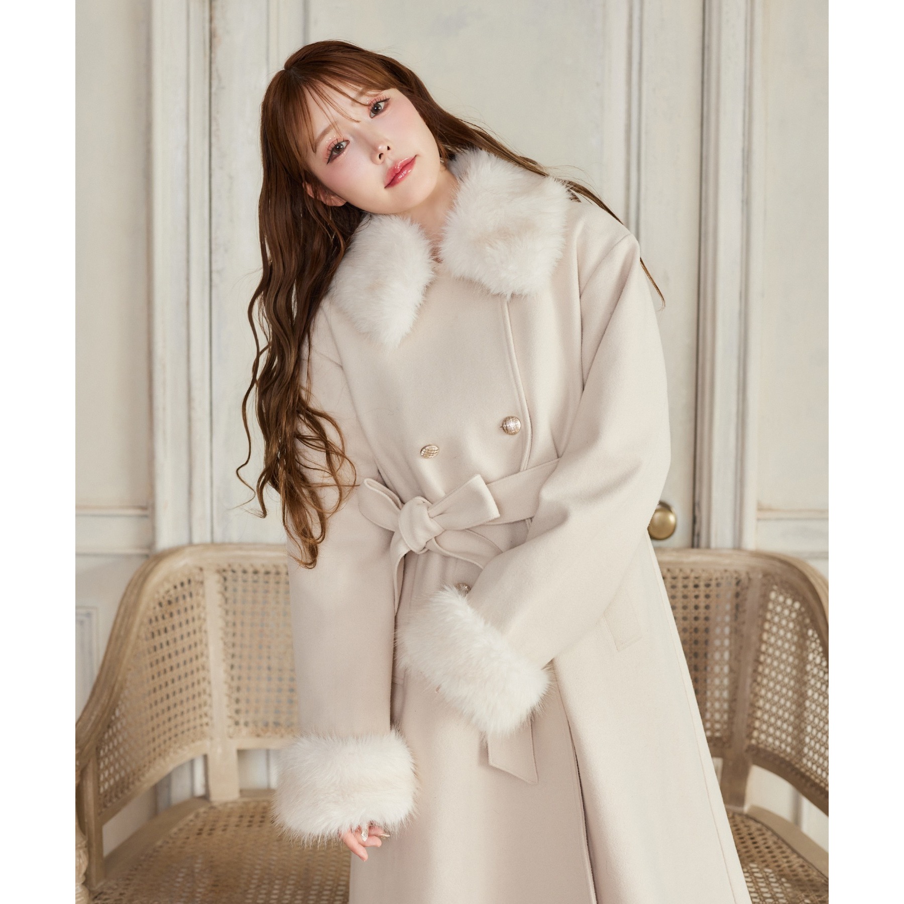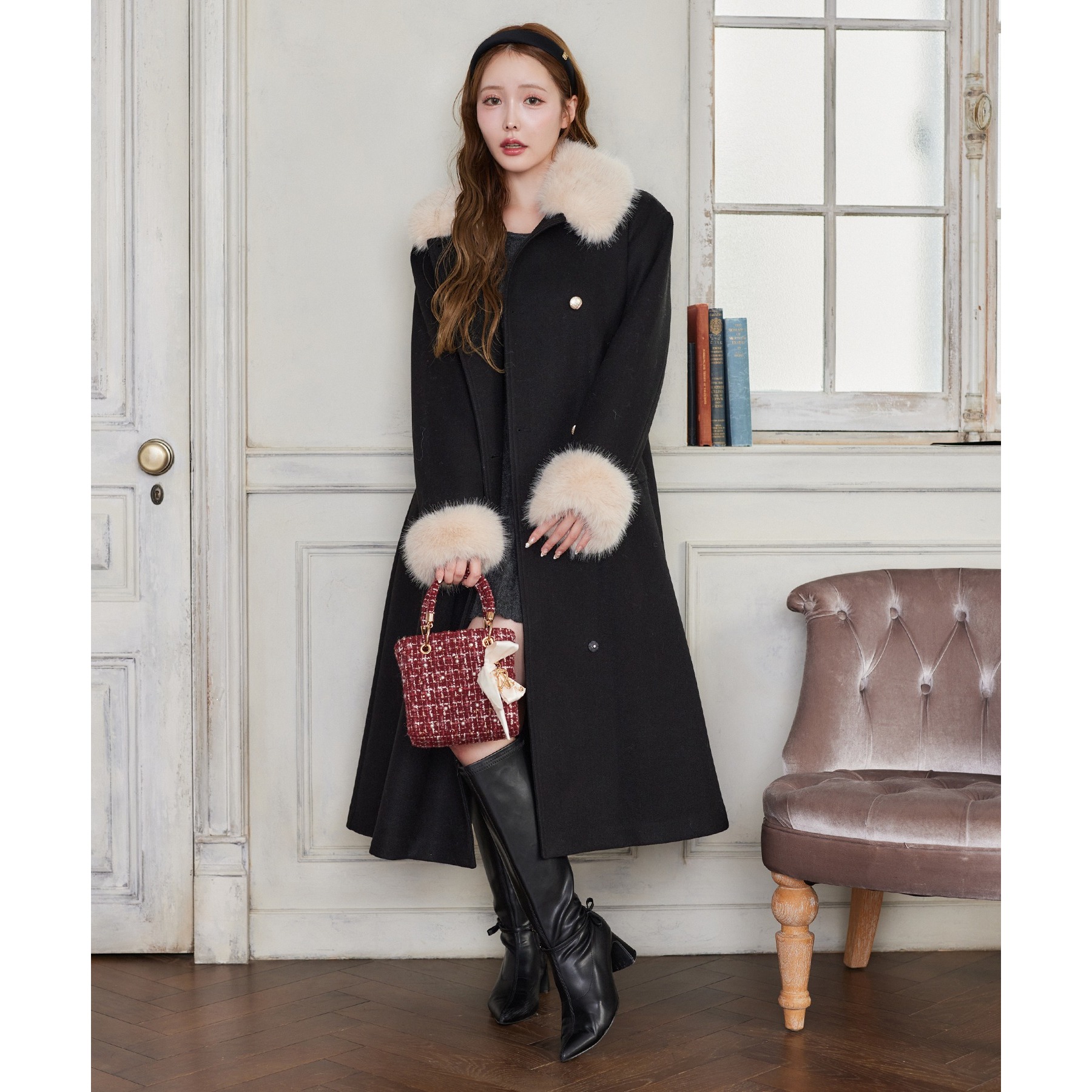 襟と袖口にふわふわのファーをあしらった、華やかで上品なロングコート。