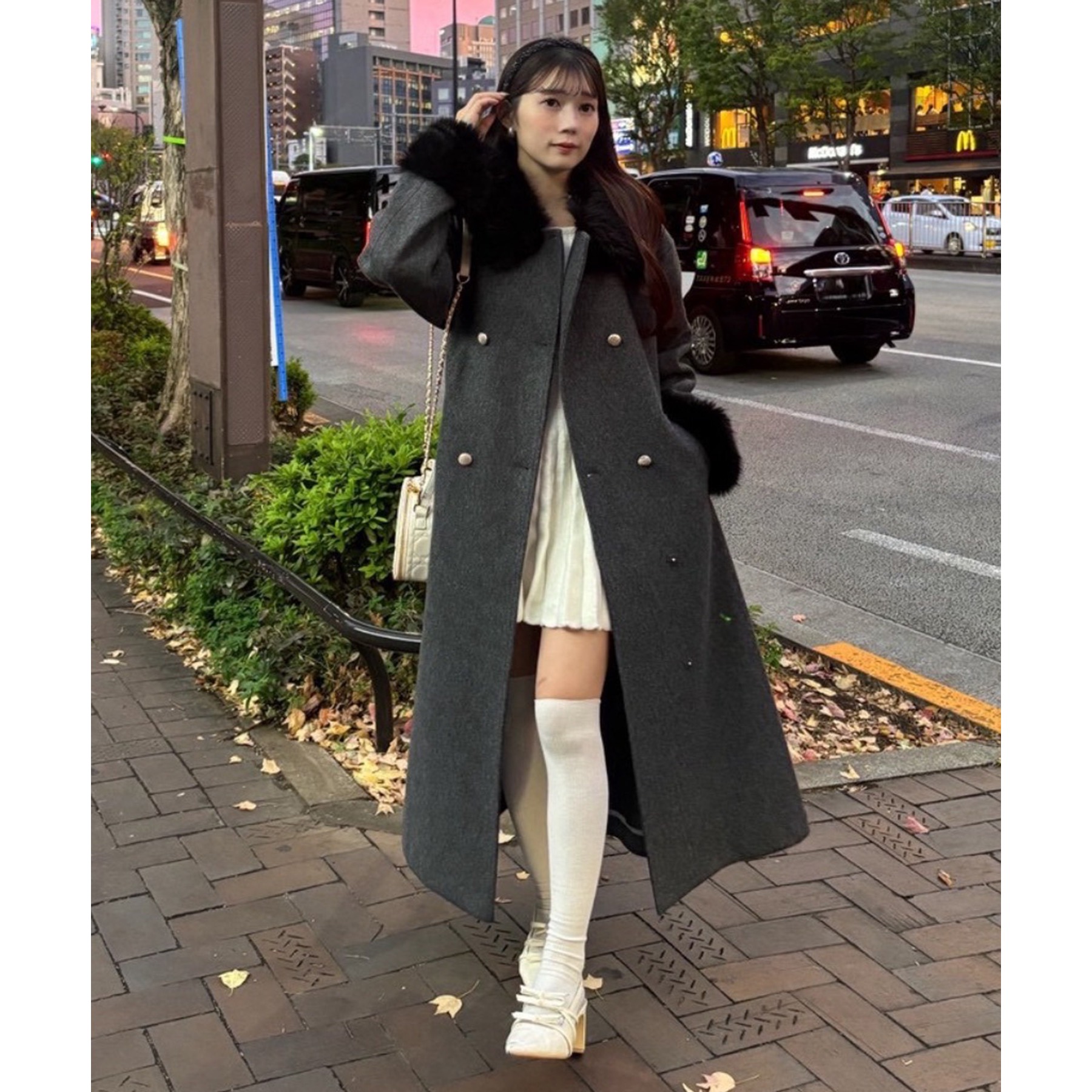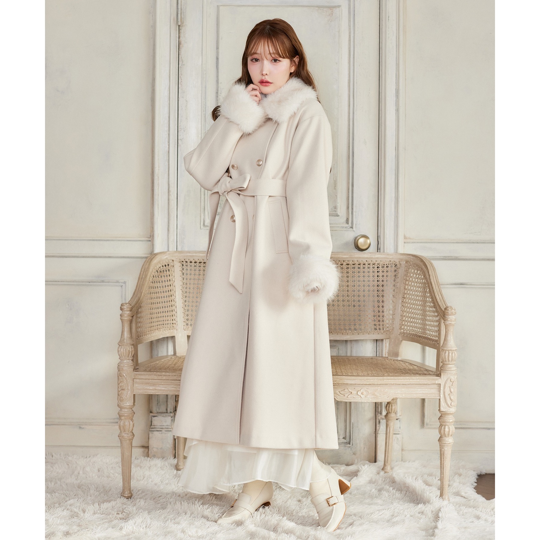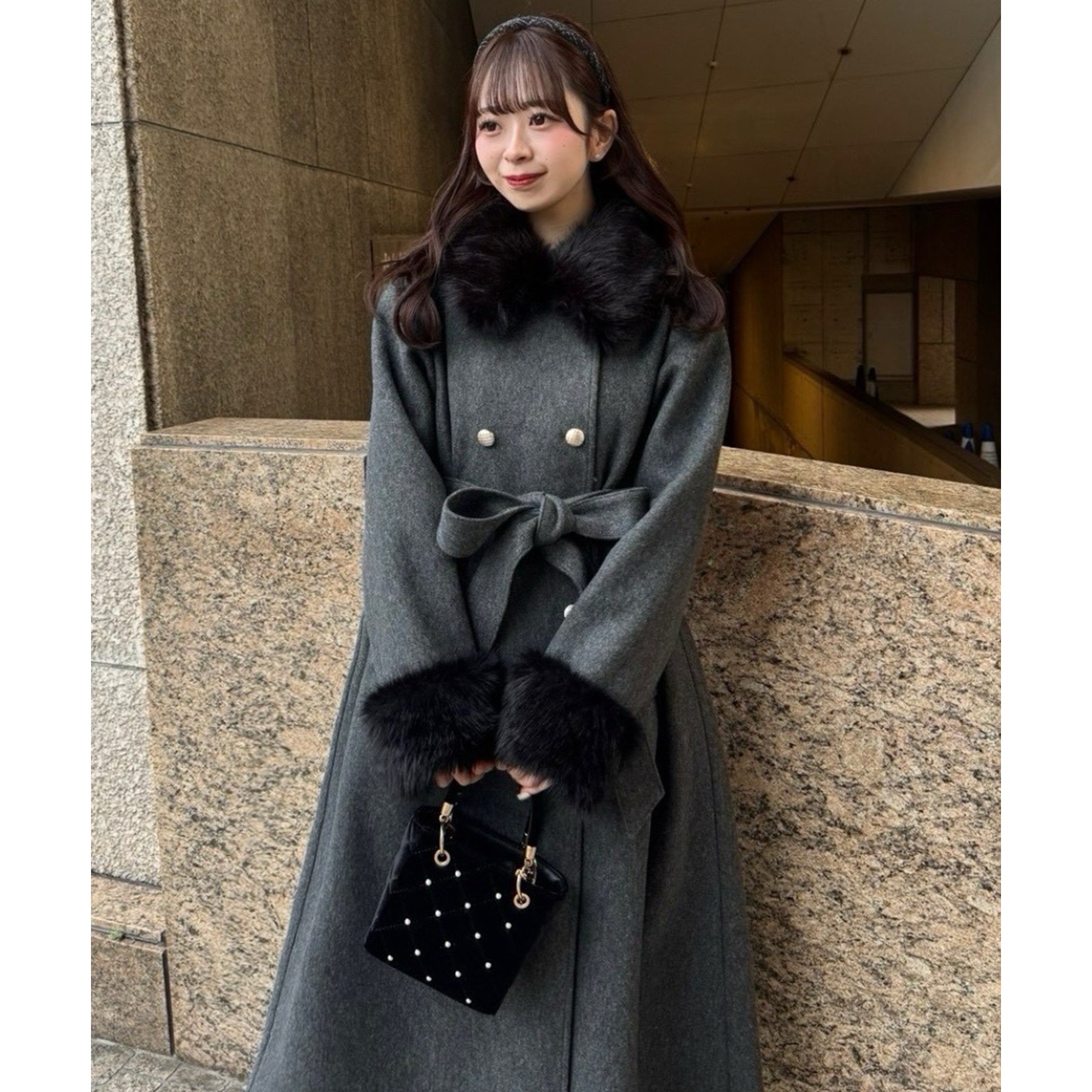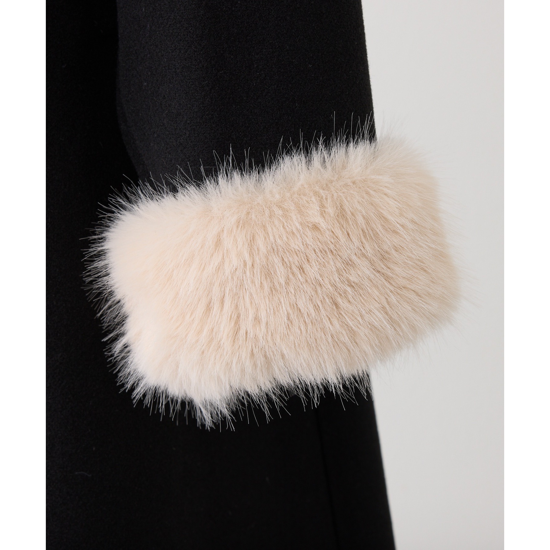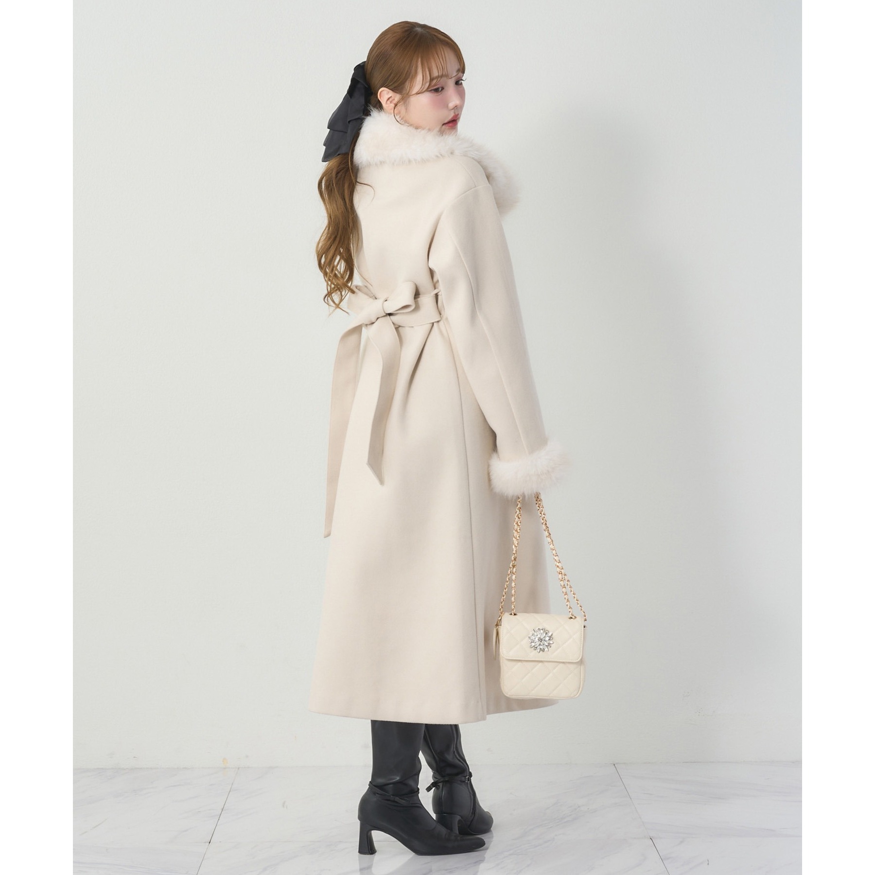 襟と袖口にふわふわのファーをあしらった、華やかで上品なロングコート。