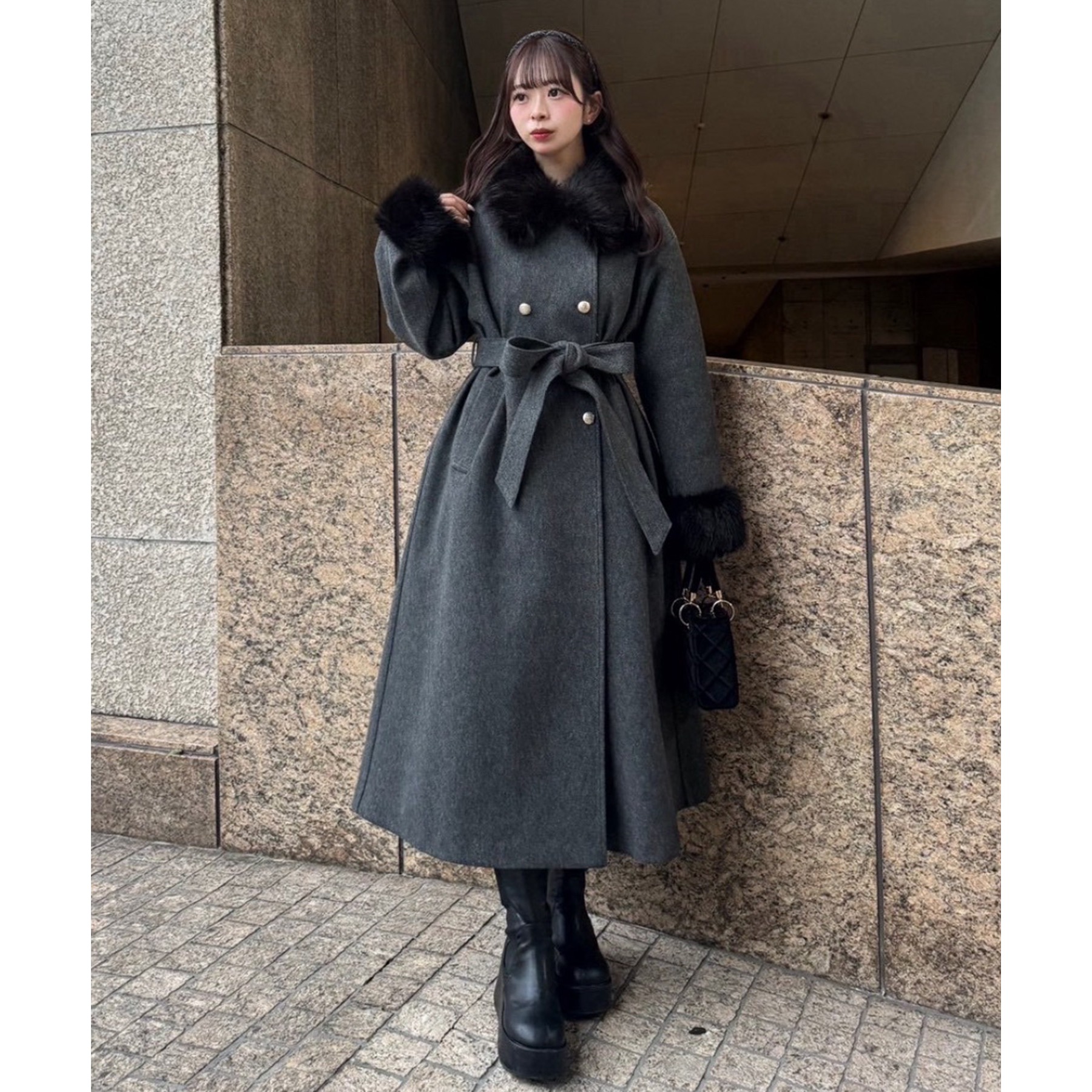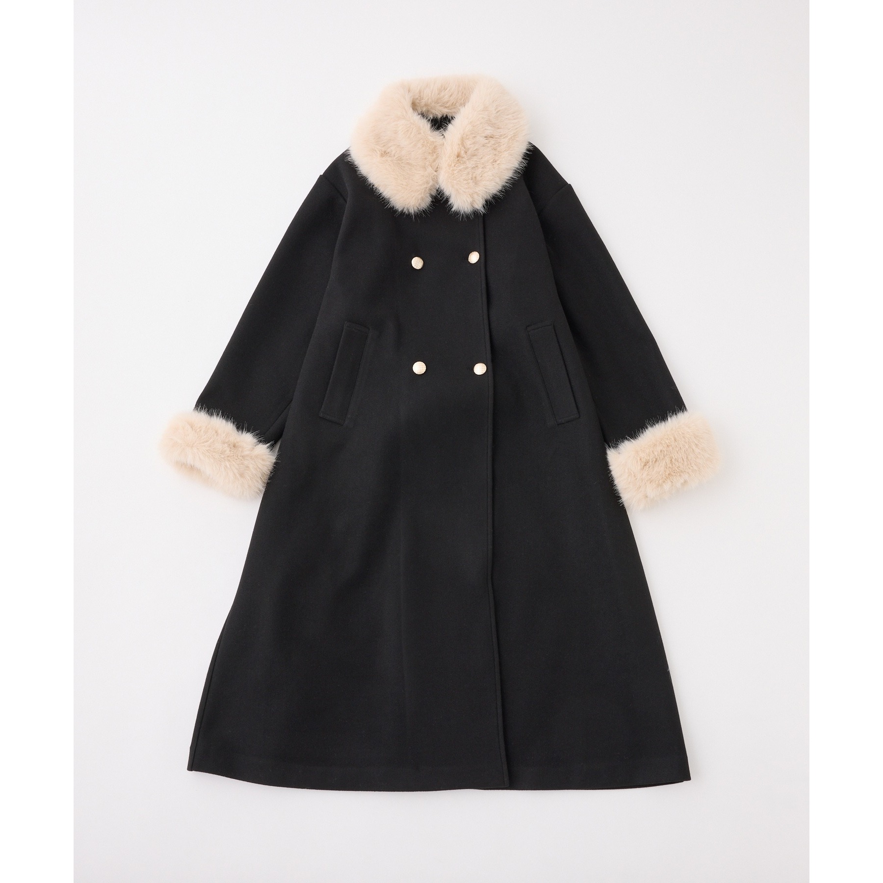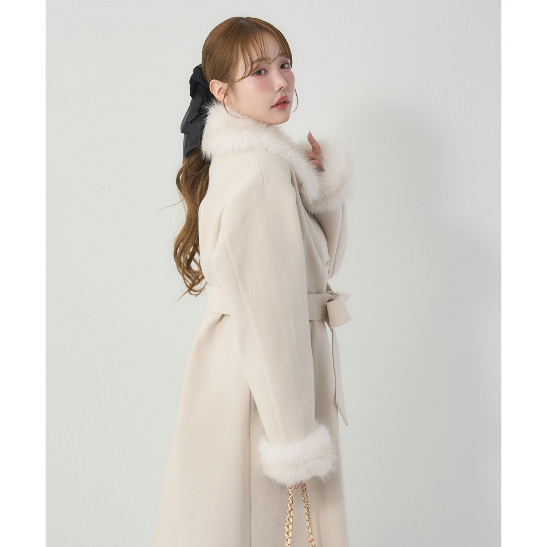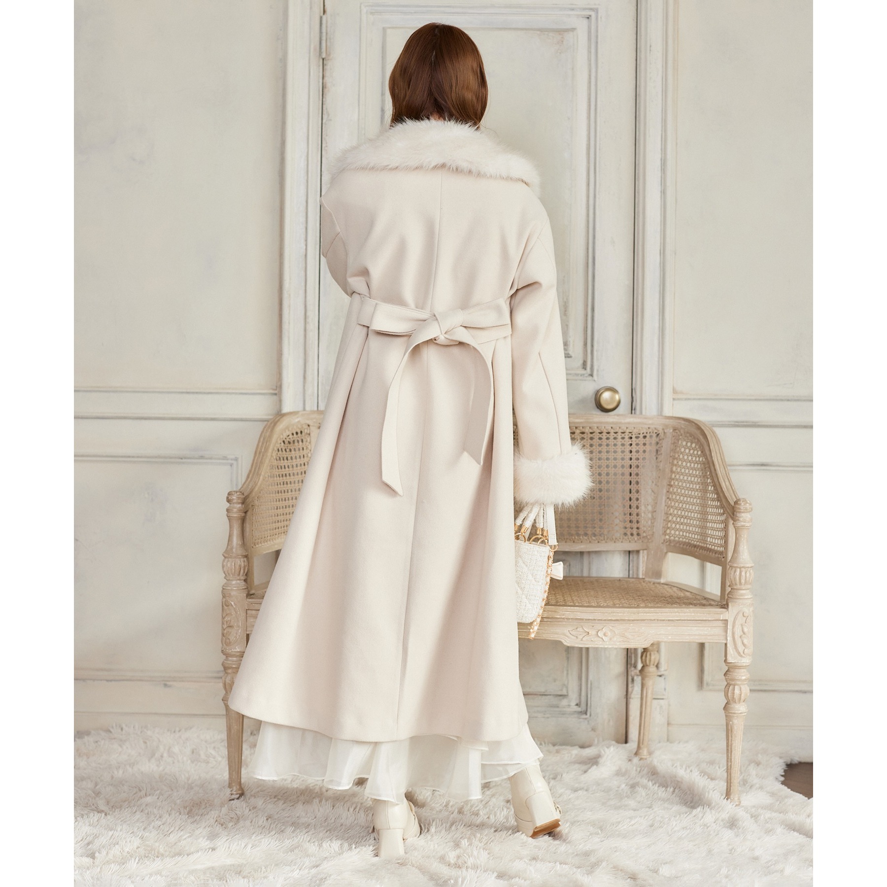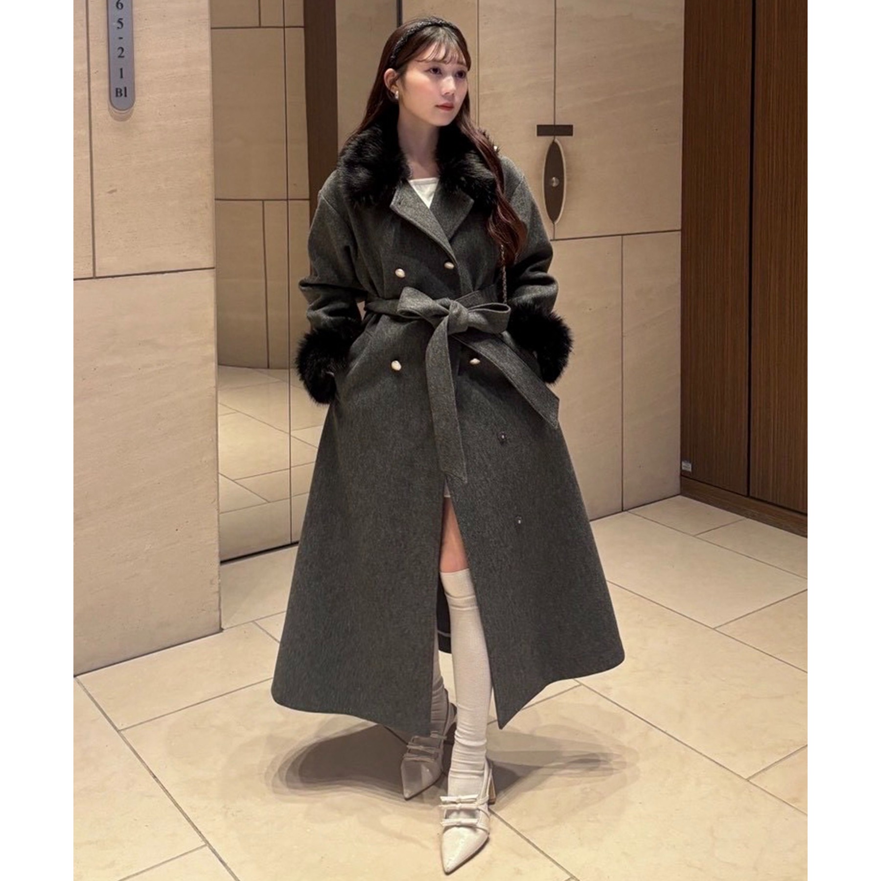 襟と袖口にふわふわのファーをあしらった、華やかで上品なロングコート。