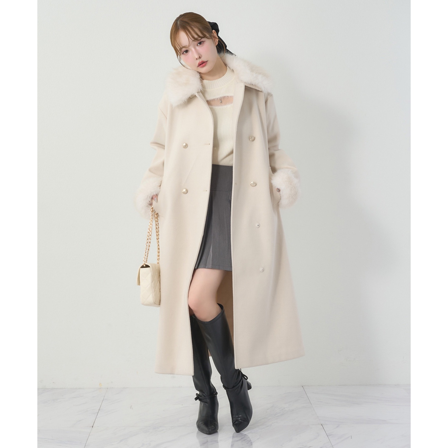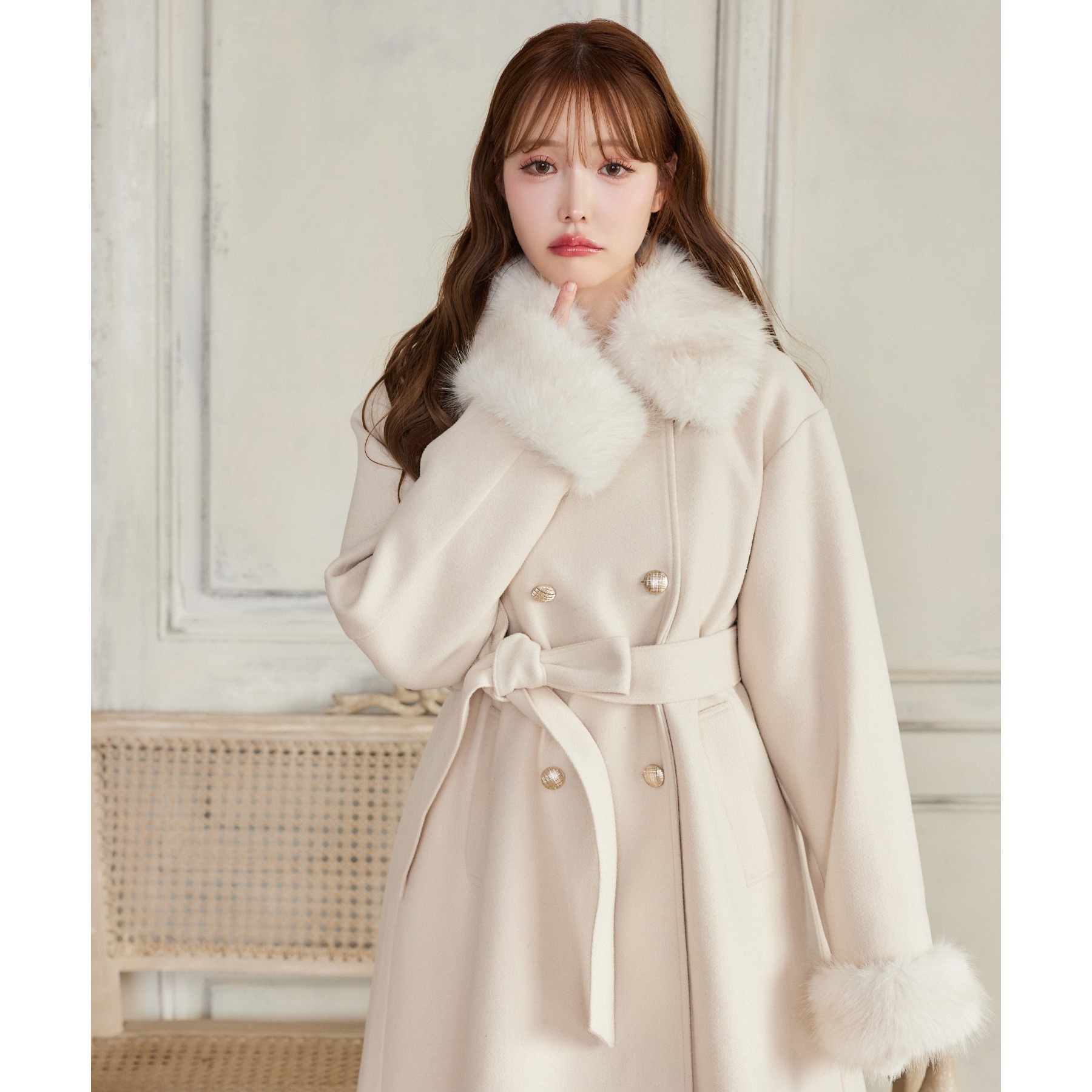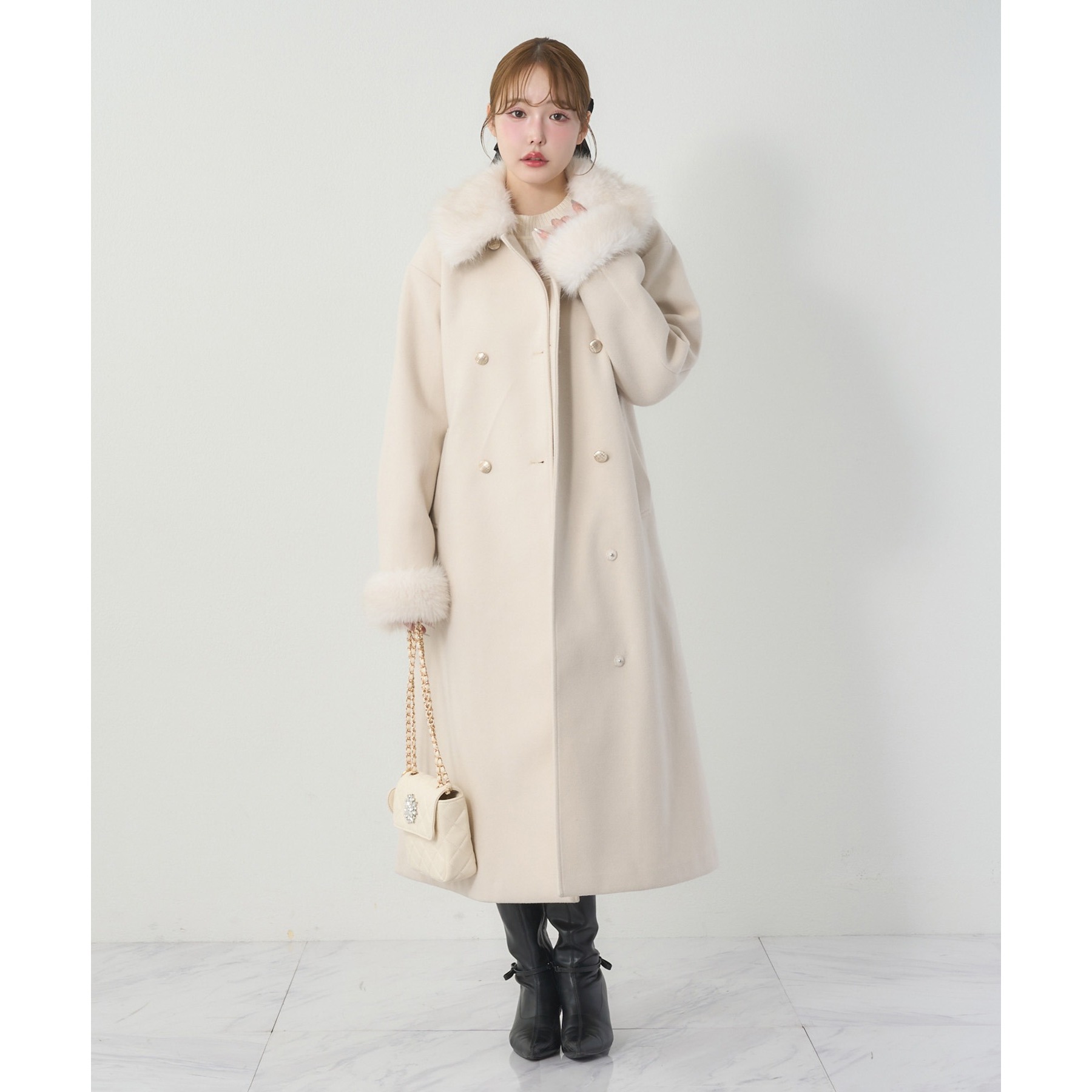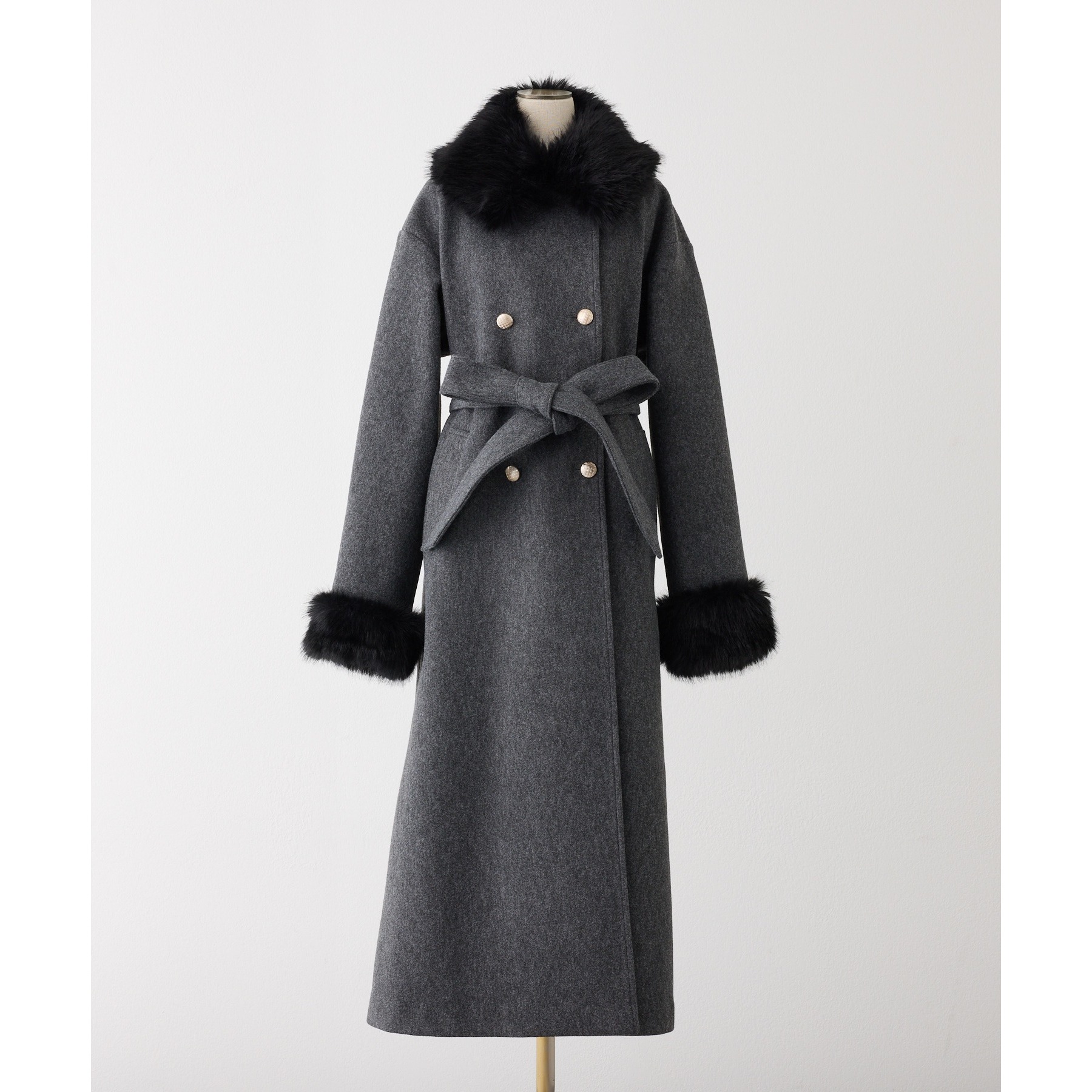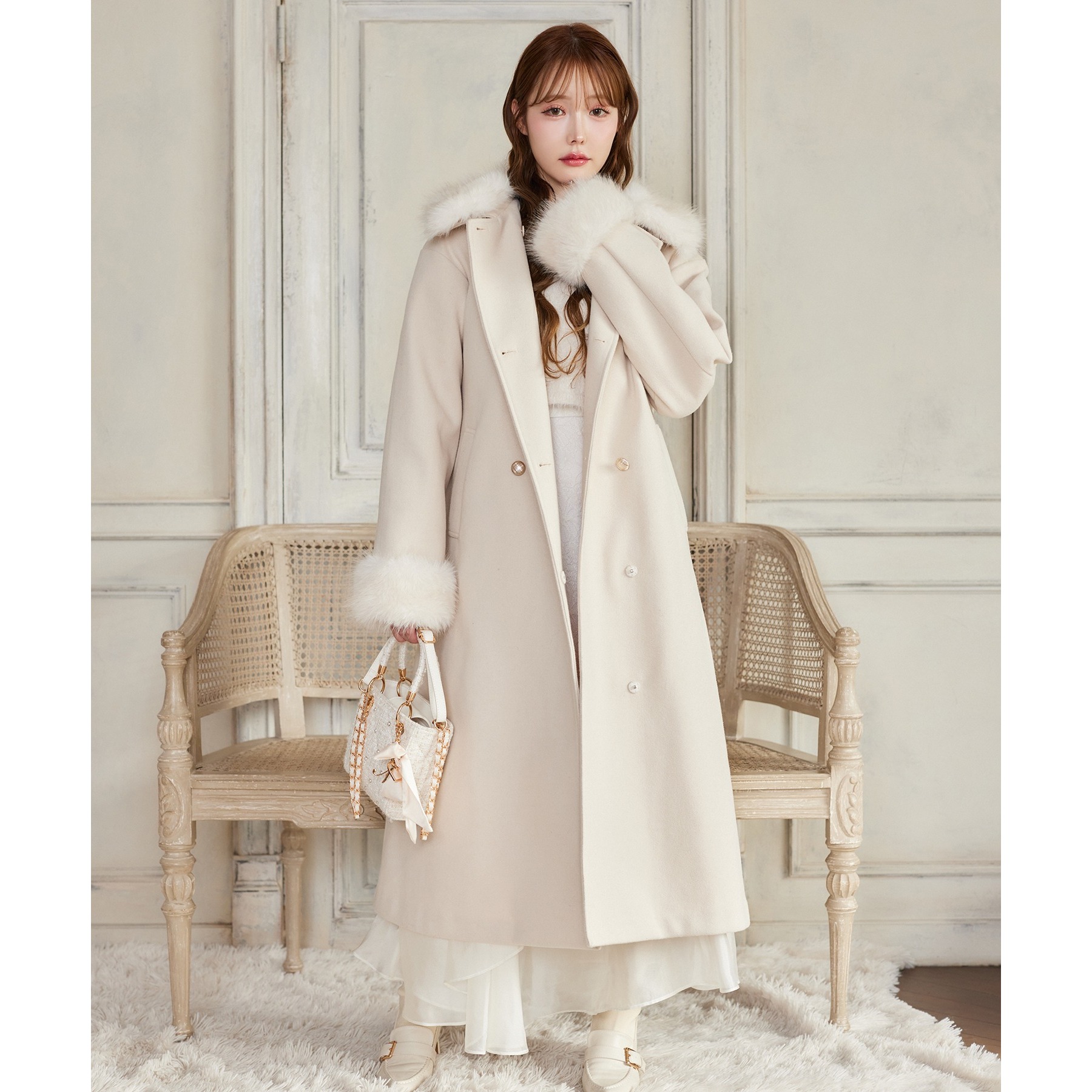 襟と袖口にふわふわのファーをあしらった、華やかで上品なロングコート。