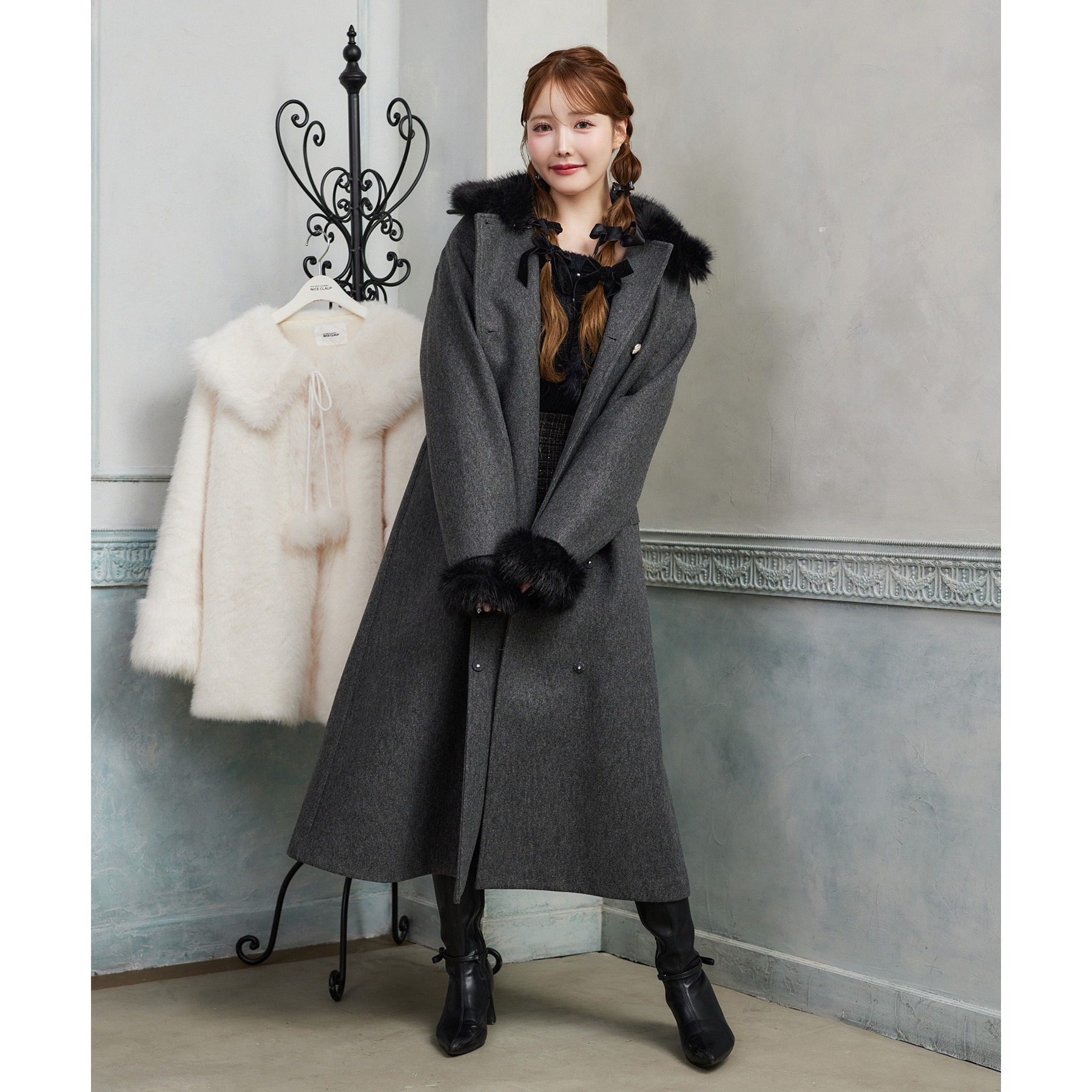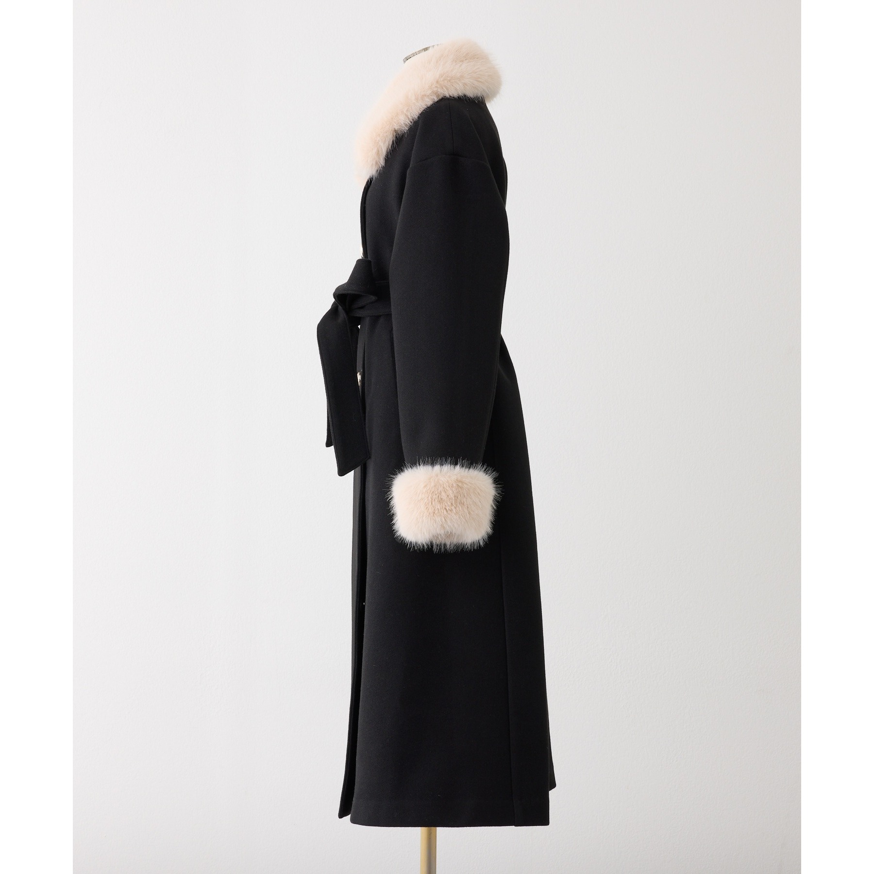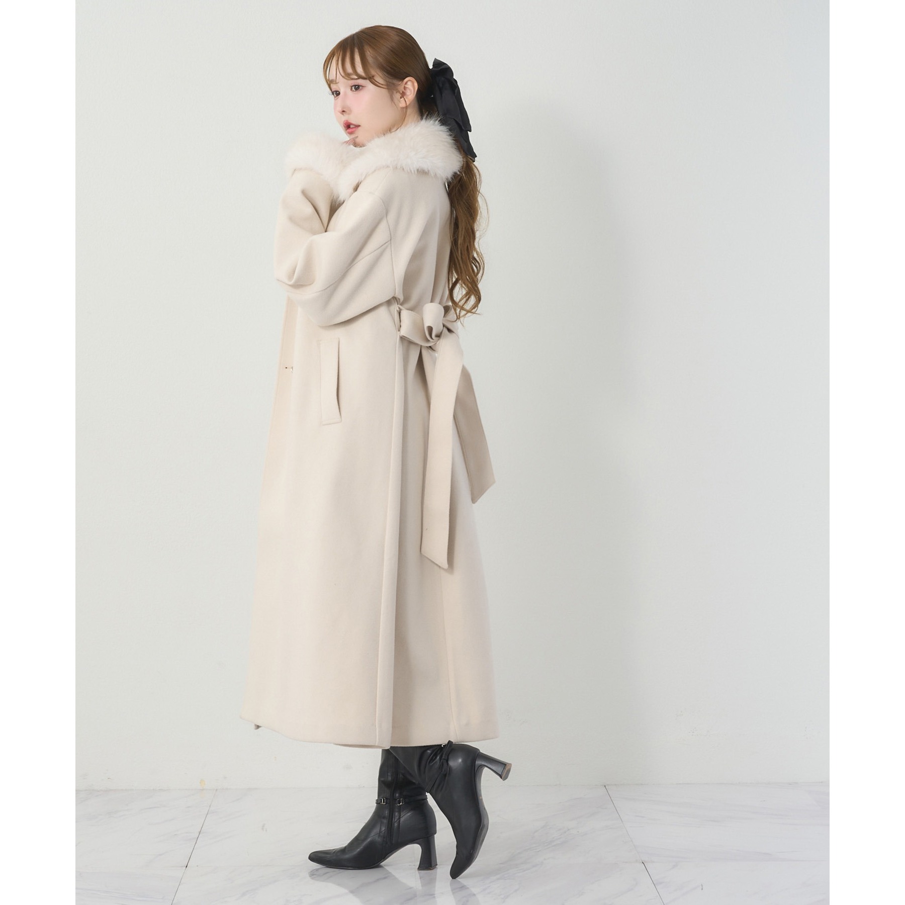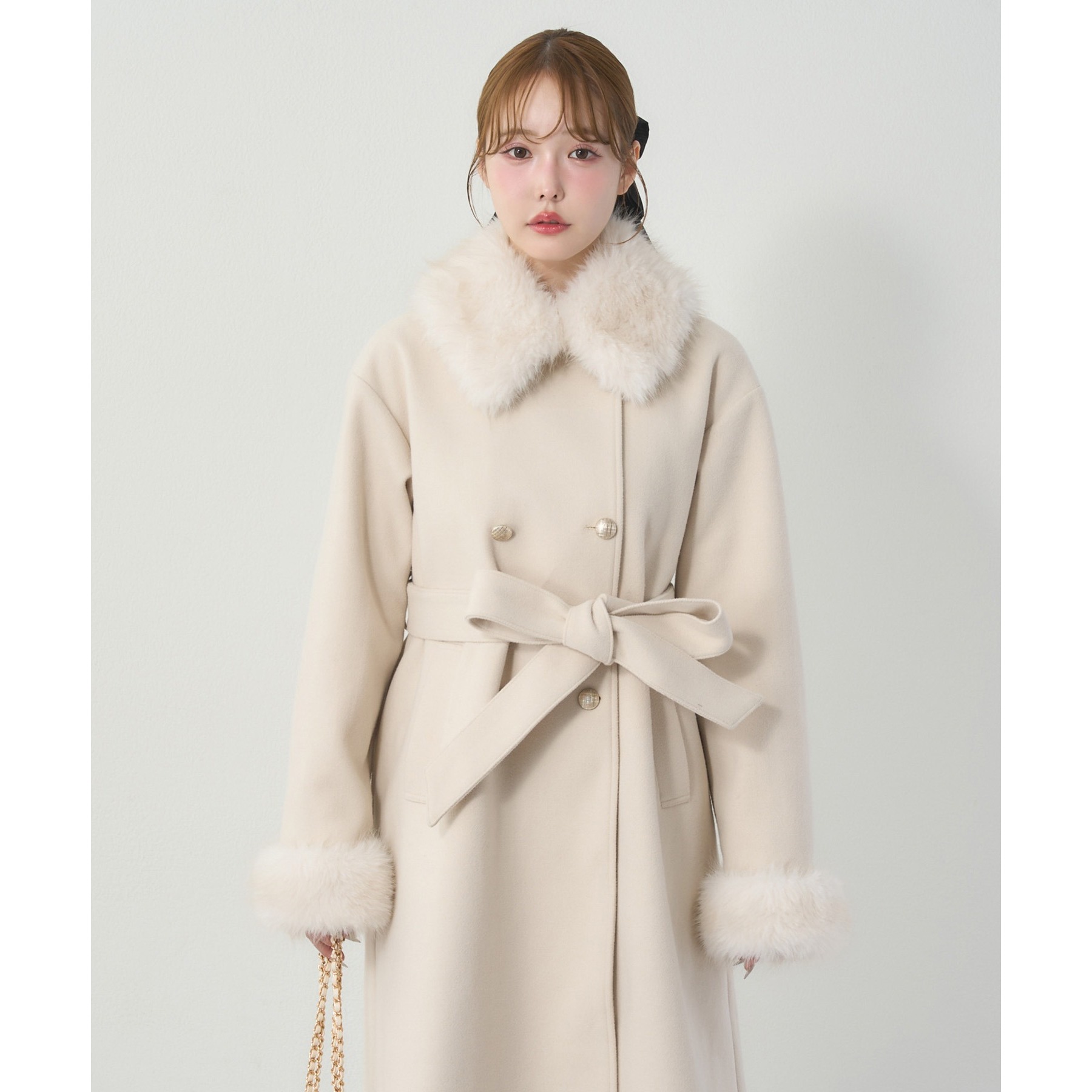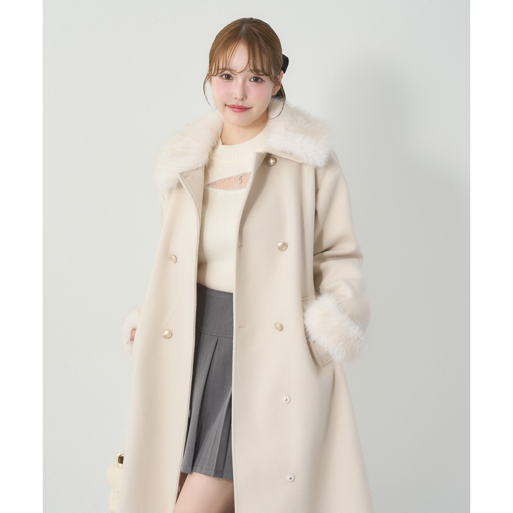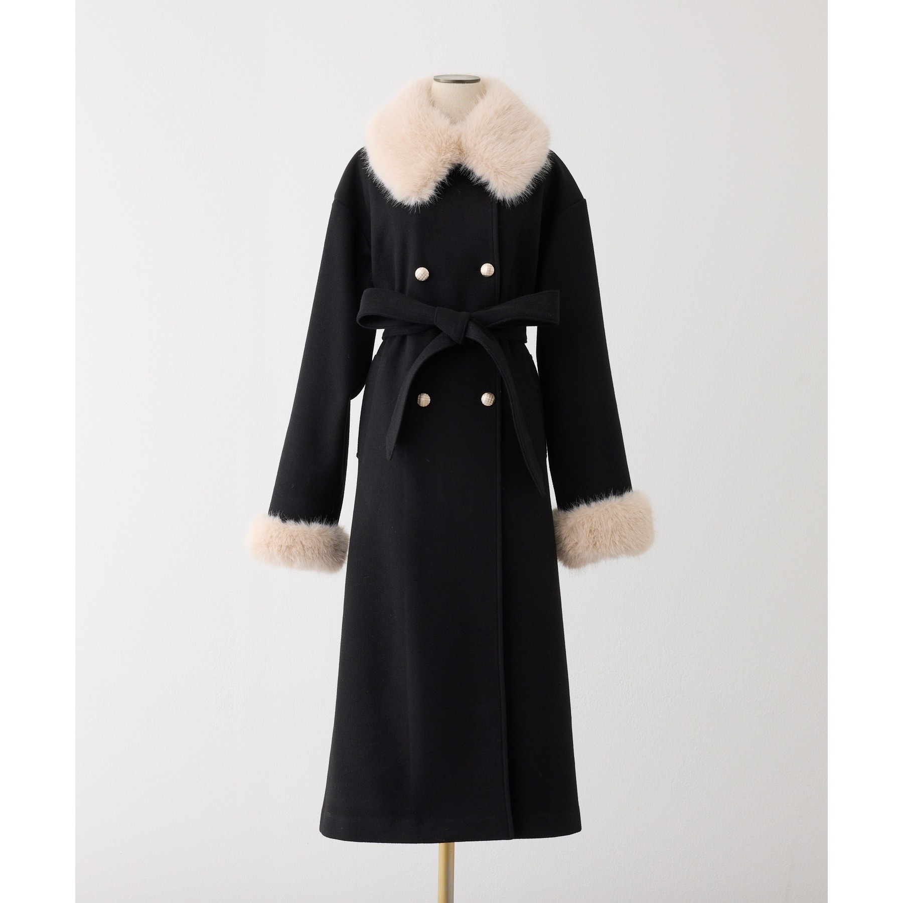 襟と袖口にふわふわのファーをあしらった、華やかで上品なロングコート。
