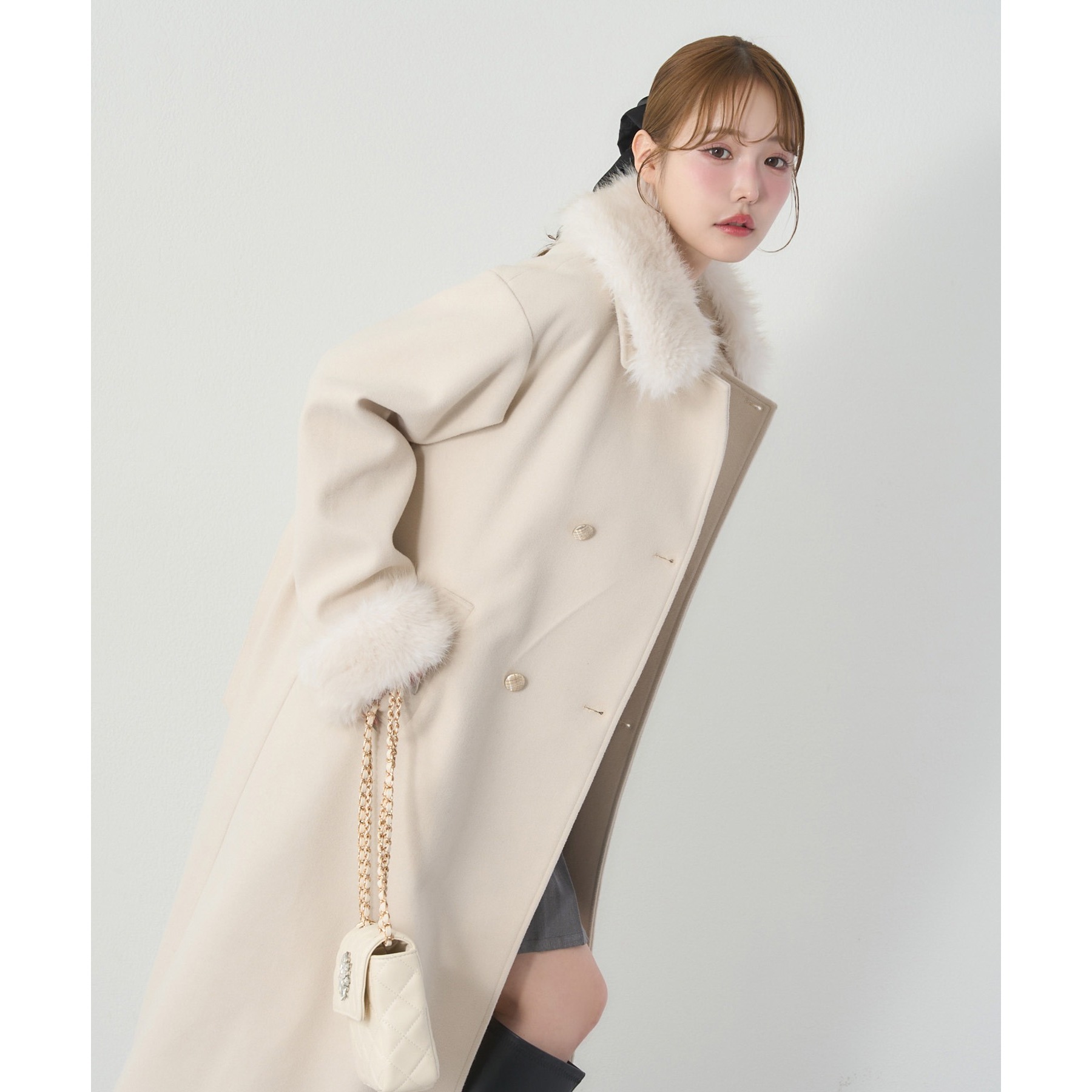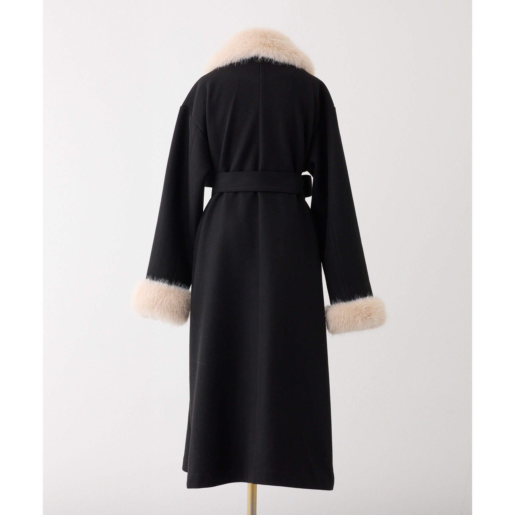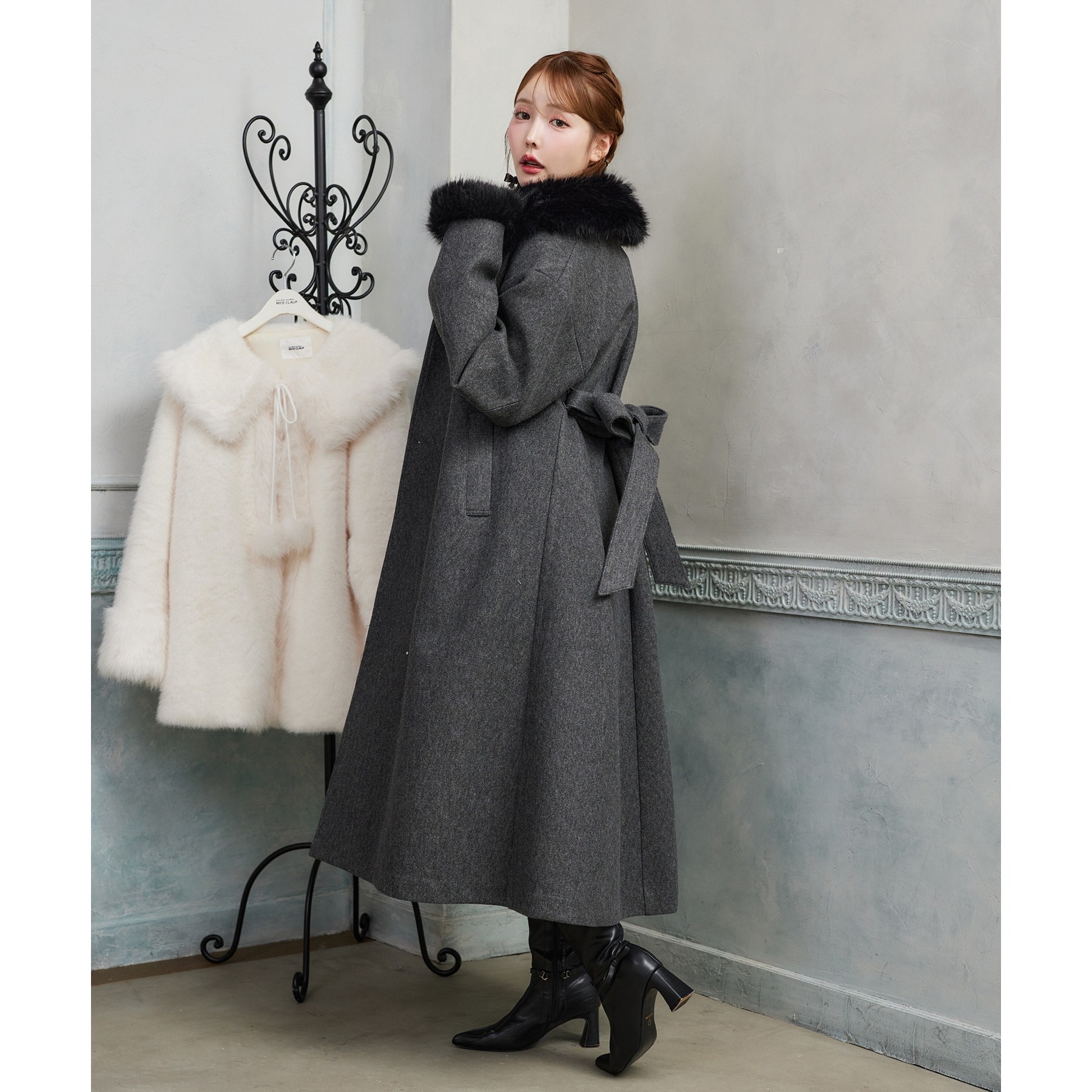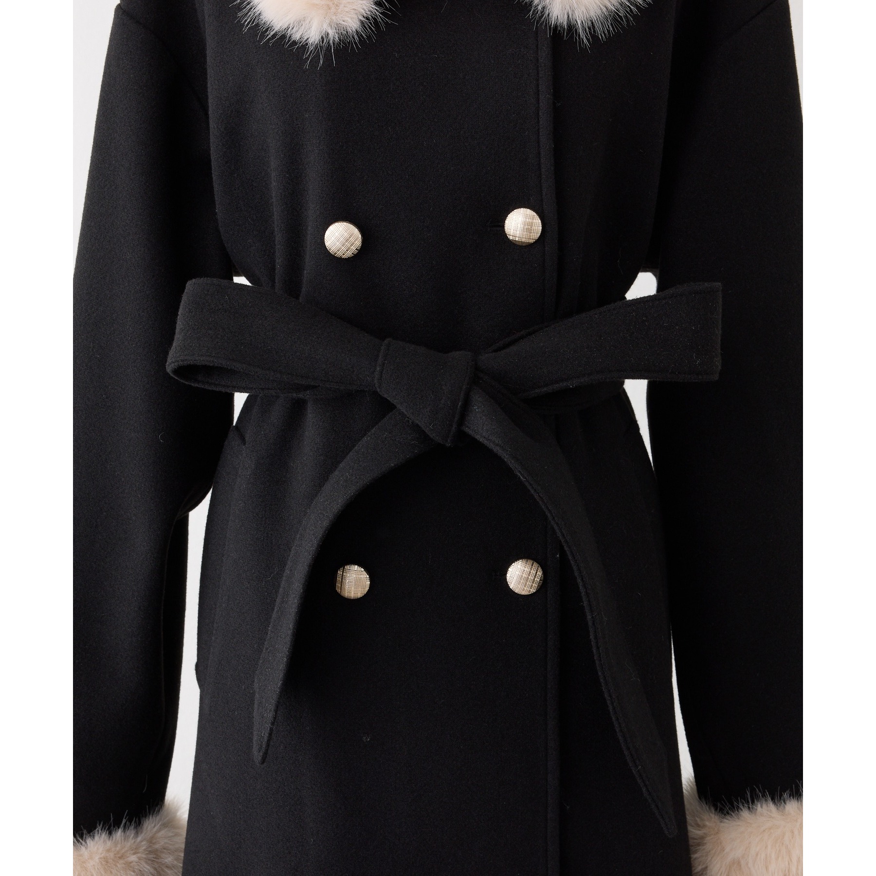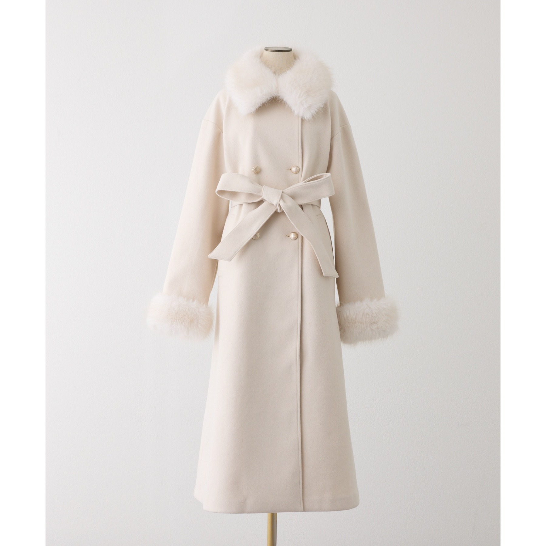襟と袖口にふわふわのファーをあしらった、華やかで上品なロングコート。
