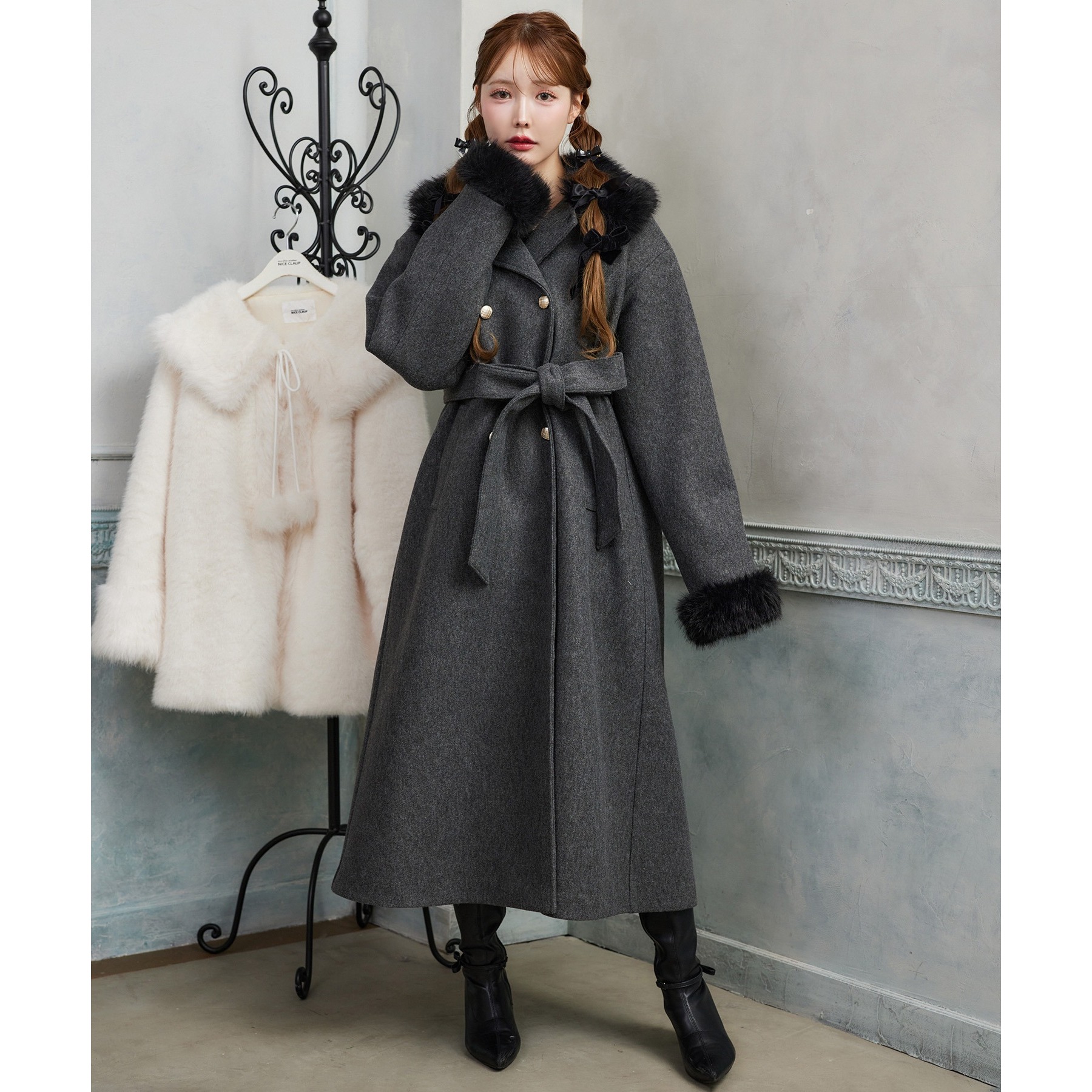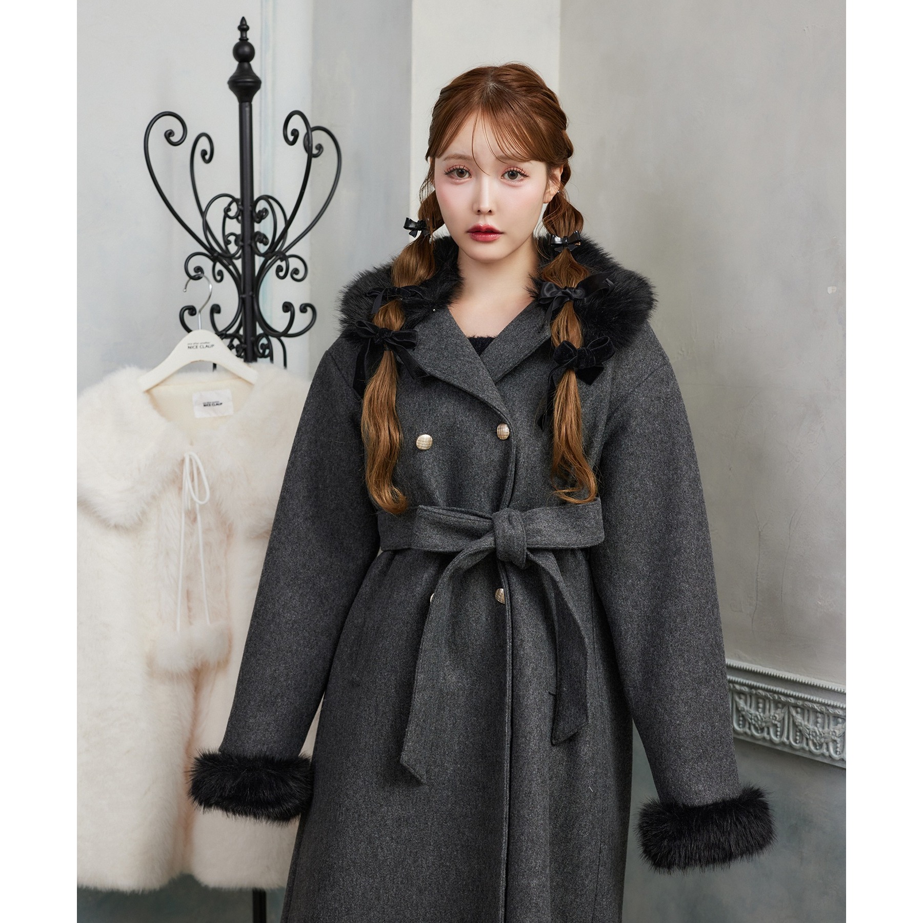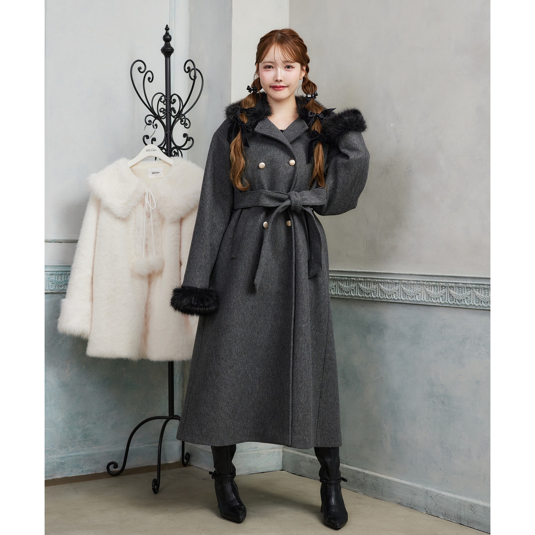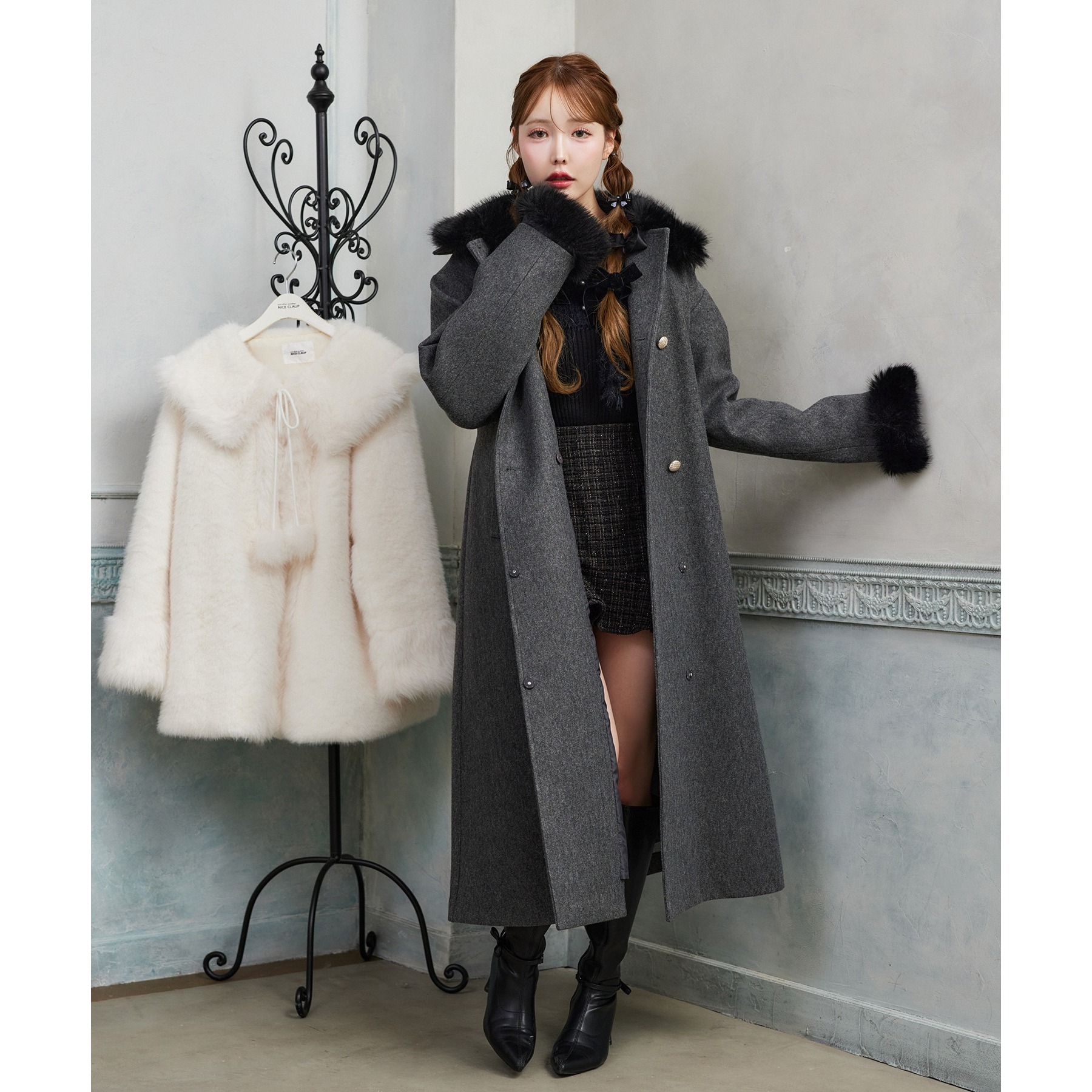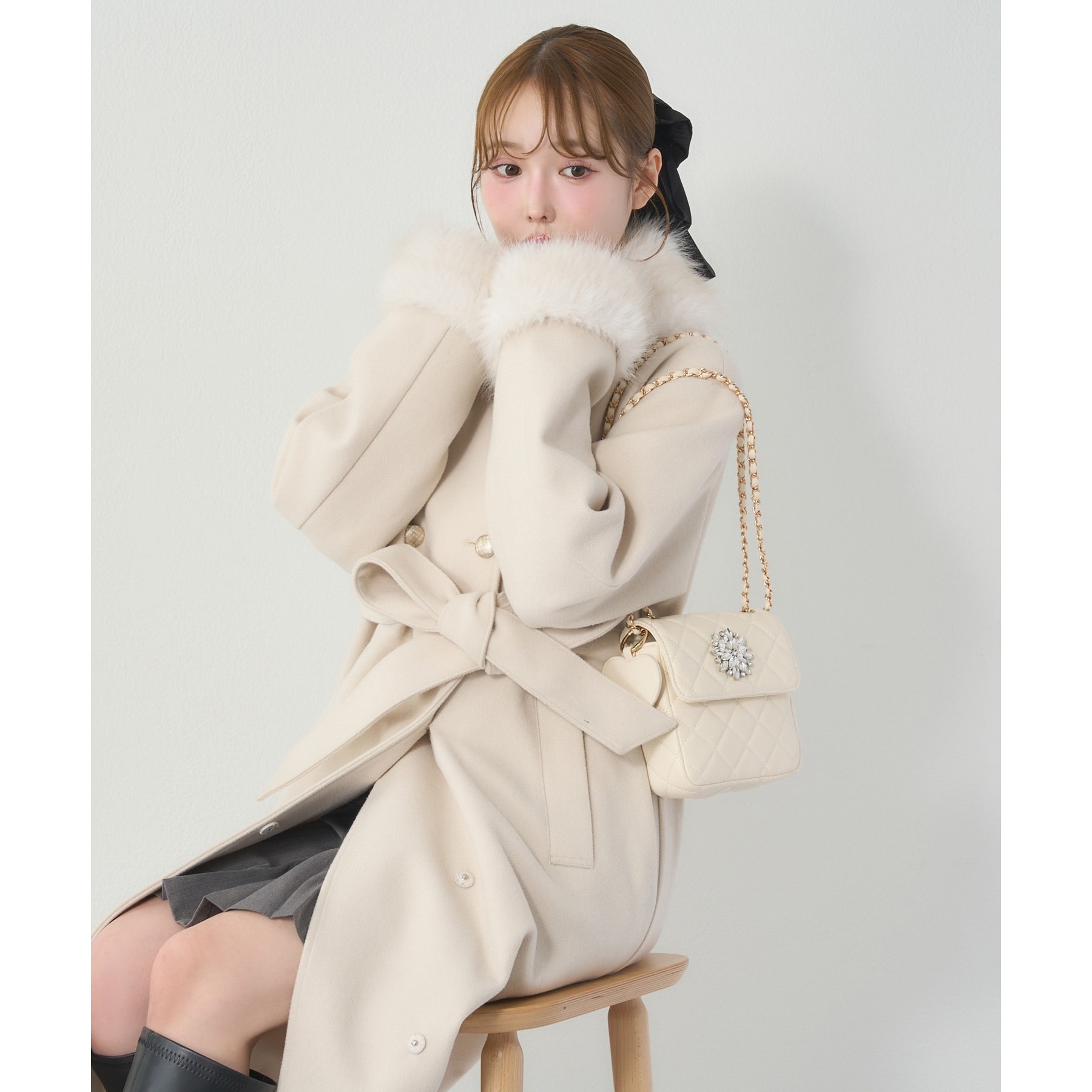 襟と袖口にふわふわのファーをあしらった、華やかで上品なロングコート。