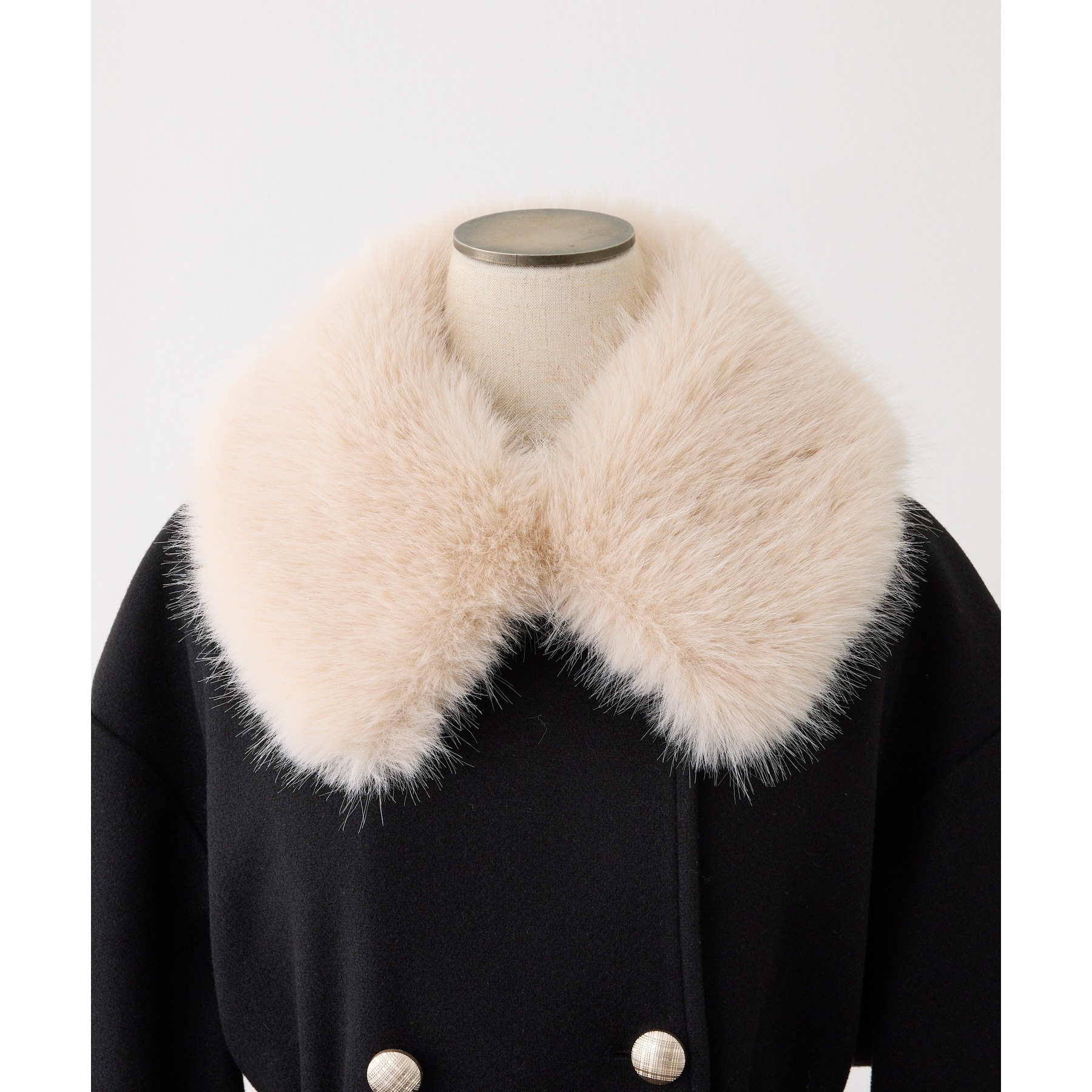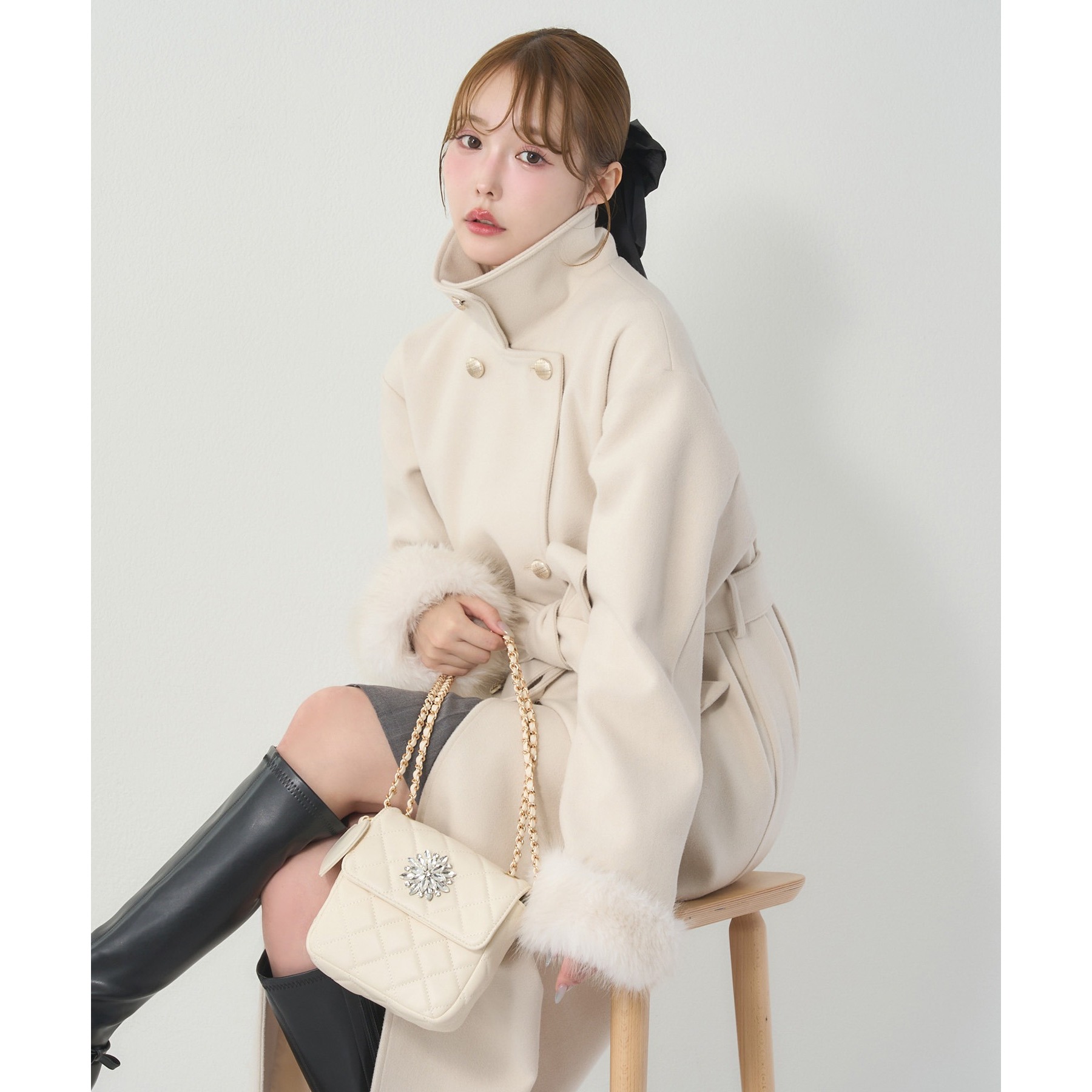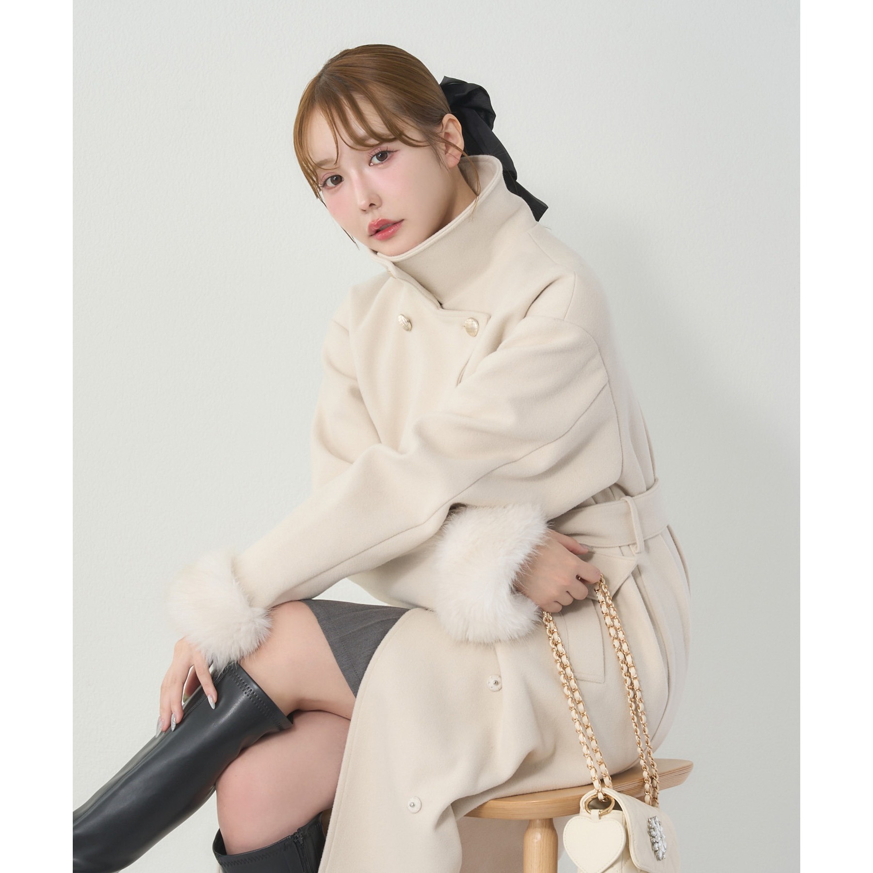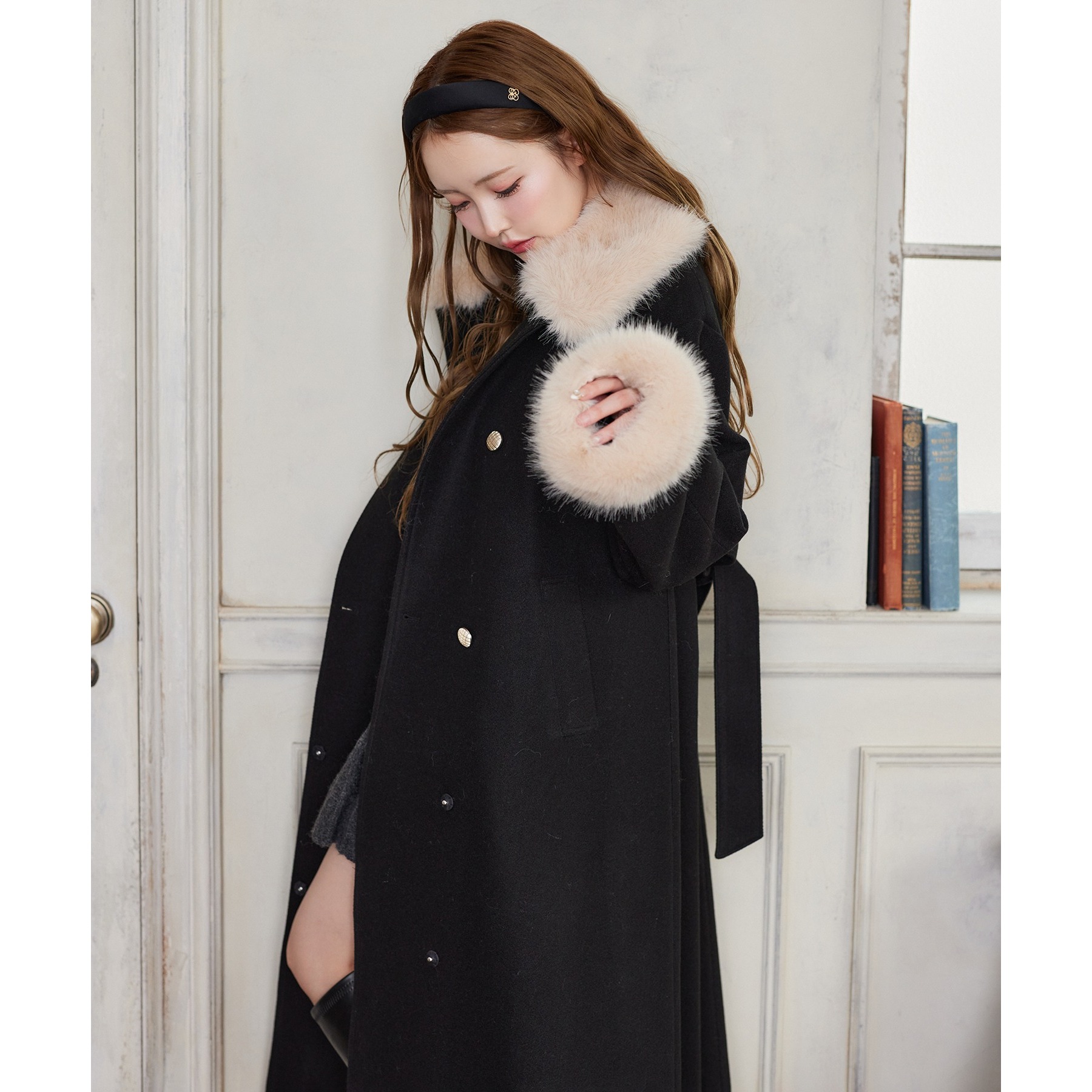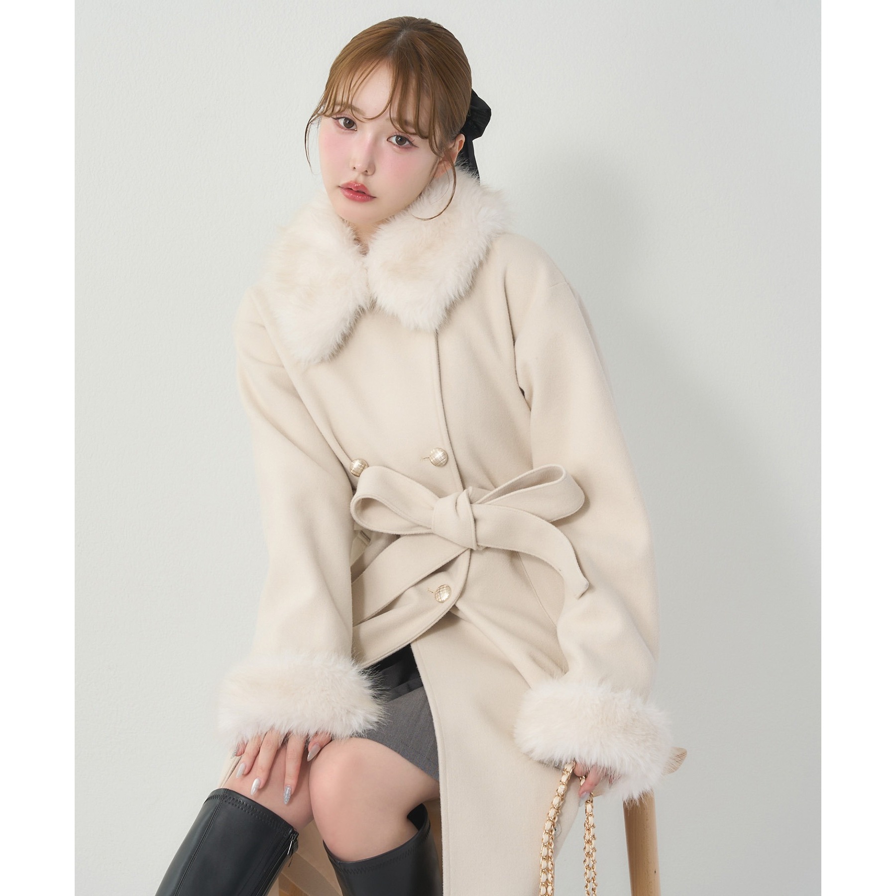 襟と袖口にふわふわのファーをあしらった、華やかで上品なロングコート。