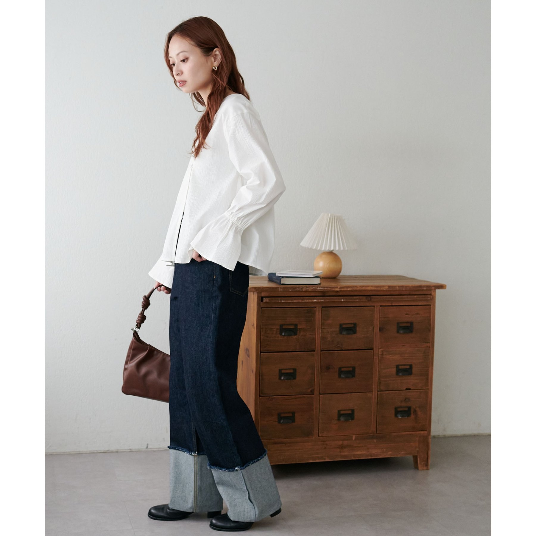 ボトムスはテーパードパンツやワイドパンツを合わせてきれいめに。デニムと合わせてカジュアルダウンしても◎