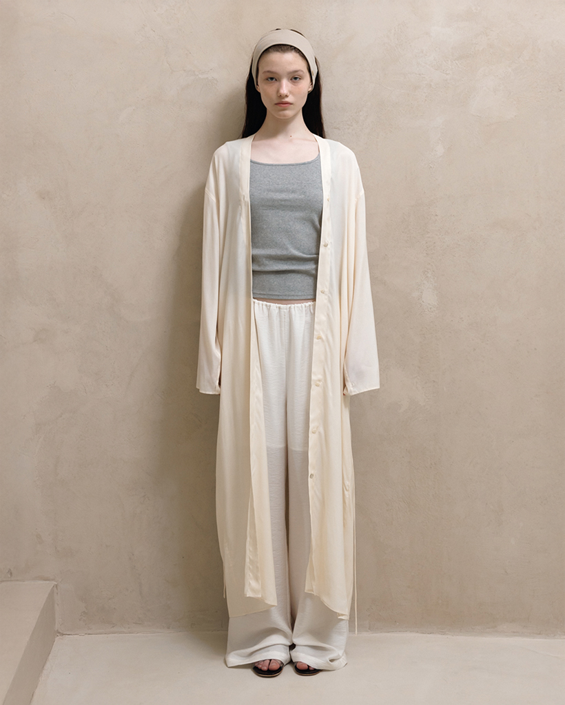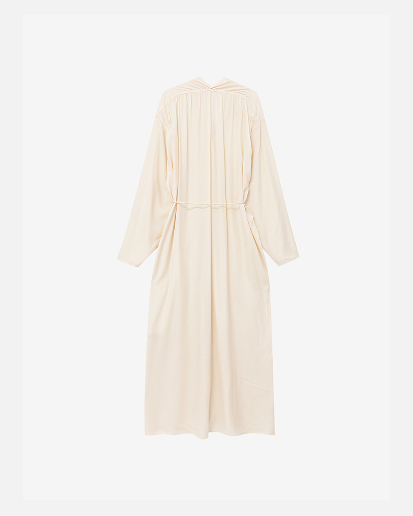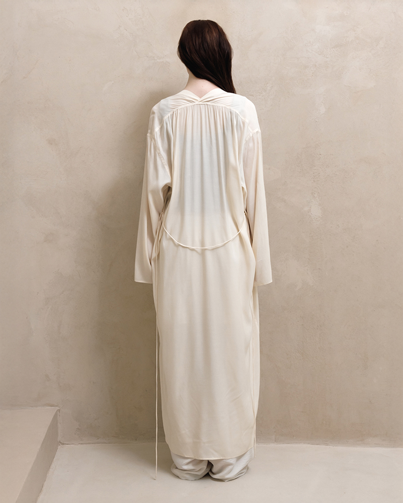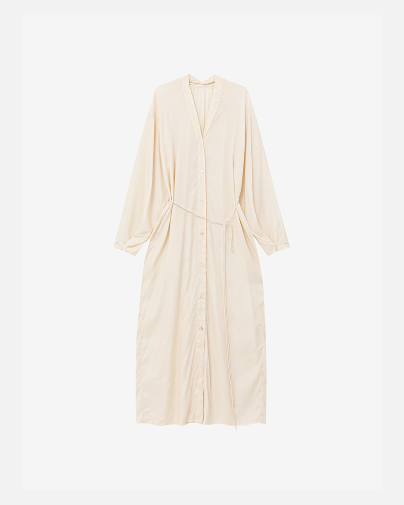ボタンを外してトラウザーと合わせてローブ風アウターとして、またボタンを留めてドレスとしても着用できるツーウェイアイテムです。