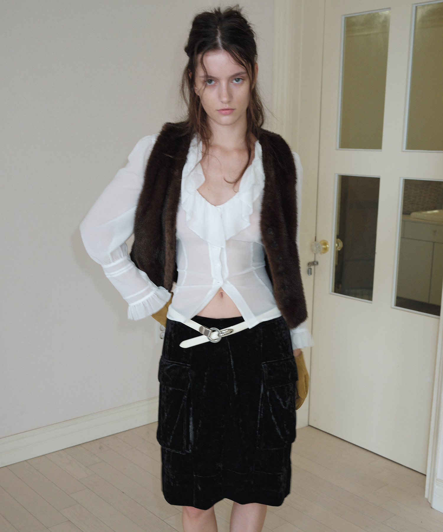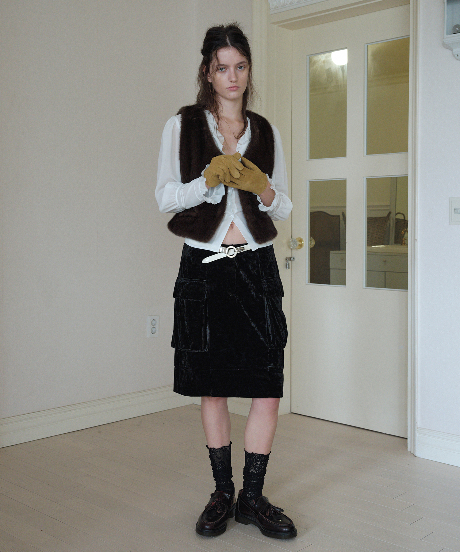 ベルベットの光沢とテクスチャー感が際立つカーゴミディスカートです。