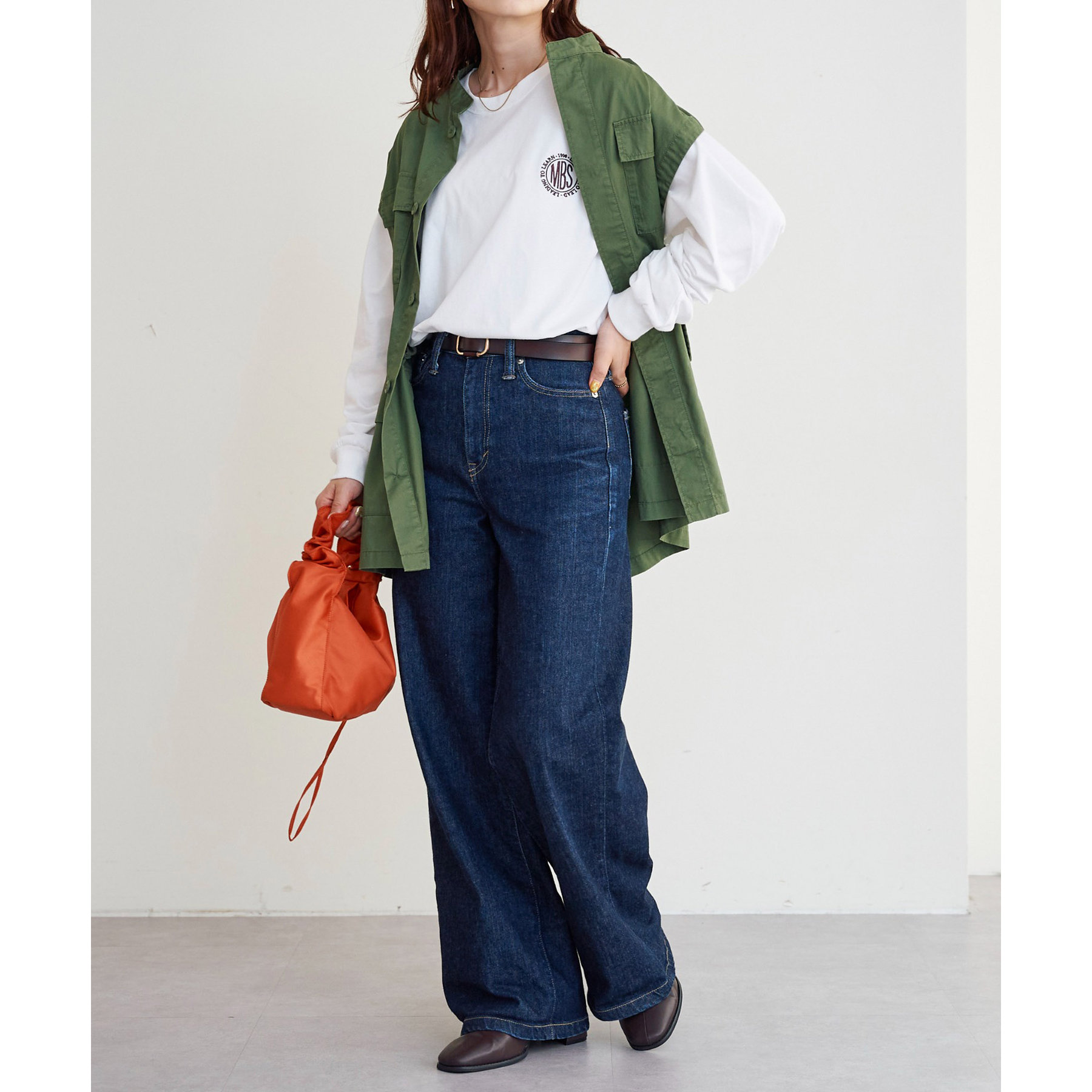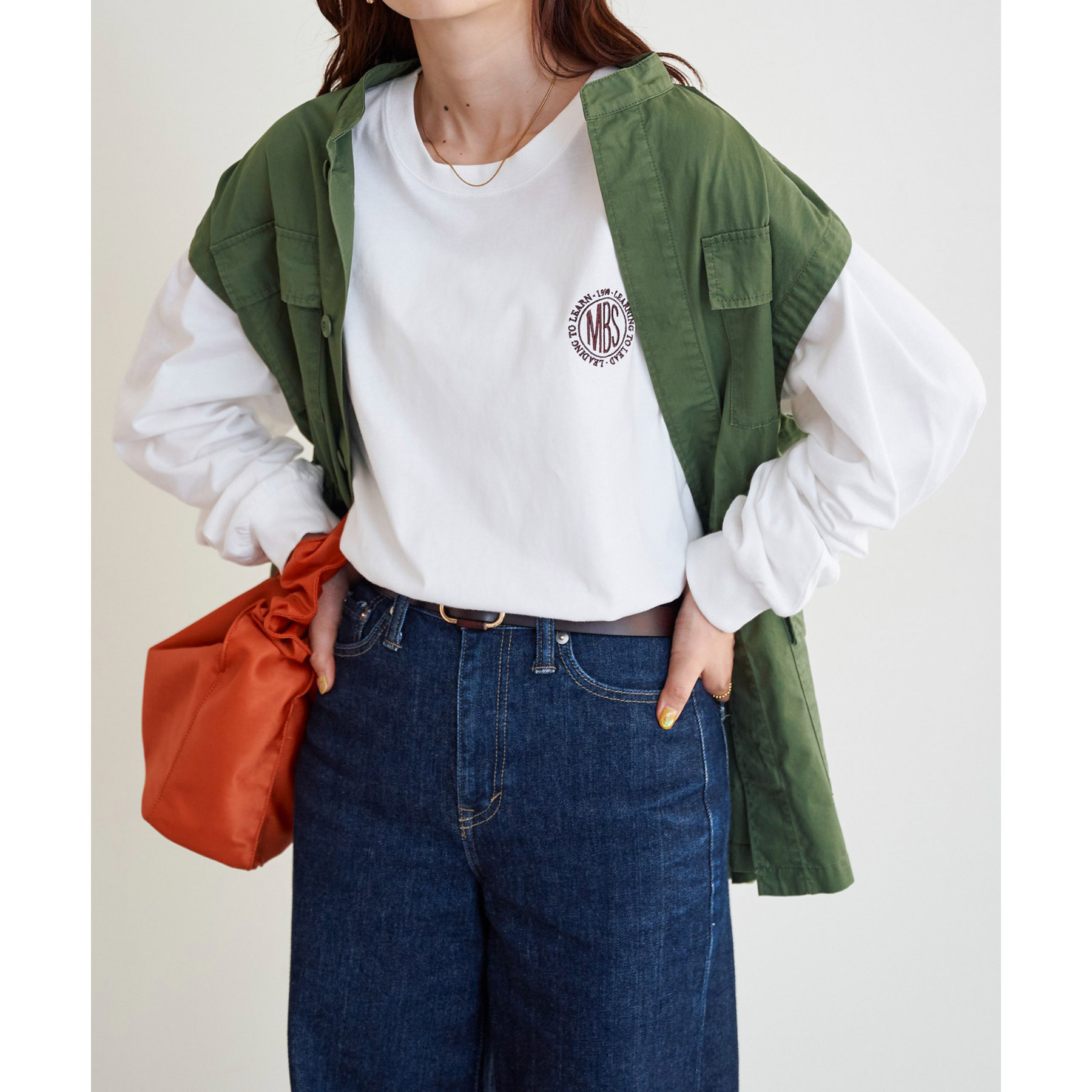 レディースは定番のタックインスタイル、ロングスカートやキャミワンピース合わせにも◎