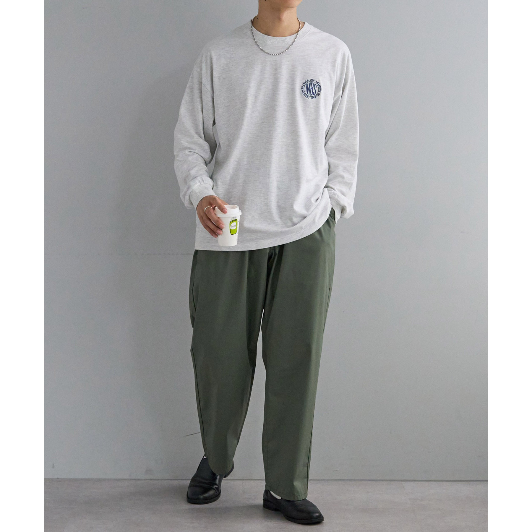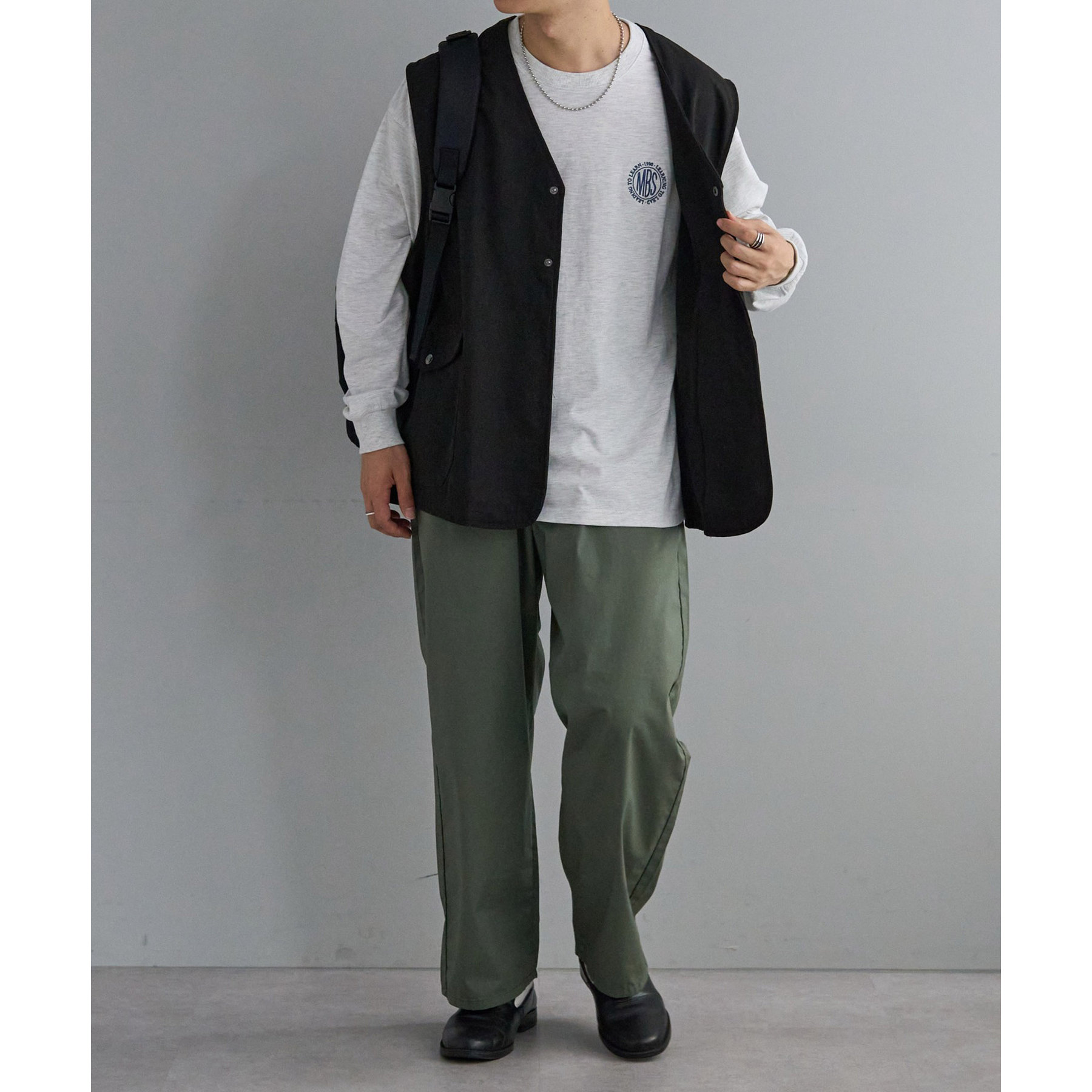 今年らしいビッグシルエットなので、メンズがワイドパンツやカーゴなどゆったりしたパンツを合わせてストリート、ミリタリーに、スウェットを合わせてよりカジュアルダウンさせるのもおすすめ。