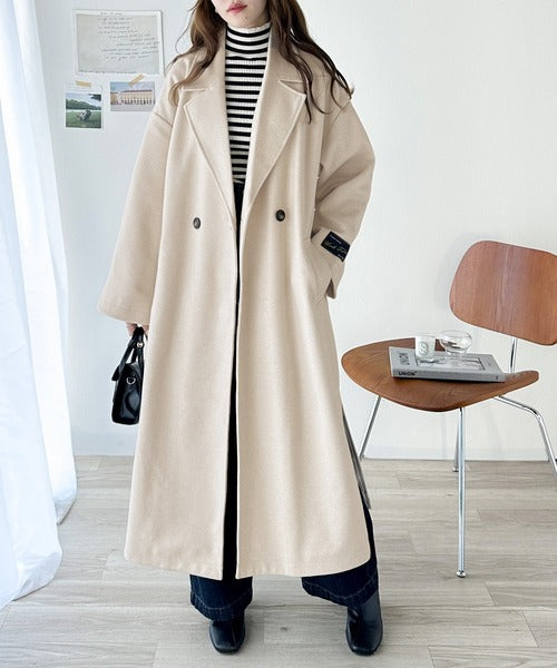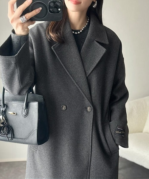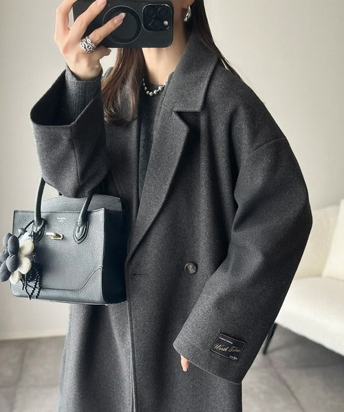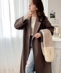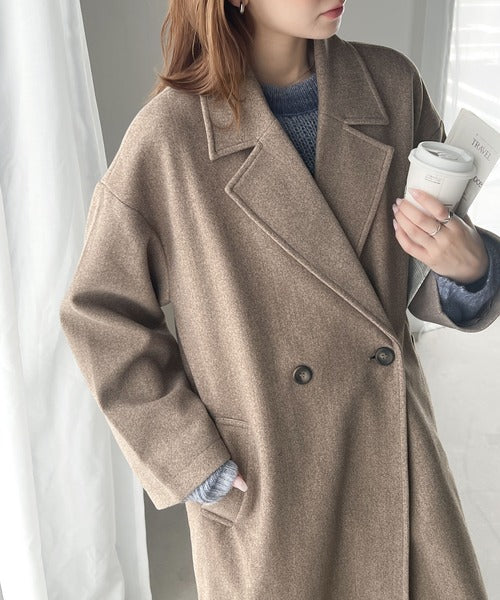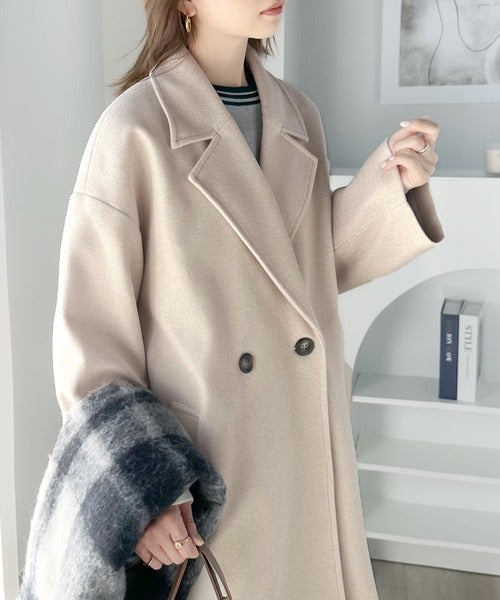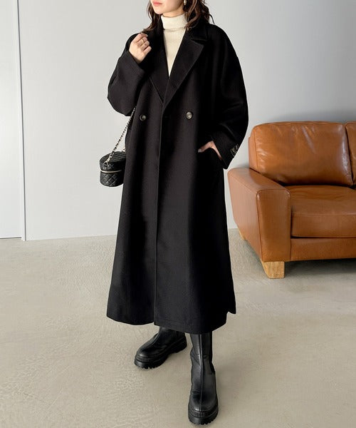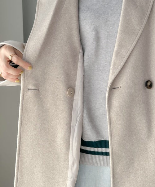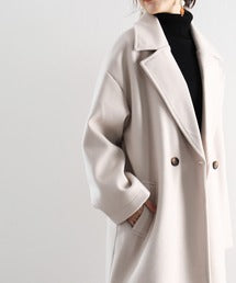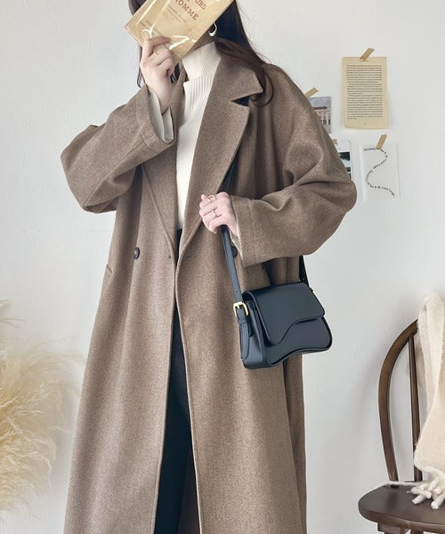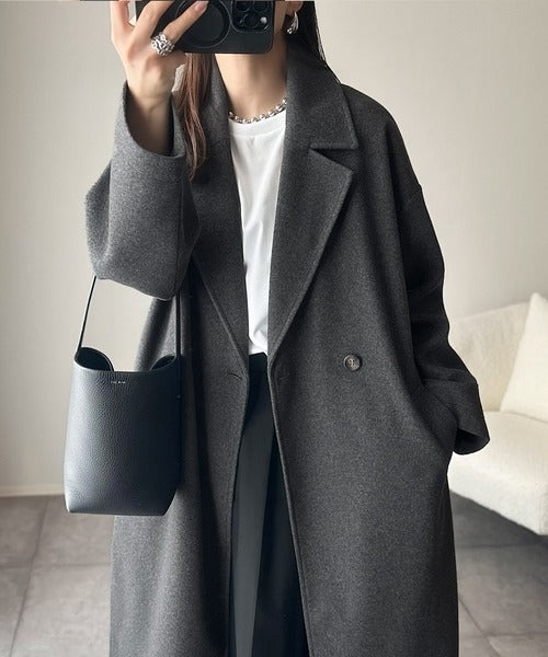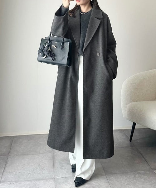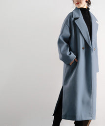 さっと、羽織るだけで高級感。フェイクウールダブルテーラードロング丈コート clf008