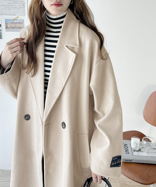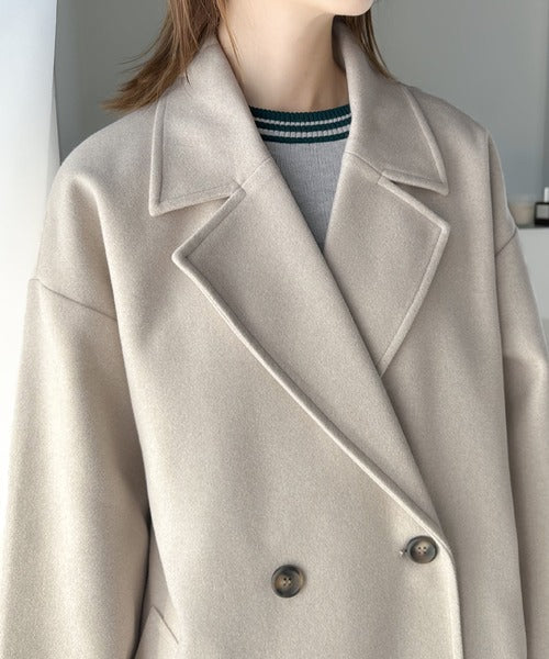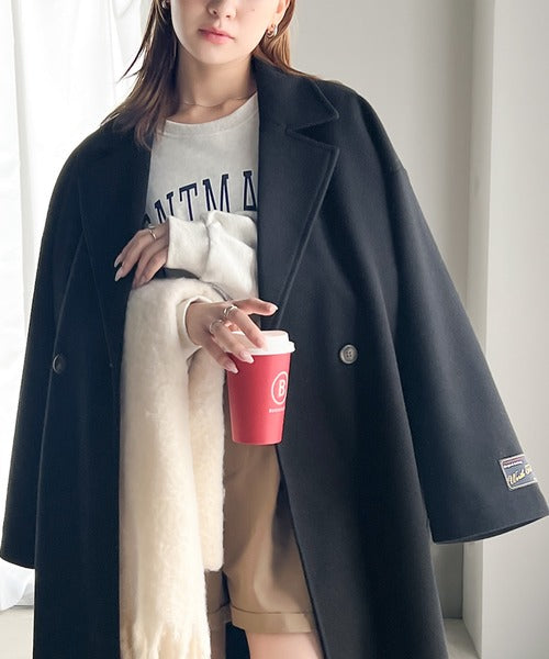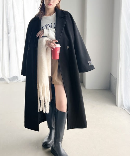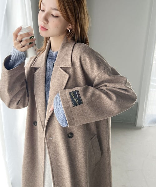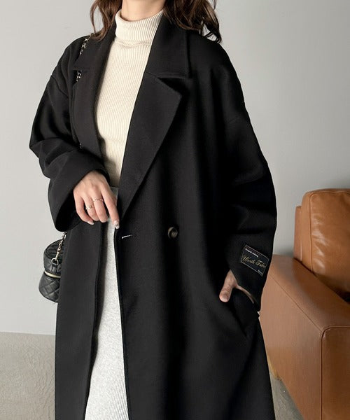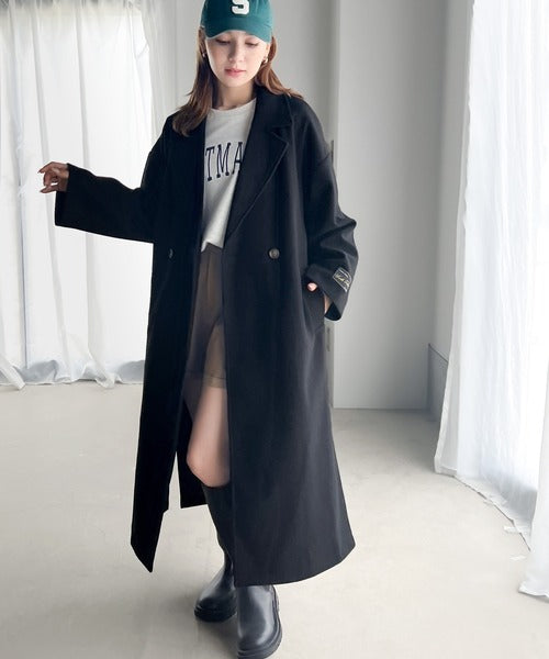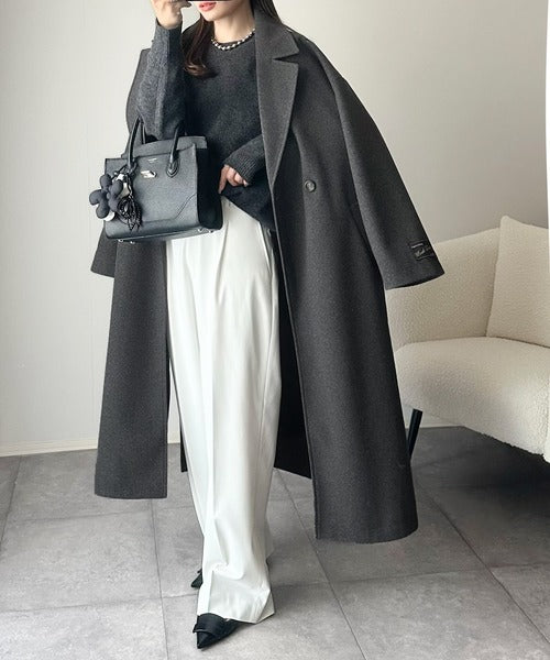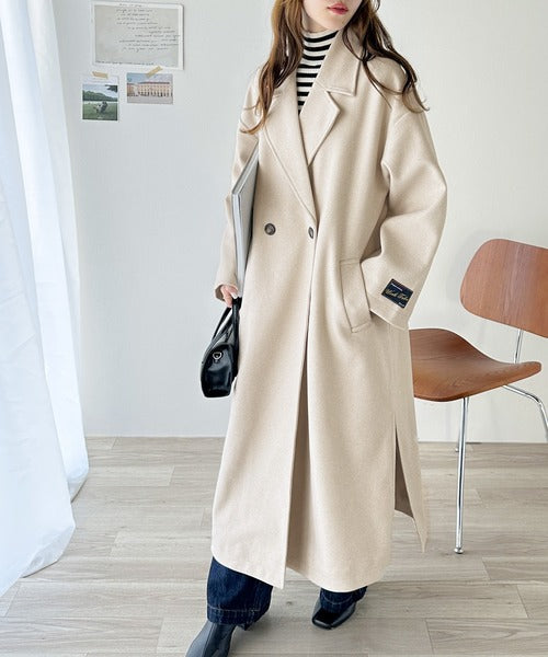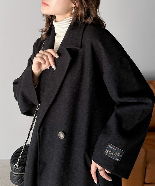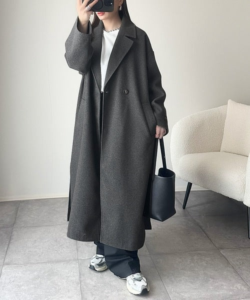 さっと、羽織るだけで高級感。フェイクウールダブルテーラードロング丈コート clf008