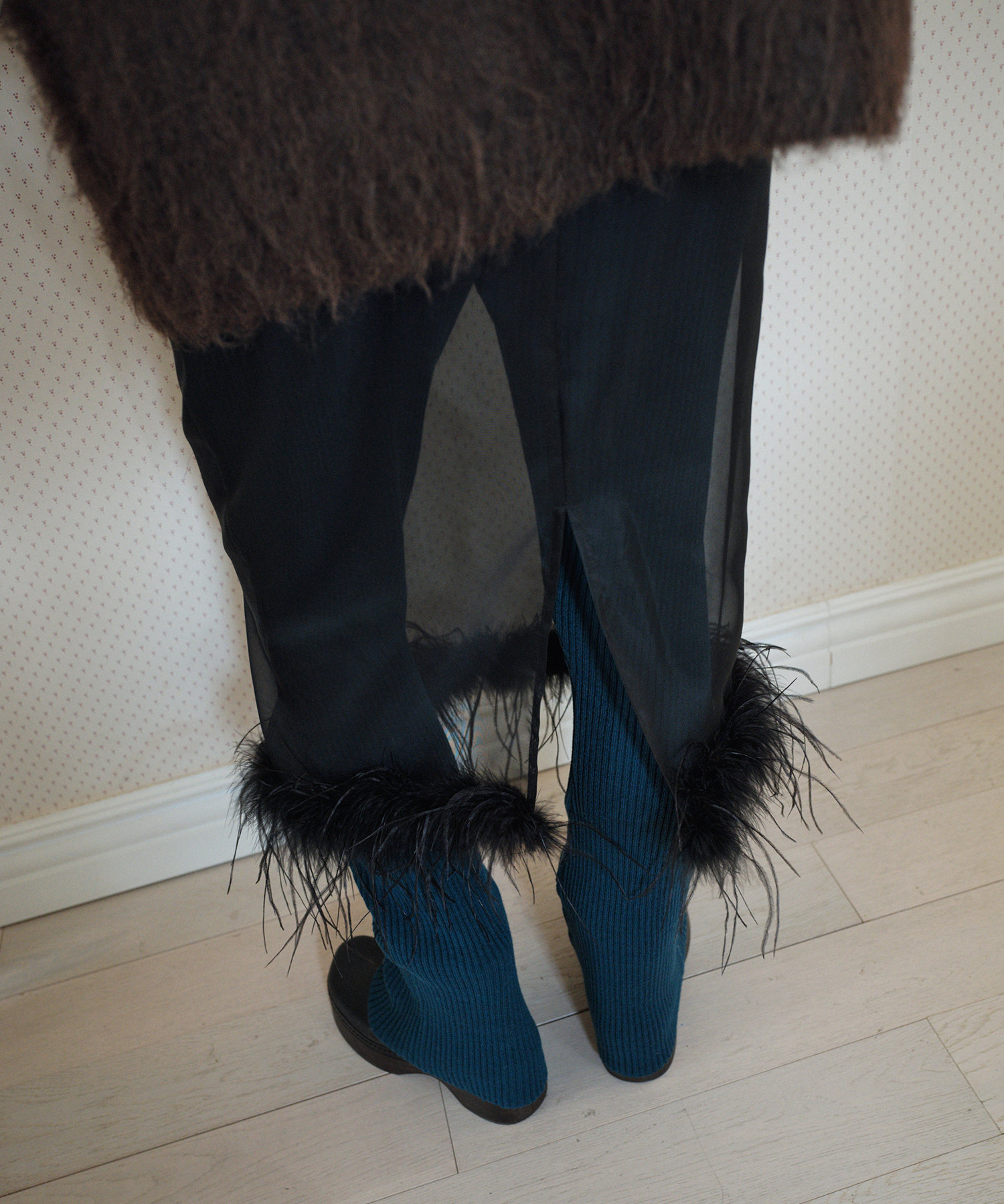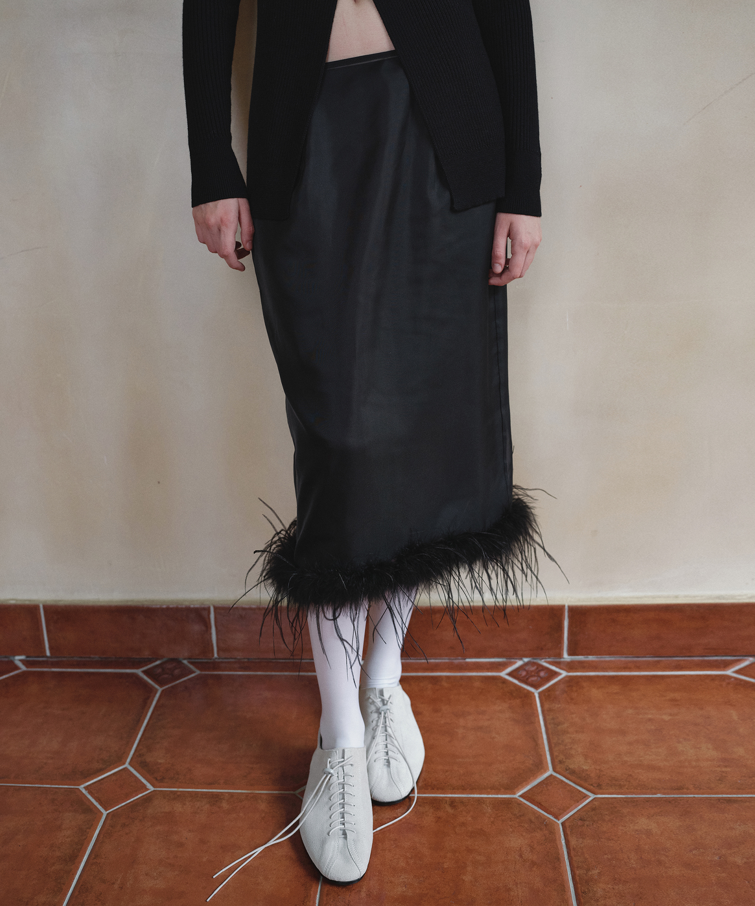 シアーなオーガンザと豊かなリアルオーストリッチファートリミングが加わり、フェミニンでユニークなムードを演出するミディスカートです。