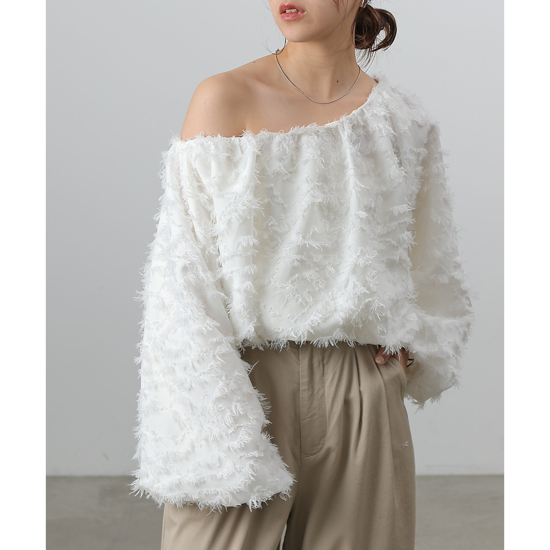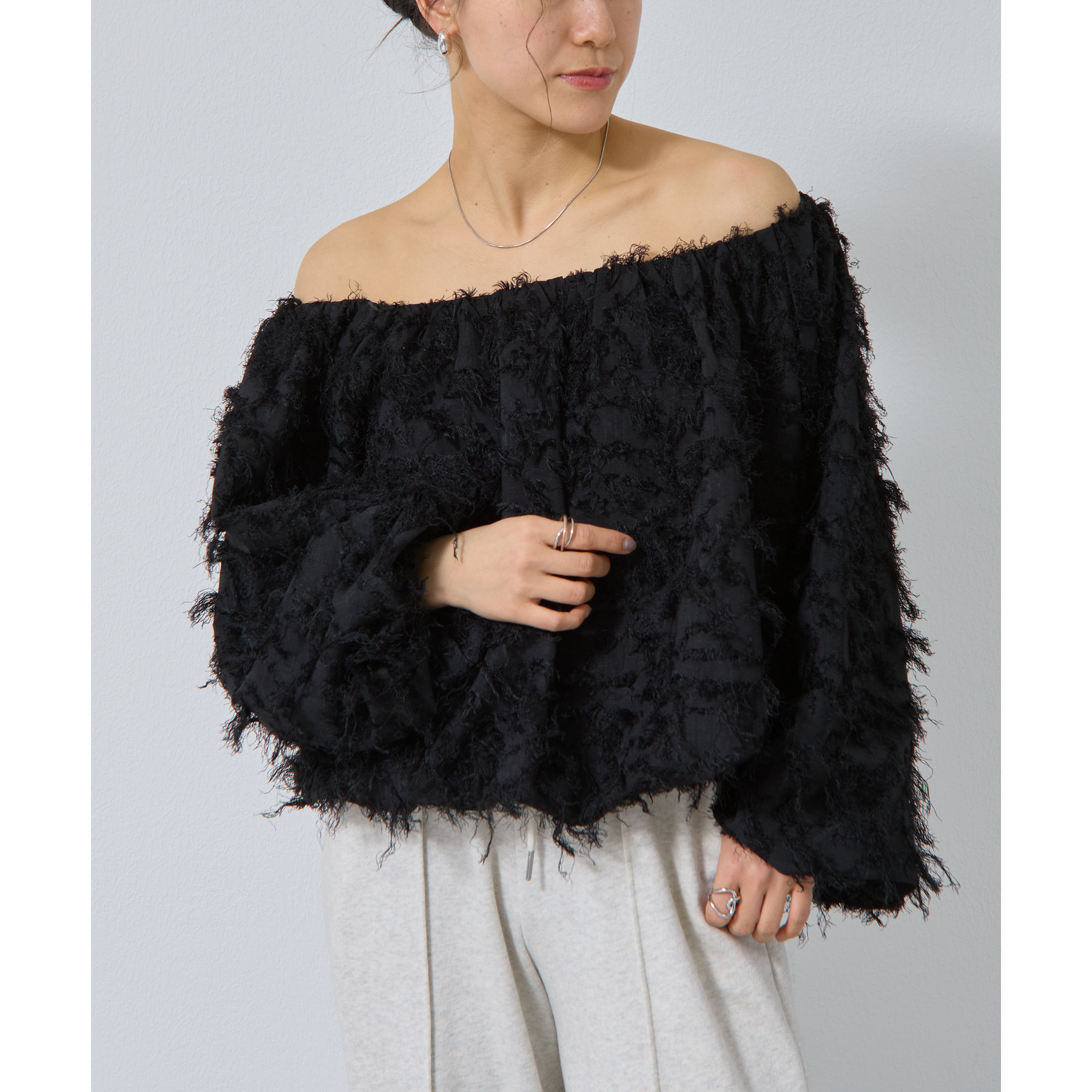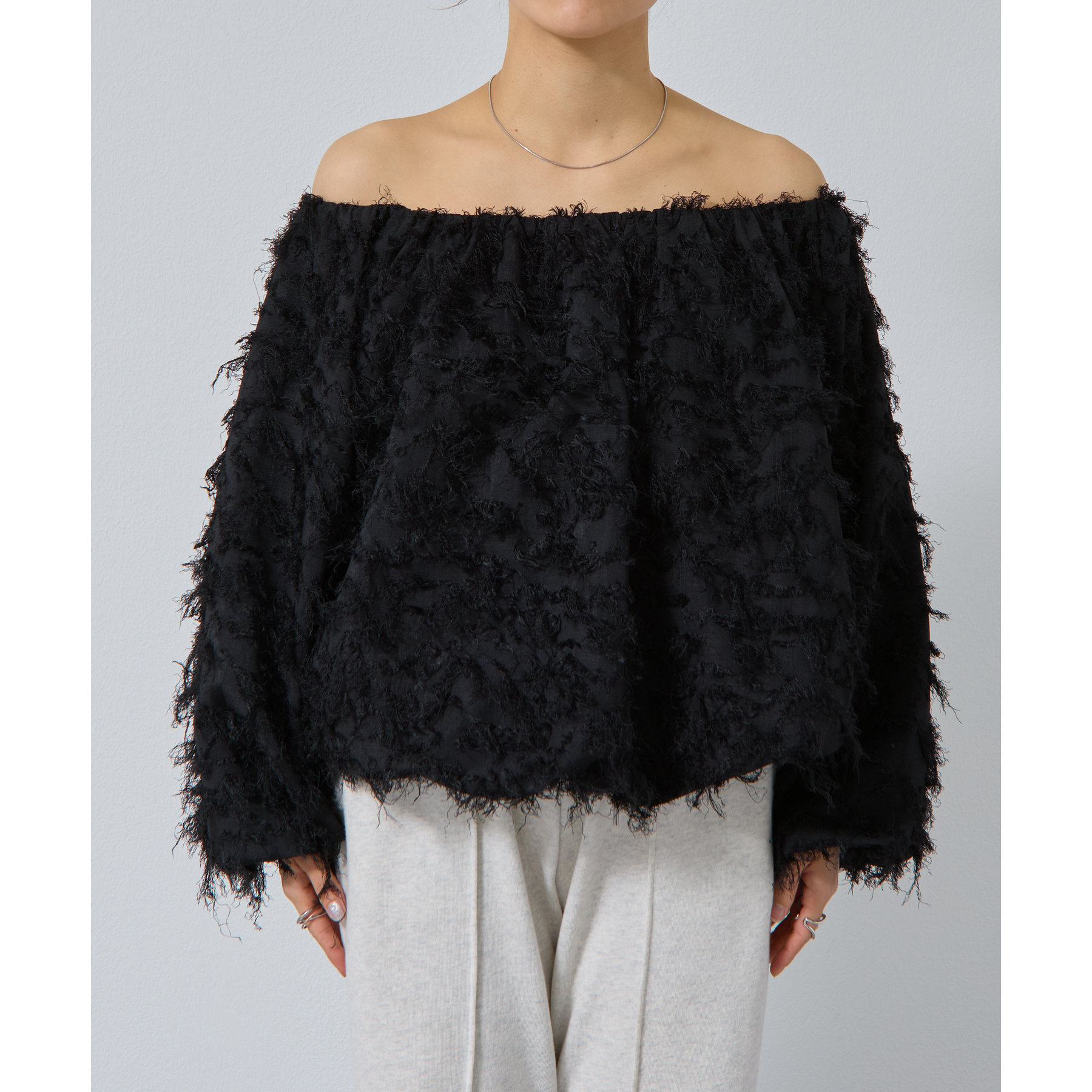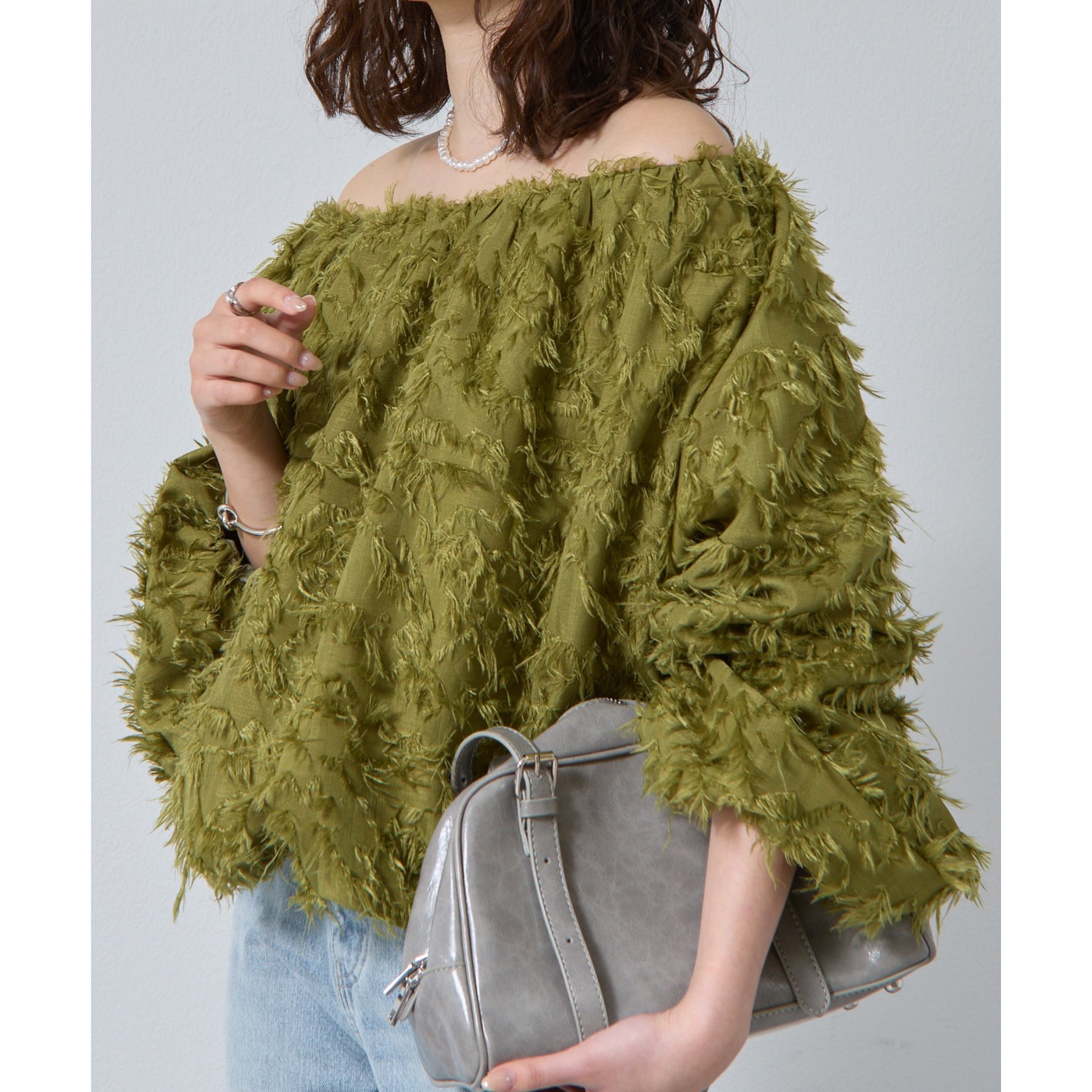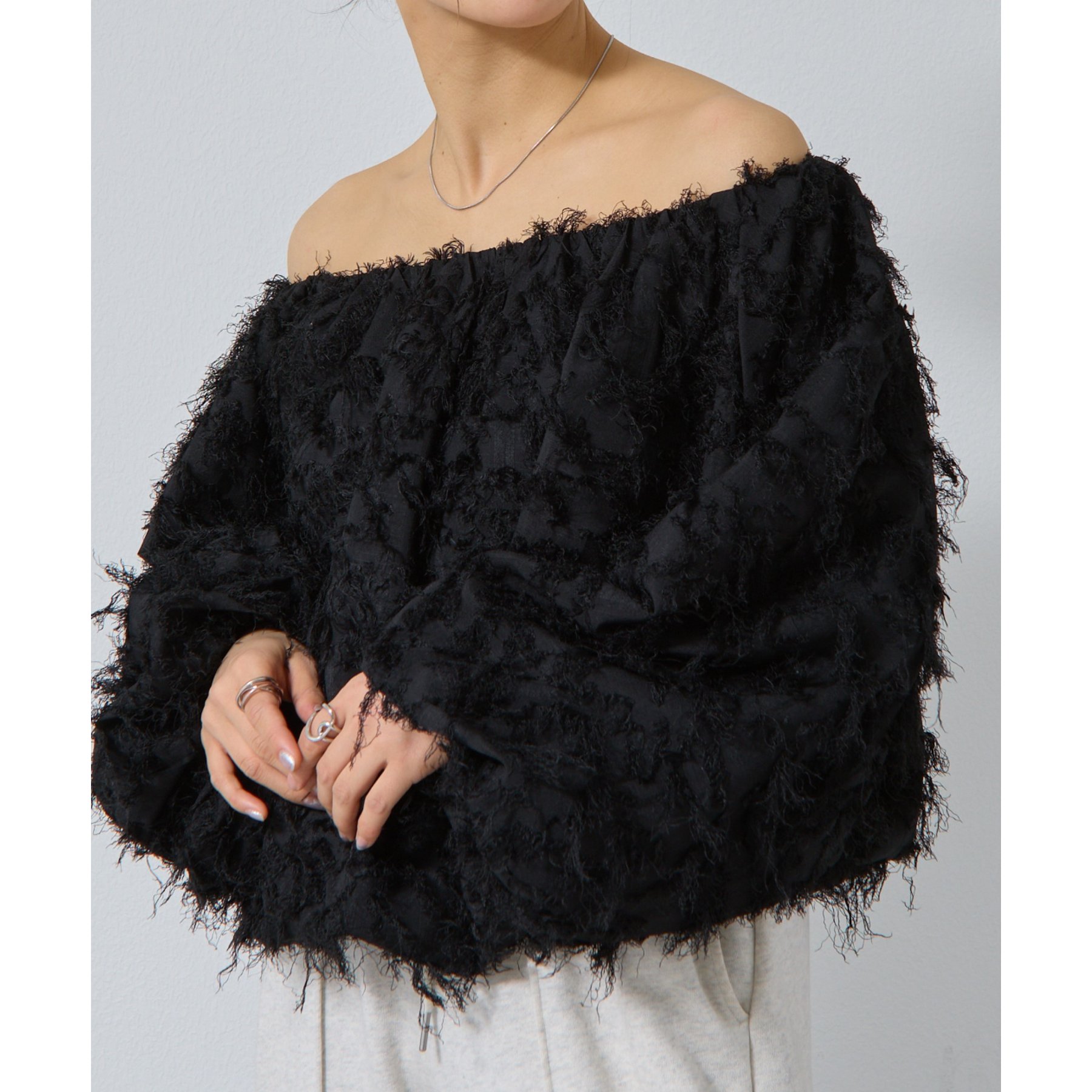 フリンジジャガードオフショルトップス