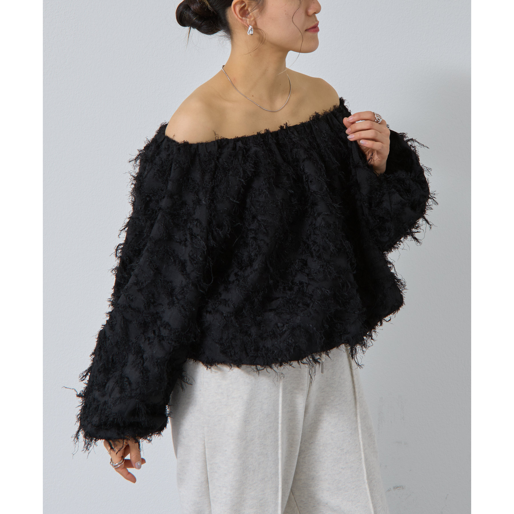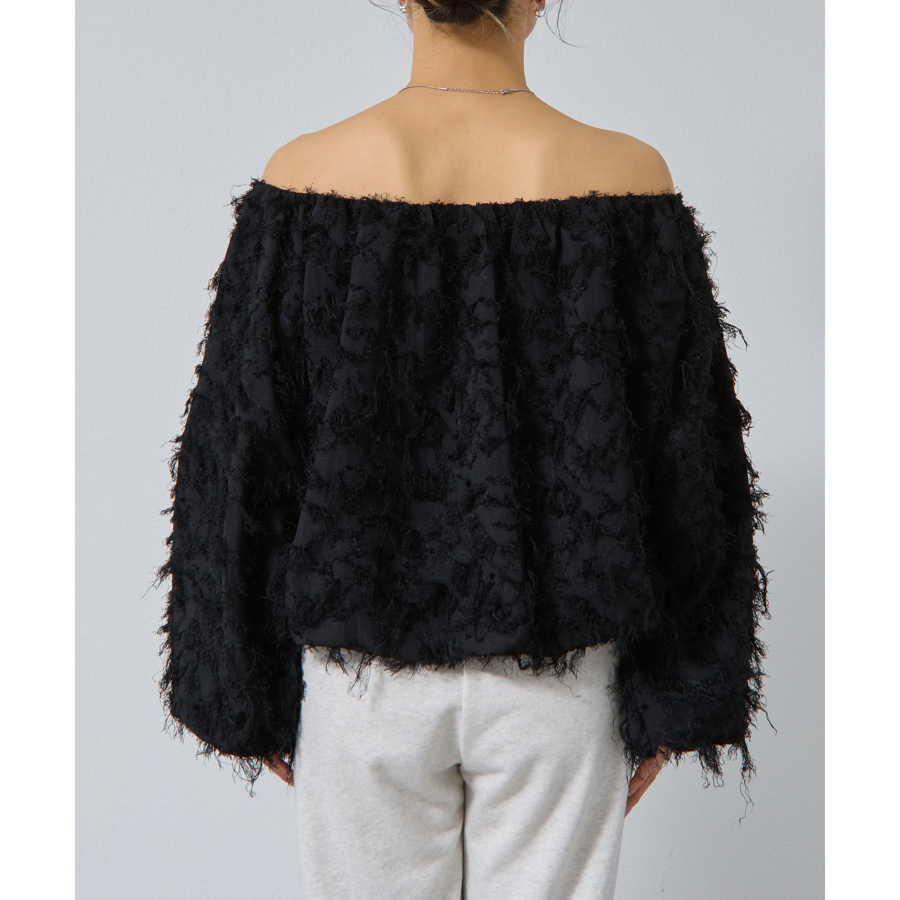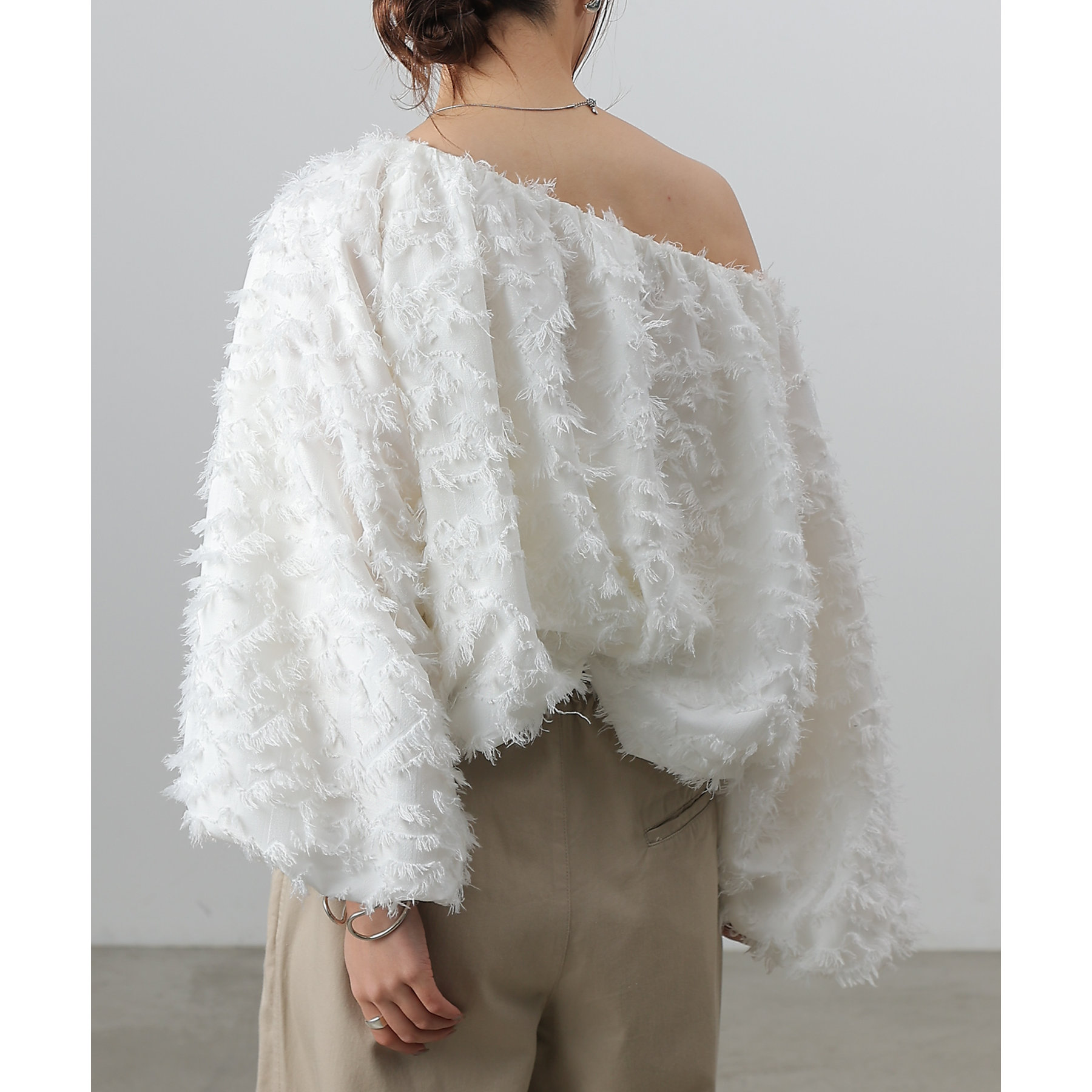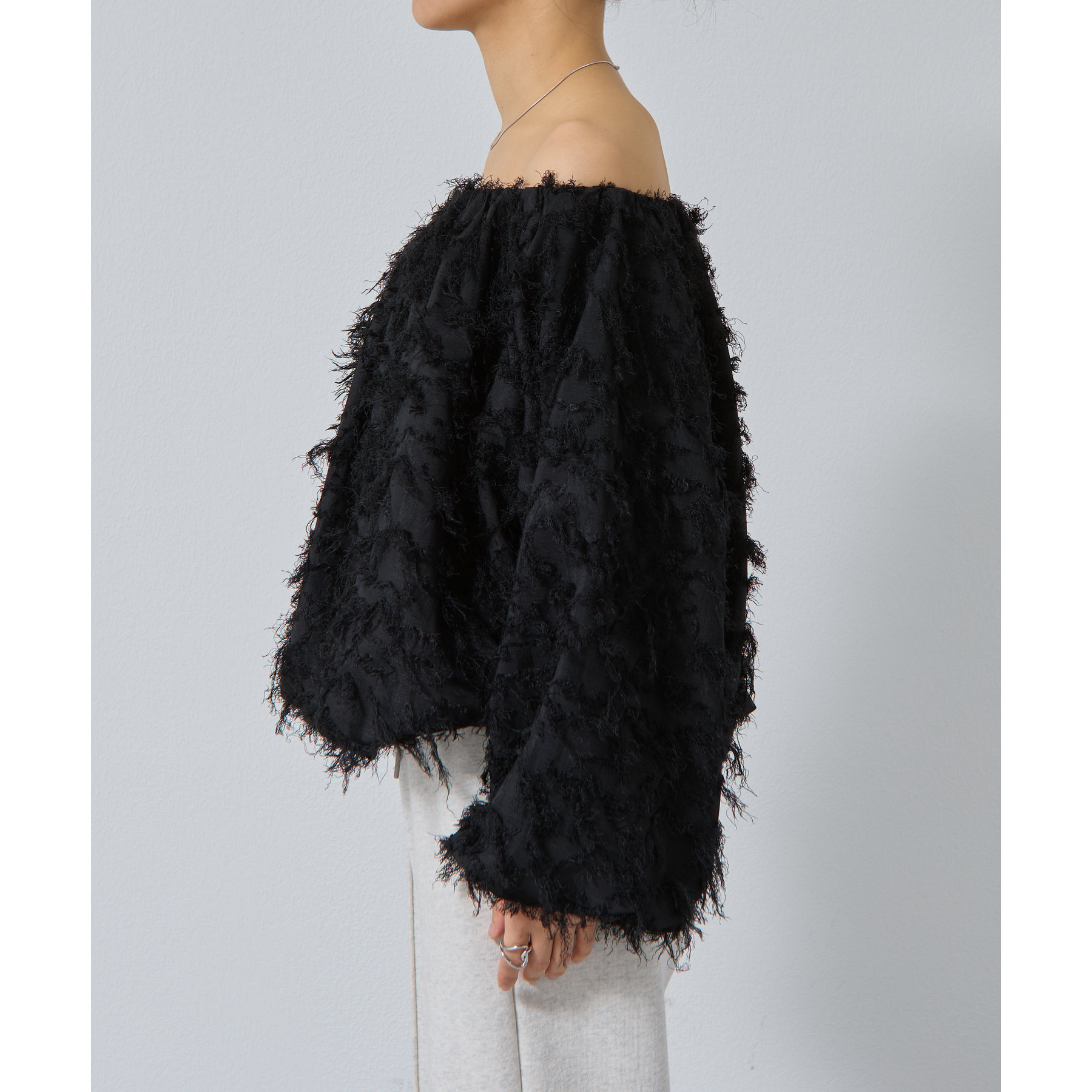 フリンジジャガードオフショルトップス