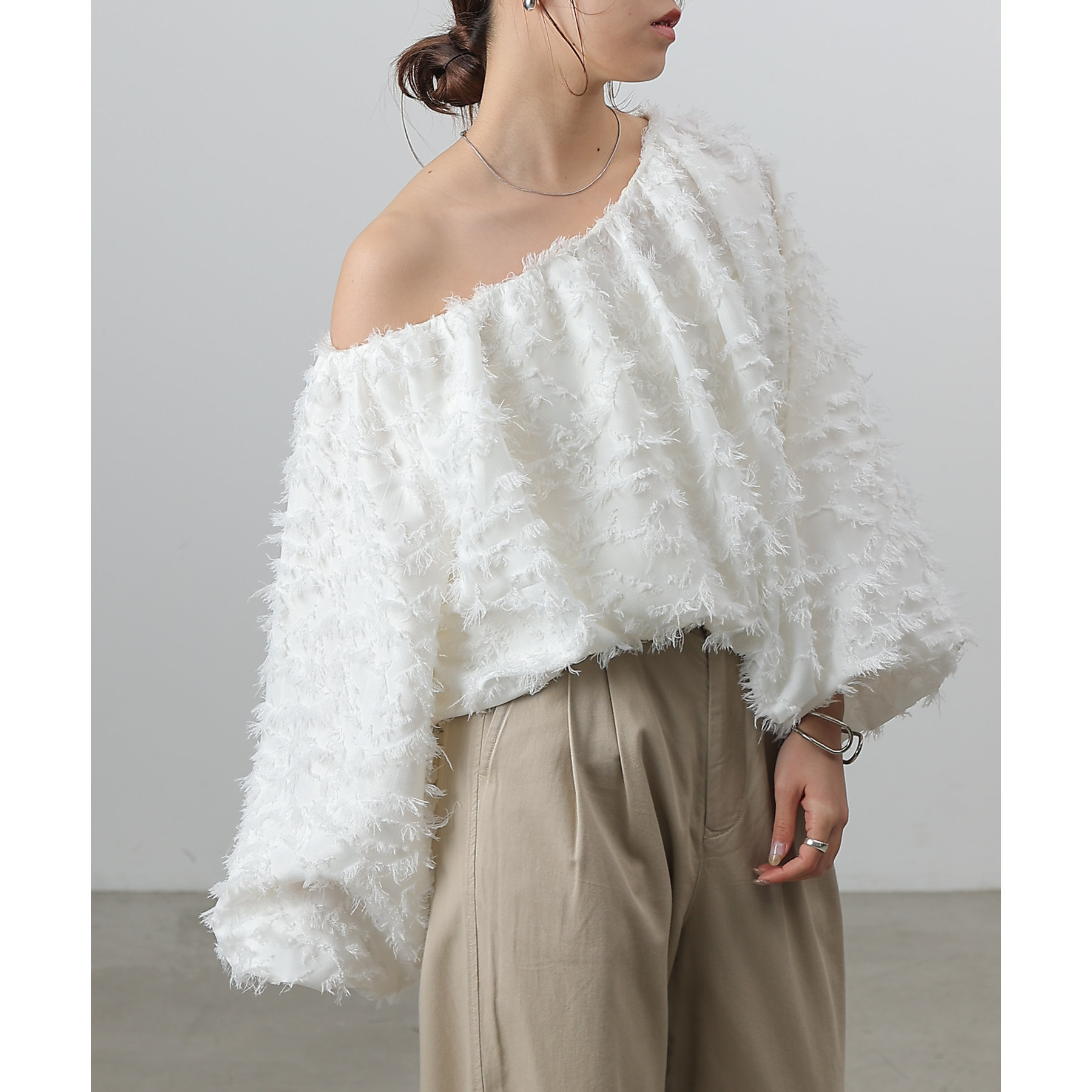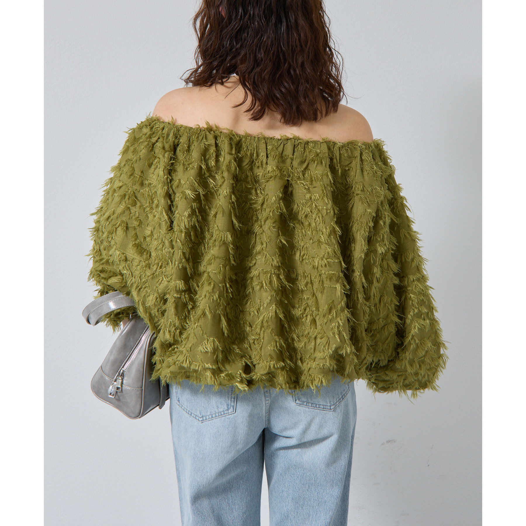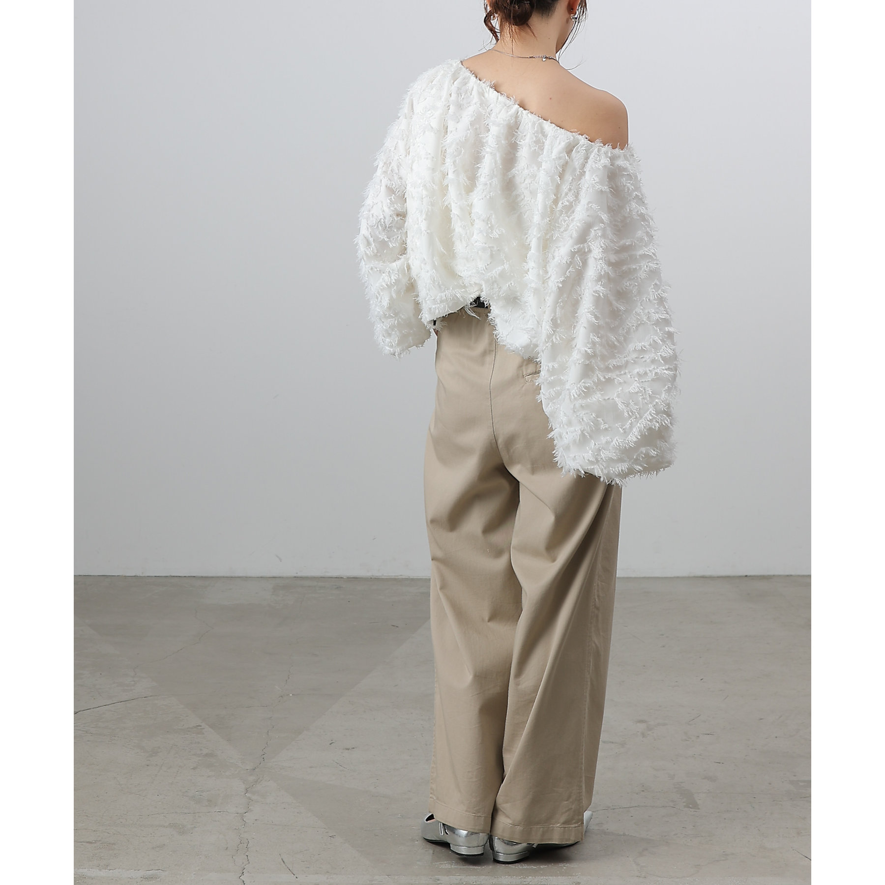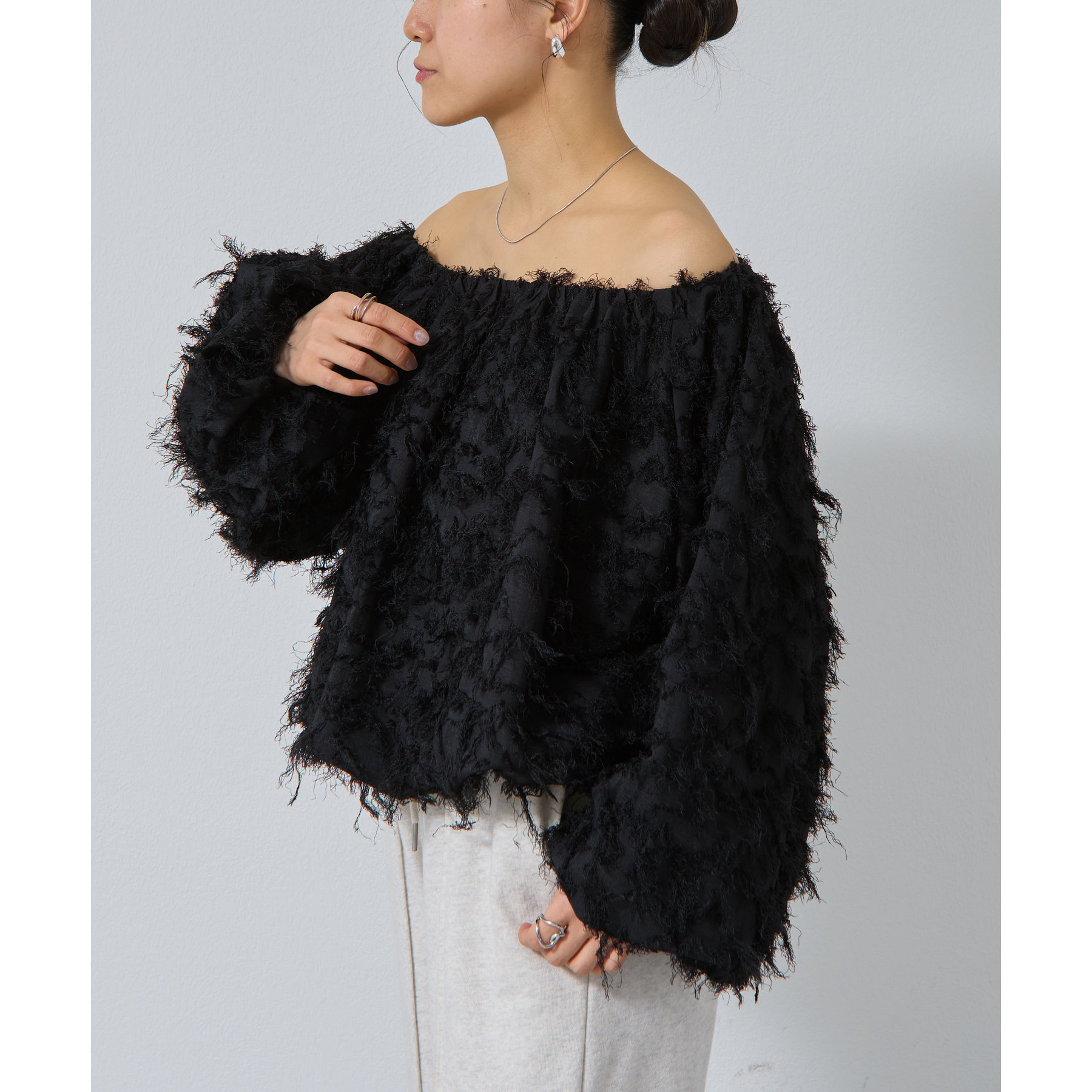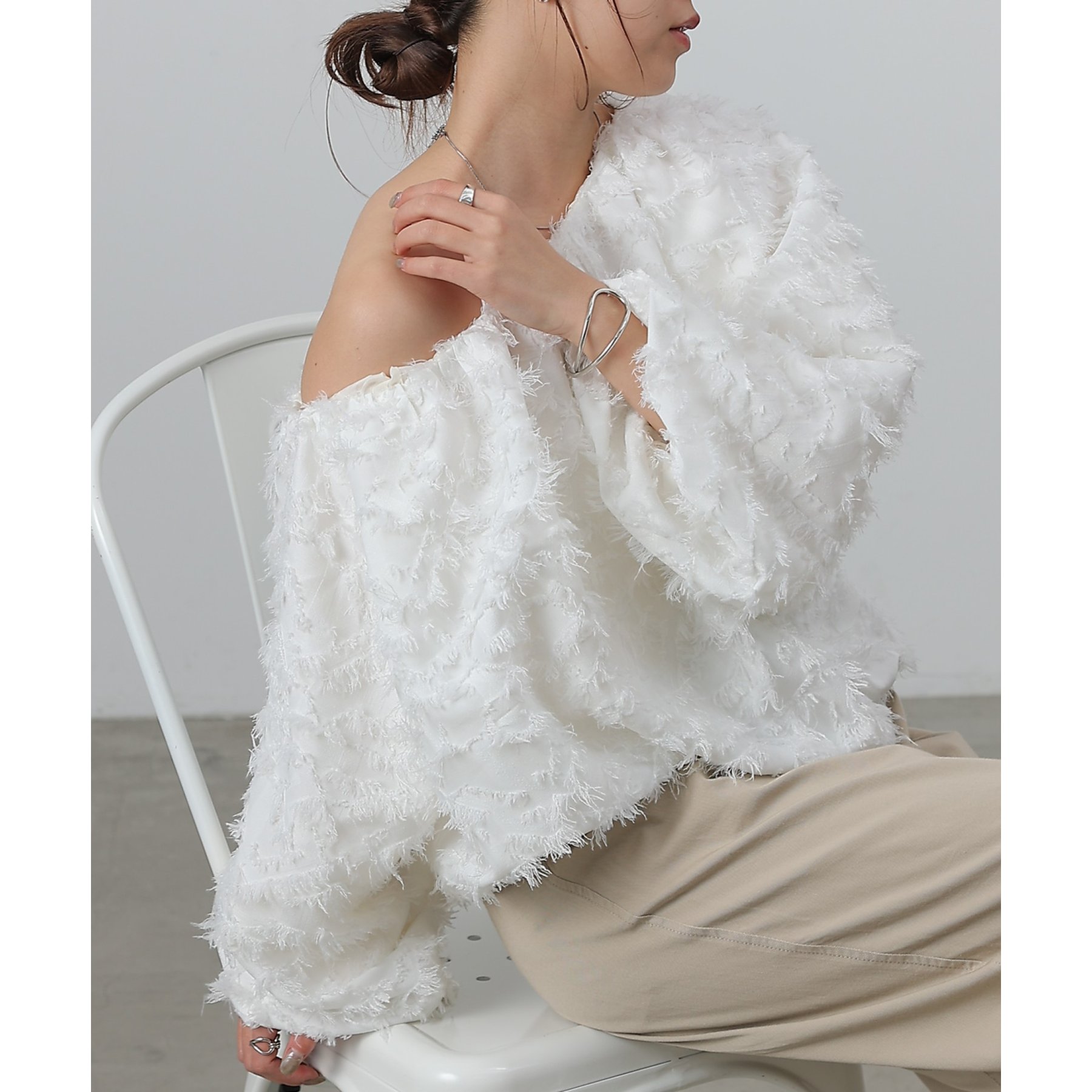 フリンジジャガードオフショルトップス