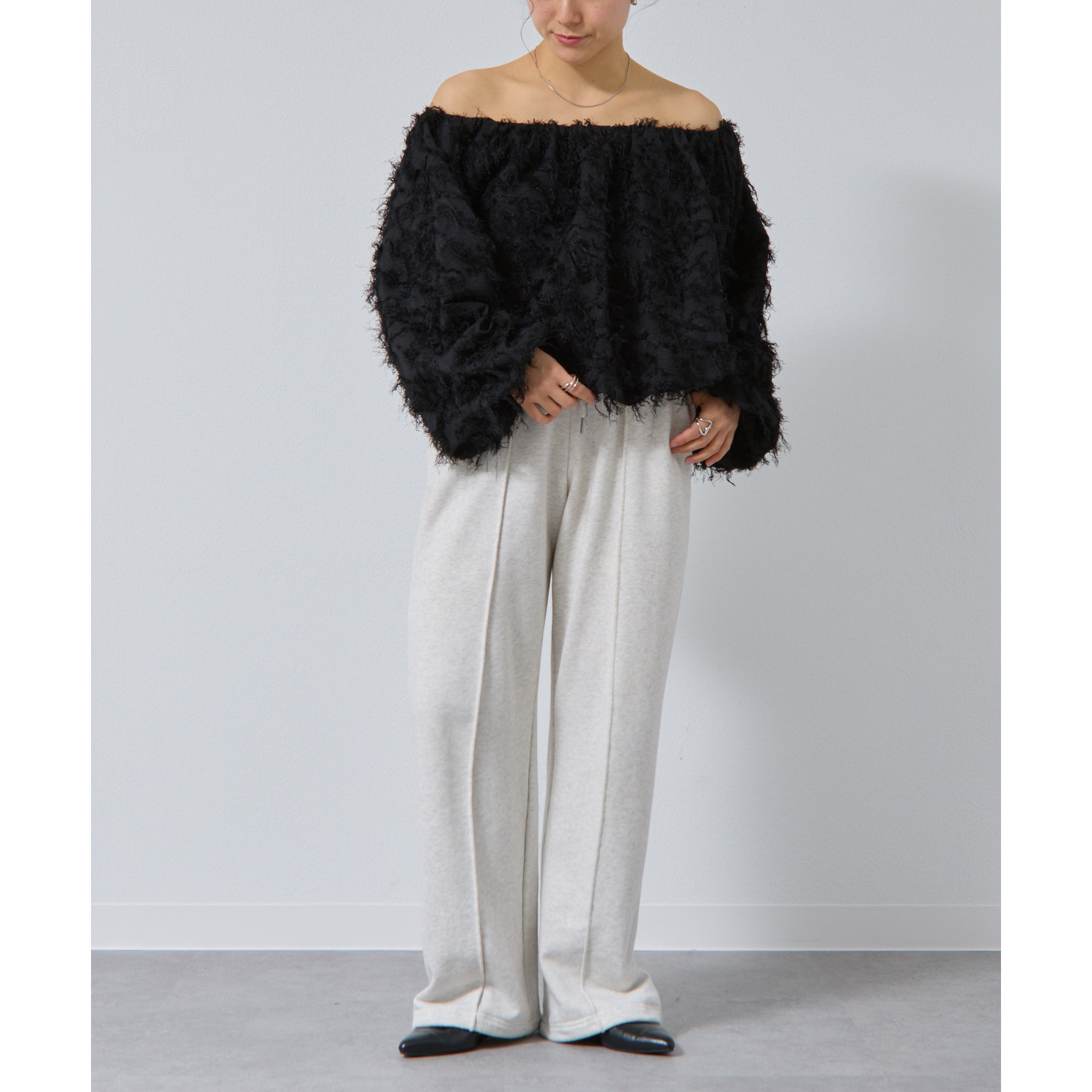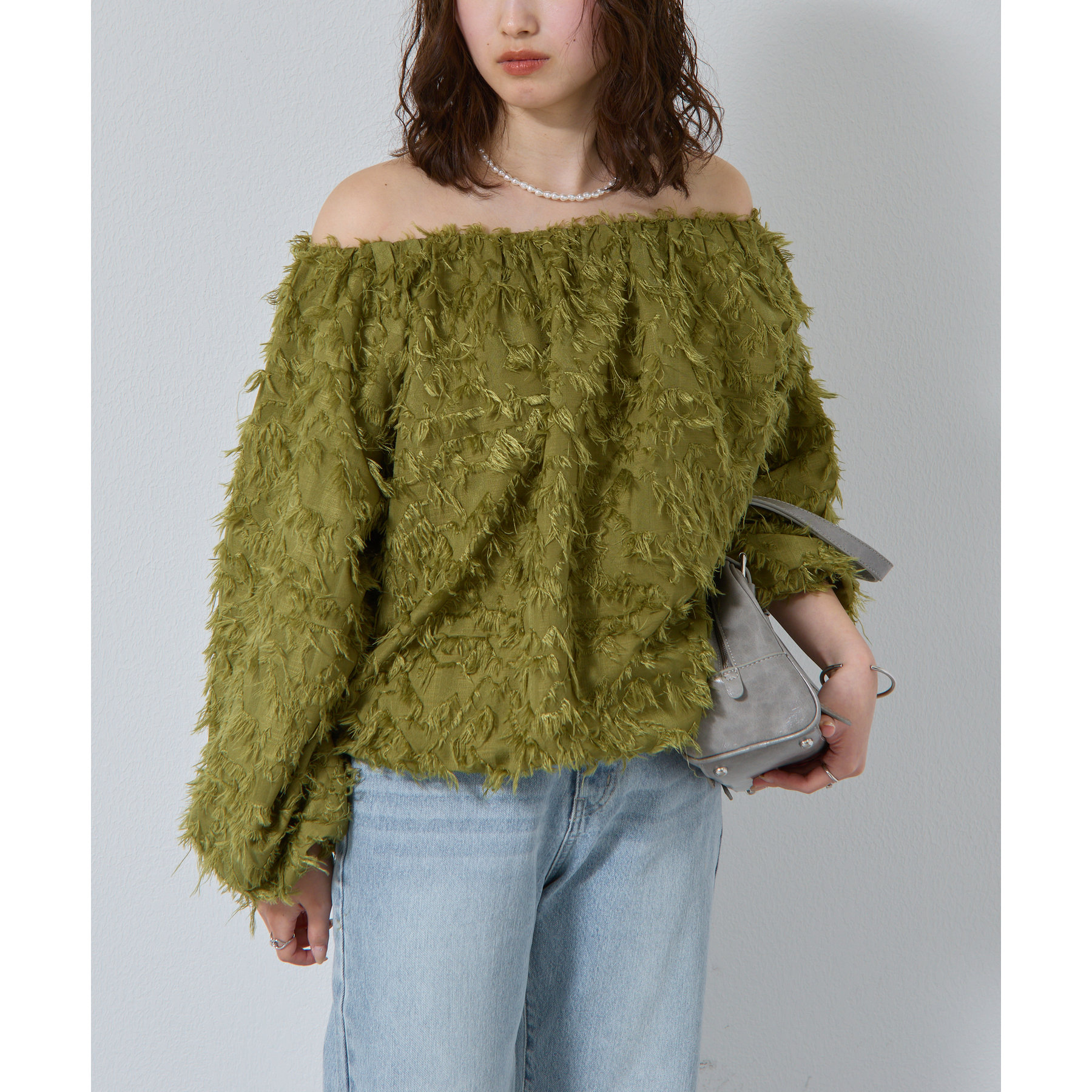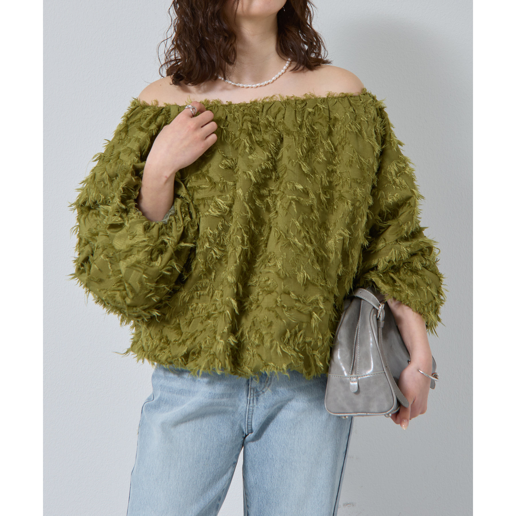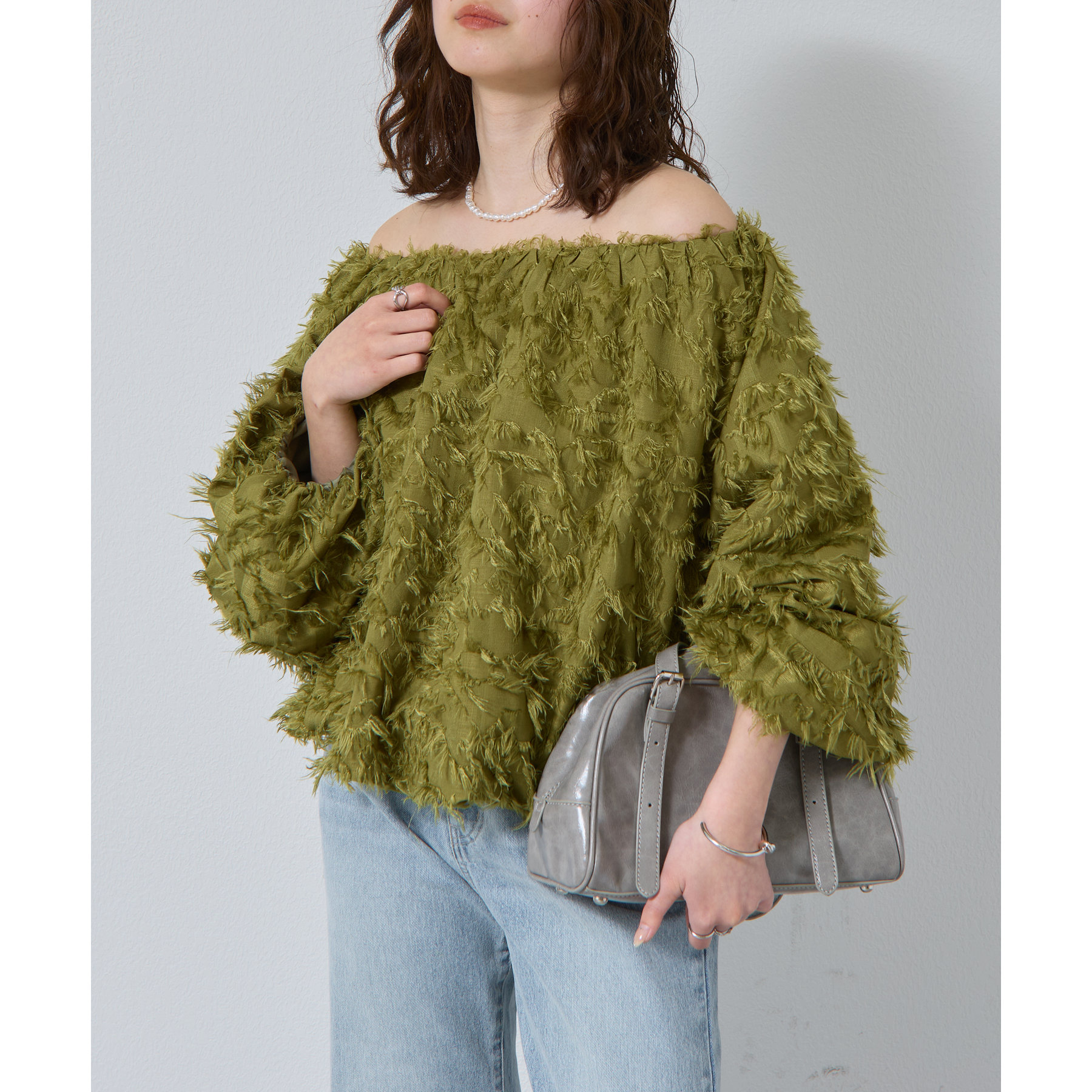 フリンジジャガードオフショルトップス