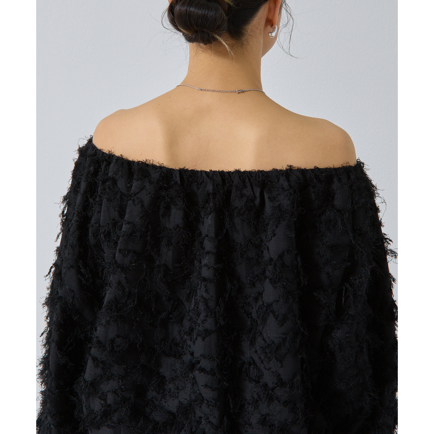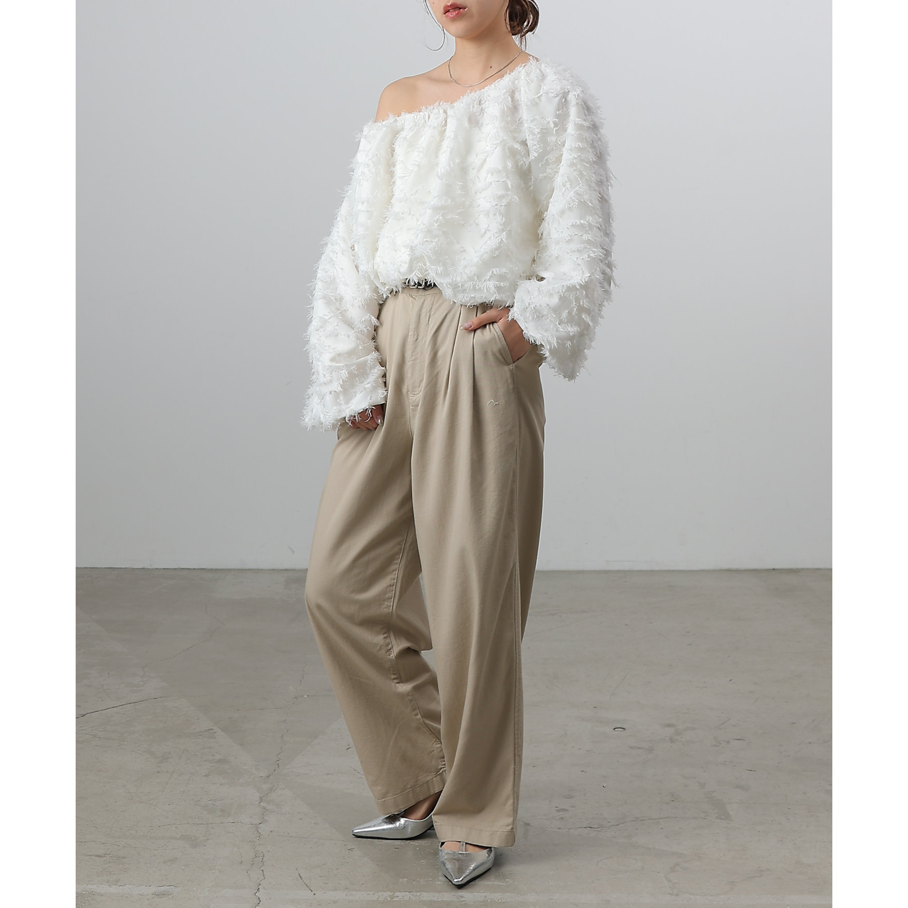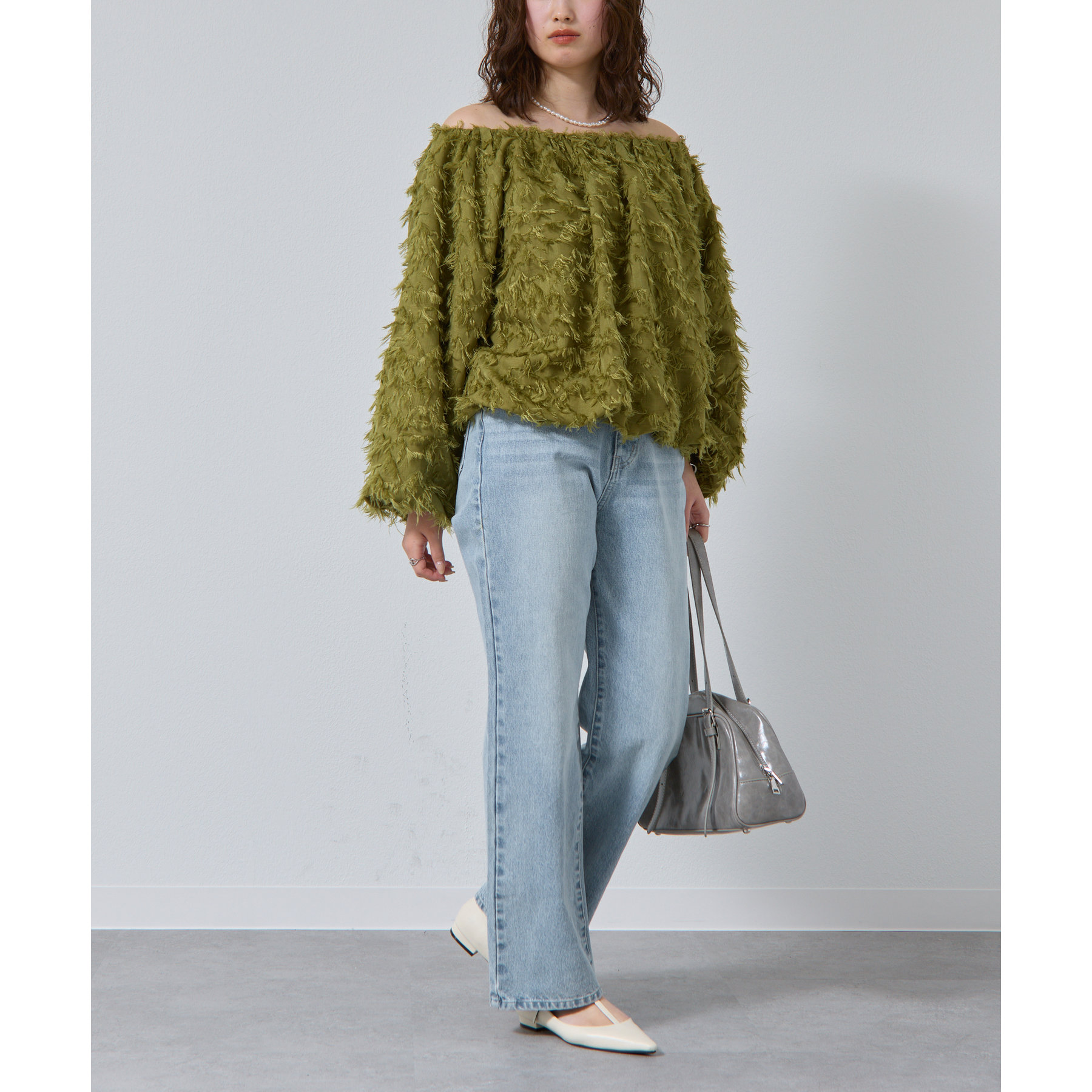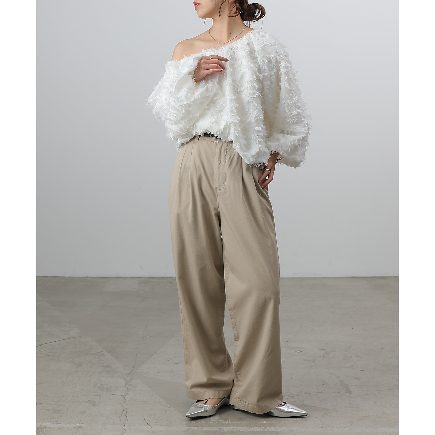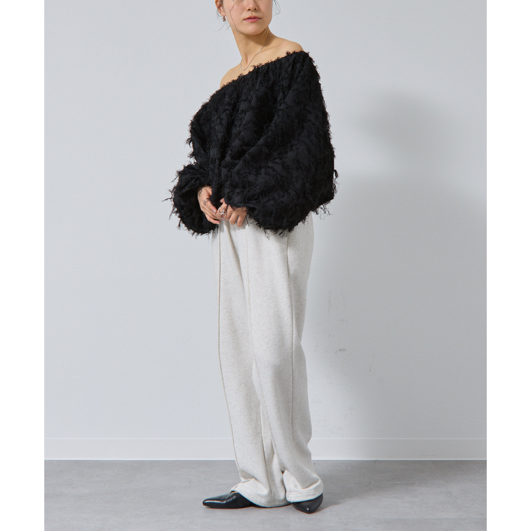 フリンジジャガードオフショルトップス