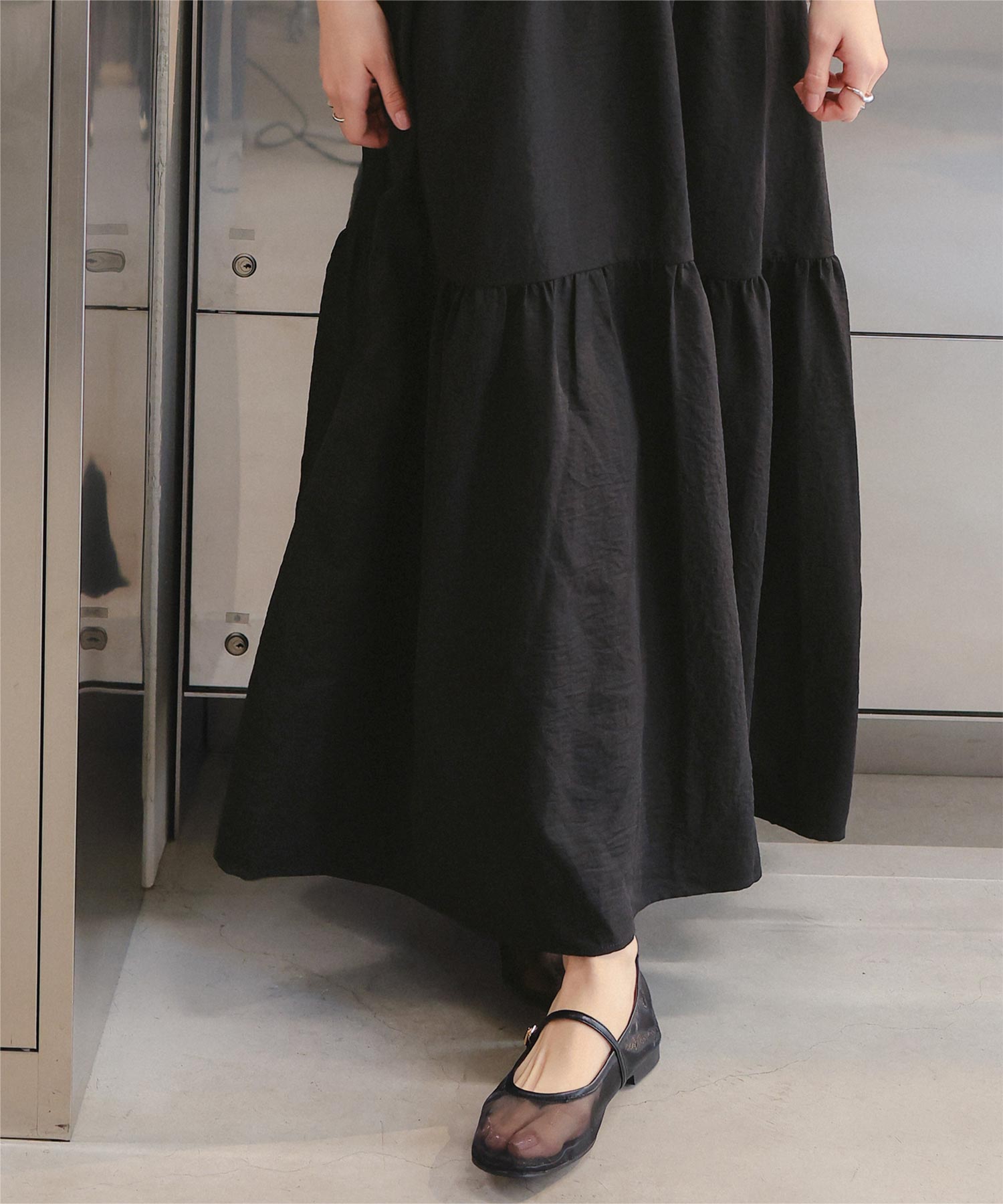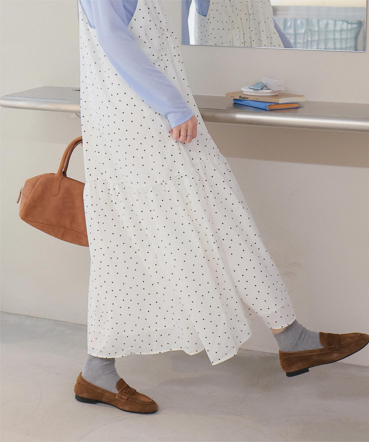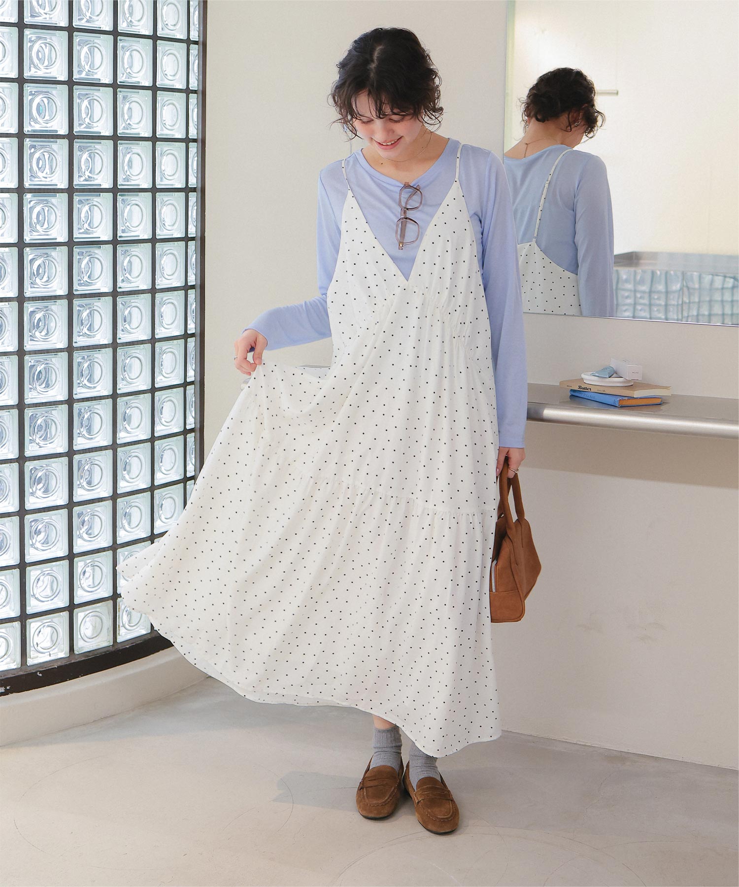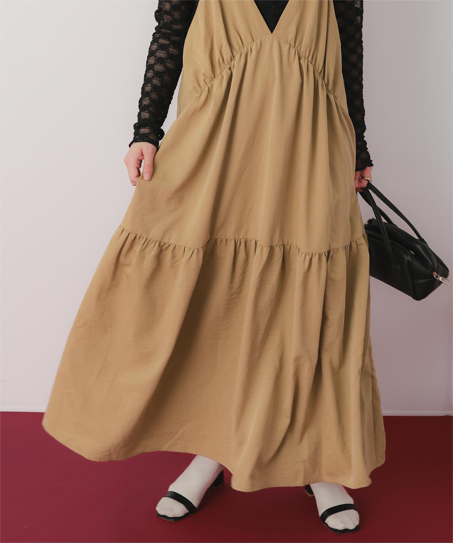 ・裾切替えでフレアに広がるシルエットが女性らしさを引き立たせる