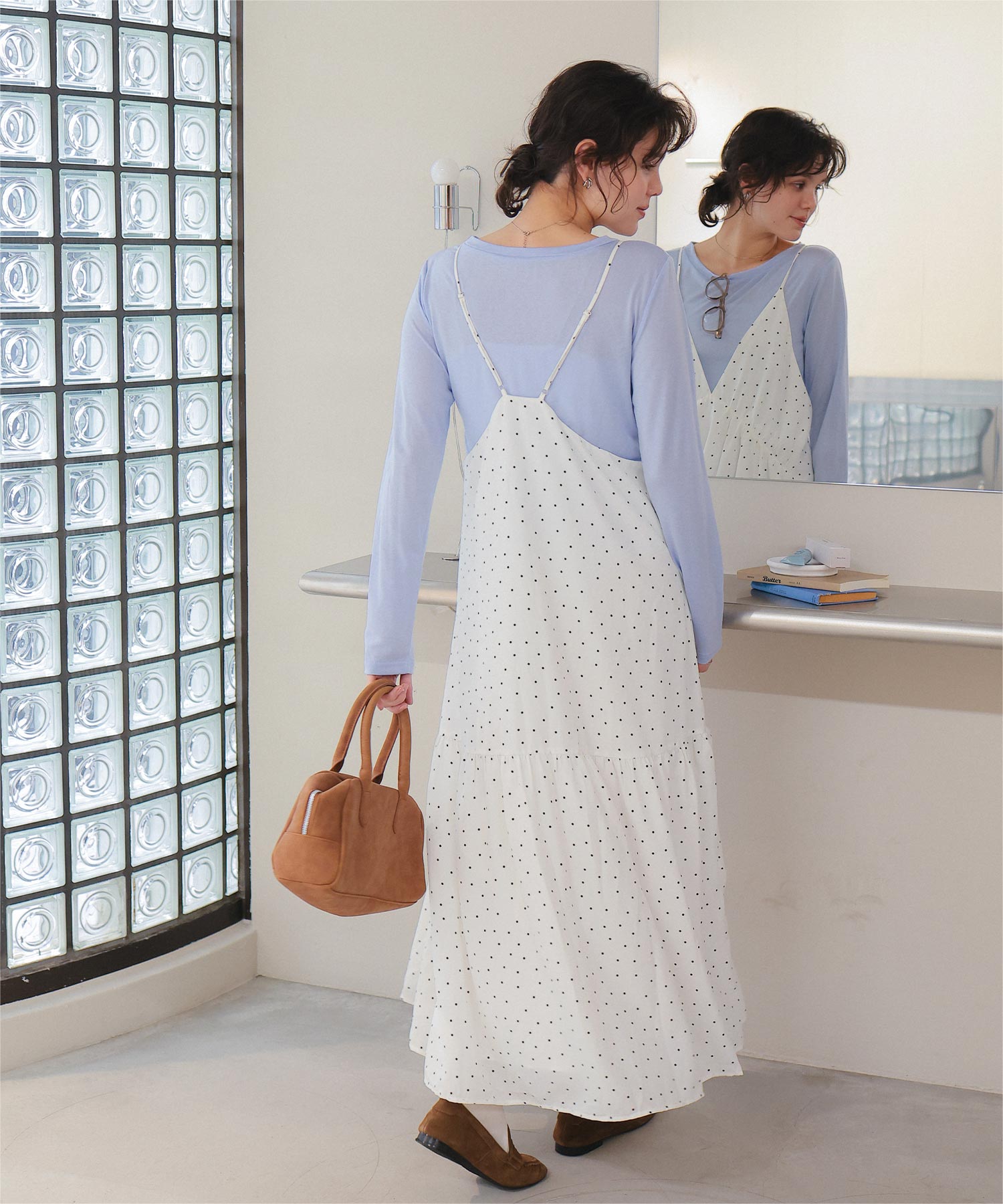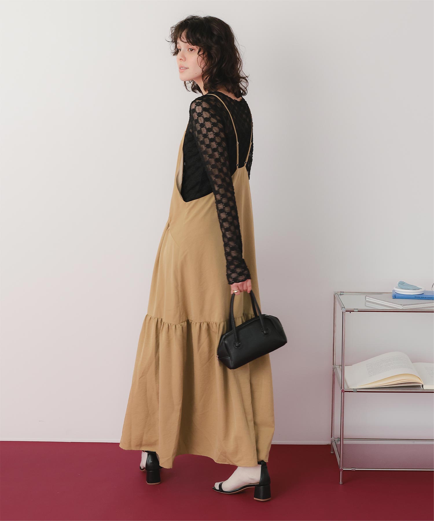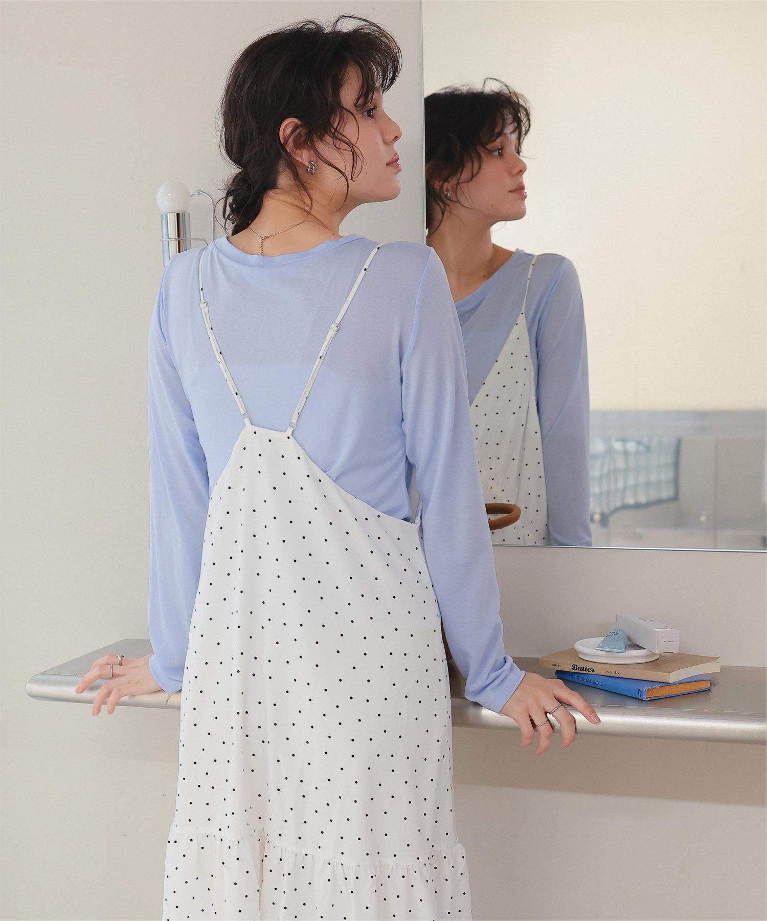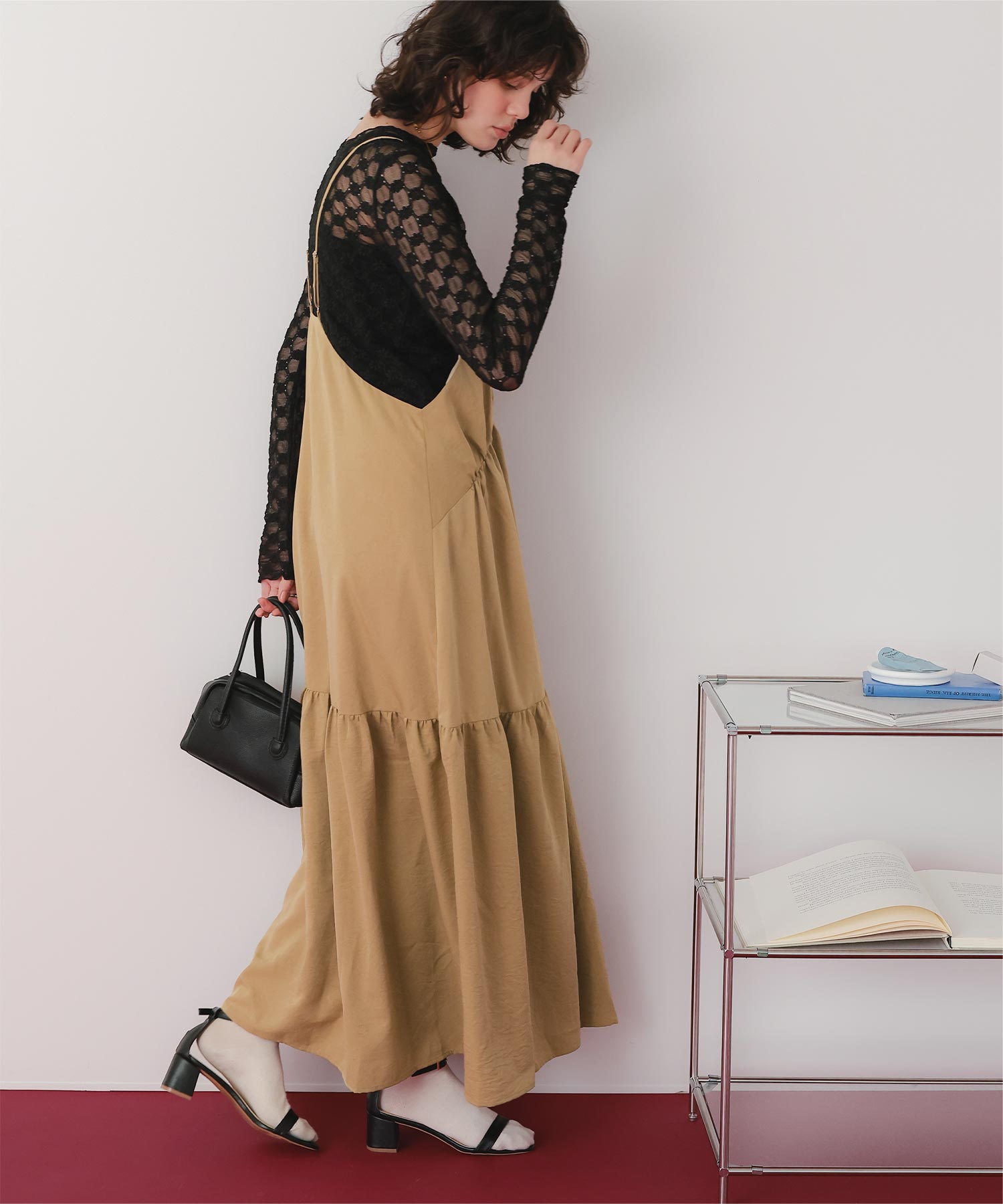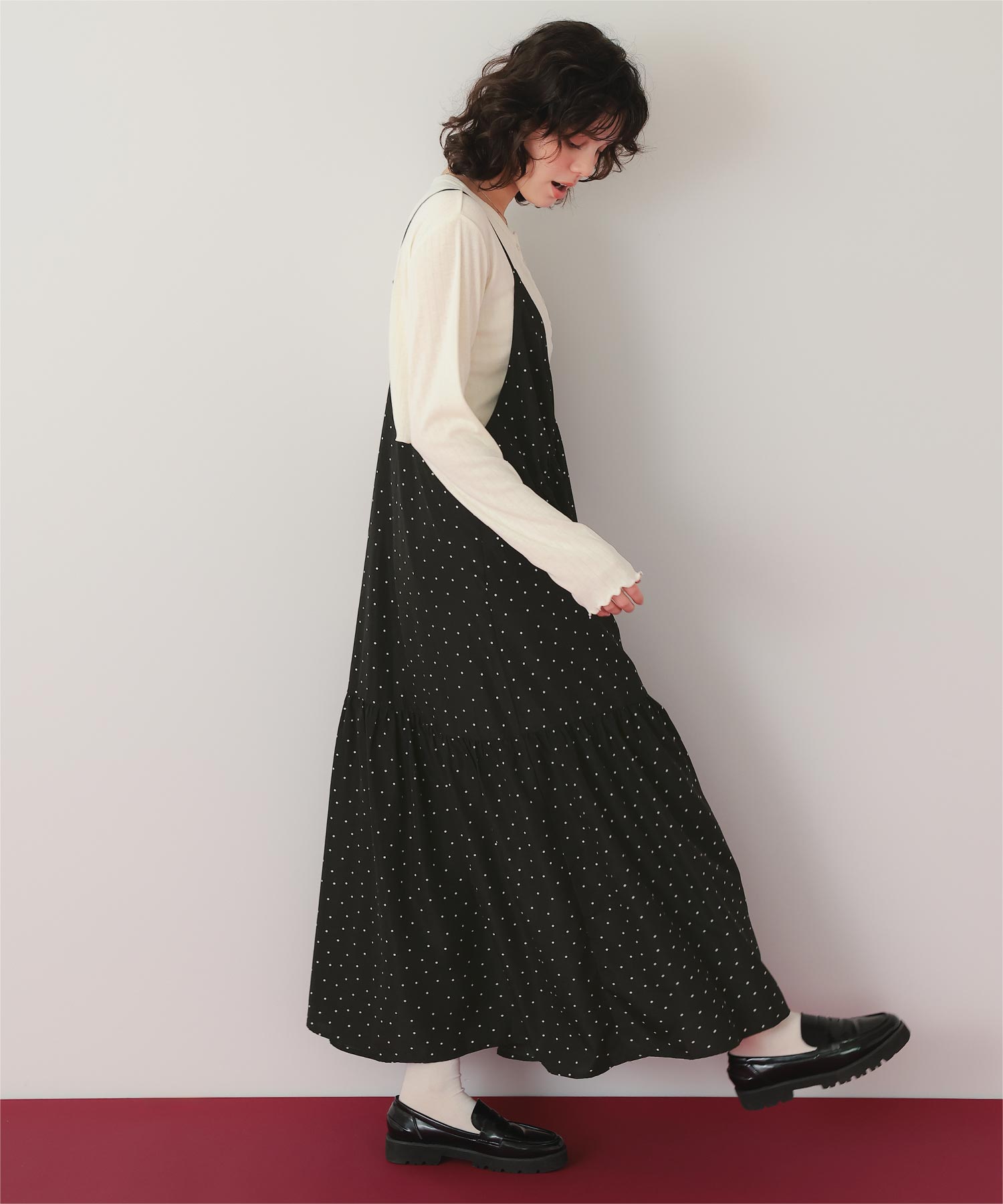 ・裾切替えでフレアに広がるシルエットが女性らしさを引き立たせる