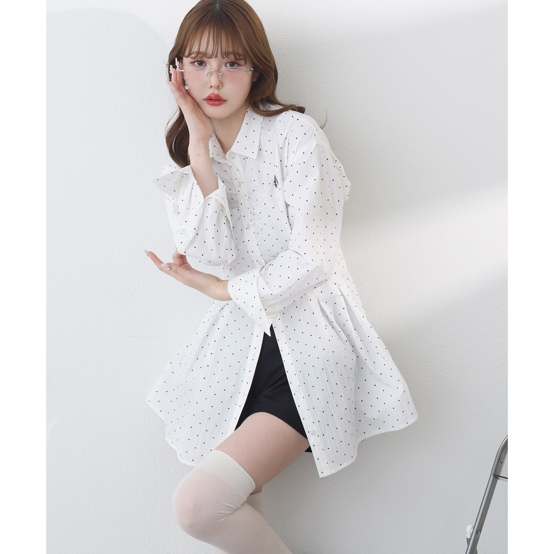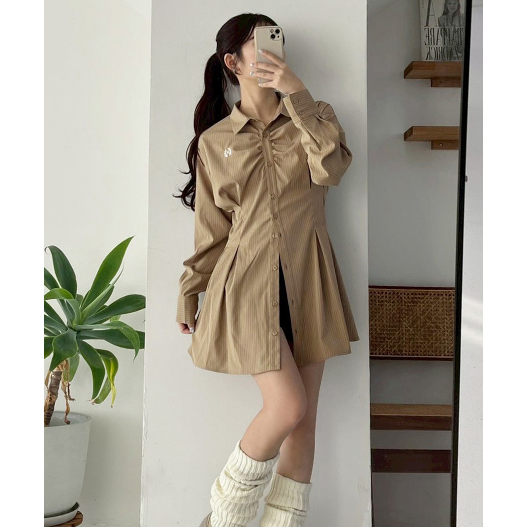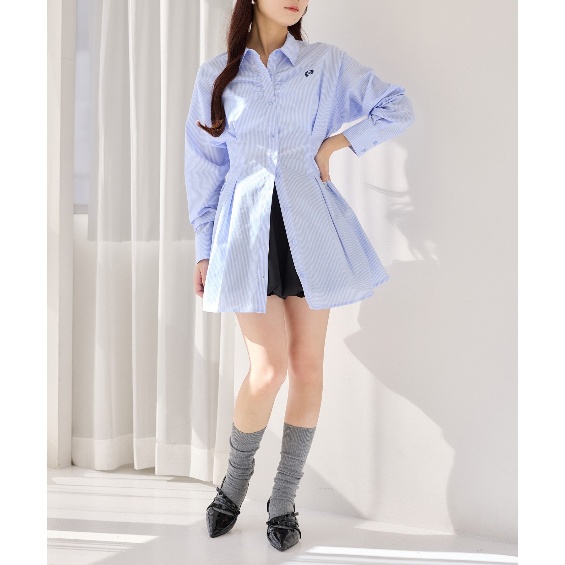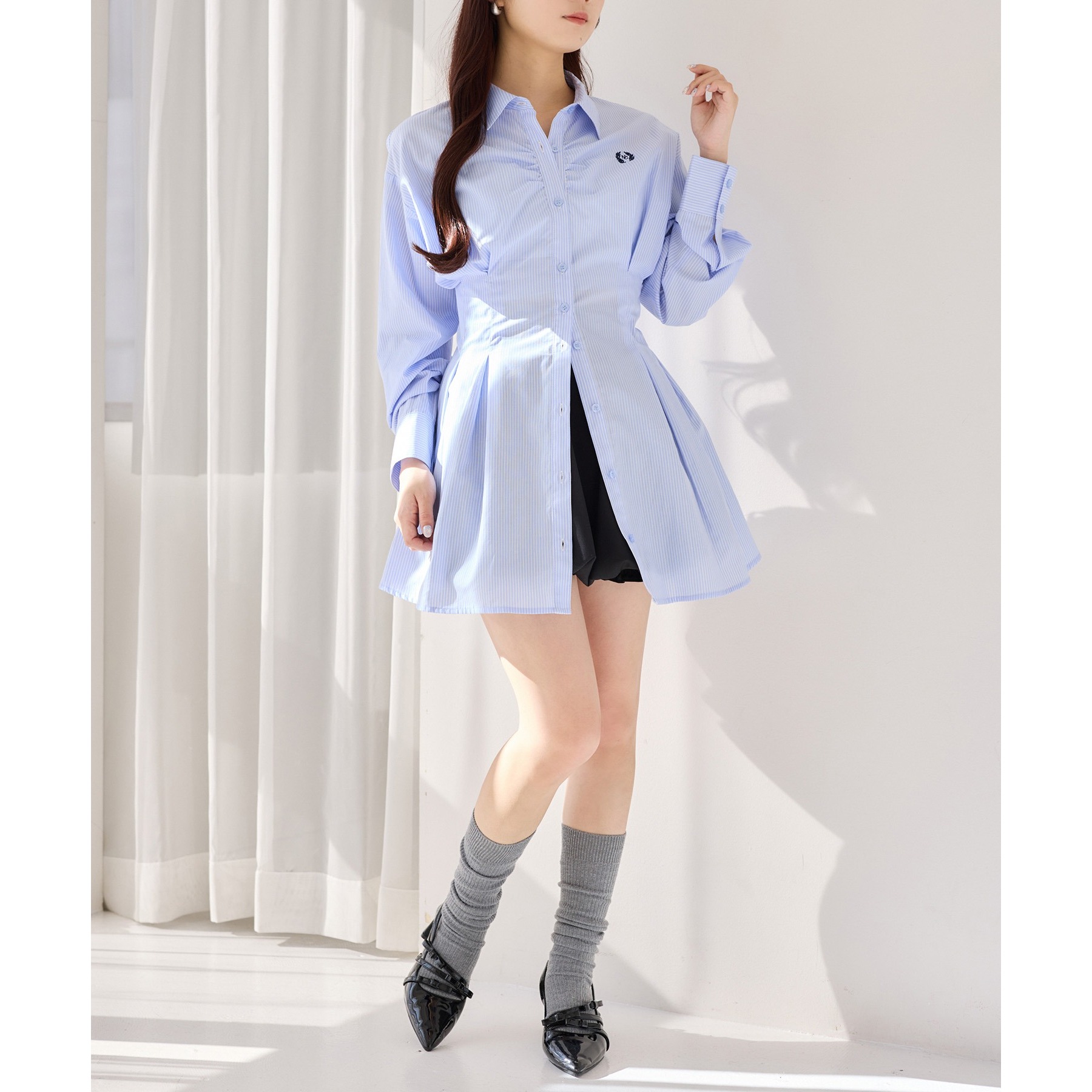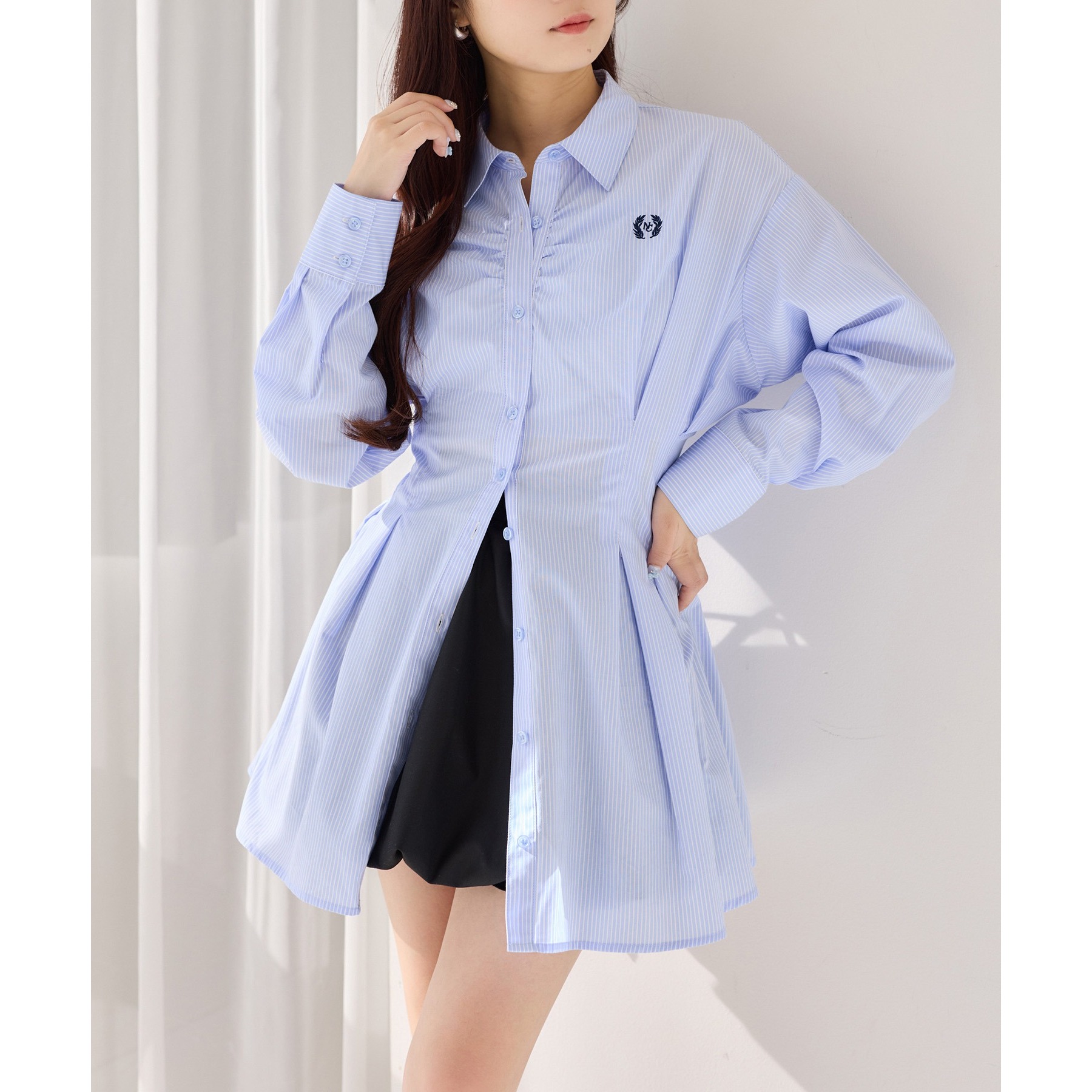 着るだけでスタイルアップができ、ウエスト細見え間違いなしのミドル丈のシャツ。