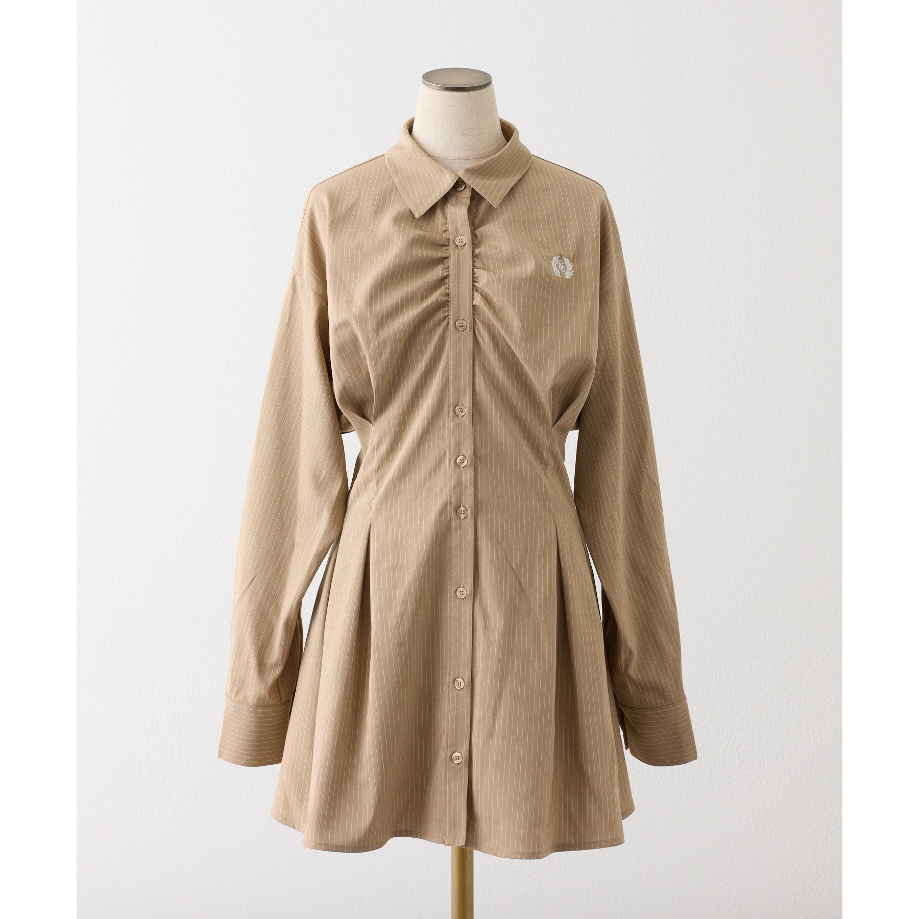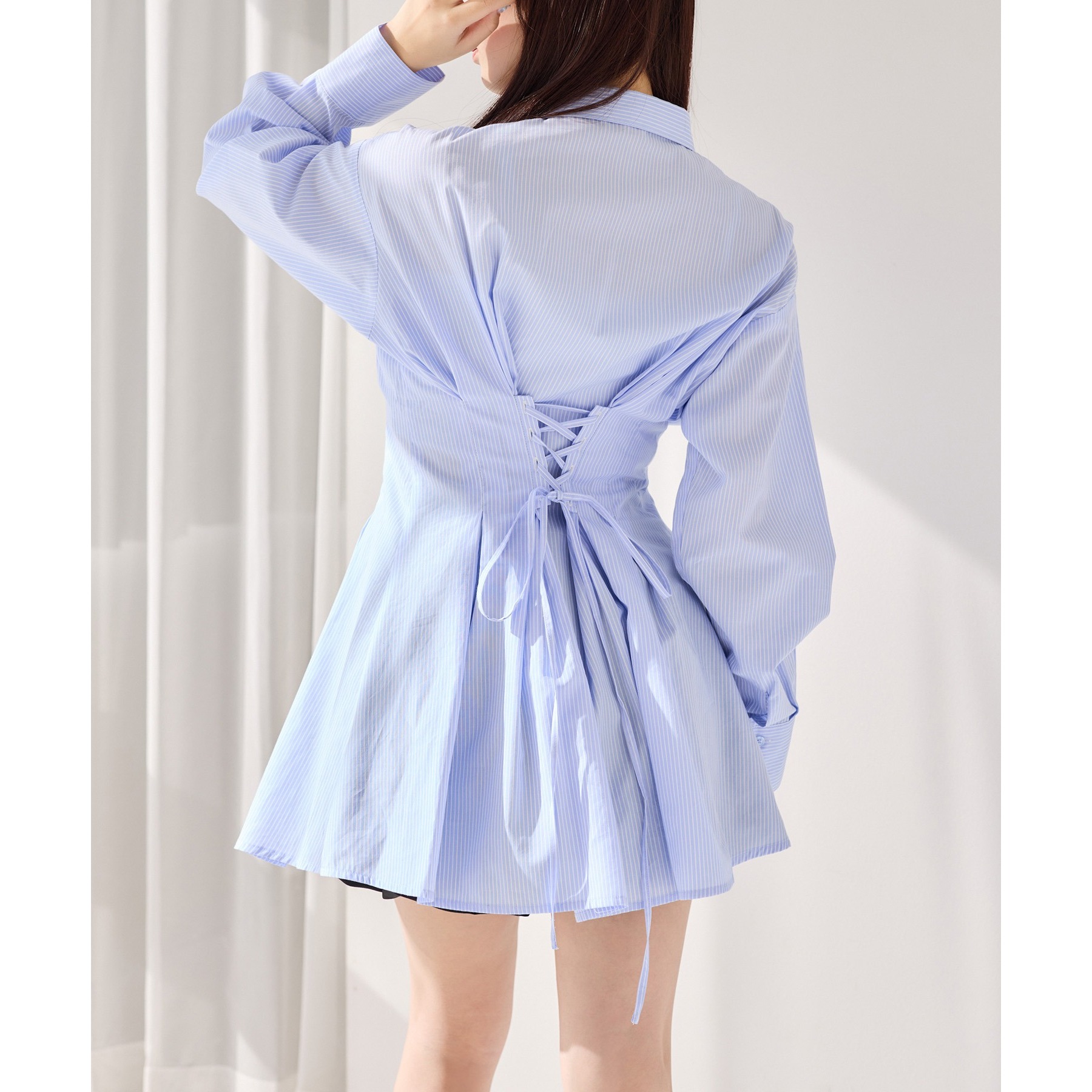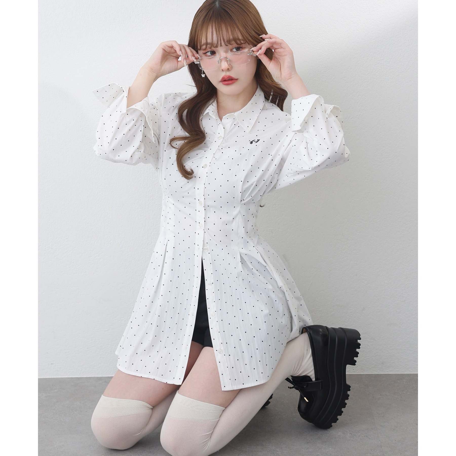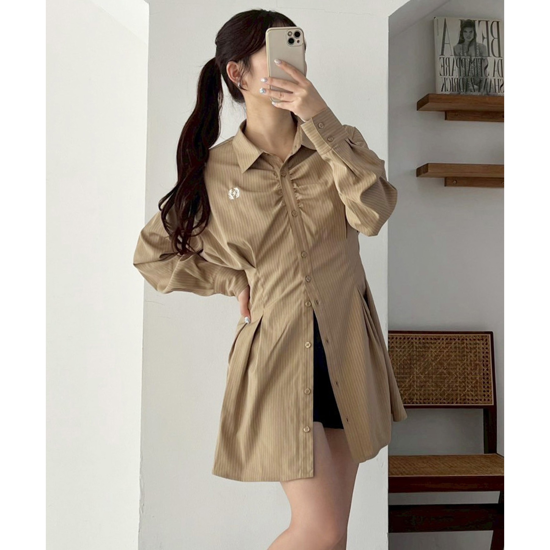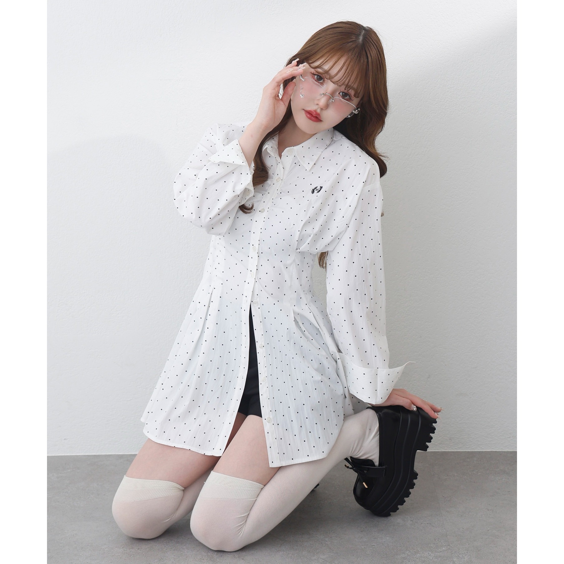 着るだけでスタイルアップができ、ウエスト細見え間違いなしのミドル丈のシャツ。