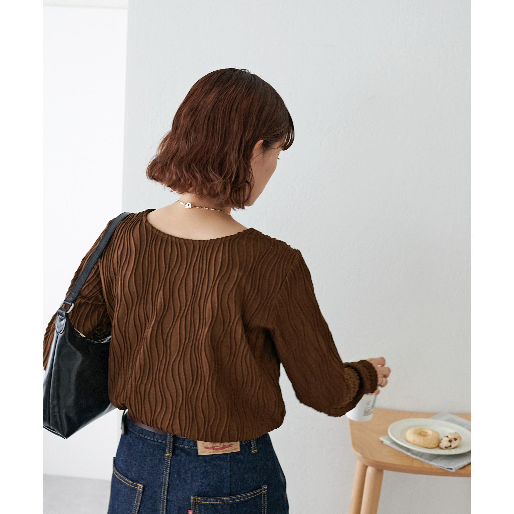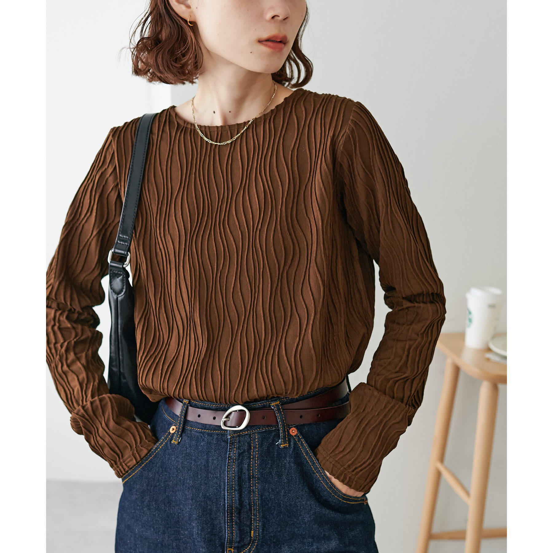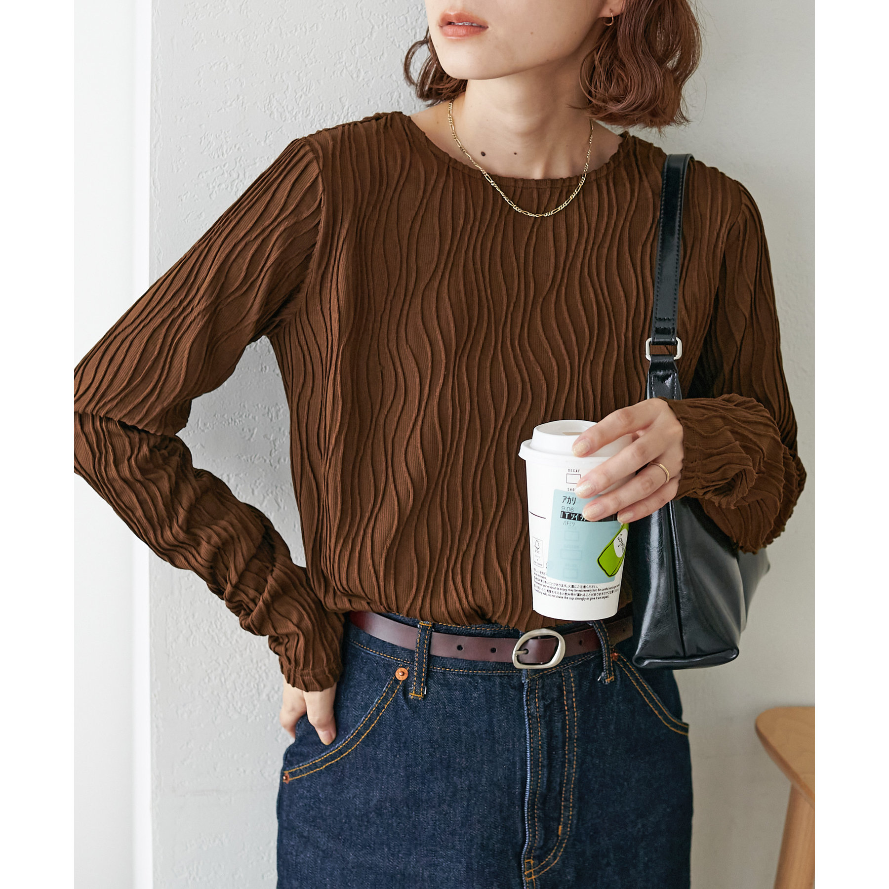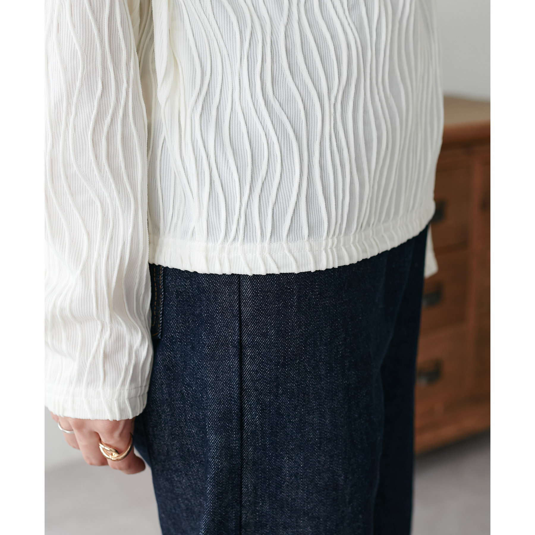 155cmスタッフ:ジャガードのデザインなので、コーデのポイントにおすすめのトップスです!