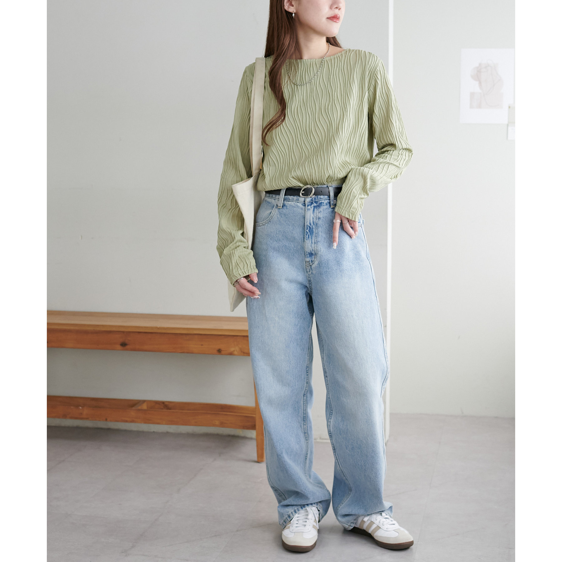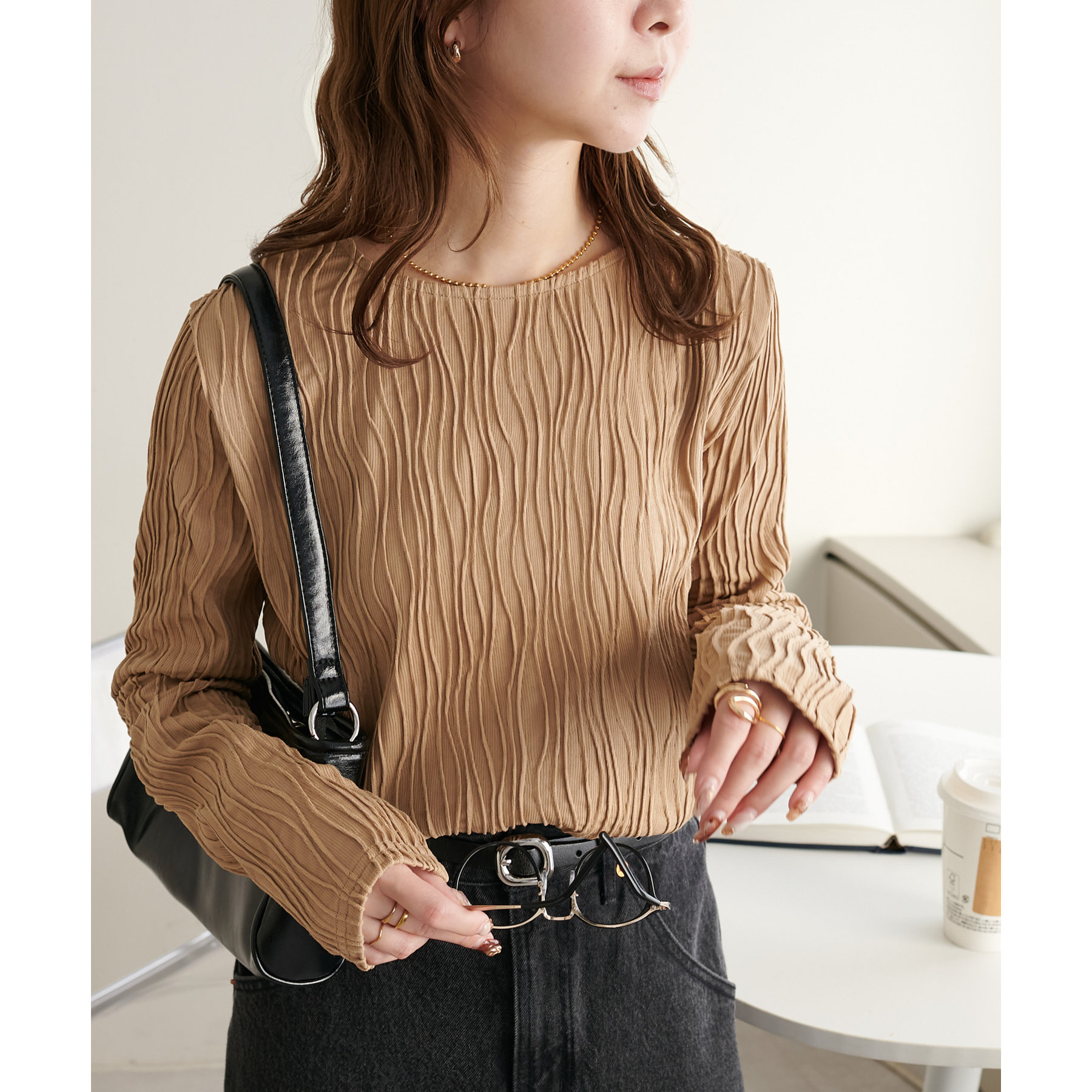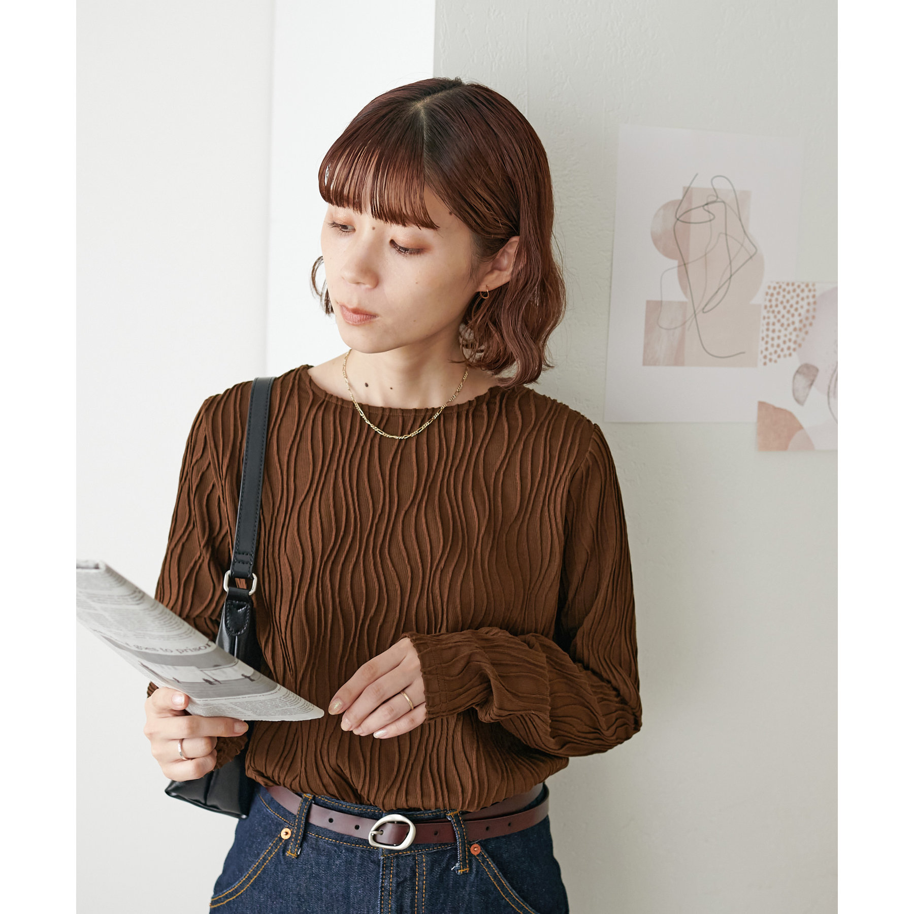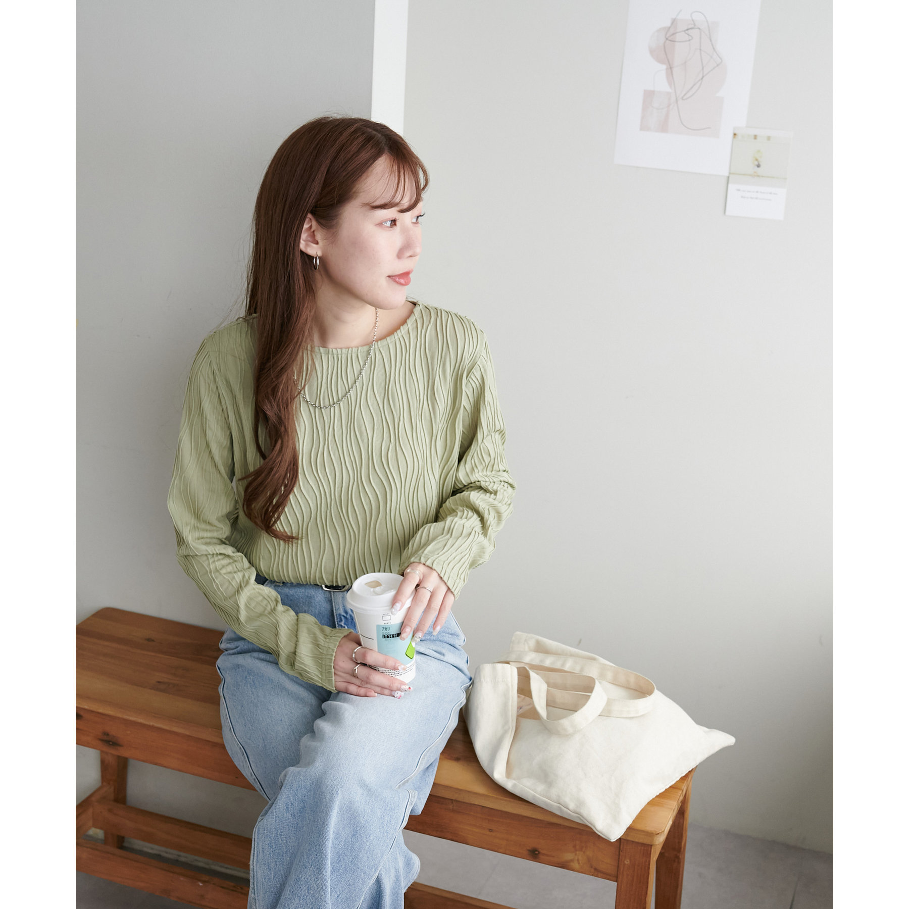 155cmスタッフ:ジャガードのデザインなので、コーデのポイントにおすすめのトップスです!