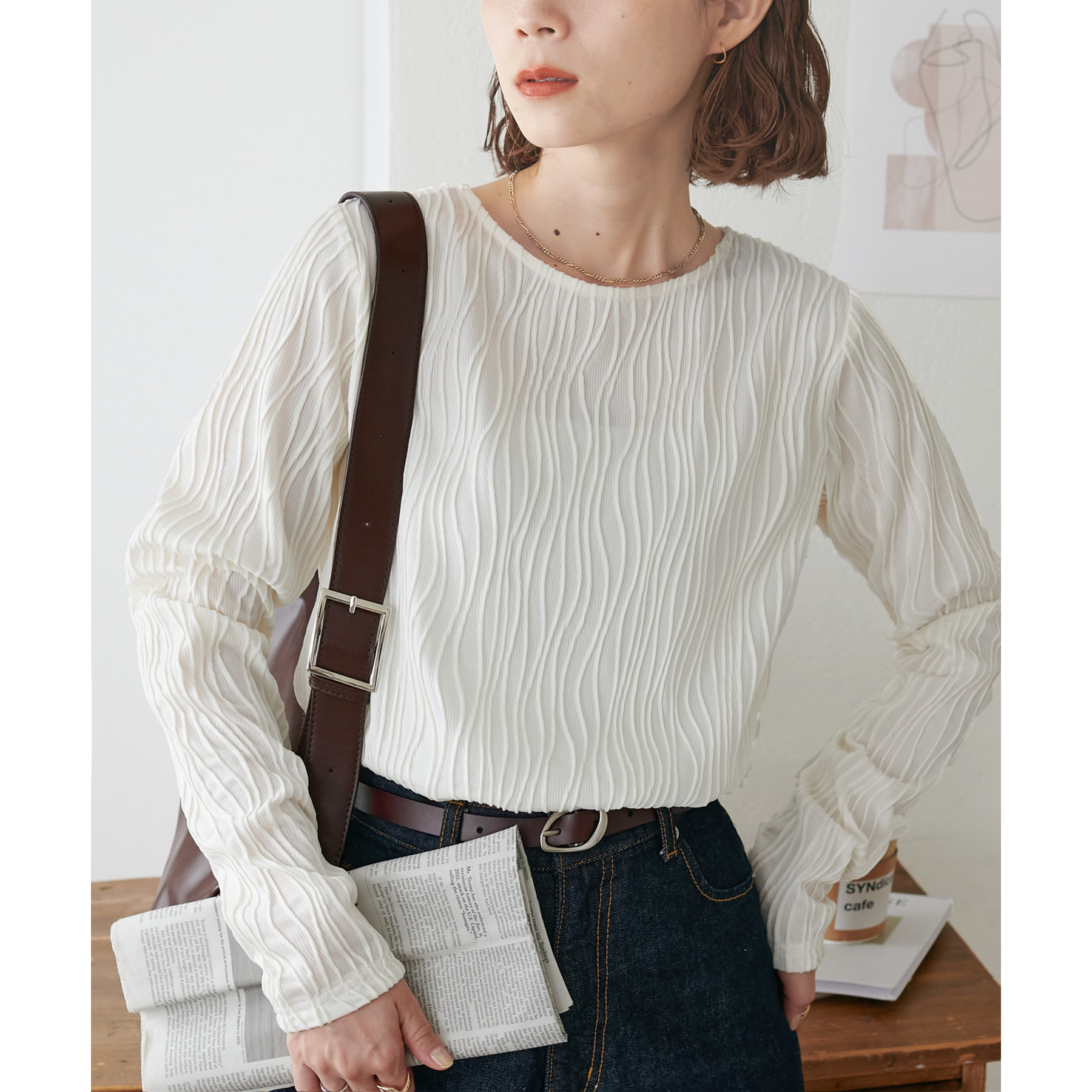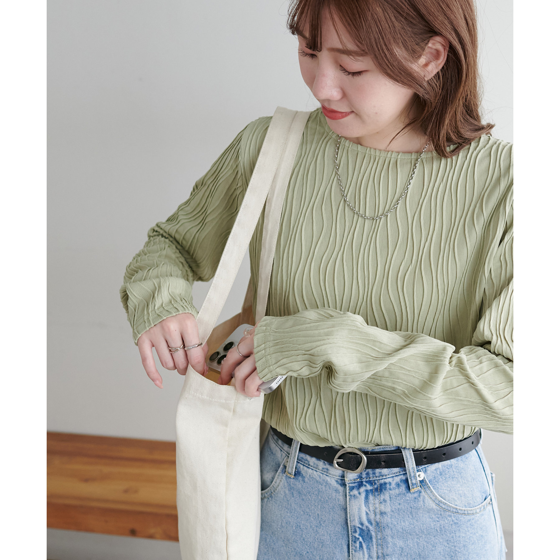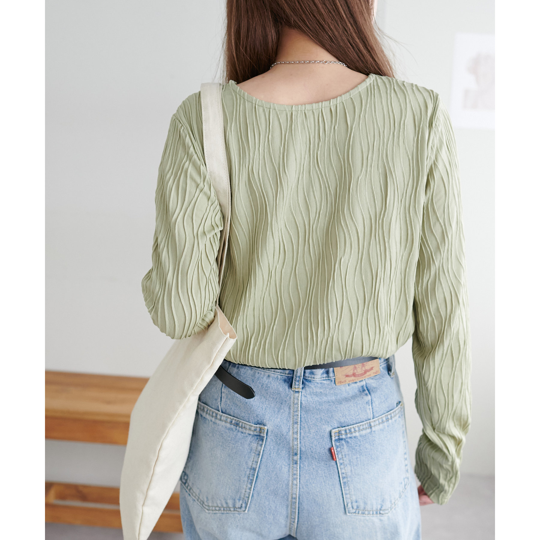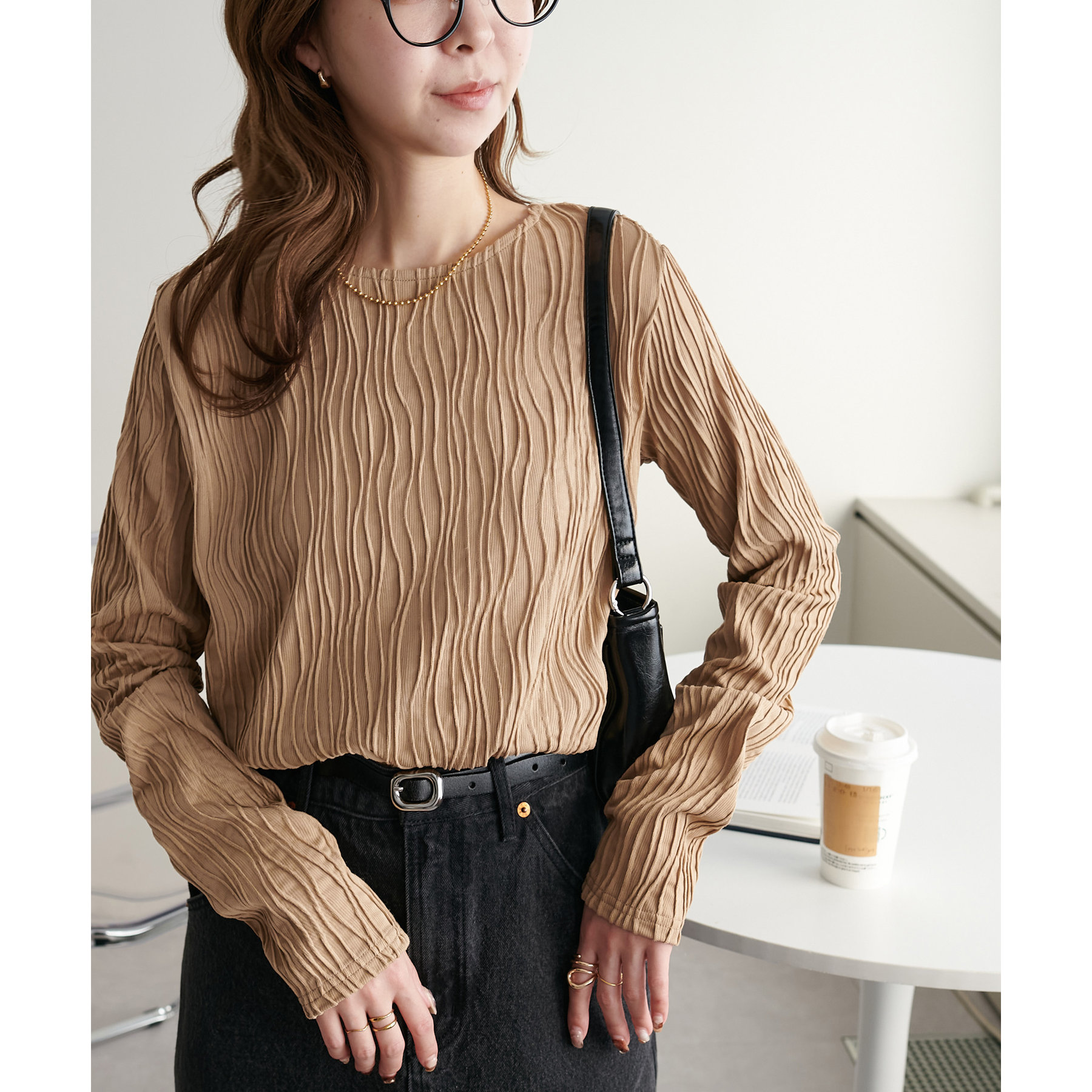155cmスタッフ:ジャガードのデザインなので、コーデのポイントにおすすめのトップスです!