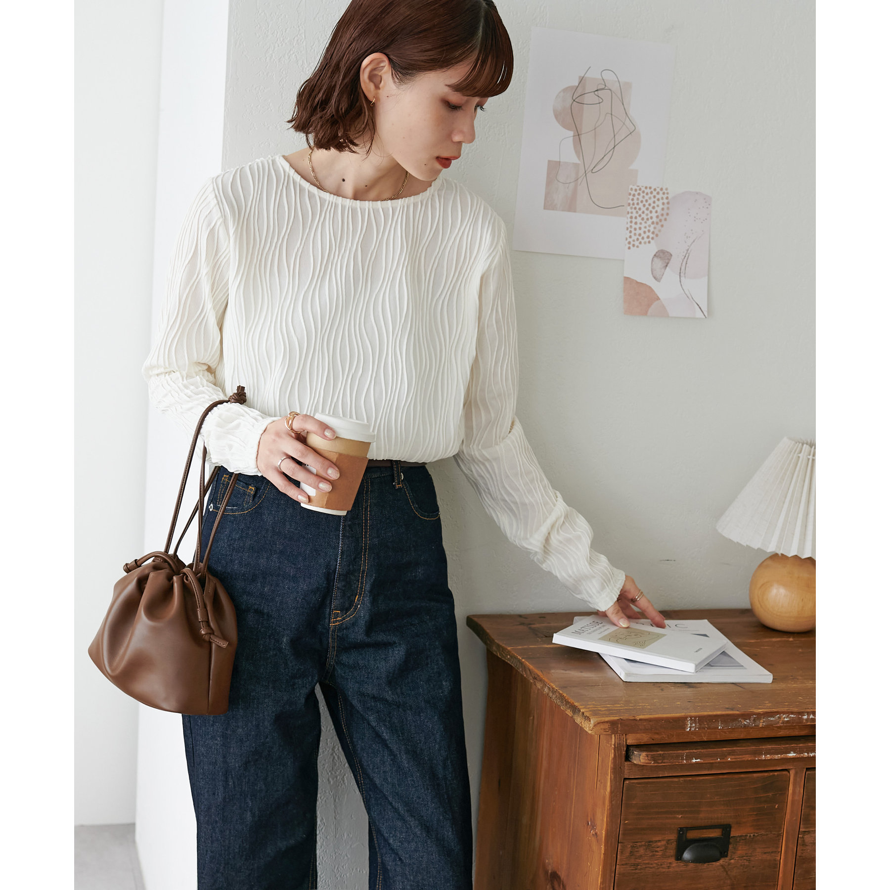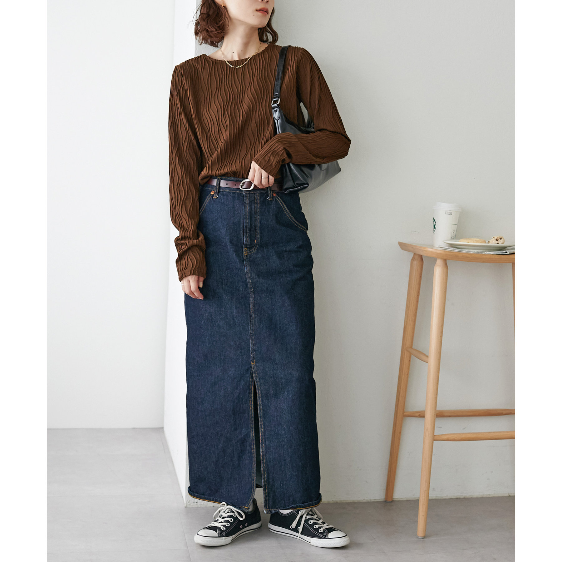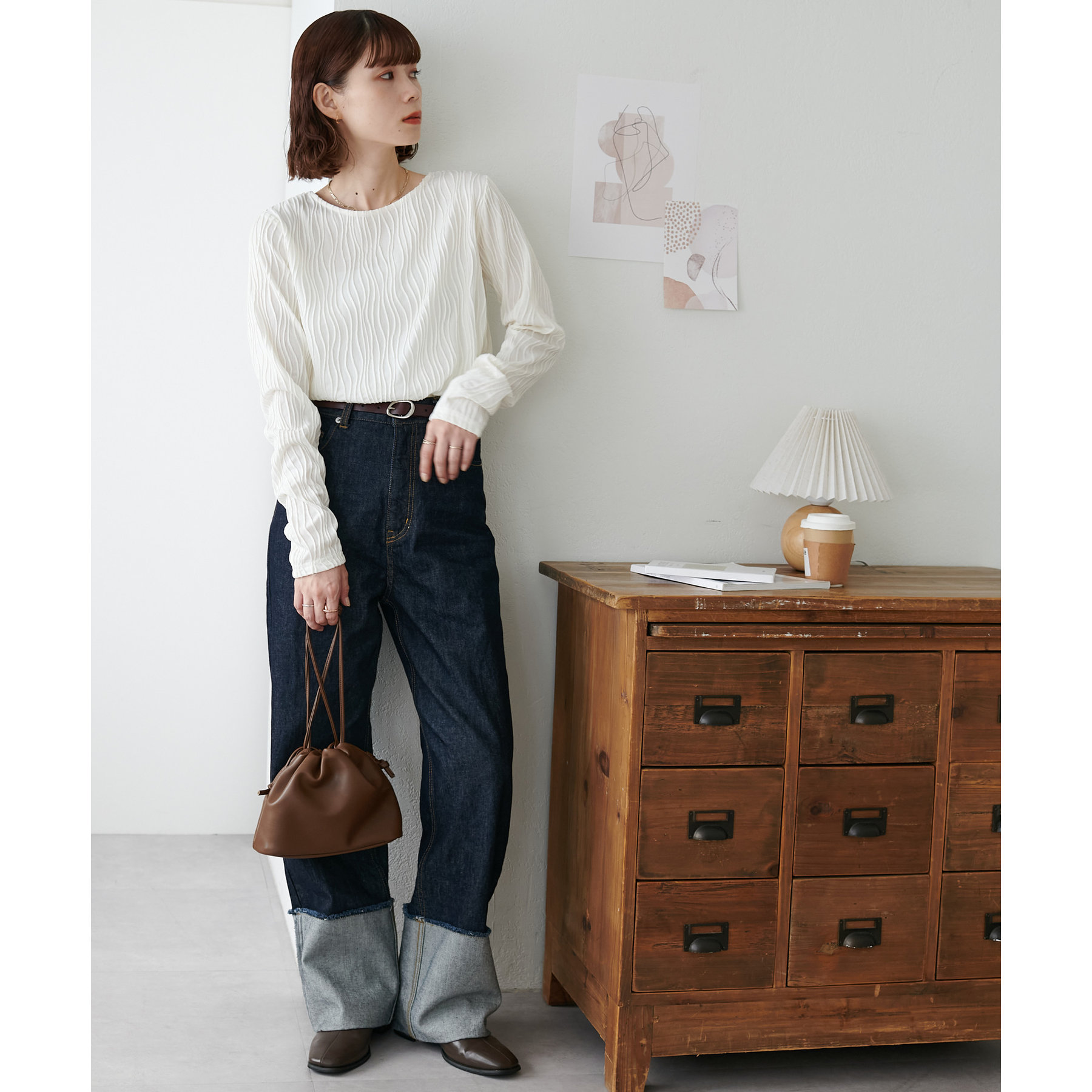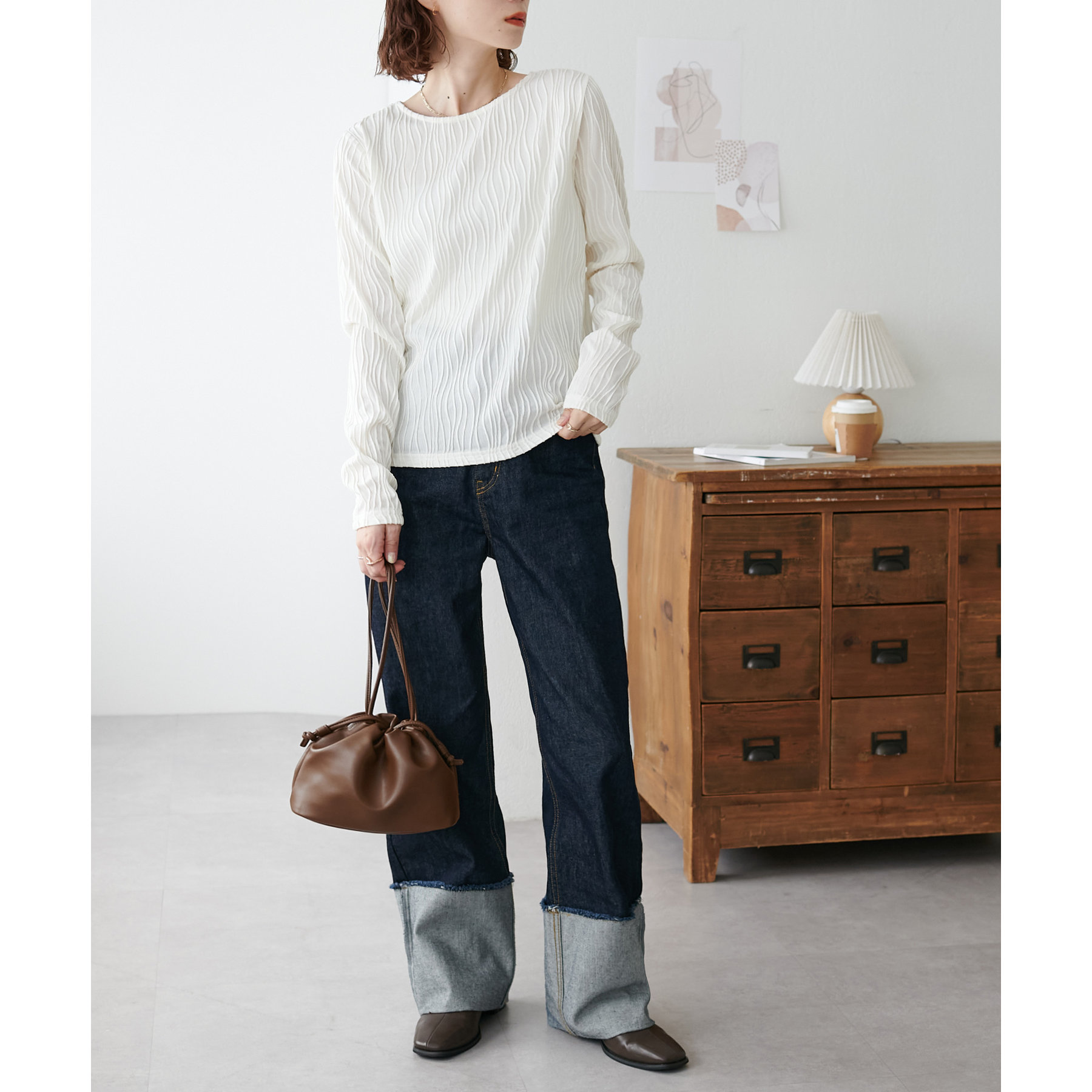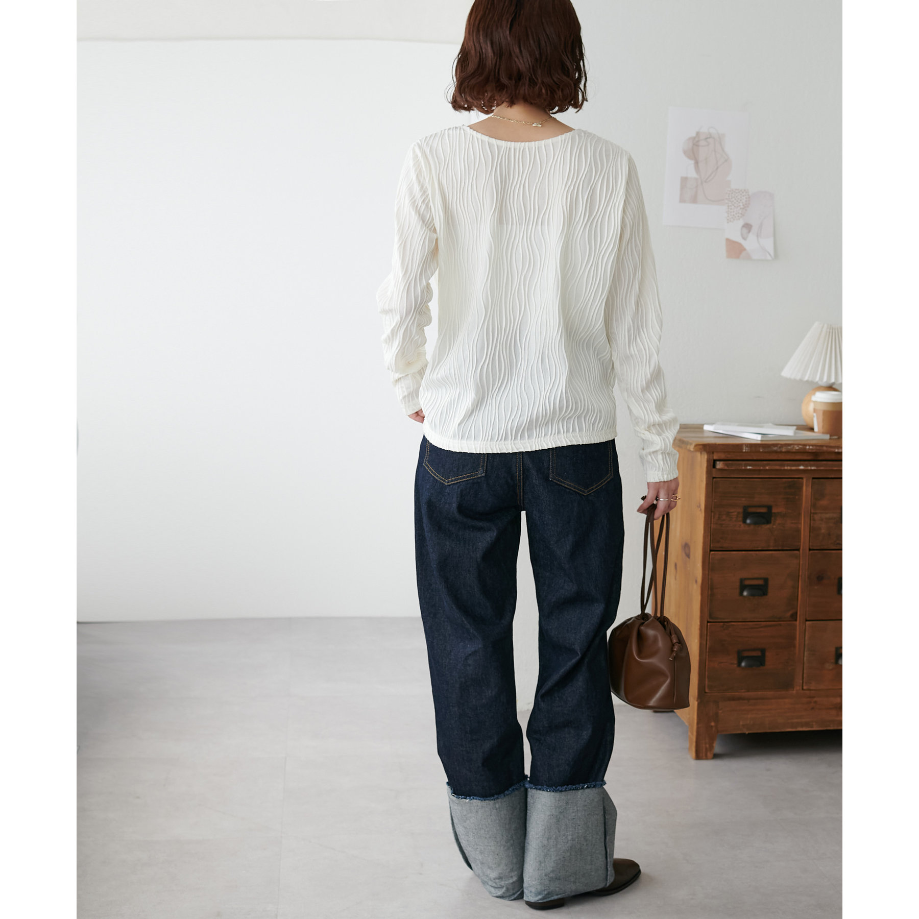 ジャガード柄がポイントになるので、シンプルなボトムスとも相性抜群!