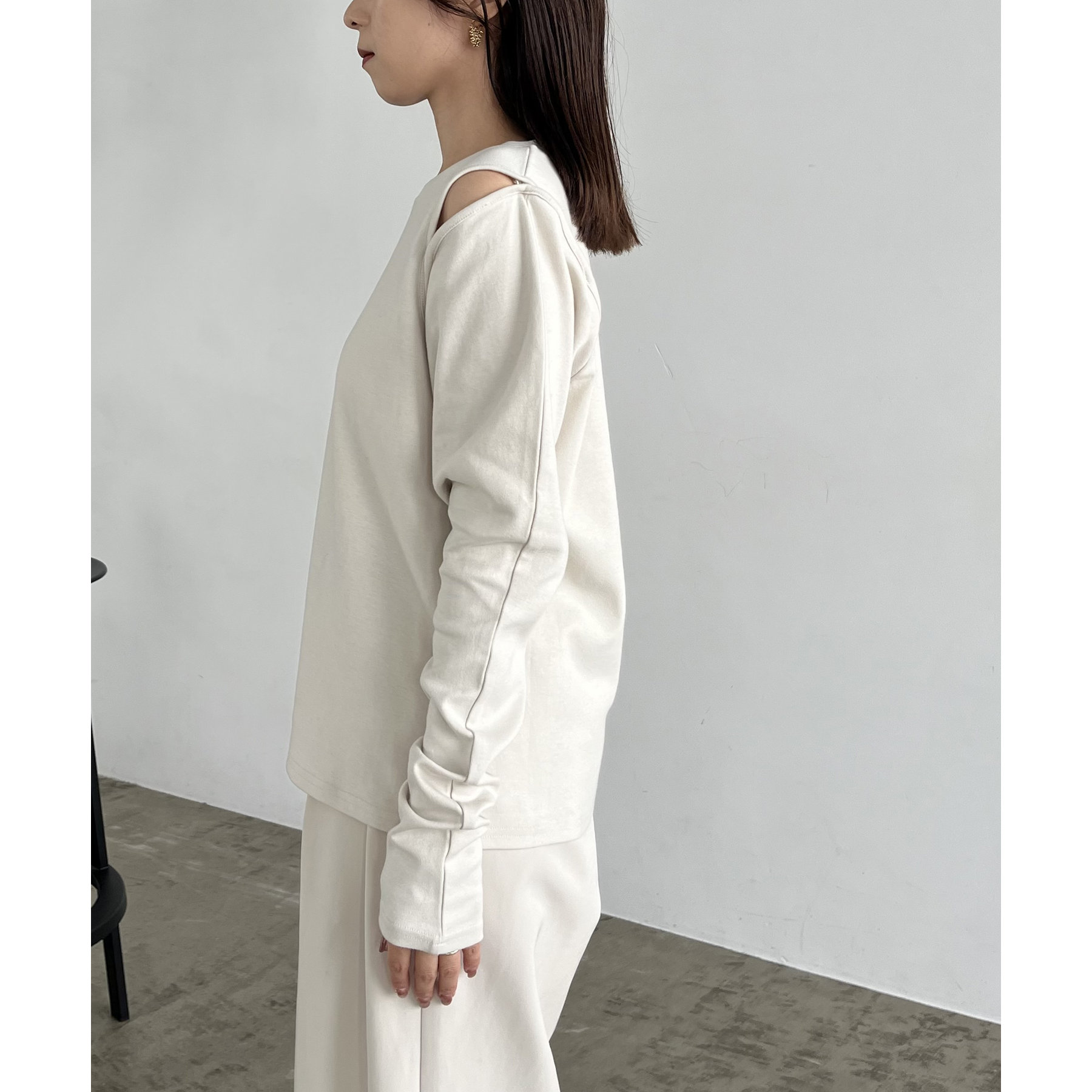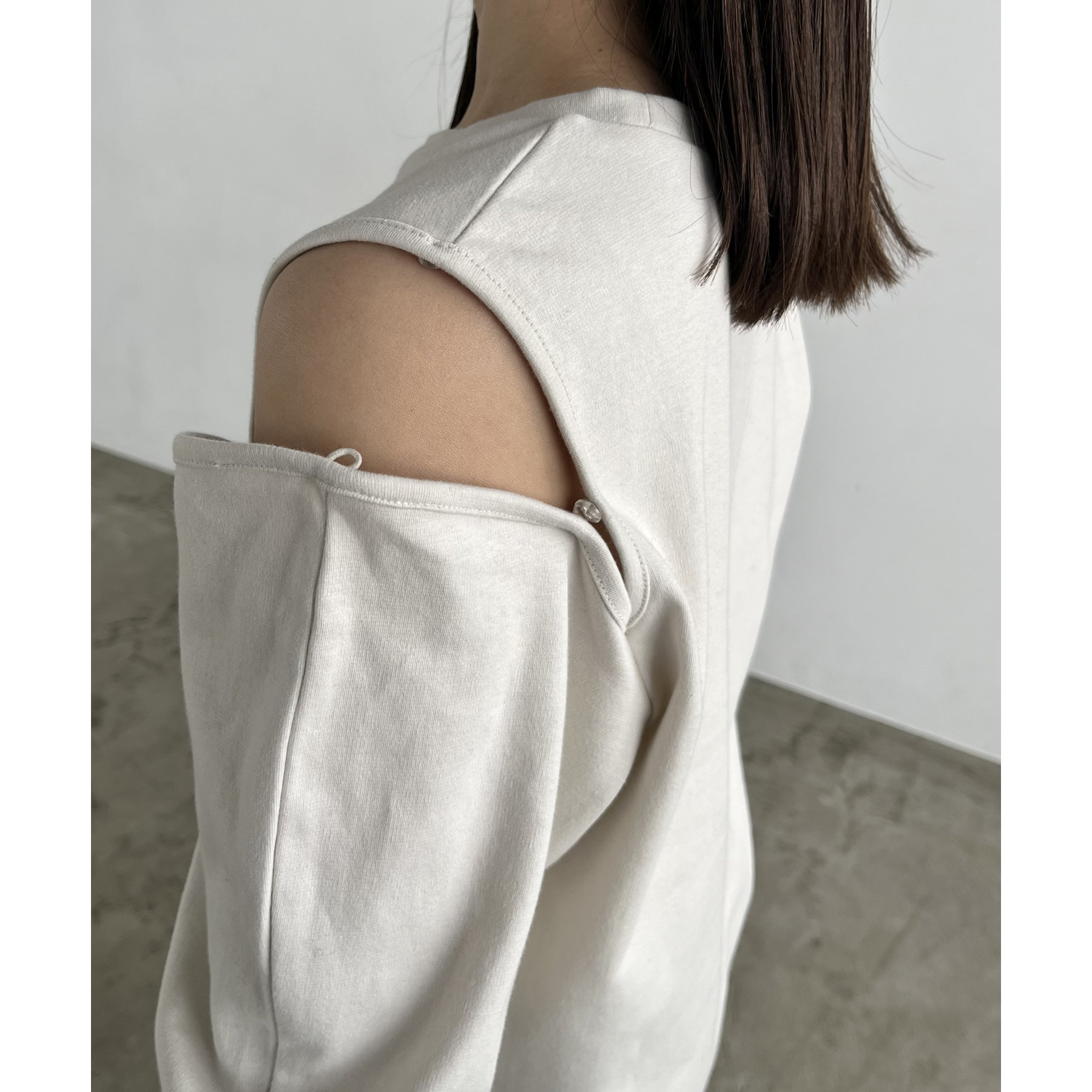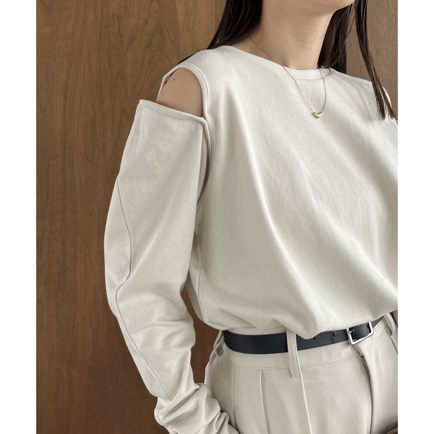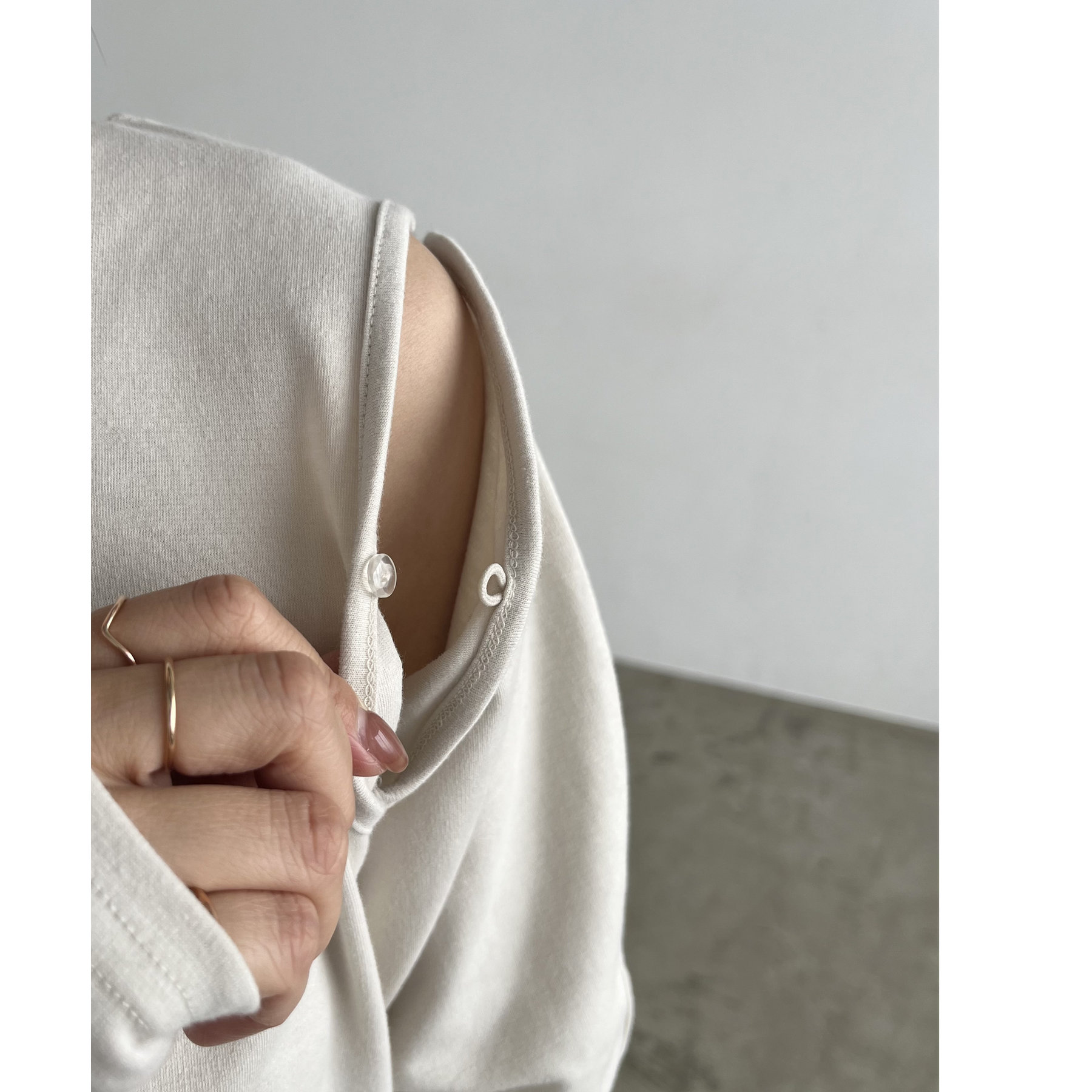 ②上のボタンのみを開けるとヘルシーな抜け感ある肩開きスタイルに