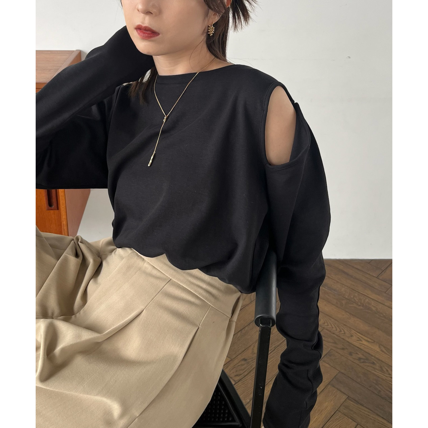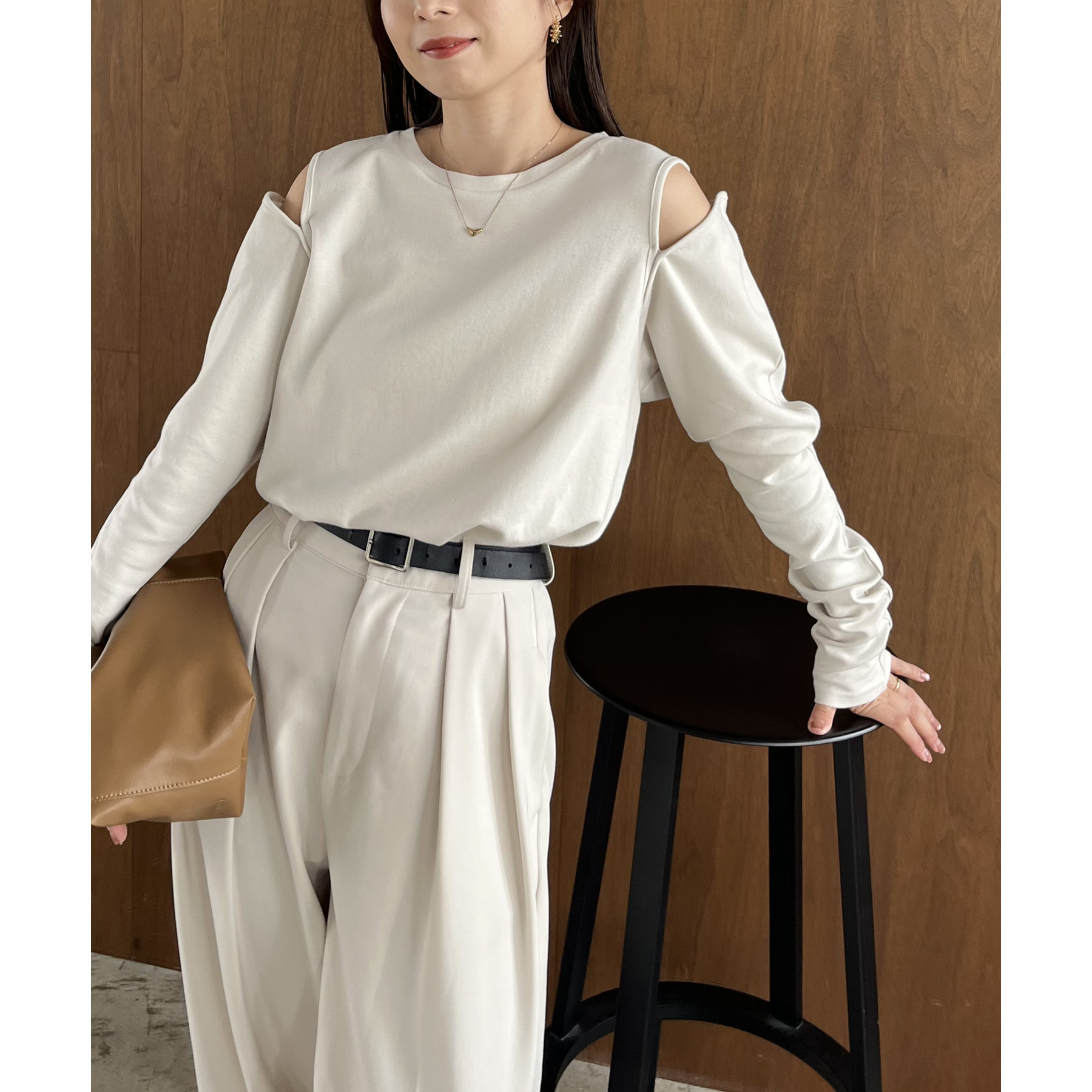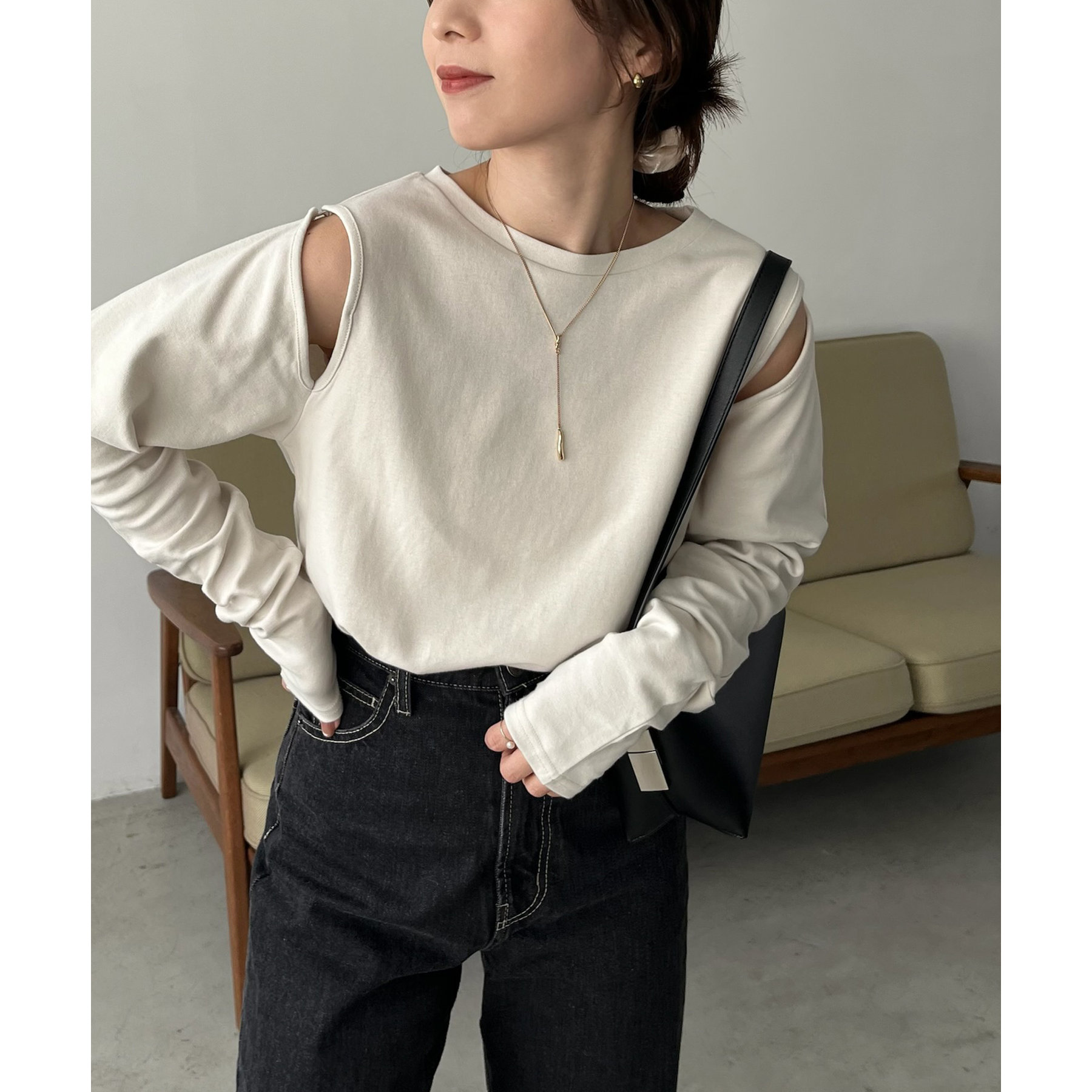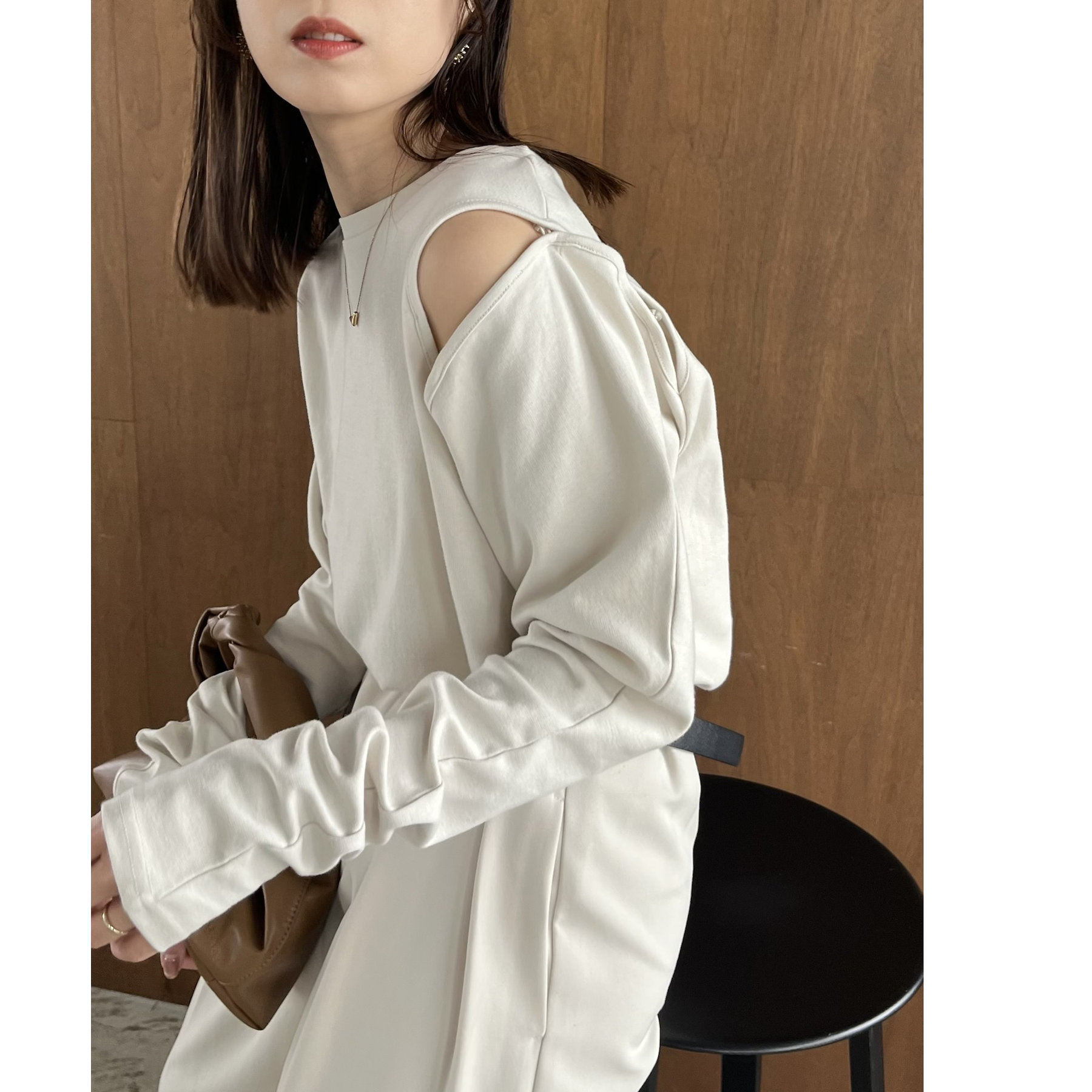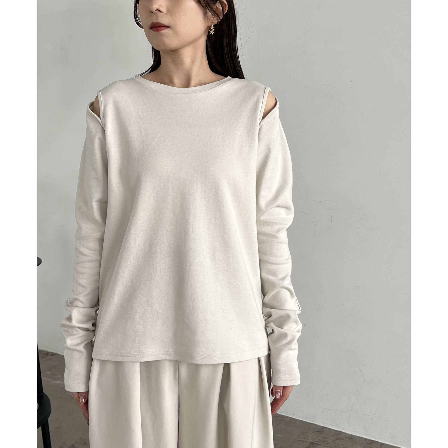 ②上のボタンのみを開けるとヘルシーな抜け感ある肩開きスタイルに