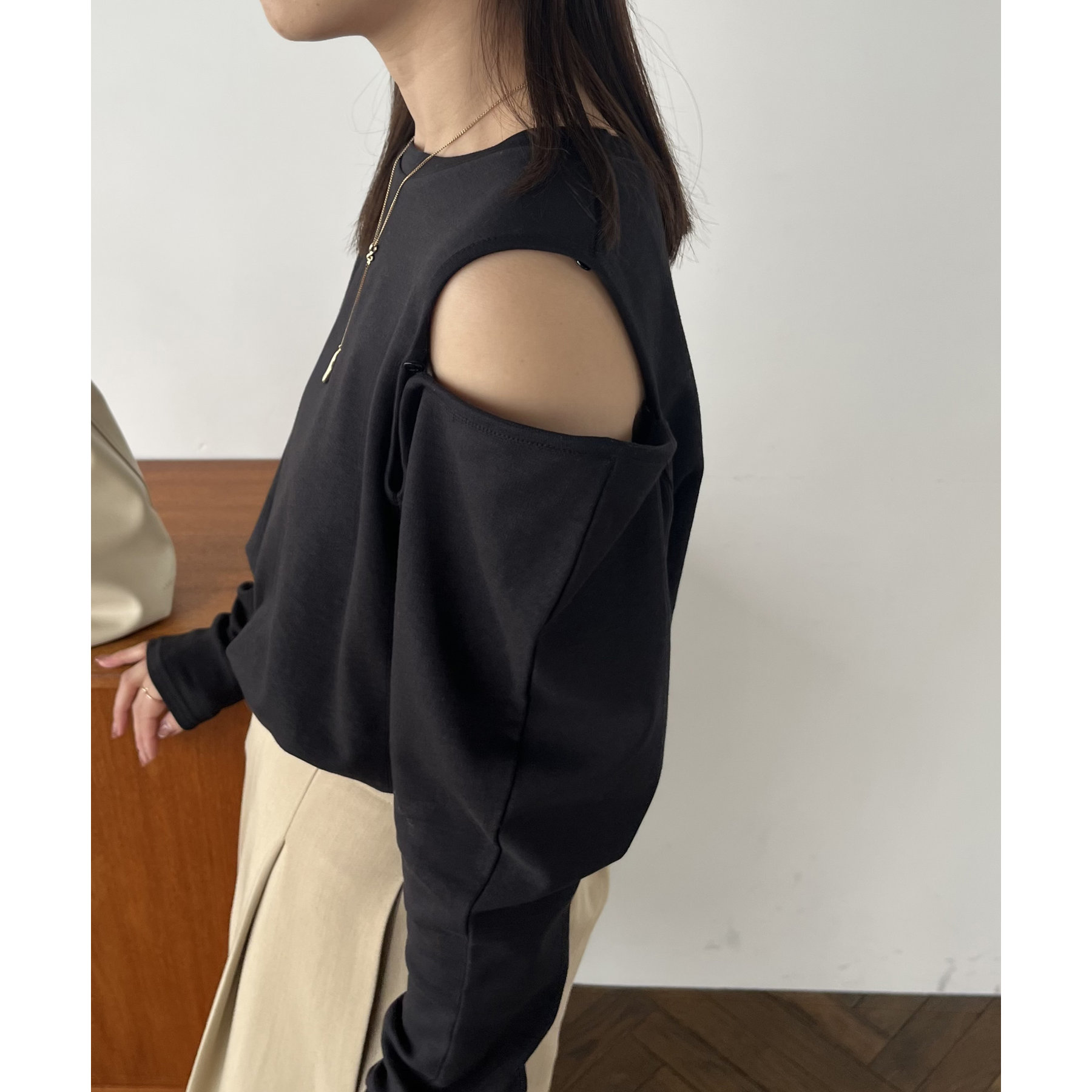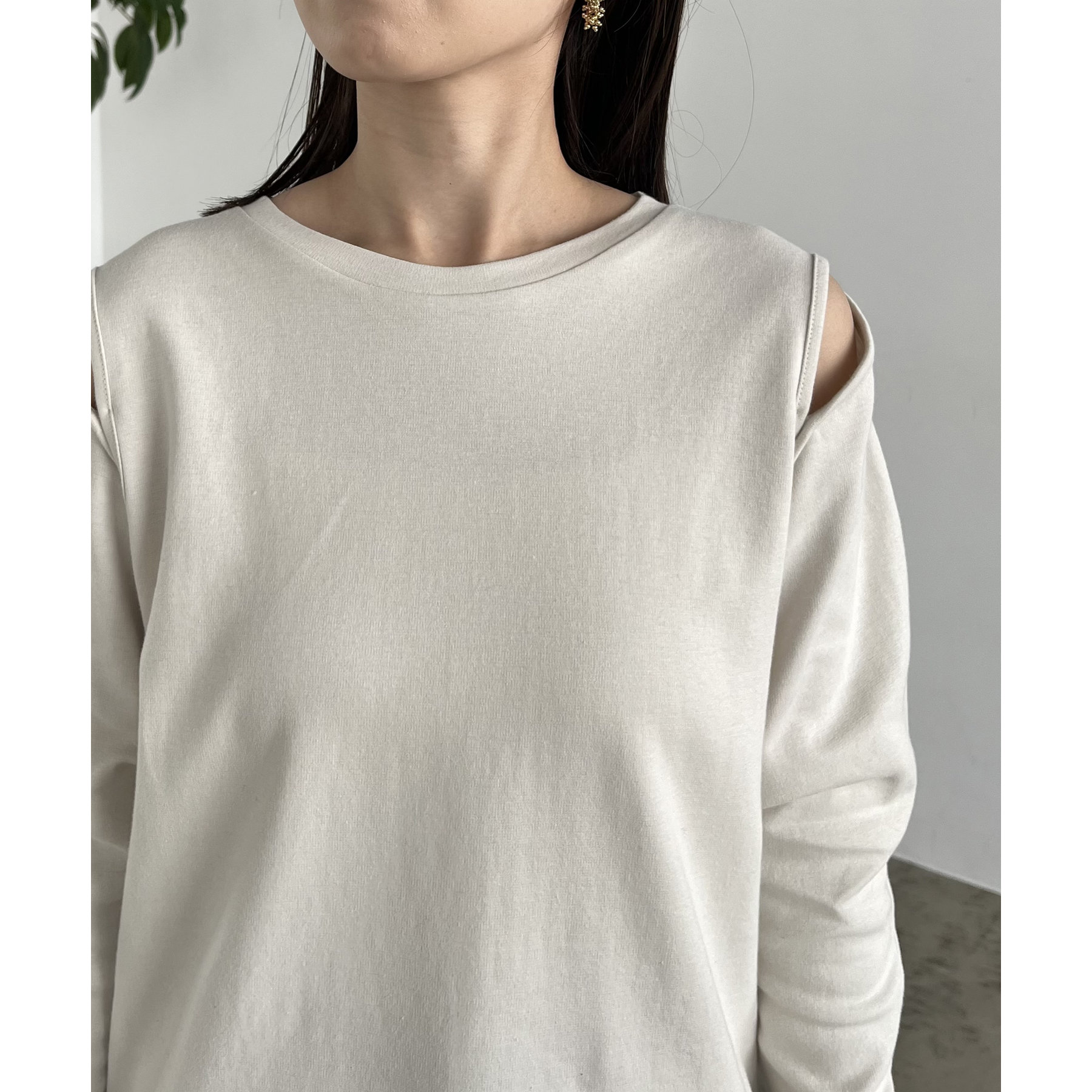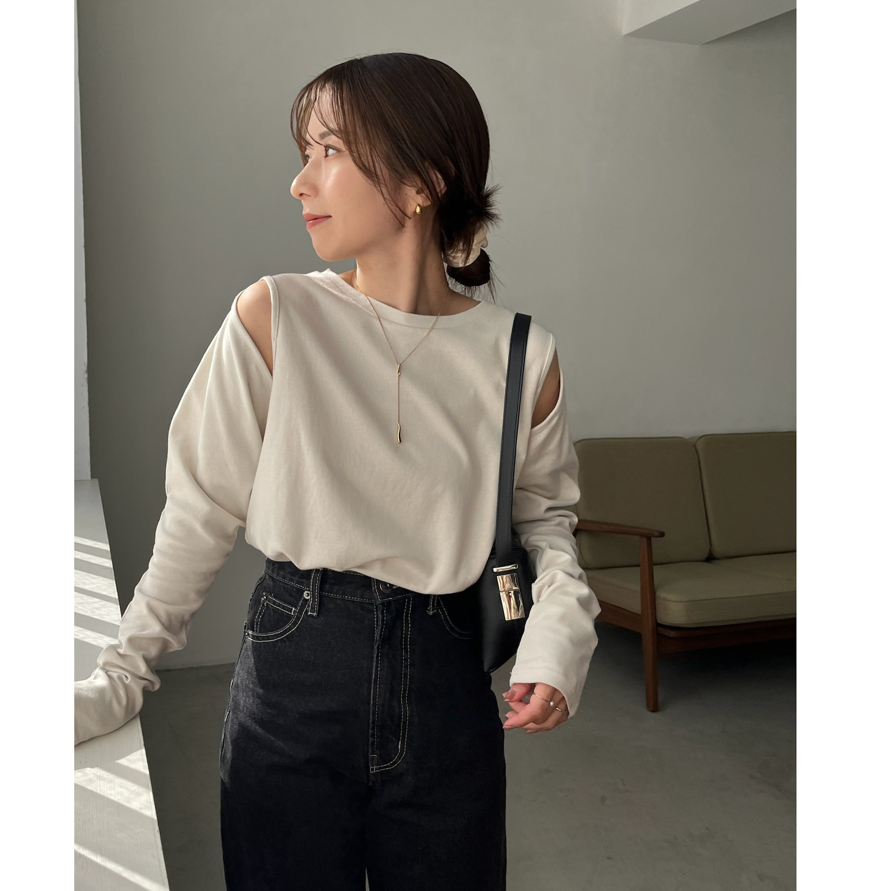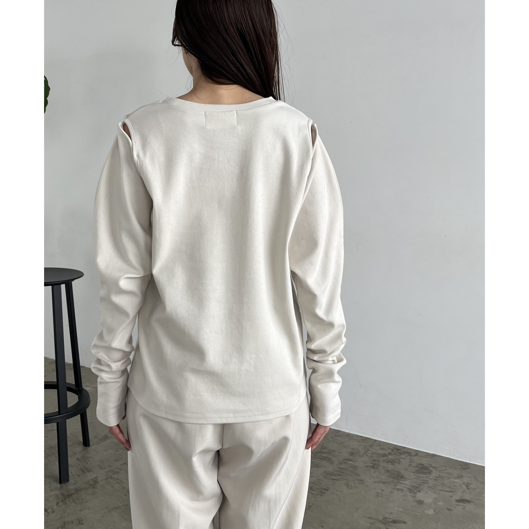 ②上のボタンのみを開けるとヘルシーな抜け感ある肩開きスタイルに