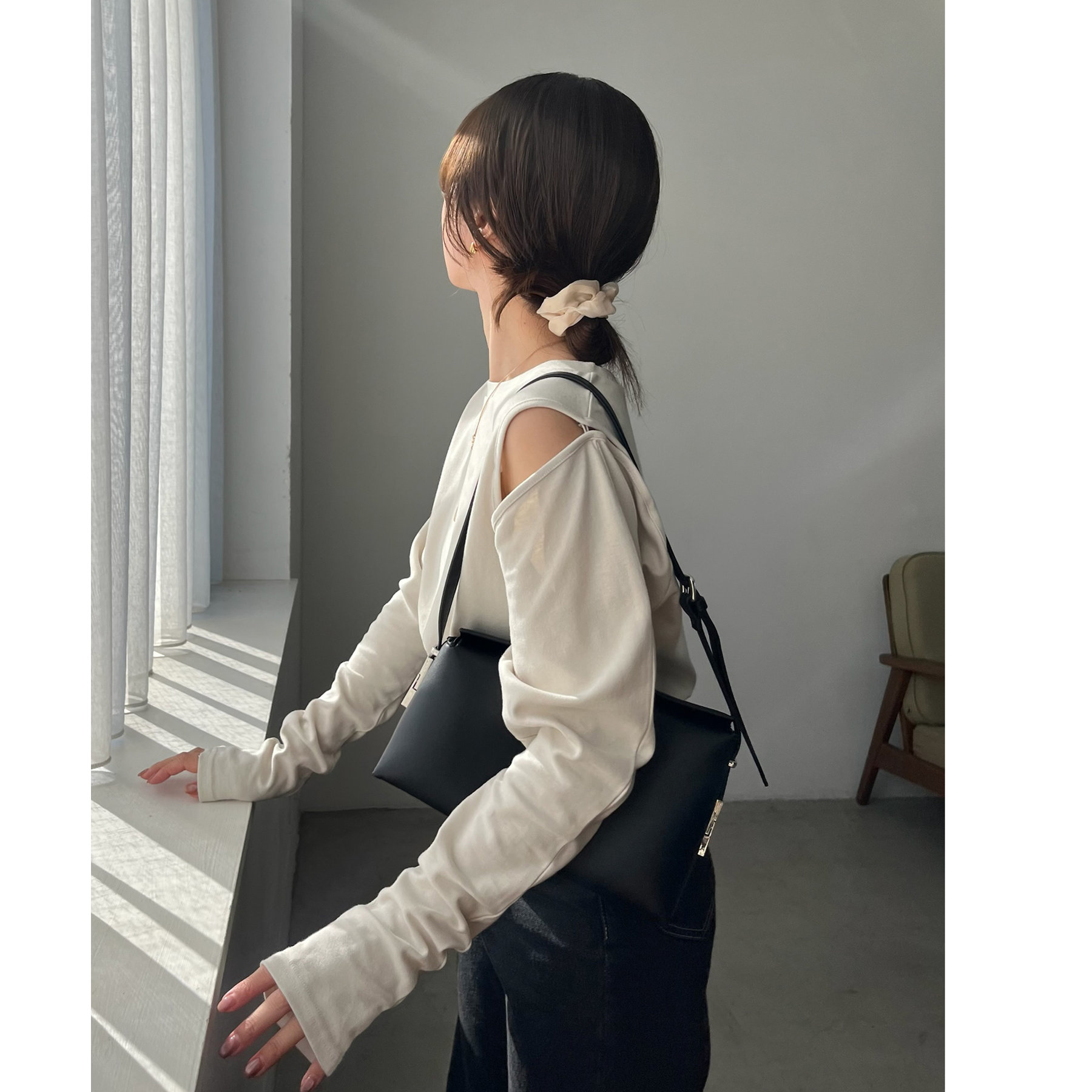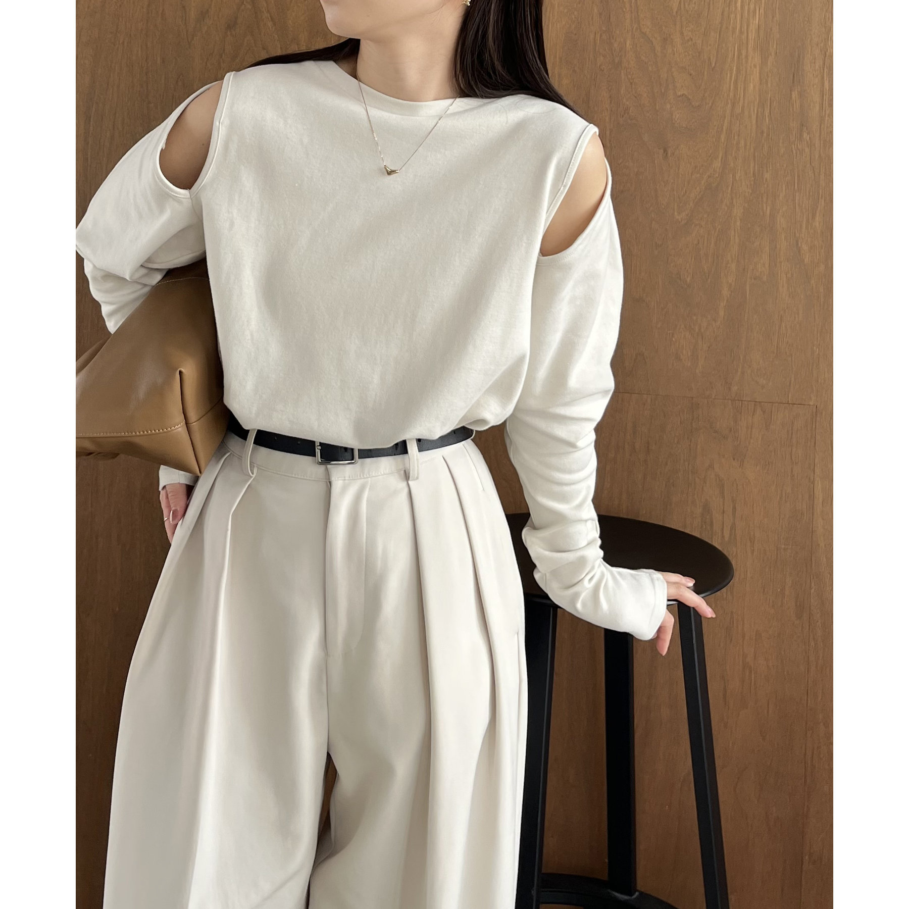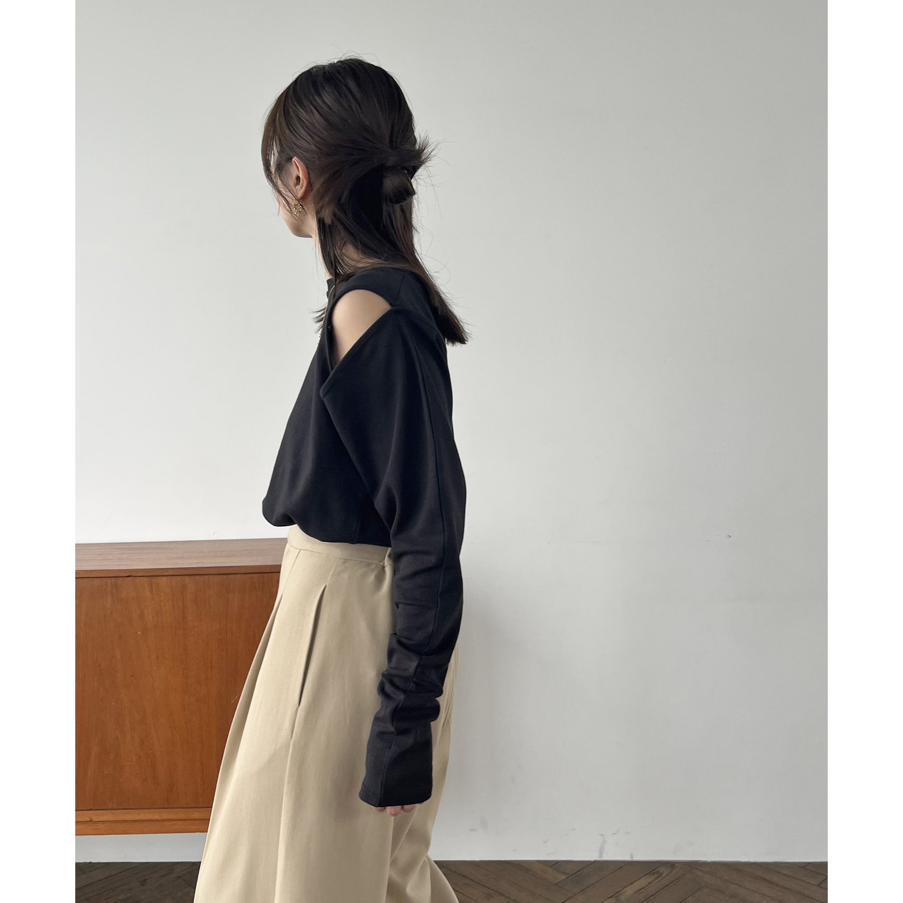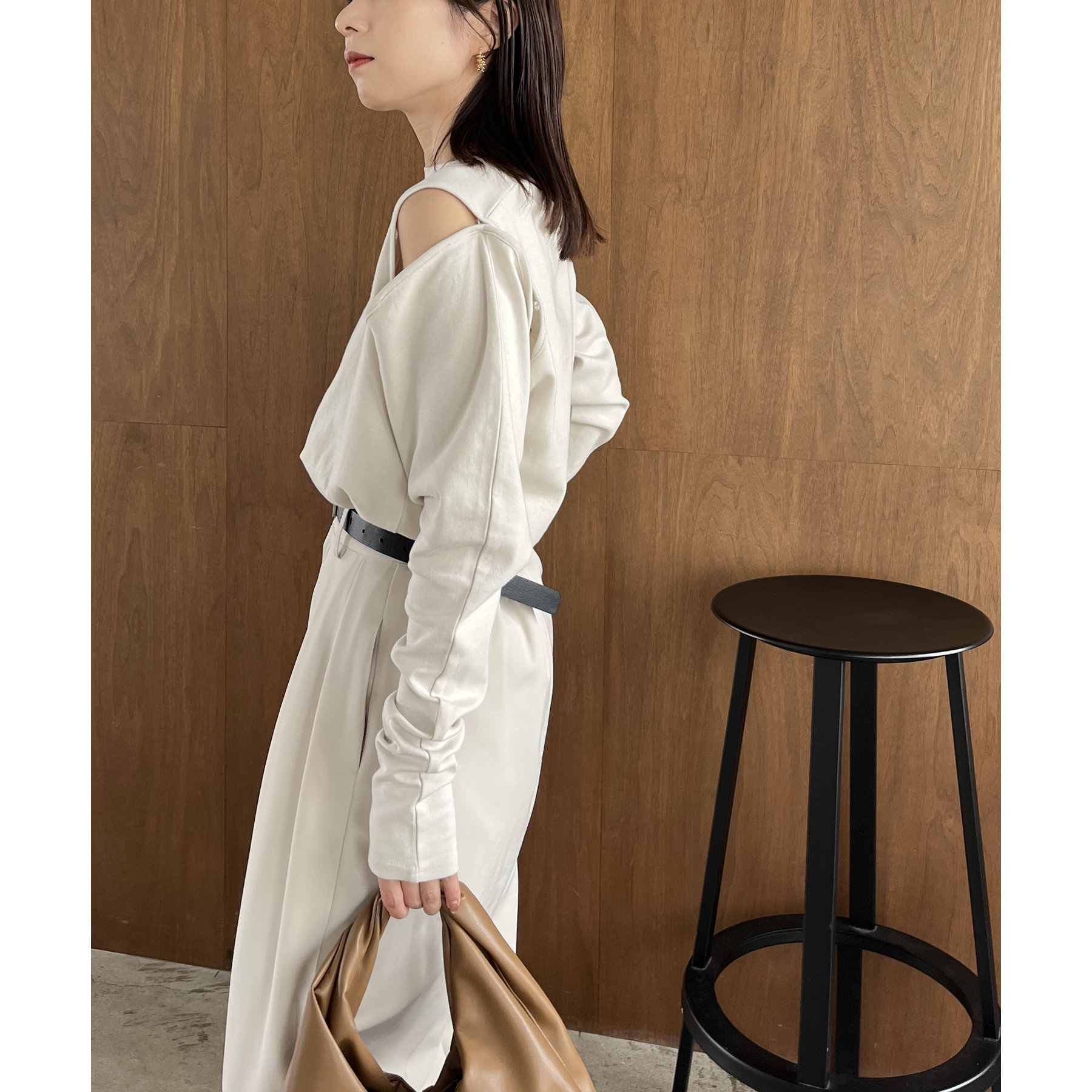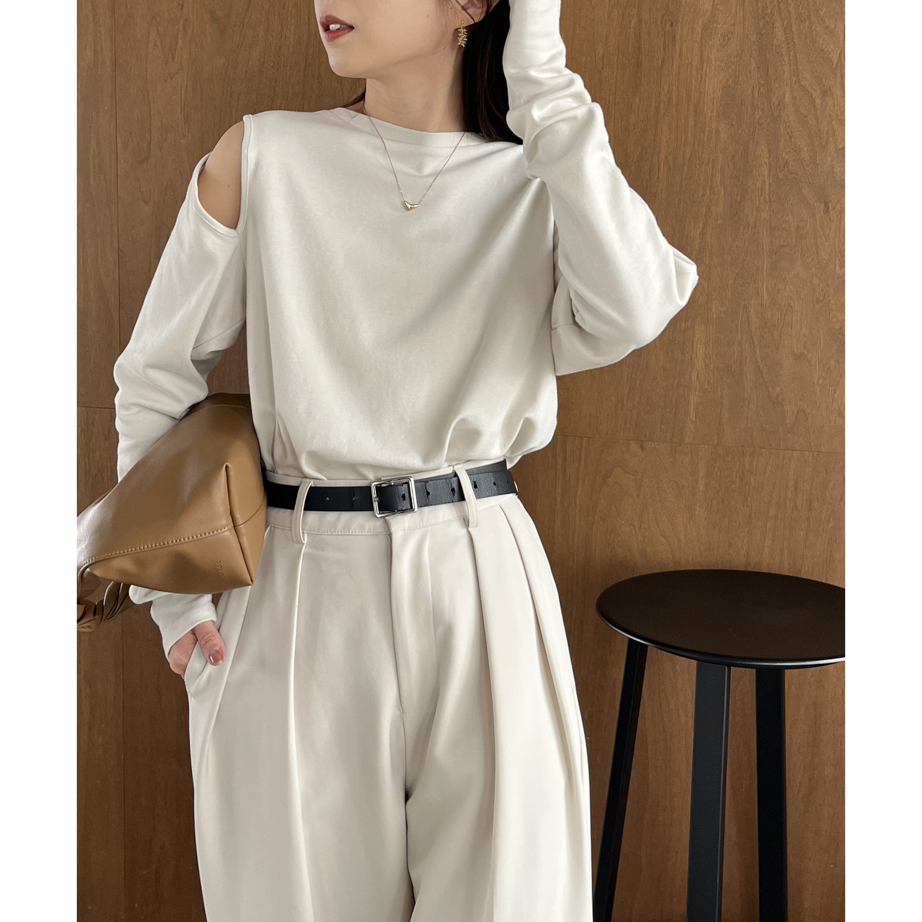 ②上のボタンのみを開けるとヘルシーな抜け感ある肩開きスタイルに