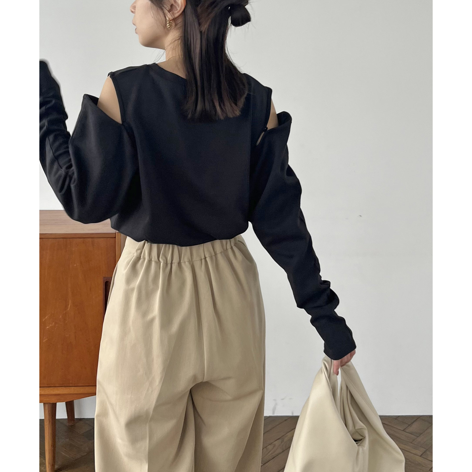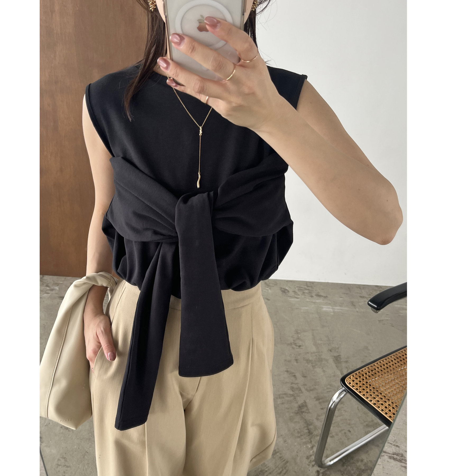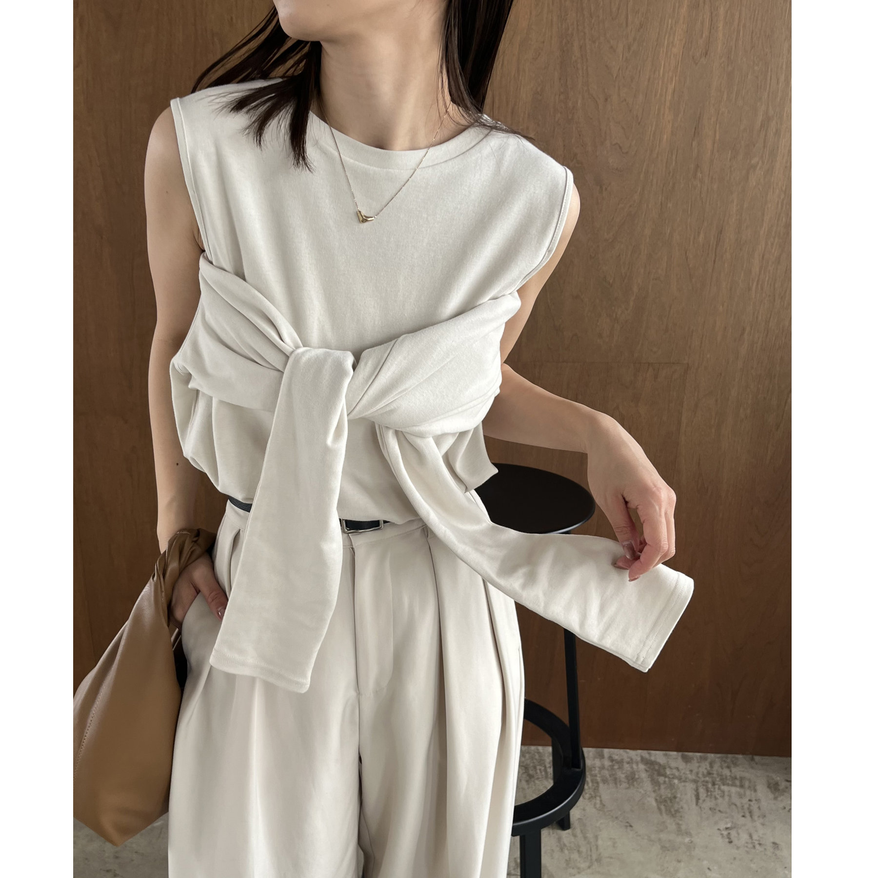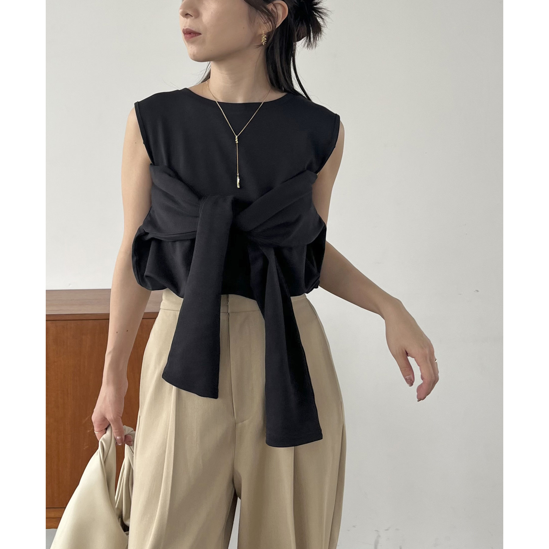 ③ボタンをすべて開けて腕を抜き、ビスチェのように縛るとノースリとしても着用可能◎