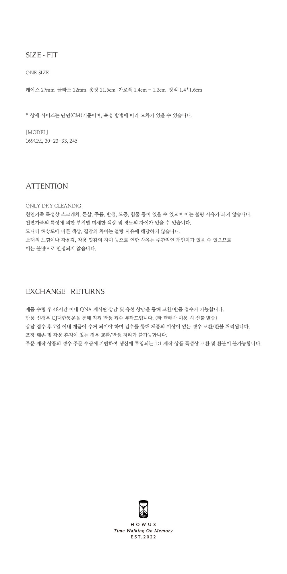 HOWUS의 모든 룩에 녹아들 수 있도록 최대한 과한 디테일을 배제하면서도 따뜻한 색감의 크로커 소가죽 스트랩으로 빈티지하고 클래식한 무드를 더 했습니다.