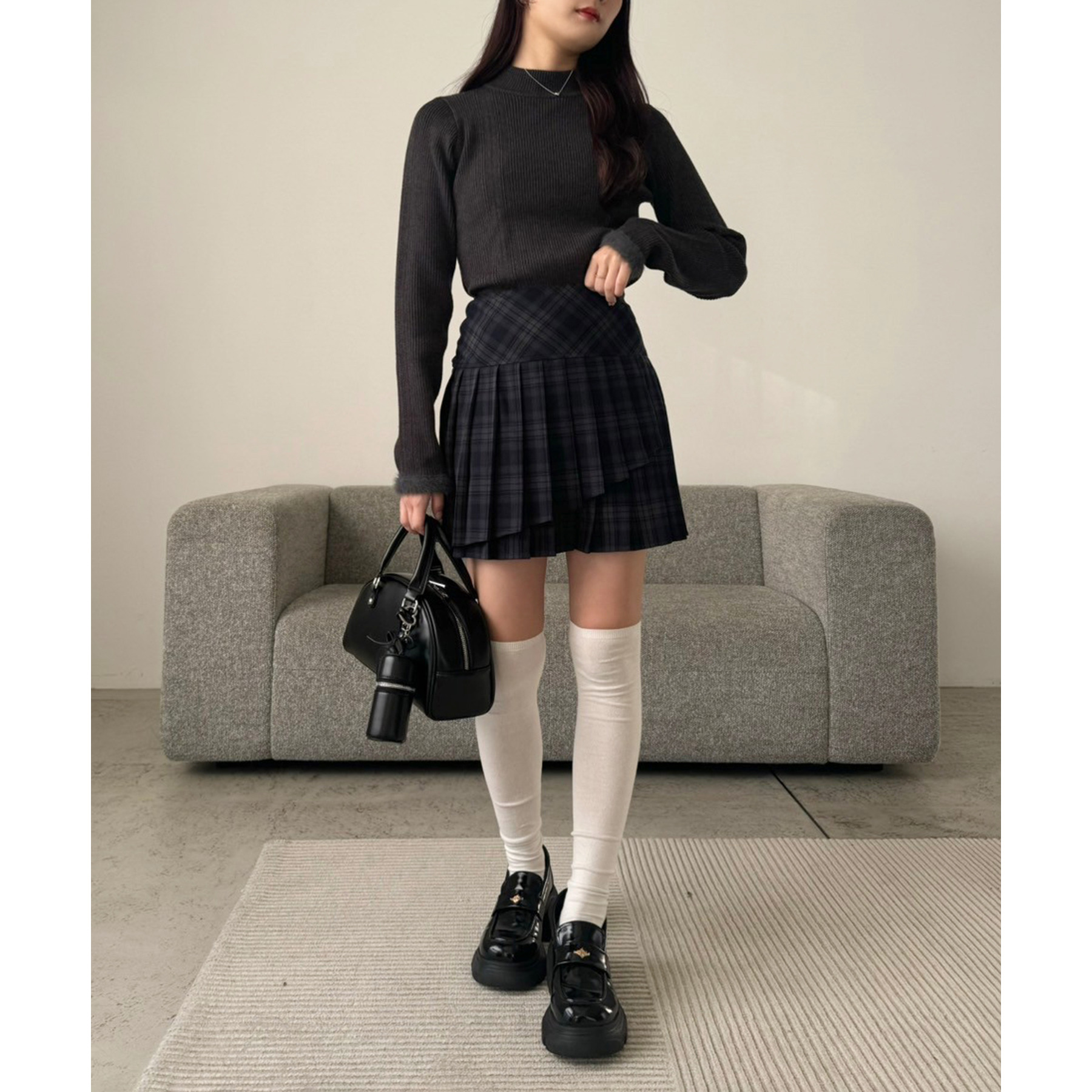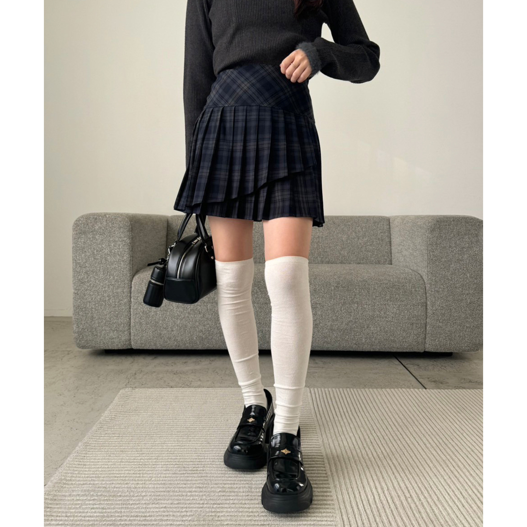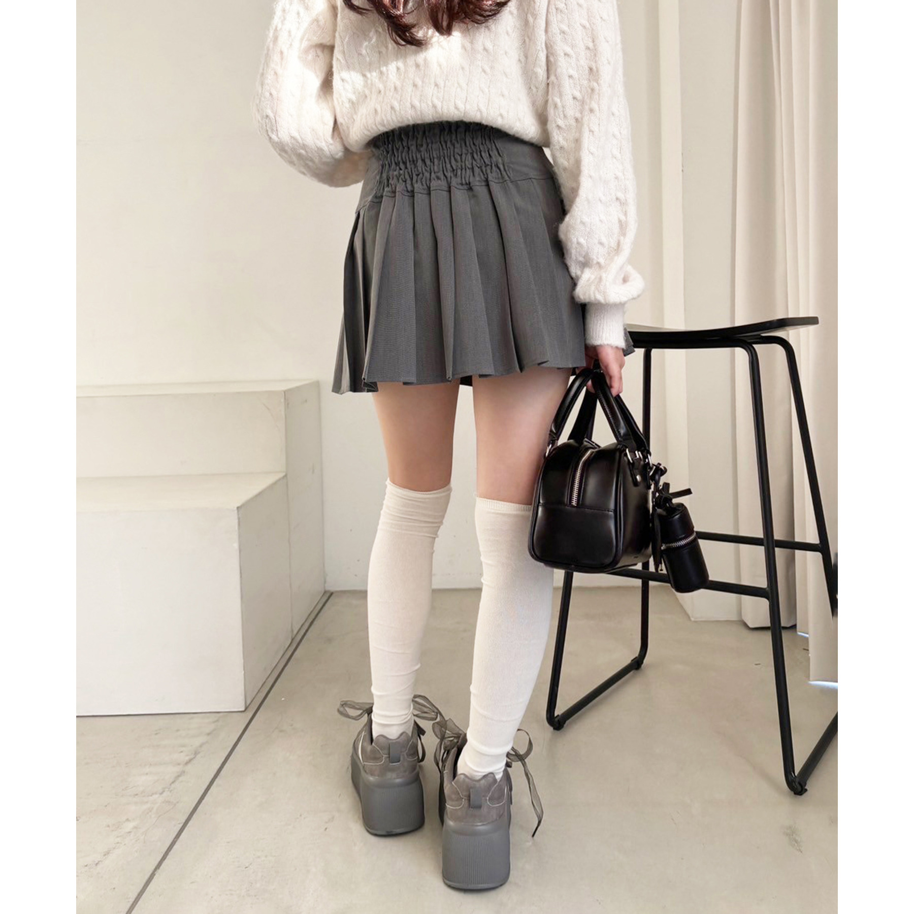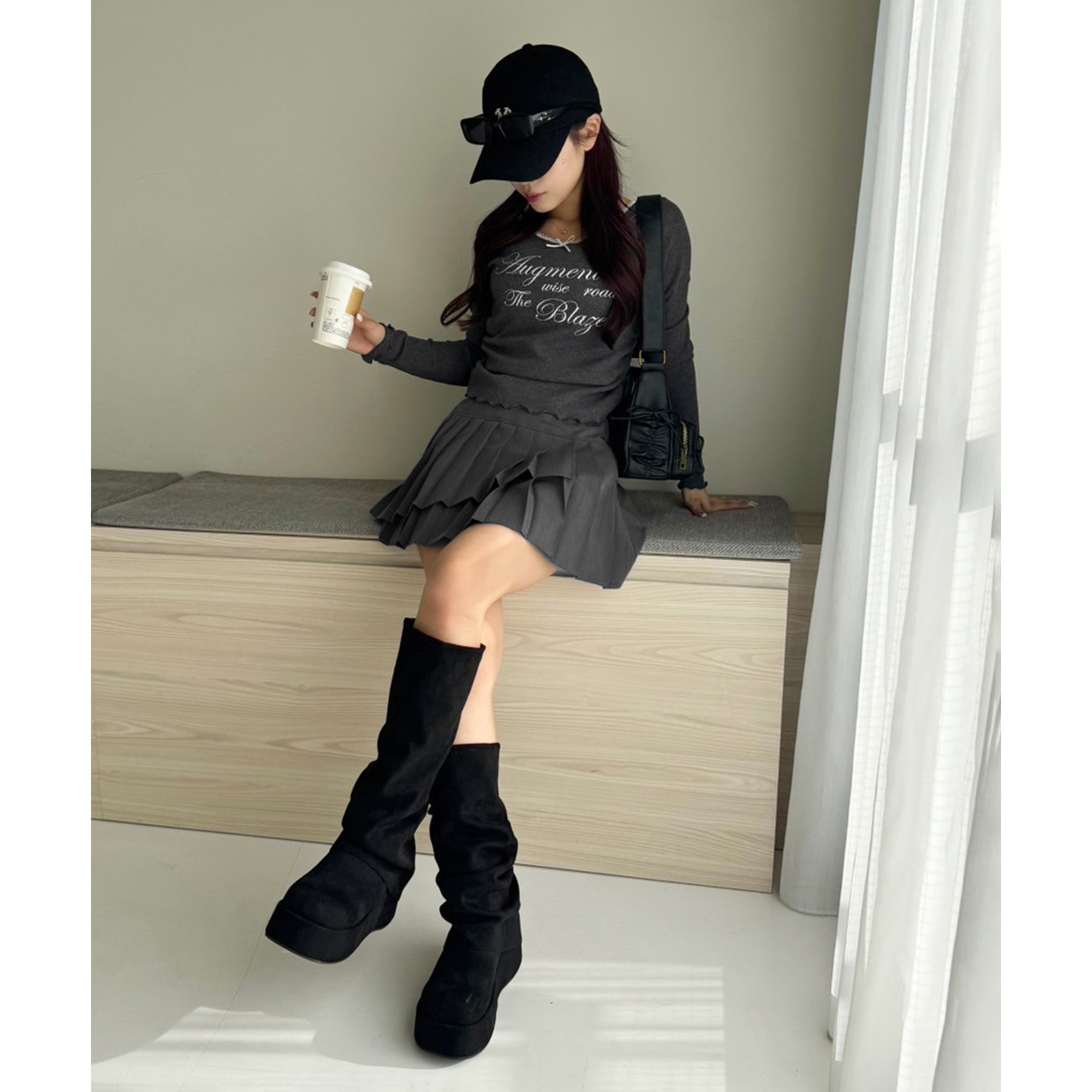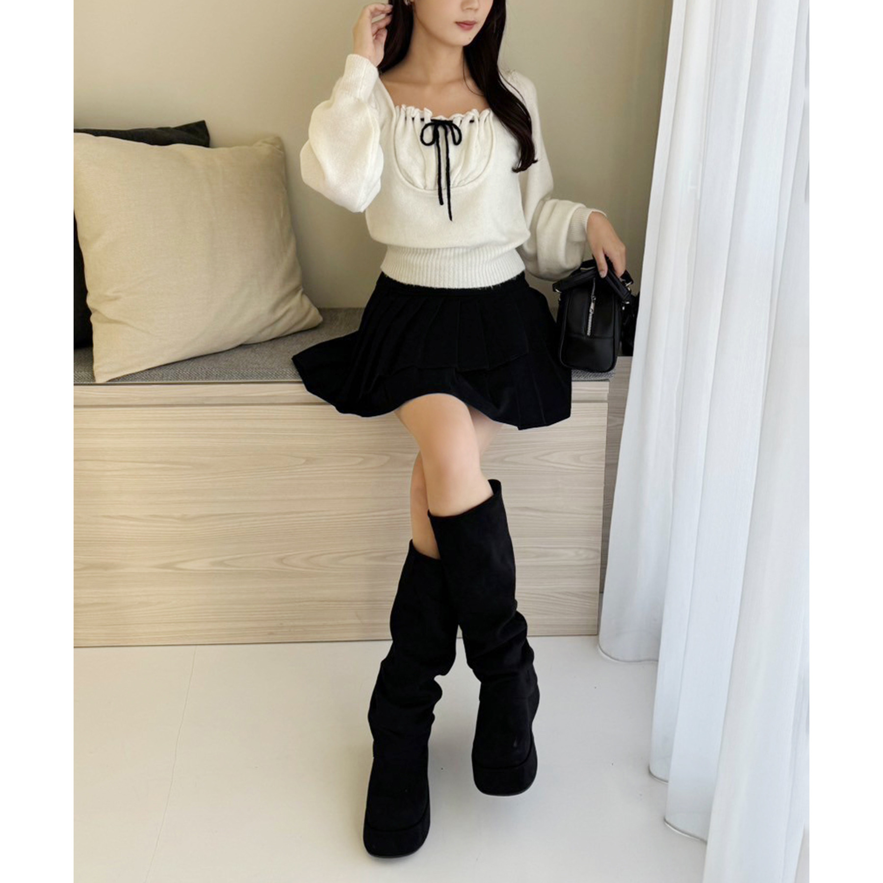 足元はロングブーツで鉄板モテコーデに。