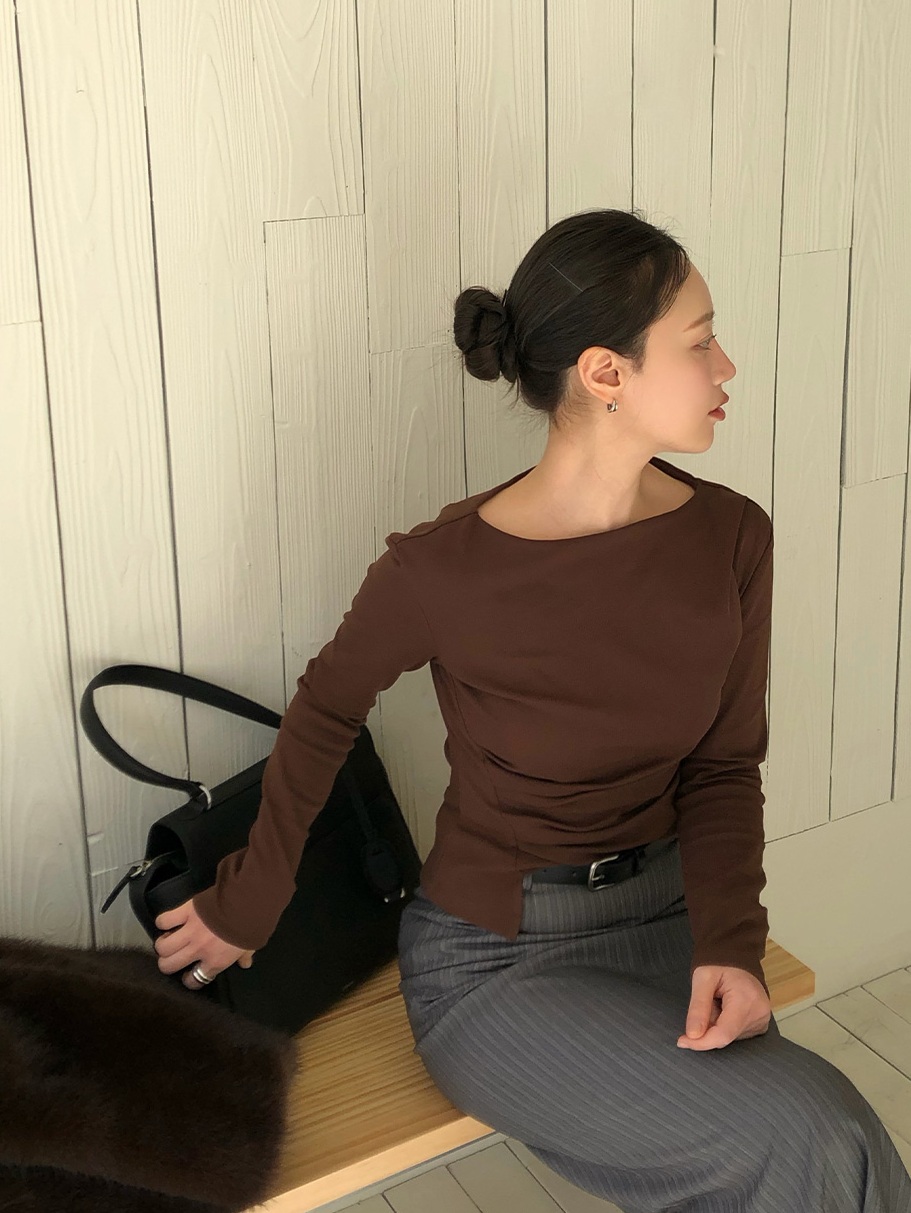 ボートネック仕様で、スリムなインナーとのコーディネートにも活躍します。