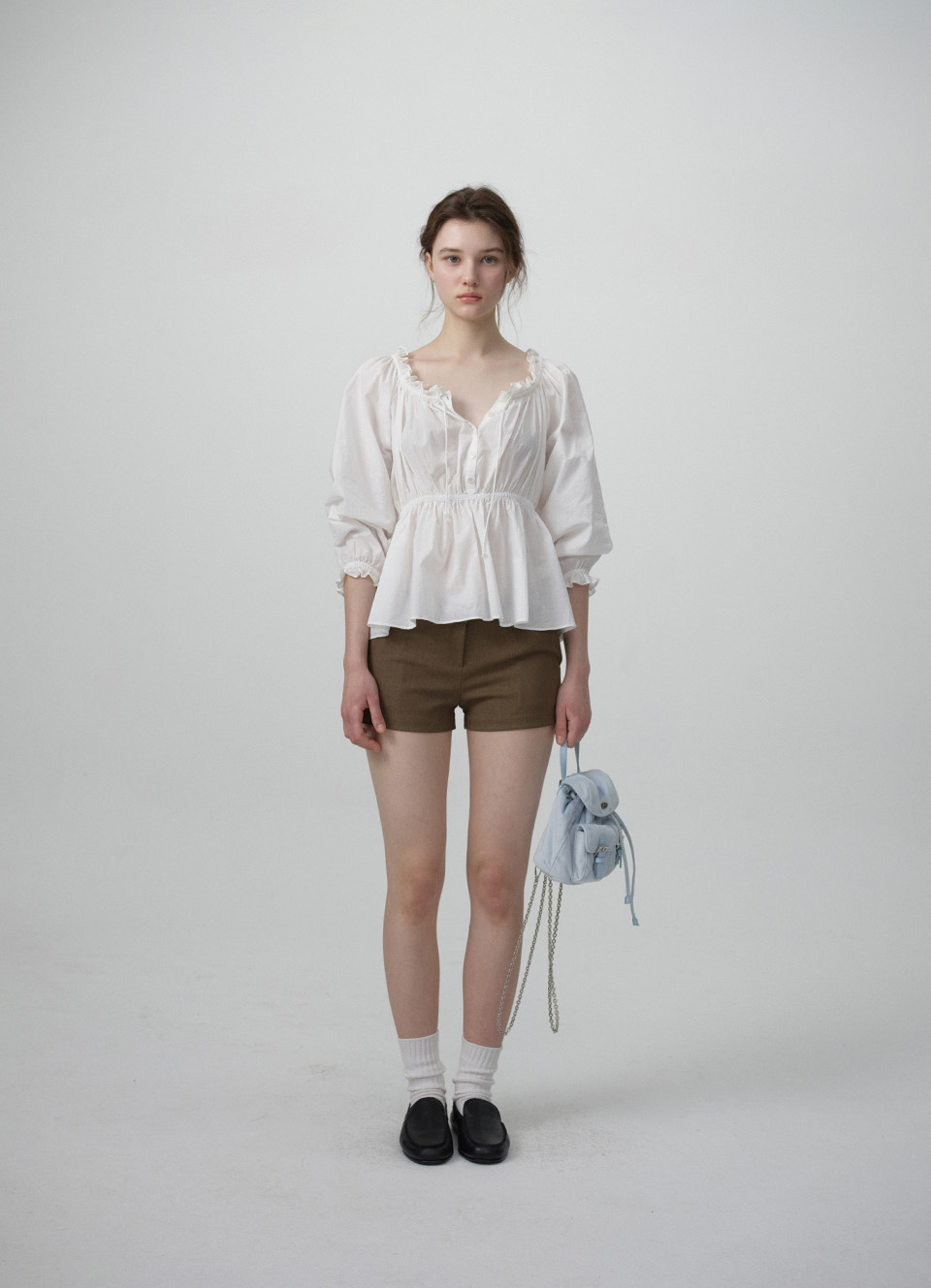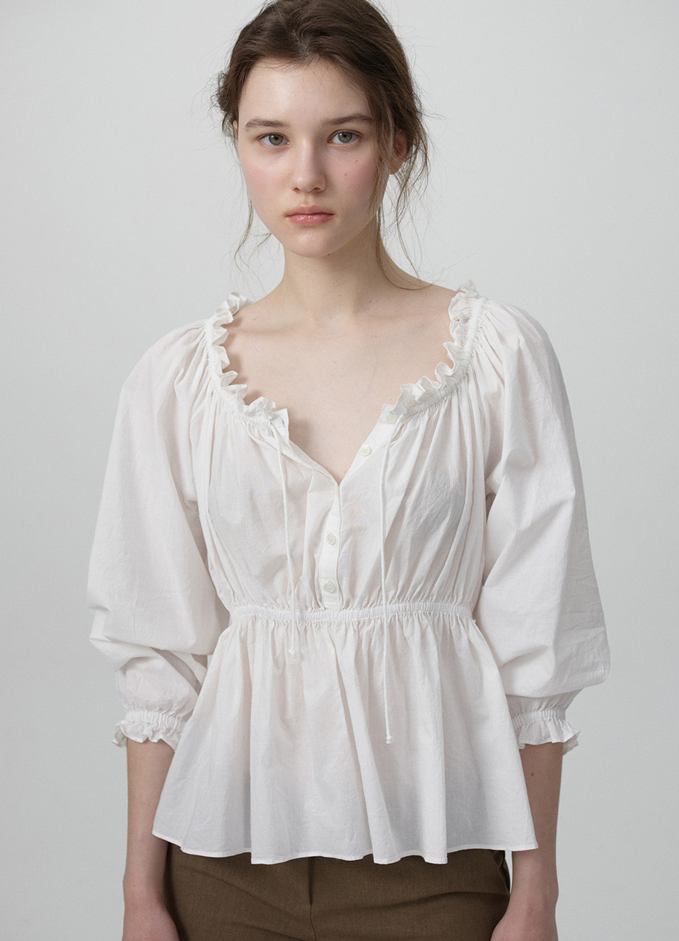 フリルネックライン&ハーフオープンボタン仕様のブラウス