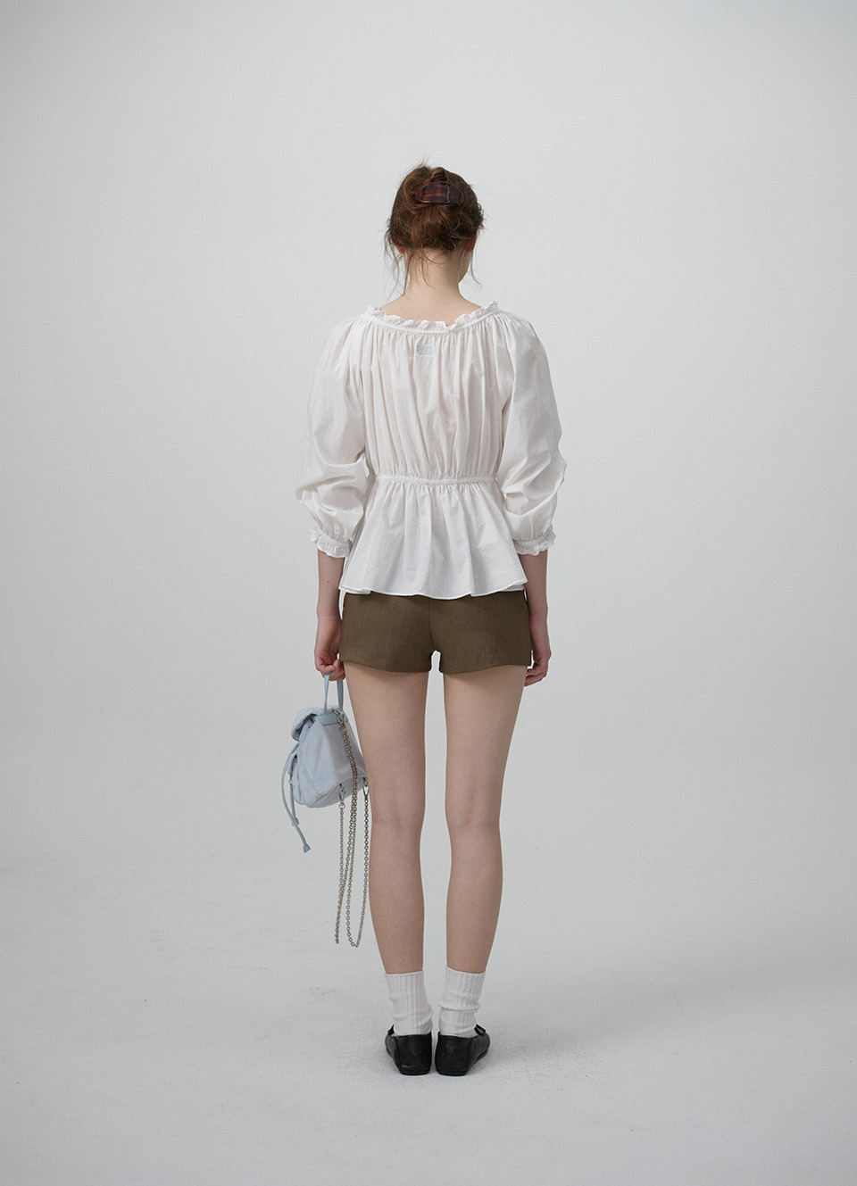 立体的なシルエットを作るウエスト&袖口のバンディングディテールと