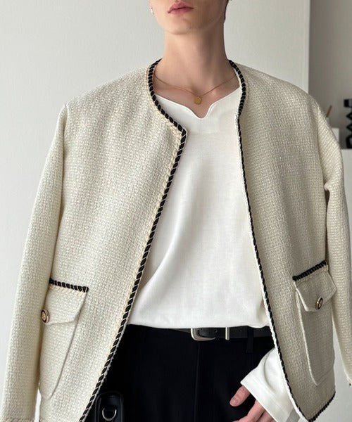洗練された襟元でモードな印象に。