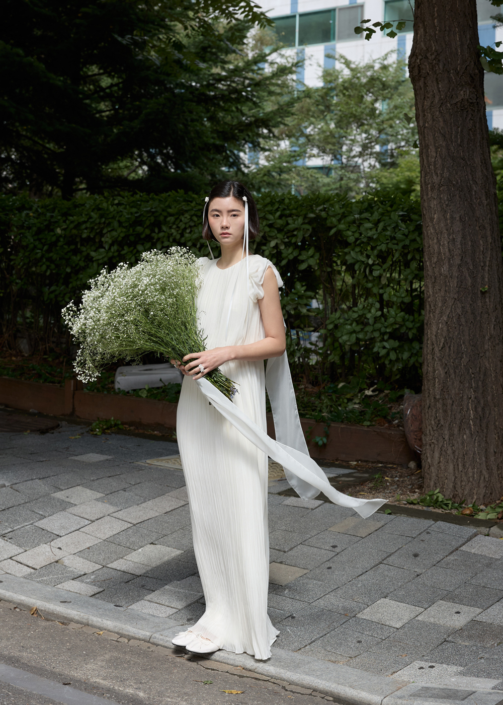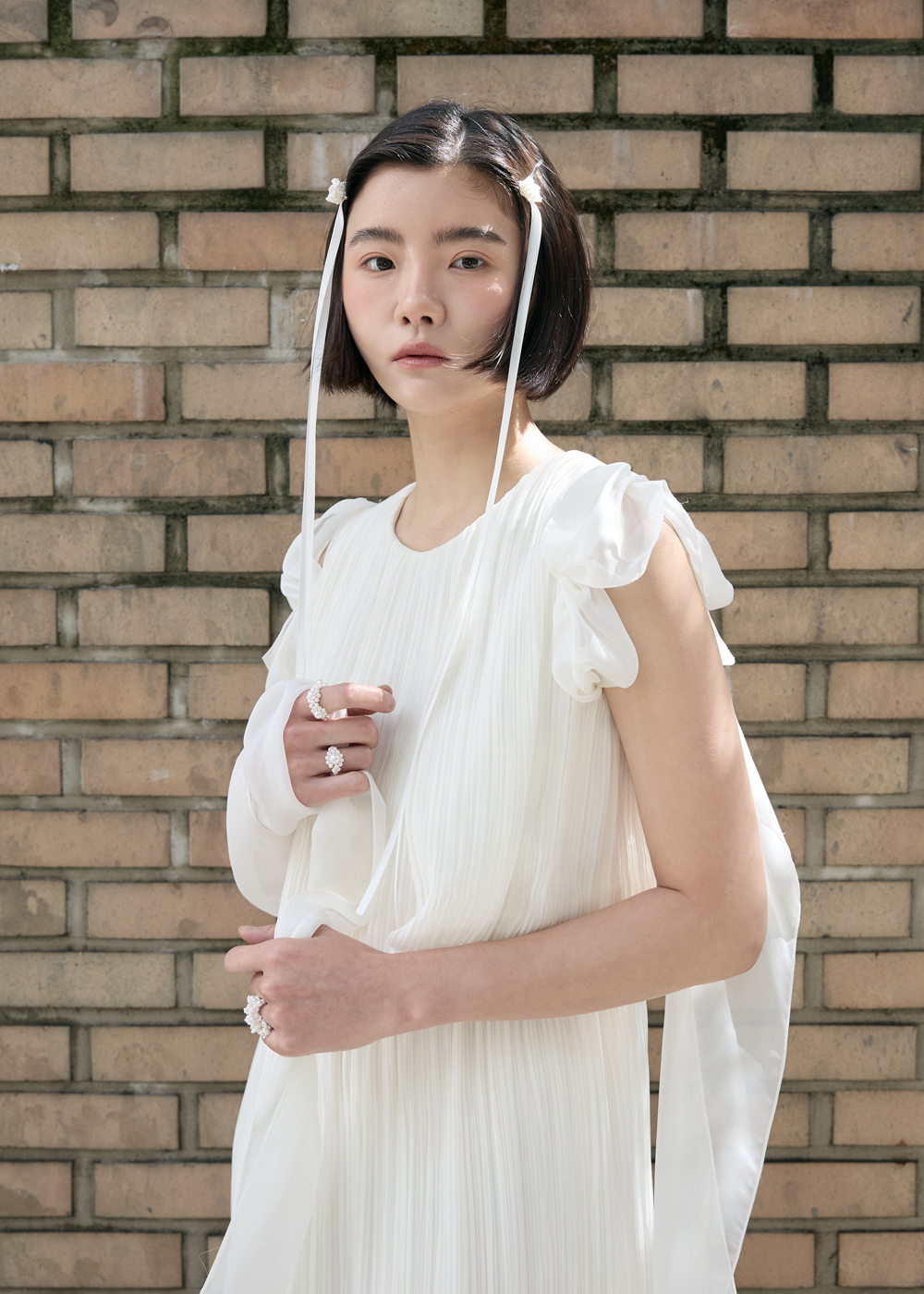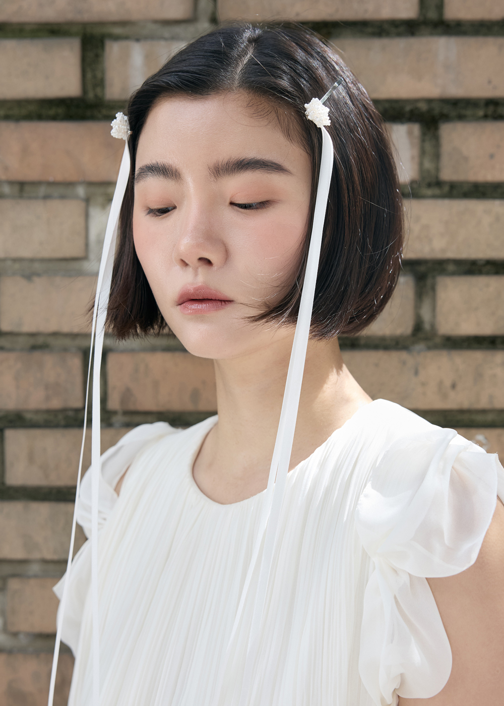 リボン紐がドレスと調和し、動きや風に合わせてふわりと揺れ広がる様子が愛らしいムードを添え、