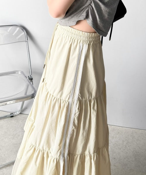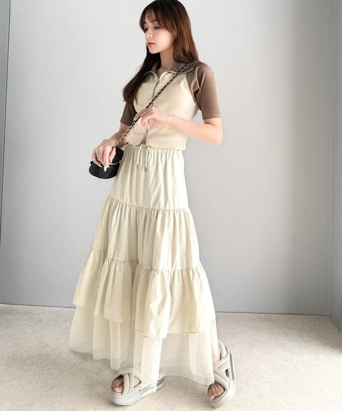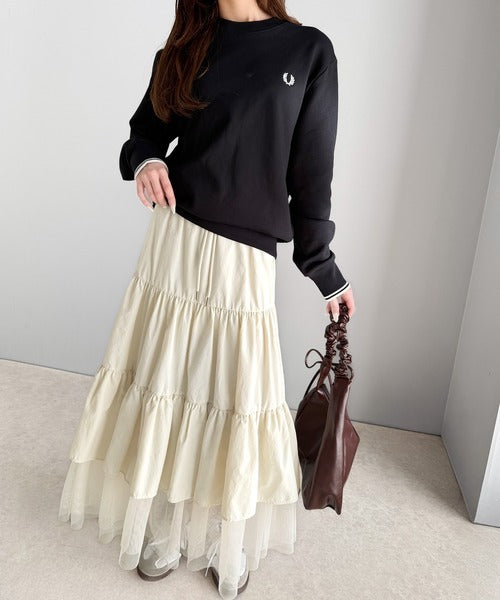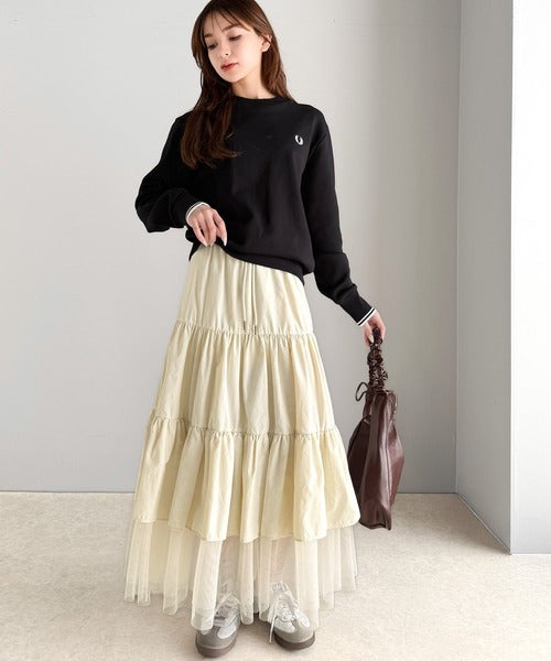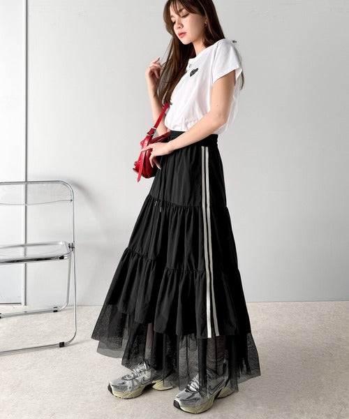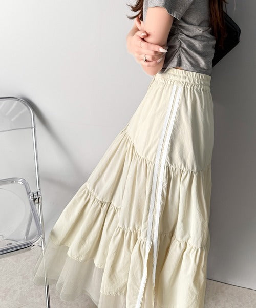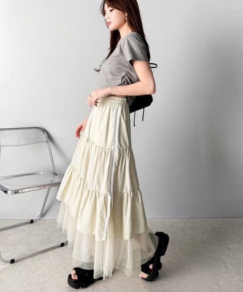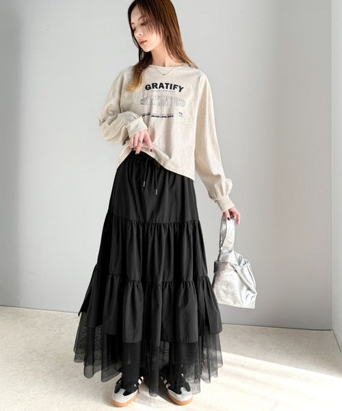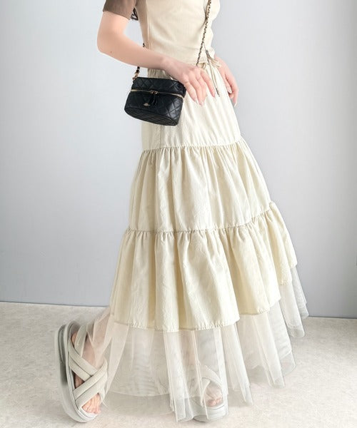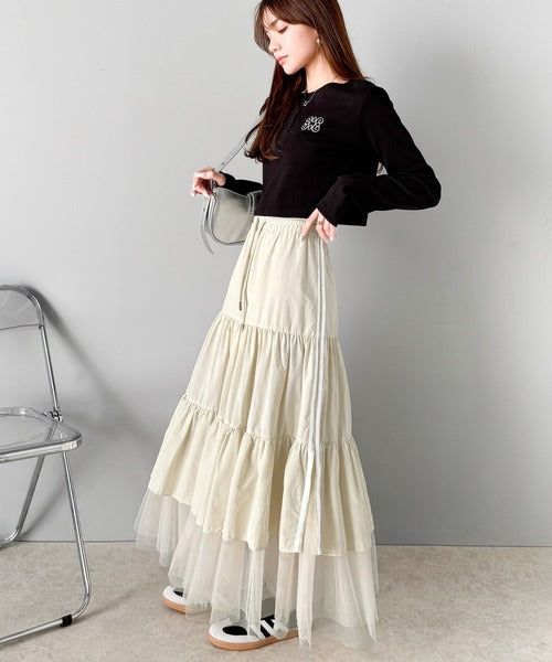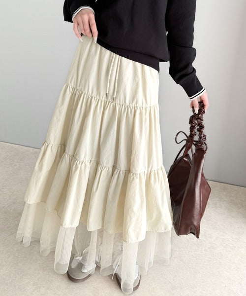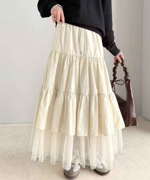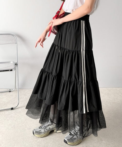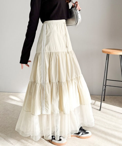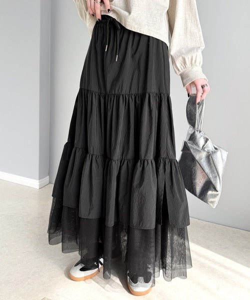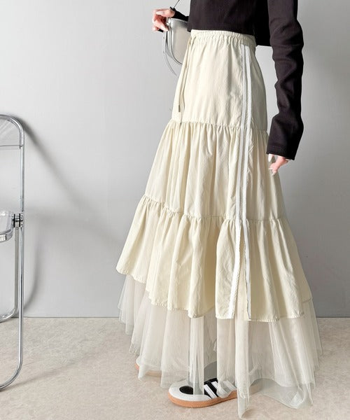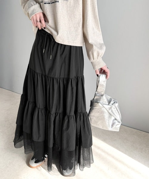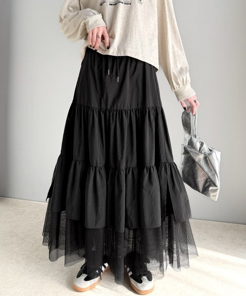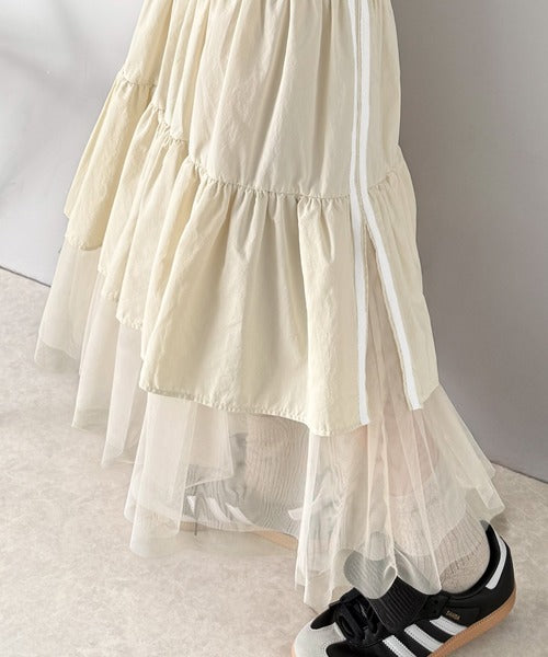 ナイロン生地に柔らかなチュールが組み合わさったティアードスカート。