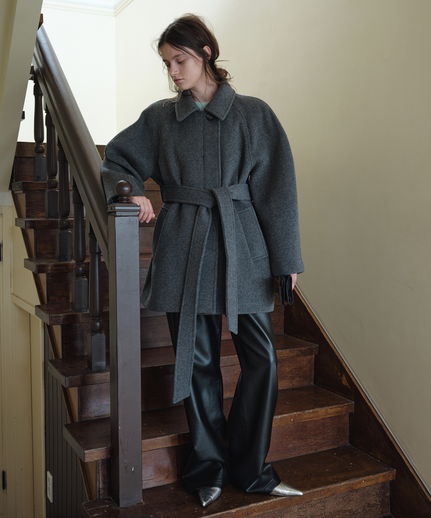 ボリュームショルダーが特徴のベルト付きハーフコートです。